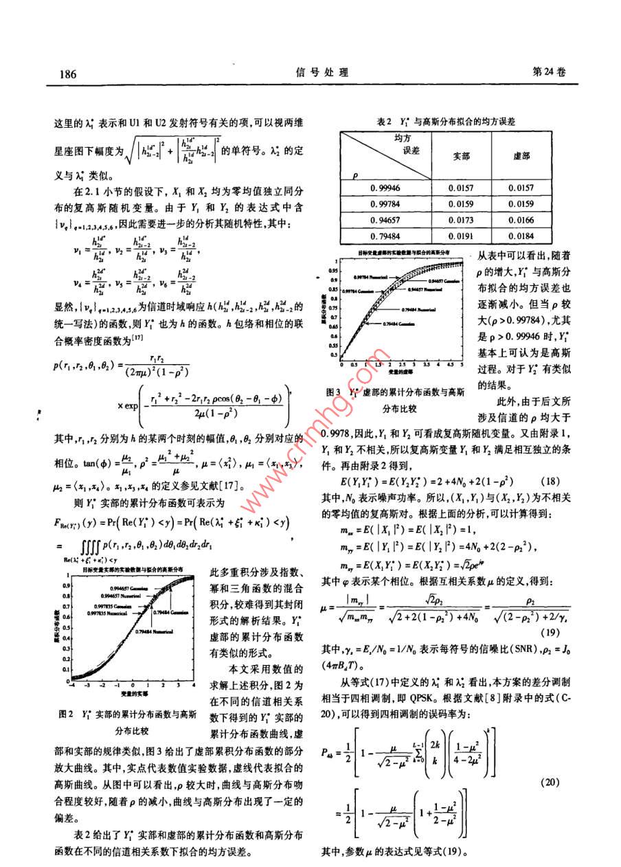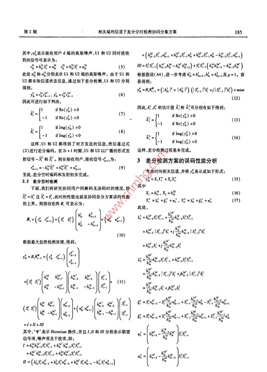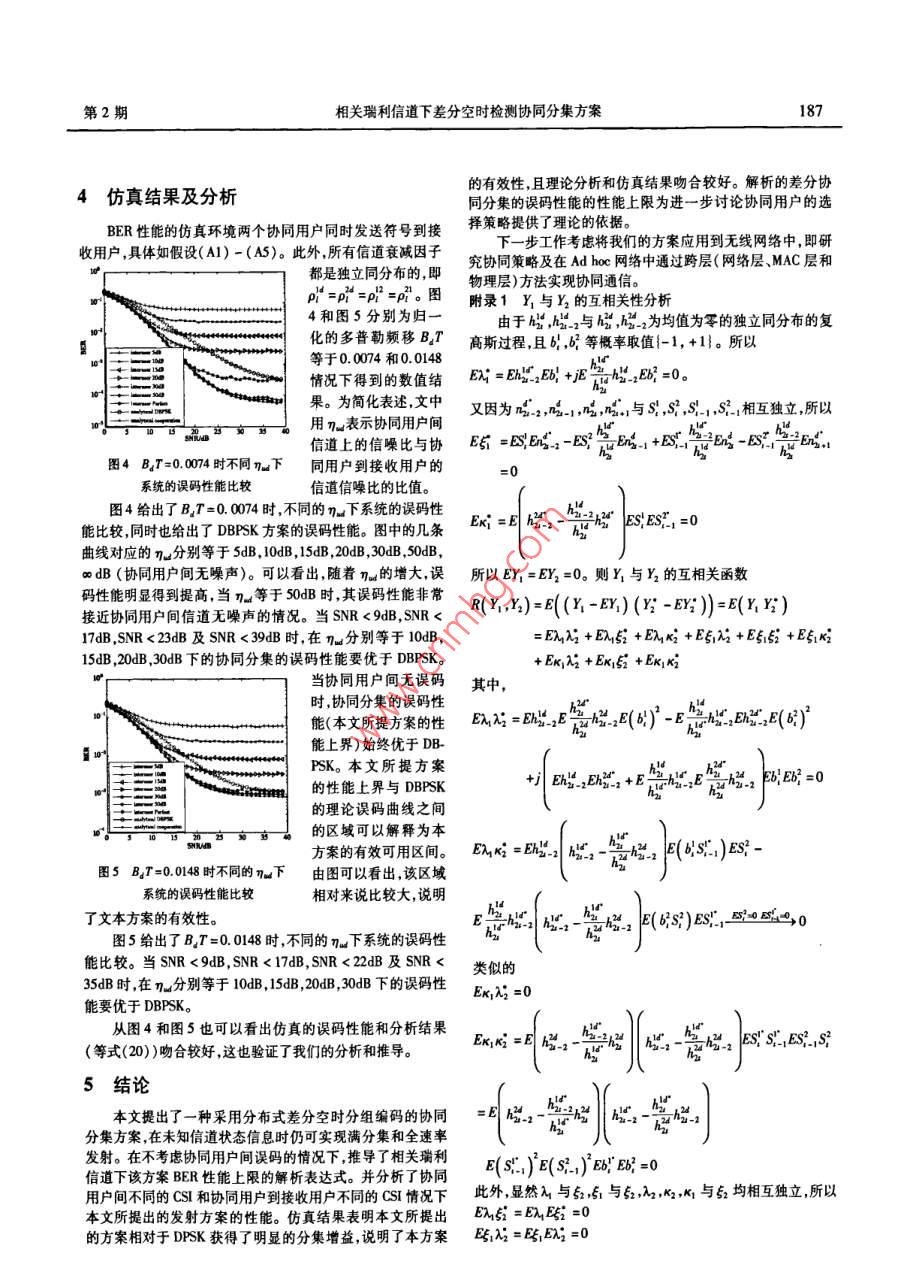 第24卷第2期信號(hào)處理Vol 24. No. 22008年4月SIGNAL PROCESSINGApr. 2008相關(guān)瑞利信道下差分空時(shí)檢測(cè)協(xié)同分集方案趙賢敬鄭寶玉(南京郵電大學(xué)信號(hào)與信息處理研究所214#,南京210003)要:本文提出了一種采用分布式差分空時(shí)分組編碼和檢測(cè)的協(xié)同分集方案,在不需要信道狀態(tài)信息(CS1)的情況下可以實(shí)現(xiàn)滿分集和全速率發(fā)射,并推導(dǎo)了相關(guān)瑞利信道下該方案誤碼率(BER)性能上限的解析表達(dá)式。傳統(tǒng)的差分空時(shí)分組編碼對(duì)整個(gè)碼塊進(jìn)行差分,而協(xié)同分集下的任何一個(gè)協(xié)同用戶進(jìn)行差分編碼時(shí)都不知道整個(gè)碼塊的信息。本文所提出的差分BPSK調(diào)制方案,通過(guò)將兩協(xié)同用戶的信息分別被調(diào)制到相互正交的實(shí)軸和虛軸上,從而將碼塊的聯(lián)合差分轉(zhuǎn)化為各用戶獨(dú)立差分。分析了在協(xié)同用戶間不同的信道狀態(tài)信息(CS)和協(xié)同用戶到接收用戶不同的CS情況下本文所提出發(fā)射方案的性能。仿真結(jié)果表明本文所提出的方案獲得了明顯的分集增益,同時(shí)也較好的吻合了理論分析的結(jié)果。關(guān)鍵詞:協(xié)同分集;分布式空時(shí)編碼;差分空時(shí)分組編碼A Cooperative Diversity Scheme Based on Differential Space-TimeCodes for Correlated Rayleigh ChannelsZHAO Xian-jing ZHENG Bao-yuInstitute of Signal and Information Processing, Nanjing University of Posts and Telecom. Nanjing, 210003, ChinaAbstract: In this paper, a novel cooperative diversity protocol with distributed differential space-time block coding is presentedhich can achieve full diversity with full rate with no need of channel state information( CSI). A close form expression for bit error rate(BEr)of the proposed scheme is derived for temporal correlated Rayleigh channele without considering the decoding errors between in-terusers. In traditional differential space-time block coding scheme, difference is done on each whole block. As to distributed cooperativediversity scheme, traditional difference is not practical for the perfect information of the block is unknown to each user when to be differ-ential encoded In the proposed differential modulation scheme, the information of the two cooperative users is modulated to orthogonal re-al axes and image axes. This degrades joint block difference to independent difference, which makes the full rate transmission possibleThe proposed transmission scheme is analyzed for different channels of interusers and channels from cooperative users to destination. Nu-merical results show that the proposed scheme gets distinct diversity gain and coincides with the analytical results wellKey words: Cooperative diversity; distributed space-time coding; differential space-time block coding了固定中繼( Fixed Relaying)、選擇中繼( Selection Relaying)1引言和增量中繼( Increment Relaying)三種協(xié)同策略。 Babaross協(xié)同分集( cooperative diversity)技術(shù)通過(guò)使網(wǎng)絡(luò)中各單進(jìn)一步研究了空時(shí)編碼在協(xié)同分集中應(yīng)用。與 Laneman等天線用戶共享彼此天線形成虛擬的多天線陣列來(lái)實(shí)現(xiàn)發(fā)射工作時(shí)間上同時(shí)進(jìn)行的是 Hunter和 nosratinia)提是出的編碼或接收分集,可以有效地抵抗多徑衰落并提高網(wǎng)絡(luò)性能3),協(xié)同( coded cooperation)研究其將信道編碼技術(shù)應(yīng)用到協(xié)同為MMo技術(shù)的實(shí)用化提供了一條可行的方法。協(xié)同分集分集中,如 turbo碼。起源于中繼信道的研究但是它們又不完全相同。 Sendon-所有以上工作都是基于接收端或發(fā)射端能夠通過(guò)信道ans,Eip和 aazhang'"最早研究了協(xié)同分集與網(wǎng)絡(luò)容量和中估計(jì)獲得CS然后進(jìn)行相干檢測(cè)的假設(shè)。在實(shí)際中,這就意斷概率( outage probability)等系統(tǒng)性能的關(guān)系,其研究前提是味著協(xié)同用戶和接收用戶必須進(jìn)行信道估計(jì)。當(dāng)系統(tǒng)存在基于發(fā)射端已知CS1,有點(diǎn)類似波束形成( beamforming)。多個(gè)協(xié)同用戶發(fā)射時(shí)由于每對(duì)用戶都需要進(jìn)行信道估計(jì),lateran,Trwe和 Women深人研究了分集的實(shí)現(xiàn)策略提出這就使得系統(tǒng)變得非常復(fù)雜。因此,設(shè)計(jì)一種接收端不需要收稿日期:2006年9月14日;修回日期:無(wú)基金項(xiàng)目:國(guó)家自然基金資助項(xiàng)目(60372107信號(hào)處理第24卷估計(jì)CS的系統(tǒng)更切合實(shí)際。差分調(diào)制和檢測(cè)技術(shù)不需要信簡(jiǎn)單起見(jiàn),階相關(guān)系數(shù)省略下標(biāo)即p=p。(A2)所有信道狀態(tài)信息,在不便于進(jìn)行信道估計(jì)的場(chǎng)合得到了廣泛應(yīng)道在空間上都是相互獨(dú)立的即用戶i到用戶j的所有衰減因用。在高斯白噪聲信道和不相關(guān)的瑞利平坦衰落信道下,差子h都是相互獨(dú)立的,且所有用戶到接收用戶的衰減因子分二進(jìn)制相位調(diào)制( DBPSK)的誤碼性能比相干檢測(cè)差3dB·。對(duì)于時(shí)間相關(guān)的瑞利衰落信道在高信噪比區(qū)域存在{“是獨(dú)立同分布的,即n=P,P=P=1。協(xié)同用誤碼平臺(tái)4。H.Vedk描述了獨(dú)立瑞利衰落信道和戶間的信道是對(duì)稱信道,即2和也是獨(dú)立同分布的隨機(jī)相關(guān)瑞利衰落信道的區(qū)別并給出了相關(guān)瑞利衰落信道下變量因此,p2=p1,P=P。(A3)發(fā)射端和接收端都未FSK調(diào)制