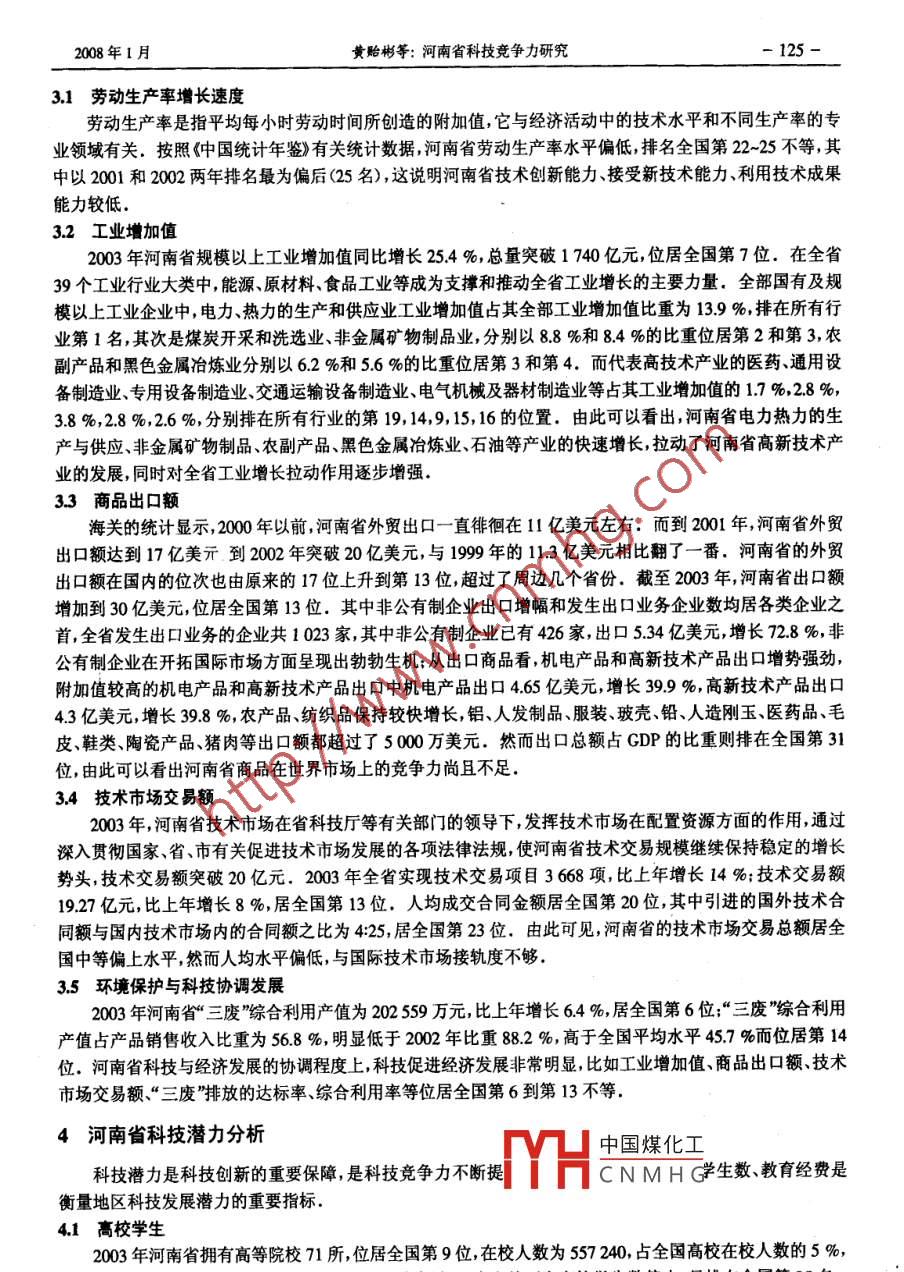 第26卷第1期河南科學(xué)Vol.26 No.12008年1月HENAN SCIENCEJan. 2008文章編號(hào): 1004- 3918 (2008)01-0123-04河南省科技競(jìng)爭(zhēng)力研究黃貽彬',盧方元2, 軒琳娜 2(1.鄭州牧業(yè)工程高等專科學(xué)校信息工程系,鄭州450011; 2. 鄭州大學(xué)商學(xué)院,鄭州450052)摘要:科技競(jìng)爭(zhēng)力反映了科技促進(jìn)經(jīng)濟(jì)發(fā)展、增強(qiáng)經(jīng)濟(jì)實(shí)力.推動(dòng)社會(huì)可持續(xù)性發(fā)展的能力.從科技投入、科技產(chǎn)出、科技與經(jīng)濟(jì)社會(huì)發(fā)展的協(xié)調(diào)程度和科技潛力4個(gè)方面對(duì)河南省的科技競(jìng)爭(zhēng)力進(jìn)行分析評(píng)價(jià),從而揭示河南省科技競(jìng)爭(zhēng)力的實(shí)際狀況和與先進(jìn)省份相比所存在的差距.關(guān)鍵詞:科技競(jìng)爭(zhēng)力;科技投入;科技產(chǎn)出;科技潛力中圖分類號(hào): TP 301文獻(xiàn)標(biāo)識(shí)碼: A科技競(jìng)爭(zhēng)力是一個(gè)國(guó)家和地區(qū)科技總量、實(shí)力以及科技水平與潛力的綜合體現(xiàn),是影響其經(jīng)濟(jì)、社會(huì)發(fā)展的決定性因素"。科技競(jìng)爭(zhēng)力通常由科學(xué)技術(shù)投入、科學(xué)技術(shù)支出、科技與經(jīng)濟(jì)發(fā)展的協(xié)調(diào)程度和科技潛力4大要素構(gòu)成4.這4大要素相互作用,相互影響,形成- -個(gè)有機(jī)的整體.依據(jù)《中國(guó)統(tǒng)計(jì)年鑒》、《中國(guó)科技統(tǒng)計(jì)年鑒》、河南省統(tǒng)計(jì)年鑒》和《河南省科技統(tǒng)計(jì)年鑒》,從科技投入、科技產(chǎn)出、科技與經(jīng)濟(jì)社會(huì)發(fā)展的協(xié)調(diào)程度和科技潛力4個(gè)方面對(duì)河南省的科技競(jìng)爭(zhēng)力進(jìn)行分析評(píng)價(jià),全面揭示河南省科技競(jìng)爭(zhēng)力的實(shí)際狀況以及與全國(guó)或先進(jìn)省份相比所存在的差距,從而為科學(xué)制訂河南省科技發(fā)展計(jì)劃提供參考依據(jù).1河南省科技投入分析科技投入(也稱為科學(xué)技術(shù)基礎(chǔ)支撐),是形成科技競(jìng)爭(zhēng)力的基礎(chǔ)和潛力,同時(shí)也是構(gòu)成科技競(jìng)爭(zhēng)力的基礎(chǔ)條件和前提,科技投入通常由科技人力投入、科技財(cái)力投入和科技基礎(chǔ)設(shè)施所構(gòu)成凹.1.1科技人力投入1.1.1全社會(huì)科技人員 一個(gè)國(guó)家 或地區(qū)科技實(shí)力如何,很大程度上取決于其所擁有的科技人力資源及其分布狀況,2003 年河南省有科技活動(dòng)的單位有1 783所,全部科技活動(dòng)人員146 364人,位居全國(guó)第10位.其中,中大中型企業(yè)、科研機(jī)構(gòu)及高校的科技人員總數(shù)占全部科技人員總數(shù)的比重分別為50 %,11.2 %,10.6 %.而在全國(guó)總體科技人員中,這3種機(jī)構(gòu)的科技人員占總數(shù)的比重分別為:43 %,12.4 %, 12.5 %;北京科技人員中,這3種機(jī)構(gòu)科技人員比重分別為10.9 %,28.7 %,14.1 %.1.1.2 R&D人員 由于 R&D活動(dòng)占所有科技活動(dòng)的70 %以.上,因此“R&D人員總數(shù)”、“R&D人數(shù)占科技人員總數(shù)比重”是評(píng)價(jià)科技競(jìng)爭(zhēng)力的重要指標(biāo).河南省R&D人數(shù)2003年為40 742人,占全國(guó)R&D人數(shù)的3.7 %,居全國(guó)第11位. R&D人數(shù)占科技人員總數(shù)比重為27.9 %,居全國(guó)第16位。R&D人員中,科學(xué)家與工程師為30664人,占R&D人員總?cè)藬?shù)的75.3 %,而全國(guó)R&D總?cè)藬?shù)為1 094 831人,其中科學(xué)家與工程師為862 000人,占R&D總?cè)藬?shù)的78.7 %.由此可以看出,河南省R&D人員中,科學(xué)家與工程師所占比重相對(duì)較小,低于全國(guó)平均水平,這說(shuō)明河南省科技人才高層素質(zhì)有待于繼續(xù)提高.R&D人員當(dāng)中,基礎(chǔ)研究人員1335人,占總?cè)藬?shù)的3.3 %;應(yīng)用研究人員6947人,占總?cè)藬?shù)的17.1 %;試驗(yàn)發(fā)展人員32461人,占總?cè)藬?shù)的79.7 %.由此可以看出,河南省基礎(chǔ)研究人員所占比重偏低,實(shí)驗(yàn)發(fā)展人員比重偏高,1.2 科技財(cái)力投入1.2.1科技經(jīng)費(fèi)籌集總額2003 年河南省科技經(jīng)費(fèi)籌集總額為842 688萬(wàn)元,高于2002年的籌集總額662 485萬(wàn)元27.2個(gè)百分點(diǎn).其中政府資金為165 923萬(wàn)元,占總額的19.7 %;企業(yè)資金為568 119萬(wàn)元,占總額的67.4%;事業(yè)單位資金為33342萬(wàn)元,占總額的4%中國(guó)煤化工元,占總額的5 %;國(guó)外資金為1029萬(wàn)元,占總額的0.12%;其他資金為32271:MYHCNMHG;國(guó)科技經(jīng)費(fèi)籌集總收稿日期: 2007-07-15基金項(xiàng)目:河南省軟科學(xué)項(xiàng)目(513041000)作者簡(jiǎn)介:黃貽彬(1959 ),男,河南羅山人,副教授,從事計(jì)算機(jī)信息處理研究.一124-河南科學(xué).第26卷第1期額中,政府資金、企業(yè)資金、金融機(jī)構(gòu)資金占總額比重分別為24.3 %,59.4 %,7.5 %.由此可見(jiàn),河南省科技經(jīng)費(fèi)籌資格局不太合理,企業(yè)資金所占比重較大,而政府資金和金融機(jī)構(gòu)資金比重相對(duì)較小.1.2.2科技經(jīng)費(fèi)內(nèi)部支出地區(qū)科技財(cái)力投入是影響區(qū) 域科技實(shí)力的主要因素之一。2003 年河南省科技經(jīng)費(fèi)內(nèi)部支出為750 303萬(wàn)元,居全國(guó)第13位.而其占GDP比重為1.1 %,明顯低于全國(guó)平均水平2.6 %,居全國(guó)第25位.河南省地方財(cái)政