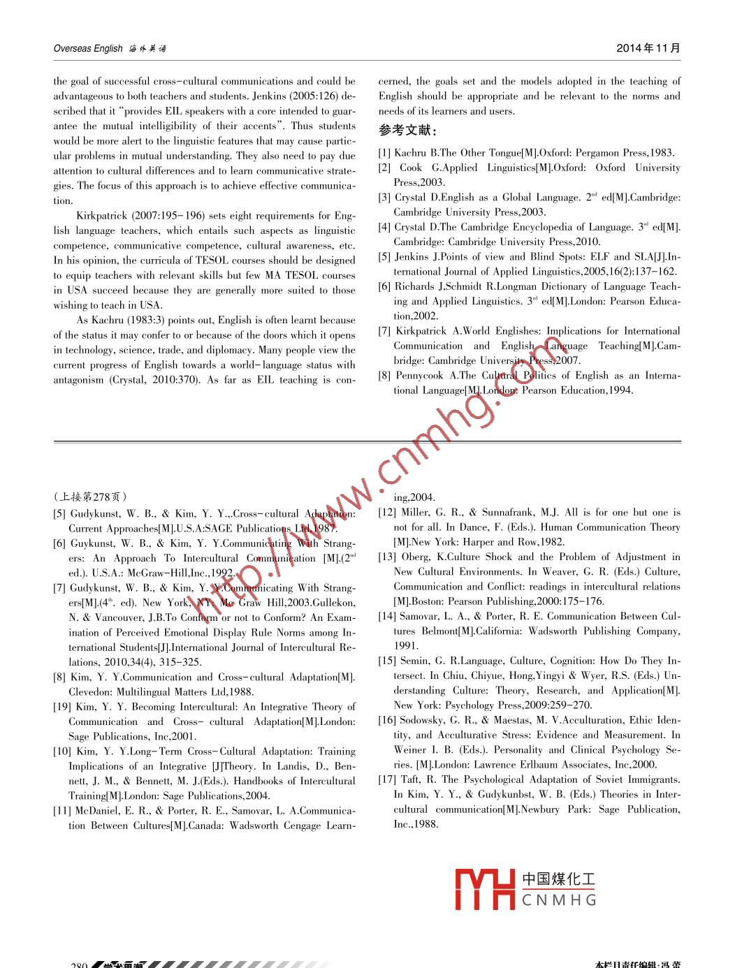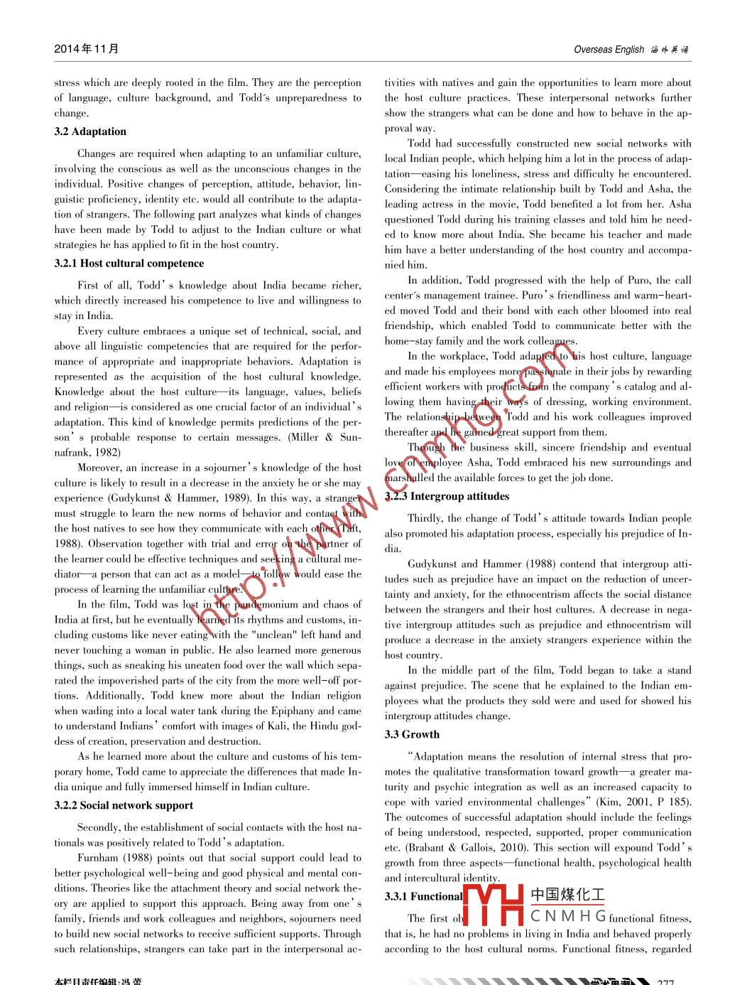 xssc@overseaen.comISSN 1009- -5039htp://ww.overseaen.comOverseas English海外英語Tel:+86- -551- -65690811 65690812The Process of Cross-cultural Adaptation:An A nalysis of Outsourced吳瑩(中國礦業(yè)大學(xué)徐海學(xué)院外語系,江蘇徐州221008)Abstract: This paper employs Kim' s (2001) ‘ Process of Cross- cultural Adaptation theory’ to analyze the film- -Outsourced,and growth are three crucial phrases in the process of cross- cultural adaptation, which are correlated to each other and perform ina cyclic and continual way of‘draw - -back -to- -leap’. In this paper, each phrase is analyzed via employing theories and ilustratingover, implications will be explored by the paper and suggestions will be offered to the sojourners for their better adaptation in thehost country. In addition, the paper presents the diferences between American culture and Indian culture, which are to some ex-tent, the obstacles afecting successful cross-cultural adaptation.Key words: culture shock; culture conflict; cross cultural adaptation中圖分類號:G0文獻(xiàn)標(biāo)識碼:A文章編號: 1009- -5039(2014)21-0275- -041 Introductionto success and how the sojourners' adaptation models are and whatan be done to help these sojourners to surmount cultural obsta-1.1 Overview of the filmOutsourced is a comedy talking about intercultural conflictNo one is possibly to escape from the cultural differences-and romance. The hero, Todd Anderson (Josh Hamilton), is a Seat-uncertainty and unfamiliarity do occur no matter what the hosttle call center manager. He is sent to India to train the low- paidcountry is and who the person is. The term‘a(chǎn)daptation' bears spe-employees for his company and will never come back to Americaal significance, referring to the complex process during whichuntil the call time is reduced to six minutes. Al first, Todd isstrangers acquire the abilities to fit in the host culture (Gudykunstshocked by the Indian culture, fels uncomfortable about every-& Kim, 1988).thing and sticks to his American way in daily life and in the work-1.3 Structure of the paperplace. But through his diligent and enthusiastic India staffs, espe-The aim of this paper is to investigate the cross- cultural adap-cially Puro (Asif Basra), who is a careful and energetic India guytation process by analyzing an American call center manager Toddand Asha (Ayesha Dharker), an independent, beautiful and perspi-Anderson ' s experience of working in India in the film Outsourced.alizes that he has a lot to learn- not only the difference between In-Kim' s (2001) 'stress- adaptation-growth' model has been adopted .dian culture and American culture, but also himself. He soon dis-in this paper to ilustratlel how Todd overcomes the cultural stressescovers that being outsourced is not a disaster anymore; it is the bestand differences to reduce the call time to six minutes, and finallyrealizes self-promotion.thing in his life.2 Literature Review1.2 Background informationThe lerm 'ousourced' is the phenomena of companies which 2.1 The importance of cross cultural adaptationtake jobs in the United States but transport entire divisions to coun-Researchers explore eross- cultural adaptation and highlighttries like India, where they can pay a fraction of the payroll andthe importance of it due to the fact that with the development of glo-overhead to get the same job done. Along with the trend, managersbalization, a large number of sojourners: international students,like Todd are appointed to train the foreign companies to operate inbusiness personnel, diplomats, military personnel as well as the in-the native way and under this circumstance cross- cultural commu-nication occurs.ation that requires a certain degree of cross- cultural adaptationBesides, a growing number of sojourners who live in other(Gudykunst & Kim, 2003). Appropriate cross- cultural adaptationcountries to learn a new language, gain professional sill, or in-can lead to success; what is more, a feeling of success fosters thecrease competitive edge have received numerous researchers’at-tentions (Gullekon & Vancouver, 2009). Researchers have ana-Kim (1988) addresses that sojoumers who cross culturallyzed the common challenges the sojourmers have come across, theboundaries should be aware of the change in the host culture andunfamiliarity of the host country which limits sojourners’abilitiestry their best to exigt in tho neonvirnmont rather than to return中國煤化工MHCNMHG收稿日期:2014-07-20修回日期:2014-08-21本欄目責(zé)任編輯:馮蕾V愿虱275Overseas English海外英語2014年11月home. Besides, cross- cultural adaptation offers opportunities for Kim (2001). Better functional fitness results in the ability to com-new learning and growth, and adapting to a new and unfamiliar cul- municate in accordance with the host cultural norms, which en-ture is not only survival but also a life- changing journey for the so- ables the strangers to participate more in the local activities andjourners.have a better communication with the nationals without stereotyp-2.2 Kim's (2001) 'stress -adaptation- .growth' modelng. The functional fitness together with the host communicationcompetence determines the psychology health of an individual,On account of the muliple facets and dimensions, cross- cul-which is likely to be damaged by the culture shock. If the strangerstural adaptation has been studied from many angles and measuredfail to overcome the frustration caused by culture shock, they mightin terms of various aspects and categories (Kim, 1988). .never gain psychology health. Furthermore, successful adaptationThe model we employed to analyze the adaptation process ofcould never be achieved. W hen individuals no longer strictlyTodd is the‘stress- adaptation- growth' model proposed by Kimbound to their native cultures and immerse themselves in the host(2001). In Kim' s model, she conceptualizes cross- cultural adapta-surroundings,