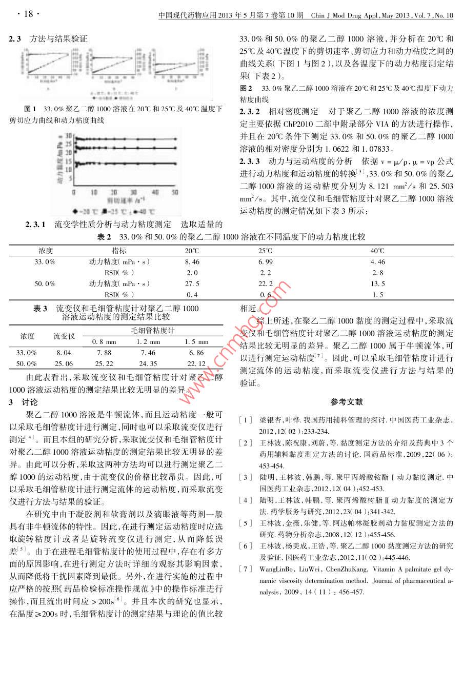 中國現(xiàn)代藥物應(yīng)用2013年5月第7卷第10期 Chin J Mod Drug Appl,May2013,vol.7,No,10聚乙二醇1000黏度測(cè)定方法的研究及驗(yàn)證孟憲亮【摘要】目的探討聚乙二醇1000粘度的測(cè)定方法和驗(yàn)證方法。方法本次研究主要采取以聚乙二醇1000為代表進(jìn)行聚乙二醇類藥用輔料粘稠度測(cè)定方法進(jìn)行探究,并采取流變儀對(duì)毛細(xì)管粘度計(jì)的測(cè)定方法和結(jié)果進(jìn)行有效的驗(yàn)證。結(jié)果臨床中采取內(nèi)徑規(guī)格為0.8mm、1.2mm、1.5mm的平氏毛細(xì)管粘度計(jì)進(jìn)行測(cè)定220下33.0%和50.0%的聚乙二醇1000溶液的運(yùn)動(dòng)粘度分別為7.88mm2/s、7.46mm2/s、6.86mm2/s;25.22mm2/s、24.35mm2/s、22.12mm2/s。通過流變儀和毛細(xì)管粘度計(jì)測(cè)得聚乙二醇1000運(yùn)動(dòng)粘度比較,其中,兩種方法所測(cè)定聚乙二醇1000運(yùn)動(dòng)粘度情況比較無明顯的差異。結(jié)論聚乙二醇1000屬于牛頓流體,可以進(jìn)行測(cè)定運(yùn)動(dòng)粘度,臨床中對(duì)于聚乙二醇1000粘度測(cè)定可以采取毛細(xì)管粘度計(jì)進(jìn)行測(cè)定流體的運(yùn)動(dòng)粘度,并采取流變儀進(jìn)行方法與結(jié)果的驗(yàn)證【關(guān)鍵詞】聚乙二醇1000粘度;測(cè)定方法;驗(yàn)證方法Research and validation of polyethylene glycol 1000 viscosity measurement method MENG Xian-liangShandong Province and Drug Inspection Boshan District, Zibo City, 255200, ChinaAbstract] Objective To investigate the polyethylene glycol 1000 Determination of the viscosity andverification methods. Methods The study mainly to take effective verification of polyethylene glycol 1000 onbehalf of a polyethylene glycol pharmaceutical excipients viscosity measurement method to explore and take themeasurement methods and results of the rheometer capillary viscometer. Results Clinical taken inner diameterpecifications as 0. 8 mm, 1. 2 mm, 1. 5 mm flat s capillary viscometer measuring 22. 033. 0% and 50. 0%Polyethylene glycol 1000 as a kinematic viscosity of the solution to 7. 88 mm/s, 7. 46 mm /s, 6. 86 mm/s25. 22 mm/s, 24 35 mm/s, 22. 12 mm/s, Rheometers and capillary viscosity measurement was polyethylene glycol 1000 kinematic viscosity, wherein the polyethylene glycol 1000 kinematic viscosity, as measured bythe two methods showed no obvious differences. Conclusion Polyethylene glycol 1000 belong Newtonian fluidand can be the determination of kinematic viscosity, clinical polyethylene glycol 1000 viscosity measurement canbe taken in a capillary viscometer for a kinematic viscosity of the fluid being measured, and methods and resultstaken rheometer validationKey words] Polyethylene glycol 1000 viscosity; Determination method; Authentication method聚乙二醇主要是由環(huán)氧乙烷和水加成聚合而得到的,具備有限公司而生產(chǎn))有較強(qiáng)的親水性,很容易被清洗,且不易穿透皮膚,一般在注1.2試劑聚乙二醇1000由上海寶瑞化工有限公司而生射劑和眼用制劑與口服等劑型中具有較廣泛的應(yīng)用。在常產(chǎn))、水為自制的去離子水。溫下,聚乙二醇200-600為液體,而聚乙二醇1000及以上均2方法與結(jié)果為固體。而且聚乙二醇1000是一種比較具有代表性的牛頓2.1溶液制備精密稱取250.0g的聚乙二醇1000,2份,流體類藥用輔料,對(duì)于其測(cè)定方法一直存在爭(zhēng)議,而且對(duì)測(cè)并將其分別置入500ml與250ml的量瓶之中,并進(jìn)行加水定結(jié)果的驗(yàn)證也存在爭(zhēng)議。因此,本文對(duì)聚乙二醇1000為溶解使其定容,最后進(jìn)行配制濃度為33.0%、50.0%的代表進(jìn)行聚乙二醇類藥用輔料粘稠度測(cè)定方法進(jìn)行探究溶液2。并采取流變儀對(duì)毛細(xì)管粘度計(jì)的測(cè)定方法和結(jié)果進(jìn)行有效2.2運(yùn)動(dòng)粘度測(cè)定采取內(nèi)徑規(guī)格為0.8mm、1.2mm、1.5的驗(yàn)證。具體的分析如下。mm的平氏毛細(xì)管粘度計(jì)進(jìn)行測(cè)定22.0℃下33.0%和1儀器與試劑50.0%的聚乙二醇1000溶液的運(yùn)動(dòng)粘度情況,具有的結(jié)果1.1試驗(yàn)儀器 Kinexus超級(jí)旋轉(zhuǎn)流變儀(由英國馬爾文儀見下表1。器有限公司而生產(chǎn))、平氏毛細(xì)管粘度計(jì)(由上海隆拓儀器設(shè)表1平氏毛細(xì)管粘度計(jì)測(cè)定聚乙二醇1000溶液的運(yùn)動(dòng)粘度結(jié)果濃度指標(biāo)0.81.2mm1.5mm流出時(shí)間(s)運(yùn)動(dòng)粘度(mm2/s)7.887.466.86RDX %0.551.220.48流出時(shí)間(s運(yùn)動(dòng)粘度(mm2/s)RSI %O0.030.1618中國現(xiàn)代藥物應(yīng)用2013年5月第7卷第10期 Chin J Mod Drug Appl,May2013,Vdl7,No,102.3方法與結(jié)果驗(yàn)證33.0%和50.0%的聚乙二醇1000溶液,并分析在20℃和25℃及40℃溫度下的剪切速率、剪切應(yīng)力和動(dòng)力粘度之間的曲線關(guān)系(下圖1與圖2),以及各溫度下的動(dòng)力粘度測(cè)定結(jié)果(下表2)。圖233.0%聚乙二醇1000溶液在20℃和25℃及40℃溫度下動(dòng)力粘度曲線圖133.0%聚乙二醇10液在20℃和25℃及40℃溫度下2.3.2相對(duì)密度測(cè)定對(duì)于聚乙二醇1000溶液的濃度測(cè)剪切應(yīng)力曲線和動(dòng)力粘度曲線定主要依據(jù)ChP2010二部中附錄部分ⅥIA的方法進(jìn)行操作并且在20℃條件下測(cè)定33.0%和50.0%的聚乙二醇1000s05溶液的相對(duì)密度分別為1.0622和1.07833。23.3動(dòng)力與運(yùn)動(dòng)粘度的分析依據(jù)v=Bp,=vp公式進(jìn)行動(dòng)力粘度和運(yùn)動(dòng)粘度的轉(zhuǎn)換3,33.0%和50.0%的聚乙醇1000溶液的運(yùn)動(dòng)粘度分別為8.121mm2/s和25.503因延率/4