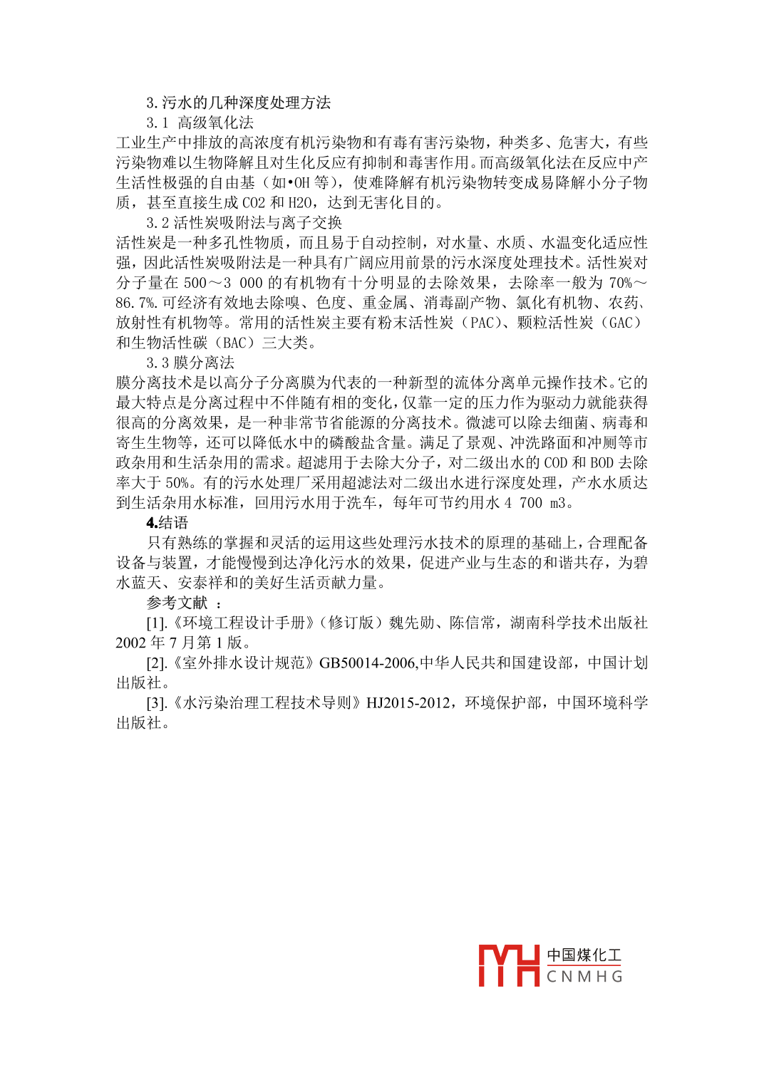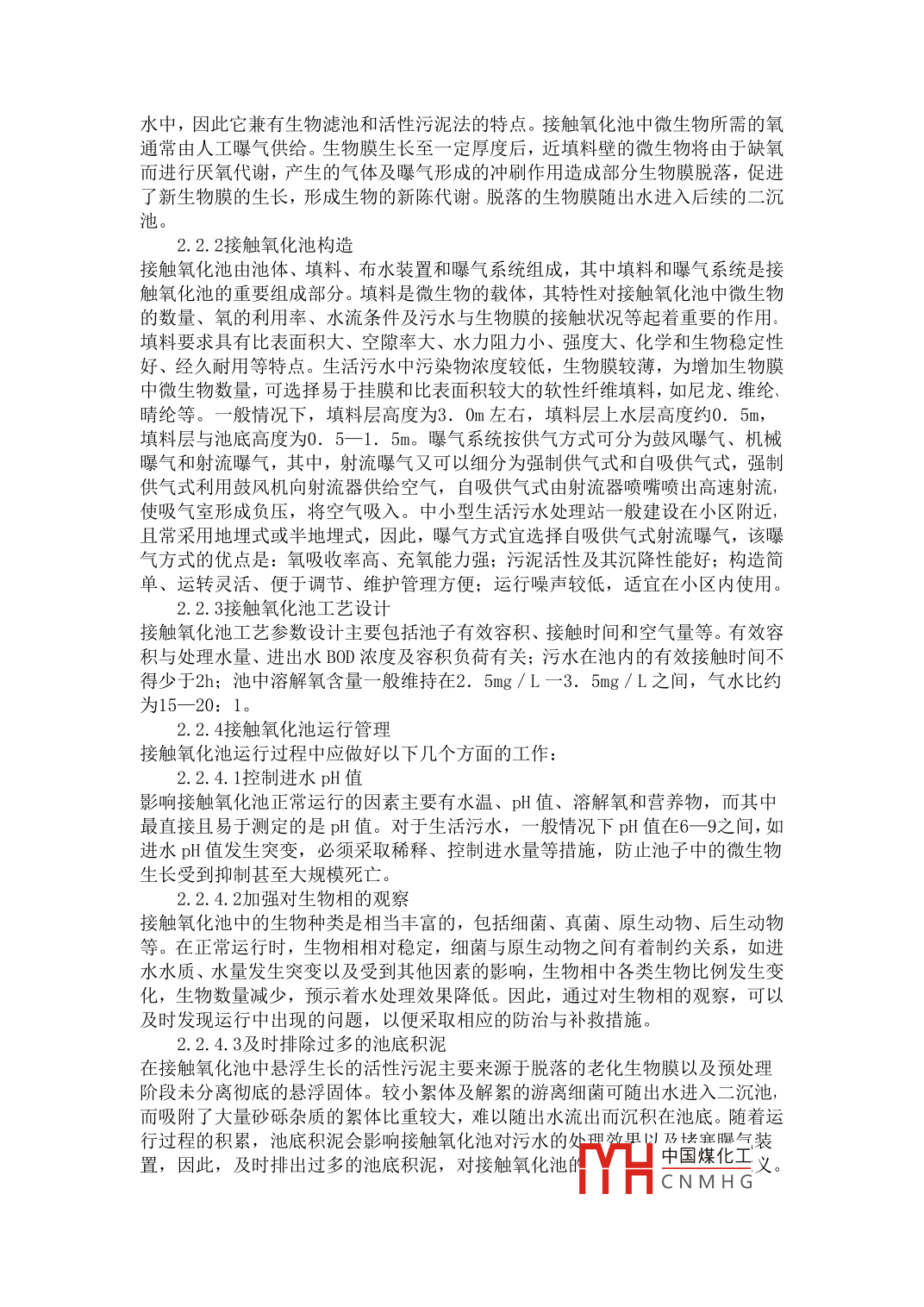 淺談環(huán)保工程現(xiàn)場(chǎng)污水處理陳松妹杭州市環(huán)境保護(hù)有限公司浙江杭州310007摘要:全球人口急劇增長(zhǎng),工業(yè)迅速發(fā)展。全球水資源狀況迅速惡化,“水危機(jī)”日趨嚴(yán)重。中國(guó)水資源人均占有量少,所以污水的處理技術(shù)變得越來越重關(guān)鍵詞:環(huán)保工程;處理工藝; 基本原理中圖分類號(hào): U664 文獻(xiàn)標(biāo)識(shí)碼: A文 章編號(hào):引言:隨著中國(guó)城市化、工業(yè)化的加劇,目前國(guó)內(nèi)外污水處理工程在設(shè)計(jì)與建設(shè)過程中最主要考慮的因素是技術(shù)。隨著科技的發(fā)展,人們審美層次越來越高,更加注重人與環(huán)境的和諧,在推崇綠色地球,環(huán)保行業(yè)的同仁如何在環(huán)保領(lǐng)域中將工程景觀化生態(tài)化有機(jī)融入綠色家園。污水處理工程景觀化生態(tài)化必將成為環(huán)保行業(yè)未來發(fā)展的一- 大趨勢(shì)。1.處理工藝本工程擬采用調(diào)節(jié)池一-體化污水處理設(shè)備- 過濾- 消毒的工藝流程污水經(jīng)格柵截留大顆粒污物后流入調(diào)節(jié)池,調(diào)節(jié)池采用曝氣式,以均衡水質(zhì)水量,并通過曝氣攪拌避免污物沉淀。調(diào)節(jié)池后部設(shè)缺氧池,好氧處理采用兩級(jí)生物接觸氧化。生物接觸氧化是處理流程中最重要的部分,大量有機(jī)物在這里被細(xì)菌好氧降解。采用多級(jí)分段式接觸氧化,形成逐級(jí)負(fù)荷遞減系統(tǒng),使接觸氧化在去除率、抗沖擊負(fù)荷、出水水質(zhì)等方面更具優(yōu)勢(shì)和可靠性。生物接觸氧化出水再經(jīng)過過濾、消毒,即可完成深度處理中水回用。2.工藝流程為了達(dá)到排放要求,處理工藝采用以生化處理A/O法為主處理的二級(jí)處理法A/0工藝,即缺氧-好氧污水處理工藝,該工藝具有適應(yīng)能力強(qiáng),耐沖擊負(fù)荷,高容積負(fù)荷,不產(chǎn)生污泥膨脹,排泥量少,脫氮效果較好等特點(diǎn),特別適合于中.小型污水處理站選用。A/0工藝由缺氧池和好氧池串聯(lián)而成,在去除有機(jī)物的同時(shí)可以取得良好的脫氮效果。該工藝的顯著特點(diǎn)是將脫氮池設(shè)置在除碳過程的前部,即:先將污水引入缺氧池,回流污泥中的反硝化菌利用原污水中的有機(jī)物作為碳源,將回流混合液中的大量硝態(tài)氮(NO- -x-N) 還原成N:,從而達(dá)到脫氮的目的;污水接著進(jìn)入好氧池,大部分有機(jī)物在此得到消化降解,好氧池后設(shè)置二沉池,部分沉淀污泥回流至缺氧池,以提供充足的微生物,同時(shí)將好氧池內(nèi)混合液回流至缺氧池,以保證缺氧池有足夠的硝酸鹽。2.1缺氧池缺氧池一般采用上流式污泥床反應(yīng)器的形式,設(shè)計(jì)水力停留時(shí)間為2- -4小時(shí) ,池底為污泥床,污泥床厚度通常控制在l - -1.2m 之間,進(jìn)水系統(tǒng)可采用脈沖進(jìn)水中阻力布水系統(tǒng),底部設(shè)布水管,運(yùn)行時(shí)污泥呈懸浮狀態(tài)。污泥床平均濃度為30- -359/ L,污泥負(fù)荷為0. 30--0. 35kgBOD, (kgMLSs ●d),污水中DO濃度小于0.2m// Lo .2.2好氧池2.2.1基本原理好氧池是利用污水中的好氧微生物在有游離氧(分子氧)存在的條件下,消化、降解污水中的有機(jī)物,使其穩(wěn)定化、無害化的處理裝置。好氧池- - 般為接觸氧化池的形式,池內(nèi)設(shè)置有填料,已經(jīng)充氧的污水浸沒全部填料并以一定的流速流經(jīng)填料。微生物一部分 以生物膜的形式固著于填料表面中國(guó)煤化工孚于YHCNMHG水中,因此它兼有生物濾池和活性污泥法的特點(diǎn)。接觸氧化池中微生物所需的氧通常由人工曝氣供給。生物膜生長(zhǎng)至一定厚度后,近填料壁的微生物將由于缺氧而進(jìn)行厭氧代謝,產(chǎn)生的氣體及曝氣形成的沖刷作用造成部分生物膜脫落,促進(jìn)了新生物膜的生長(zhǎng),形成生物的新陳代謝。脫落的生物膜隨出水進(jìn)入后續(xù)的二沉2.2.2接觸氧化池構(gòu)造接觸氧化池由池體、填料、布水裝置和曝氣系統(tǒng)組成,其中填料和曝氣系統(tǒng)是接觸氧化池的重要組成部分。填料是微生物的載體,其特性對(duì)接觸氧化池中微生物的數(shù)量、氧的利用率、水流條件及污水與生物膜的接觸狀況等起著重要的作用。填料要求具有比表面積大、空隙率大、水力阻力小、強(qiáng)度大、化學(xué)和生物穩(wěn)定性好、經(jīng)久耐用等特點(diǎn)。生活污水中污染物濃度較低,生物膜較薄,為增加生物膜中微生物數(shù)量,可選擇易于掛膜和比表面積較大的軟性纖維填料,如尼龍、維綸、晴綸等。一般情況下,填料層高度為3. Om左右,填料層上水層高度約0.5m,填料層與池底高度為0.5一1. 5m。曝氣系統(tǒng)按供氣方式可分為鼓風(fēng)曝氣、機(jī)械曝氣和射流曝氣,其中,射流曝氣又可以細(xì)分為強(qiáng)制供氣式和自吸供氣式,強(qiáng)制供氣式利用鼓風(fēng)機(jī)向射流器供給空氣,自吸供氣式由射流器噴嘴噴出高速射流,使吸氣室形成負(fù)壓,將空氣吸入。中小型生活污水處理站一般 建設(shè)在小區(qū)附近,且常采用地埋式或半地埋式,因此,曝氣方式宜選擇自吸供氣式射流曝氣,該曝氣方式的優(yōu)點(diǎn)是:氧吸收率高、充氧能力強(qiáng);污泥活性及其沉降性能好;構(gòu)造簡(jiǎn)單、運(yùn)轉(zhuǎn)靈活、便于調(diào)節(jié)、維護(hù)管理方便;