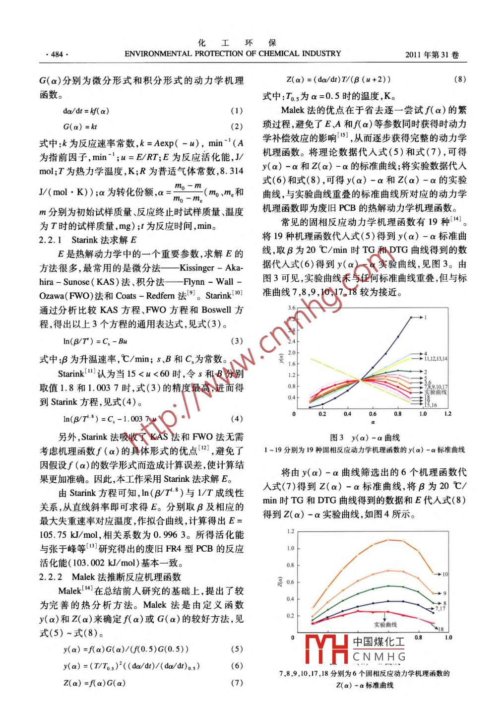 化工環(huán)保ENVIRONMENTAL PROTECTION OF CHEMICAL INDUSTRY2011年第31卷第6期廢舊印刷線路板的熱重分析及熱解動力學(xué)模型趙躍,薛勇,黃強(qiáng)2,鄧欣逸!,張義烽!(1.西南科技大學(xué)環(huán)境與資源學(xué)院固體廢棄物處理與資源化教育部重點(diǎn)實驗室,四川綿陽621010;2.綿陽市環(huán)境監(jiān)測站,四川綿陽621010)[摘要〕采用熱重(TG)分析法研究了廢舊FR4型印刷線路板(PCB)的熱解特性,探討了不同升溫速率下廢舊PCB的TG和微分熱重(DTG)曲線及變化規(guī)律,利用 Starink法精確求解熱解反應(yīng)活化能(E),利用 Malek法判斷得出廢舊PCB的熱解動力學(xué)機(jī)理函數(shù)和指前因子(A)。研究結(jié)果表明:廢舊FR4型PCB的TG和DTG曲線隨著升溫速率的增大逐步向高溫區(qū)移動;起始熱解溫度、最大失重速率對應(yīng)溫度以及終止熱解溫度也隨著升溫速率的增大而升高;廢舊FR4型PCB的E和A分別為10575kJ/mol和789×103min關(guān)鍵詞]廢舊印刷線路板;熱解;熱重分析;動力學(xué)中圖分類號]X705[文獻(xiàn)標(biāo)識碼]A文章編號]1006-1878(2011)06-0482-04Thermogravimetric Analysis and Pyrolysis Kinetics Models ofWaste Printed Circuit BoardZhao yue, Xue Yong, Huang Qiang", Deng Xinyi, Zhang yifeng(1. School of Environment and Resources, Key Laboratory of Solid Waste Treatment and Resource Recycle underMinistry of Education, Southwest University of Science and Technology, Mianyang Sichuan 621010, China;2. Sichuan Mianyang Environmental Monitoring Station, Mianyang Sichuan 621010, China)Abstract The pyrolysis characteristics of waste FR4 type printed circuit board( PCB )was studied bythermogravimetric(TG) analysis method. The TG and differential thermogravimetry(dtG) curves ofthe waste PCB at different heating rate and their changing rules were explored. The activation energy(E)of the pyrolysis reaction was solved exactly by Starink method. The mechanism function and preexponential factor(A) were obtained by Malek method. The research results show that: The TG andDTG curves of waste FR4 type PCB move to the high-temperature zone progressively with the increaseof heating rate; The initial pyrolysis temperature, the temperature corresponding to the maximumweight loss rate and the terminated pyrolysis temperature also increase with it; The e and a of thewaste PCB are 105. 75 kJ/mol and 7. 89 x 10 min respectively.Key words: waste printed circuit board; pyrolysis; gravitational thermal analysis; kinetics印刷線路板(PCB)是電子設(shè)備中不可或缺的集中于熱解產(chǎn)物的性質(zhì),較少采取熱重(TG)分組成元件,已被廣泛應(yīng)用于各種類型的計算機(jī)、家析法研究廢舊PCB的熱解動力學(xué)6。因此,需進(jìn)一用電器、工程設(shè)備等。由于信息技術(shù)的快速發(fā)展,步加強(qiáng)廢舊PCB熱解動力學(xué)的研究,為實現(xiàn)廢舊電子產(chǎn)品的更新?lián)Q代周期越來越短,因此,產(chǎn)生了PCB的工業(yè)化熱解處理提供理論指導(dǎo)。大量的廢舊PCB。這些廢舊PCB已成為城市固體廢棄物污染的主要來源之一。熱解技術(shù)在處理收稿日期01-0614:修訂日期1201-07-29作者簡介]田山少苛澤市人,碩士生城市生活垃圾、廢輪胎等方面已有相對成熟的工主要研究中國煤化工化處理。電話藝2-3。但廢舊PCB的成分復(fù)雜,在熱解處理過程15228402994CNMHGom中會產(chǎn)生大量的腐蝕性氣體和溴代多環(huán)芳烴等有基金項目]教育部固體廢棄物處理與資源化重點(diǎn)實驗室毒產(chǎn)物。現(xiàn)階段,對于廢舊PCB熱解的研究主要項目(08zXGP02)。第6期趙躍,等.廢舊印刷線路板的熱重分析及熱解動力學(xué)模型本工作采用同步TG分析儀對常見的廢舊FR4重率較小,主要發(fā)生碳化反應(yīng),最后剩余不揮發(fā)固型PCB進(jìn)行TG實驗研究,通過對TG和微分熱重體產(chǎn)物(主要為熱解炭)。DTG)曲線的分析得出廢舊PCB的熱解特性參數(shù),利用 Starink法和 Malek法求解熱解動力學(xué)參數(shù),進(jìn)而建立合理的廢舊PCB熱解動力學(xué)模型,正確描述廢舊PCB的熱解機(jī)理。1實驗部分1.1原料和儀器實驗用廢舊PCB基板(已除去表面的金屬覆層和電子元件):型號FR4,四川某電子科技公司。經(jīng)500600700800液氮低溫破碎后粒徑為0.18~0.30mm,在恒溫干圖1不同升溫速率下廢舊PCB的TG曲線燥箱中于105℃下干燥處理24h后待用。廢舊升溫速率/(℃·mn-1):a0;b20;c30PCB的元素分析見表1。表1廢舊PCB的元素分析元素H質(zhì)量分?jǐn)?shù),%37.545.1216.370.520.21SDT-Q600型TG分析儀:美國TA公司1.2實驗方法以高純N2為載氣,在載氣流量為50mL/min的條件下,采用TG分析儀對廢舊FR4型PCB進(jìn)行實驗研究。熱解溫度由室溫升至800℃,試樣質(zhì)量圖2不同升溫速率下廢舊PCB的DTG曲線10mg。升溫速率/(℃·min1):a10;b20;c302結(jié)果與討論由TG和DTG曲線得出廢舊PCB在不同升溫2.1廢舊PCB的TG和DTG曲線分析速率下的熱解特性參數(shù)結(jié)果見表2。由表2可見廢舊PCB在不同升溫速率下的TG和DTG曲隨著升溫速率的增大,起始熱解溫度、最大失重速線見圖1和圖2。由圖1可見,隨升溫速率的增加,率對應(yīng)溫度、終止熱解溫度、最大失重速率都隨之TG曲線向高溫區(qū)偏移。由圖2可見,隨升溫速率增大,反應(yīng)程度更加劇烈。這是由于廢舊PCB的熱的增加,DG曲線峰值溫度向高溫區(qū)移動,峰面積解受試樣顆粒內(nèi)、外的傳熱和傳質(zhì)等因素影響逐漸增大。試樣在280-480℃存在一個劇烈的失升溫速率增加時試樣沒有足夠的時間吸收熱量,導(dǎo)重段,該溫度區(qū)間的失重率約為36.9%-4