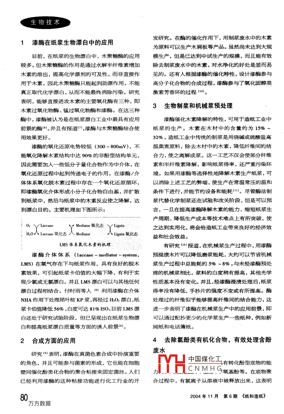 生物技術(shù)漆>〈酶〉〈及〉其〈應(yīng)〉〈用●魏華麗,史安石,石淑蘭(天津科技大學(xué),天津300222)摘要:漆酶是一種含銅多酚氧化酶,具有催化氧化酚型底物的能力。漆酶在很多領(lǐng)域得到了廣泛的應(yīng)用。本文主要從紙漿的生物漂白、生物制漿、去除氯酚類化合物的毒性等幾個方面進行了介紹。關(guān)鍵詞;漆酶;多酚氧化酶;酚型底物;自由基;應(yīng)用;漆酶/介體體系中圖分類號:Q814文獻標識碼:A文章編號:1001-6309(2004)06-0079-03漆酶( laccase)是指一類性質(zhì)相近而又不完全作用相同的多酚氧化酶的總稱。最早是在1883年由已經(jīng)證明m,漆酶的催化氧化反應(yīng)需要氧氣Yoshida首先從漆樹液中發(fā)現(xiàn)的,后來人們又從大作催化反應(yīng)的中間物。漆酶在有氧條件下催化氧量的真菌體中發(fā)現(xiàn)了漆酶。由于漆酶來源很多,結(jié)化酚類化合物,同時分子氧被還原成水,在這一過構(gòu)各異,因此不同來源的漆酶表現(xiàn)出來的催化特性程中,漆酶從氧化底物分子中提取1個電子,使之相差較大。即便是同一來源,如同一白腐菌菌種,可形成自由基,自由基不穩(wěn)定,進一步發(fā)生聚合或解分泌出不同性質(zhì)的漆酶組分,包括其氧化能力、最聚反應(yīng))適pH、底物專一性等,因此催化氧化作用也各不相漆酶的催化氧化機理主要表現(xiàn)在底物自由基同的生成和漆酶分子中4個銅離子的協(xié)同作用。當漆漆酶是一種多酚氧化酶,也是一種典型含銅糖酶催化酚類(如氫醌)氧化時,首先是底物氫醌向漆蛋白,具有特征性吸收光譜。通常認為,每個漆酶蛋酶轉(zhuǎn)移1個電子,生成半醌—氧自由基中間體,白分子中含有4個銅離子,分屬于3類,其中I型1用ESR可觀察到明顯的自由基信號。其次是不均等個,Ⅱ型1個,Ⅲ型2個。漆酶分子中的銅離子是漆非酶反應(yīng),2分子半醌生成1分子對苯醌和1分子酶催化反應(yīng)的活性中心,在催化氧化過程中起決定氫醌。氧自由基中間體還能轉(zhuǎn)變成碳自由基中間體它們可以自身結(jié)合或相互偶聯(lián),產(chǎn)物中除醌外還有聚合物和C-O、C-C偶聯(lián)產(chǎn)物3-5。在氧氣的存在下,還原態(tài)漆酶被氧化氧氣被還原成水。漆酶催化底物氧化和對氧氣的還原是通過4個銅離子協(xié)同地傳遞電子和價態(tài)變化實現(xiàn)的。很多研究表明,漆酶可以降解木素,與有毒的酚類中國煤化工環(huán)保等方面得到泛的CNMHG簡單介紹。作者簡介:魏華麗(1977-),女,在讀博士,主要方向為漆酶的應(yīng)用聯(lián)系電話:022-2817575828193513Paper and Paper Making Nov 200479生物技術(shù)1漆酶在紙漿生物漂白中的應(yīng)用發(fā)研究。在酶的催化作用下,用制漿廢水中的木素為原料可以生產(chǎn)木屑板等產(chǎn)品。雖然尚未達到大規(guī)目前,在紙漿的生物漂白中,木聚糖酶的應(yīng)用模生產(chǎn),但是已達到中試生產(chǎn)的規(guī)模,而且能有效較多。但木聚糖酶的作用是通過水解半纖維素增加除去制漿廢水中的木素,對水凈化的好處是顯而易木素的溶出,提高化學(xué)漂劑的可及性,而非直接作見的。還有人根據(jù)漆酶的催化特性,設(shè)計漆酶參與用于木素,因此木聚糖酶只能起到助漂作用,不能高分子化合物的合成過程,漆酶參與了氧化固醇類真正取代化學(xué)漂白,從而不能最終消除污染。研究激素芳香環(huán)的過程10。表明,能夠直接進攻木素的主要氧化酶有三種,即3生物制漿和機械漿預(yù)處理木素過氧化物酶、錳過氧化物酶和漆酶。在這三種酶中,漆酶被認為是在紙漿漂白工業(yè)中最具有應(yīng)用漆酶催化木素降解的特性,可用于造紙工業(yè)中前景的酶6并且有報道,漆酶與木聚糖酶結(jié)合使紙漿的生產(chǎn)。木素在木材中的含量約為15%用效果更好。32%。造紙工業(yè)中傳統(tǒng)的制漿是用燒堿或硫酸鹽高漆酶的氧化還原電勢較低(300~800mV),不溫蒸煮原料,除去木材中的木素,降低纖維間的結(jié)能氧化降解木素結(jié)構(gòu)中達90%的非酚型結(jié)構(gòu)單元,合力,使之離解成漿。這一工藝不僅會使部分纖維因此需要加入一些低分子量化合物作為中介體,在素和半纖維素降解,影響紙漿得率,還嚴重污染環(huán)氧化還原過程中起到傳遞電子的作用。在漆酶/介境。如果用漆酶等選擇性地降解木素生產(chǎn)紙漿,可體體系氧化脫木素過程中存在一個氧化還原循環(huán),以消除上述工藝的弊端,使生產(chǎn)在常溫常壓的溫和即漆酶氧化介體形成小分子化合物自由基,并擴散條件下進行,并能節(jié)約設(shè)備和能耗(。盡管酶法制到紙漿中,然后與紙漿中的木素反應(yīng)使之降解,達漿代替化學(xué)制漿還在試驗和攻關(guān)階段,但是可以預(yù)到漂白目的。主要機理如下圖所示言,一旦在提高漆酶降解木素的能力、縮短紙漿生產(chǎn)周期、降低生產(chǎn)成本等技術(shù)難點上有所突破,使LaccaseMediator氧化態(tài) LIgnin之達到實用化,將會給造紙工業(yè)帶來良好的經(jīng)濟效HO人 Laccase氧化態(tài)人 MediateLignin 2氧化態(tài)益和社會效益。LMS體系氧化木素的機理有研究報道,在機械漿生產(chǎn)過程中,用漆酶漆酶介體體系(1 accase- mediator- system,預(yù)浸漬木片可以降低磨漿能耗,大約可以節(jié)省機械LMS)在氧氣存在下與紙漿作用,具有良好的脫木漿生產(chǎn)過程中總能耗的5%~8%。與未經(jīng)漆酶預(yù)處素效果,可