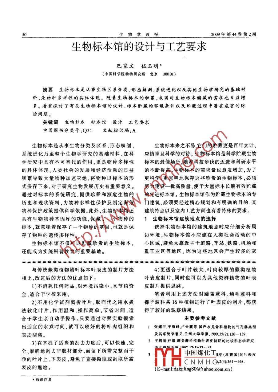 生物學(xué)通報(bào)2009年第44卷第2期生物標(biāo)本館的設(shè)計(jì)與工藝要求巴家文伍玉明·(中國科學(xué)院動(dòng)物研究所北京100101)摘要生物標(biāo)本是從事生物區(qū)系分類、形態(tài)解剖、系統(tǒng)進(jìn)化以及其他生物學(xué)研究的基礎(chǔ)材料,是物種多樣性的具體體現(xiàn)。隨著生物標(biāo)本的積累,我國對(duì)生物標(biāo)本儲(chǔ)藏的需求也日益增多。著重探討了有關(guān)生物標(biāo)本館的設(shè)計(jì)、標(biāo)本貯藏的環(huán)境條件以及貯藏過程中潛在危害的防治問題。關(guān)鍵詞生物標(biāo)本標(biāo)本館設(shè)計(jì)工藝要求中國圖書分類號(hào):Q34文獻(xiàn)標(biāo)識(shí)碼:A生物標(biāo)本是從事生物分類及區(qū)系、形態(tài)解剖、生物標(biāo)本來之不易,它們的貯藏更是百年大計(jì)系統(tǒng)進(jìn)化乃至整個(gè)生物學(xué)研究的基礎(chǔ)材料,在科應(yīng)慎重且科學(xué)的對(duì)待。生物標(biāo)本館是科學(xué)貯藏生物學(xué)研究中具有不可替代的作用,更是物種多樣性標(biāo)本的最佳場(chǎng)所,隨著科技步伐的邁進(jìn)和科研水平的具體體現(xiàn)。人類社會(huì)的發(fā)展和經(jīng)濟(jì)活動(dòng)的日益的不斷提高,生物標(biāo)本的需求量也愈發(fā)增加,為了頻繁導(dǎo)致大量物種加速滅絕,將物種以標(biāo)本的形更科學(xué)、更完善地保存這些珍貴的生物標(biāo)本,必須式保存下來,對(duì)于研究生物發(fā)展歷史有重要意義。努力建設(shè)一批高質(zhì)量、便于大量標(biāo)本長(zhǎng)期有效貯藏通過對(duì)標(biāo)本的系統(tǒng)研究,提供珍稀和瀕危生物的的先進(jìn)標(biāo)本館。生物標(biāo)本館作為貯藏生物標(biāo)本的專歷史和現(xiàn)狀資料,為物種多樣性保護(hù)及制定瀕危門建筑,必須要經(jīng)過精心規(guī)劃和有明確的目的,其物種保護(hù)政策提供科學(xué)依據(jù)。此外,生物標(biāo)本館還建筑特點(diǎn)以及室內(nèi)工藝方面也有著特殊的要求。具有生物物種基因庫的功能,保藏了一個(gè)物種的1生物標(biāo)本館建筑地點(diǎn)的選擇標(biāo)本,就意味著保存了一個(gè)物種的基因,也就是保選擇生物標(biāo)本館的建筑地點(diǎn)時(shí)應(yīng)仔細(xì)分析周存了物種的遺傳多樣性邊環(huán)境,生物標(biāo)本館不應(yīng)建在人類社會(huì)活動(dòng)的中生物標(biāo)本館不僅可以貯藏珍貴的生物標(biāo)本,心區(qū)域,避免太靠近主干道路、車站、鐵路、機(jī)場(chǎng)和還能成為實(shí)施科普教育的重要基地。重工業(yè)區(qū)等地區(qū)。因?yàn)檫@些地區(qū)會(huì)產(chǎn)生較多的灰r出t上出★物★如業(yè)業(yè)★業(yè)出北與傳統(tǒng)蕨類植物臘葉標(biāo)本葉表皮的制片方法4)更適合于葉片較大、葉肉較厚的蕨類植物相比,改進(jìn)后的方法的優(yōu)點(diǎn)如下葉表皮制片,同時(shí)也可以為其他類群植物的葉表1)不消耗任何藥品,對(duì)環(huán)境污染小,且節(jié)約資皮制片提供思路。金,適合于學(xué)校采用筆者利用上述方法對(duì)蹄蓋蕨科、鱗毛蕨科和2)不用化學(xué)試劑離析葉片,取而代之用水煮裸子蕨科共16種植物進(jìn)行了葉表皮的制片,都獲法軟化葉片,作用溫和,操作簡(jiǎn)單,節(jié)省時(shí)間,適得了較好的觀察結(jié)果。合于學(xué)生親自動(dòng)手操作。只要通過對(duì)照實(shí)驗(yàn)摸索主要參考文獻(xiàn)出適宜的水煮時(shí)間,就可以較好的將葉肉組織和1張耀甲于海睡盧云霞等國產(chǎn)水龍骨科植物的氣孔器類型表皮刮離及其系統(tǒng)學(xué)意義.蘭州大學(xué)學(xué)報(bào),1999,35(2):130-1393)在掌握了適當(dāng)?shù)墓稳チΧ群?可以快速、完2王瑪麗,任毅蹄蓋蕨科植物葉表皮特征的比較形態(tài)學(xué)研究.招100717/.27-A2全、準(zhǔn)確地刮去非取材部分,而留下所需完整而干中國煤化工碳組(耳蕨屬)的葉表皮凈的葉片上、下表皮,避免了直接撕取或刮取所需CNMHG,2(4361-368表皮的尷尬。(E-mail:daixiling80@Yahoo.com.cn)通訊作者2000年第44卷第2期塵和氣體污染物,而且持續(xù)的巨大噪音產(chǎn)生的顫立建造的房屋或標(biāo)本館樓里隔開的獨(dú)立房間設(shè)置動(dòng)也不利于標(biāo)本的保存。些進(jìn)行生物標(biāo)本處理的基本配套設(shè)施:氣候是影響標(biāo)本館選址的重要因素,應(yīng)充分23.1標(biāo)本接收與凈化設(shè)備接收標(biāo)本的區(qū)域參考當(dāng)?shù)氐臍夂蛱攸c(diǎn),比如生物標(biāo)本館應(yīng)建在當(dāng)最好安排在標(biāo)本館內(nèi)完全隔離的房間里,這些地地河道的水平面以上,在潮濕的沿海地區(qū),標(biāo)本館方應(yīng)有充分的空間來檢查和處理標(biāo)本害蟲而對(duì)標(biāo)應(yīng)建在高于海平面以上位置,這樣既能避免很高本館不造成危險(xiǎn)。要多設(shè)置一些接收標(biāo)本的層架的相對(duì)濕度,也能盡量避免特大洪水的襲擊。環(huán)境條件要盡可能與主標(biāo)本館一致。必須有放置另外還要考慮地質(zhì)問題,堅(jiān)固的地基是任何一凈化器具的地方,在使用化學(xué)方法的情況下,特殊個(gè)建筑物的基礎(chǔ)。建立專門的植物標(biāo)本館時(shí)可以考的通風(fēng)設(shè)備也很有必要。慮盡量靠近或直接建在植物物種多樣性較高區(qū)域,2.3.2殺毒房標(biāo)本也還可能要進(jìn)行毒殺處理