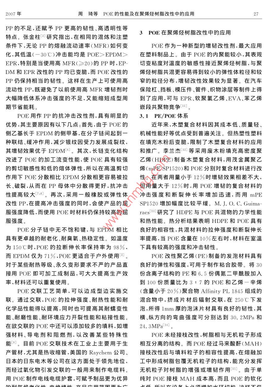 第28卷第4期特種橡膠制品Vol. 28 No. 42007年8月Special Purpose Rubber ProductsAugust 2007POE的性能及在聚烯烴樹脂改性中的應(yīng)用周琦,王勇,邱桂學(xué)(青島科技大學(xué)橡塑材料與工程教育部重點實驗室,山東青島266042)摘要:介紹了 茂金屬聚烯烴彈性體POE的性能特點,與傳統(tǒng)三元乙丙橡膠相比,POE具有優(yōu)異的力學(xué)性能和良好的加工流變性。POE作為一種新型材料,是聚烯烴樹脂有效的抗沖擊改性劑,本文綜述了POE在聚乙烯和聚丙烯樹脂改性中的應(yīng)用進展。關(guān)鍵詞:聚烯烴彈性體;三元乙丙橡膠;改性劑;聚乙烯;聚丙烯中圖分類號:TQ334.2文獻標識碼:B文章編號:1005 - 4030(2007)04 - 0026- 04POE是乙烯和辛烯在茂金屬催化劑作用下原子少,具有更優(yōu)異的熱穩(wěn)定性和耐候性。聚合而成的聚烯烴熱塑性彈性體,由美國DOW(2)商品化POE呈顆粒狀,可以直接加入到化學(xué)公司采用限定幾何構(gòu)型催化劑技術(shù)(CGCT聚丙烯(PP)等粒狀聚合物中,混合更快速、更均技術(shù))開發(fā)成功口。這種技術(shù)生產(chǎn)的POE分子鏈勻。飽和、結(jié)構(gòu)可人為控制、具有窄相對分子質(zhì)量分布(3)較強的剪切敏感性、熔體強度和窄的相和窄共聚單體分布,因此POE具有優(yōu)異的耐老對分子質(zhì)量分布,使材料邊緣在加工中不易卷曲,化.耐紫外光性、良好的力學(xué)性能和加工流變性且彌補了擠出片材時材料易下垂和難以吹膜的缺能,與聚烯烴親和性好、低溫韌性突出、性能價格陷。比高等優(yōu)點,使其在聚烯烴的增韌改性,醫(yī)用包裝(4)可用過氧化物、硅烷和輻射方法交聯(lián),交材料、汽車配件、電線電纜方面得到了廣泛的應(yīng)聯(lián)POE的熱老化及紫外光氣候老化性能優(yōu)于三用。元乙丙橡膠(EPDM)和二元乙丙橡膠(EPR)。(5)未交聯(lián)POE的密度比乙烯一醋酸乙烯共1POE的性能特點聚物(EVA)和苯乙烯一丁二烯一苯乙烯共聚物POE采用溶液法聚合工藝生產(chǎn),單體辛烯含(SBS)低10%~ 20%,材料透明度高。量在20%~30%之間,密度較低,基本結(jié)構(gòu)如下(6)加工性與力學(xué)性能平衡性優(yōu)。-般彈性所示:體的門尼粘度低,加工性好,而力學(xué)性能差。常用∈∈CH2- CH2X∈CH2- CH分玉彈性體門尼粘度在20~90之間,而POE的門尼(CH2)s粘度在5~35之間,但力學(xué)性能卻能和高門尼粘度熱塑性丁苯橡膠媲美。CH3其中聚乙烯鏈結(jié)晶區(qū)起物理交聯(lián)點承受載荷作為增韌材料,POE具有添加量少、增韌效的作用,一定量辛烯的引入降低了聚乙烯鏈的結(jié)果明顯、對基礎(chǔ)樹脂性能影響小等特點。這種新晶度,形成了呈現(xiàn)橡膠彈性的無定型區(qū)。聚合物.型高分子聚合物的出現(xiàn)引起了全球橡塑界的廣泛的微觀結(jié)構(gòu)決定其宏觀性能,分子結(jié)構(gòu)的特殊性關(guān)注,也為聚合物的改性和加工應(yīng)用帶來一個全使POE具有優(yōu)異的綜合性能,與其他傳統(tǒng)彈性體新的理念[5]。相比,POE具有以下主要特點[2~4]:2POE與傳統(tǒng)EPDM的比較(1)分子鏈結(jié)構(gòu)中沒有不飽和鍵,所含叔碳EPDM分子主鏈為飽和結(jié)構(gòu),分子鏈柔順彈性好,可以改進聚丙烯(PP)的缺口沖擊韌性,但收稿日期:2006-10-27.作者簡介:周琦(1982-).女 ,在讀碩士研究生,主要研究茂金屬在耐候性、熱穩(wěn)定性、加工性等方面存在一些缺聚烯烴彈理體的改性及應(yīng)用。陷。而POE改性PP不僅可以克服EPDM增韌2007年周琦等POE的性能及在聚烯烴樹脂改性中的應(yīng)用27PP的不足,還賦予PP更高的韌性、高透明性等3POE在聚烯烴樹脂改性中的應(yīng)用特點。張金柱[2]研究指出,在相同的混煉和注塑條件下,無論PP的熔融流動速率(MFR)如何變.POE作為一種新型的增韌改性劑,最大應(yīng)用化,其低溫(-30"C)沖擊能均是POE>EPDM>在塑料制品上。由于POE的內(nèi)聚能較小,其表觀EPR,特別是當(dāng)使用高MFR(≥20)的PP時,EP-切變粘度對溫度的敏感性接近聚烯烴樹脂,與聚.DM和EPR改性的PP均已變脆,而POE改性的烯烴樹脂共混更容易得到較小的彈性體粒徑和較PP仍保持相當(dāng)?shù)捻g性。這樣在生產(chǎn)上可使用高窄的粒徑分布,增韌改性效果較為顯著。在汽車流動性PP,既避免了以前使用高MFR增韌劑時保險杠、擋板、模壓件、管件、織物涂層等制件.上得大幅降低體系沖擊強度的不足,又能縮短成型周到了應(yīng)用,可與EPR、軟聚氯乙烯、EVA.苯乙烯.期節(jié)省能耗。嵌段共聚物競爭11]。POE用作PP的抗沖擊改性劑,具有明顯的3.1 PE/POE 體系優(yōu)勢,其主要原因有以下幾點:首先,由于POE的近年來,木塑復(fù)合材料因其成本低、質(zhì)量輕、側(cè)乙基長于EPDM的側(cè)甲基.在分子鏈間起到一機械性能好等優(yōu)點受到普遍關(guān)注。但熱塑性塑料種聯(lián)結(jié)、緩沖作用,減少銀紋因受力發(fā)展成裂紋,在填充木粉后變脆,限制了木塑復(fù)合材料的應(yīng)用其增韌效果優(yōu)于EPDM[6]。其次,長鏈支化結(jié)構(gòu)和推廣。李蘭杰[121 等采用廢木粉填充高密度聚改進了POE的加工流變性能,使POE具有較強.乙烯(HDPE)制備木塑復(fù)合材料,用茂金屬聚乙的剪切敏感性和低的熔體彈性,所以在高溫剪切烯(mPESP1520)和POE分別對復(fù)合材料進行改作用下POE分散相比EPDM分散相更容易被拉性。在兩者用量小于12%時增韌效果相差不大,長、破裂,從而在PP母體中分散得更好,抗沖擊但用量大于12%時,用POE增韌的復(f