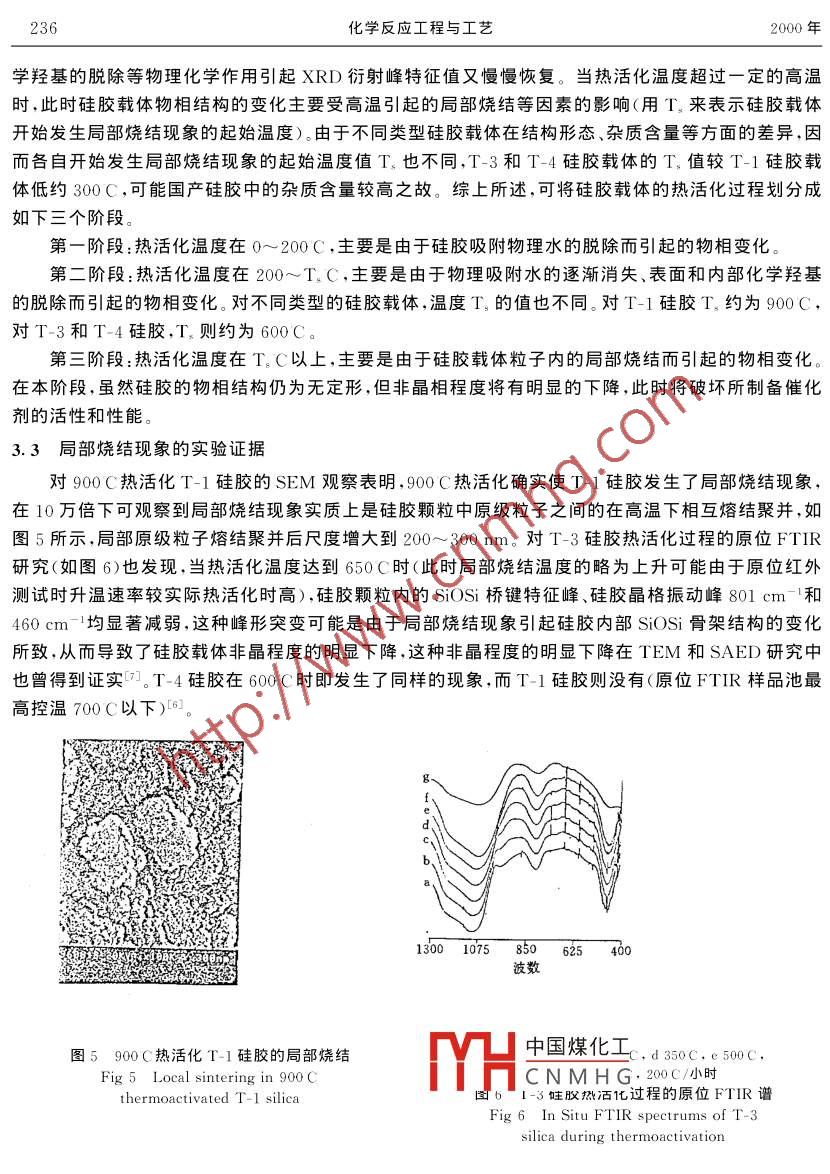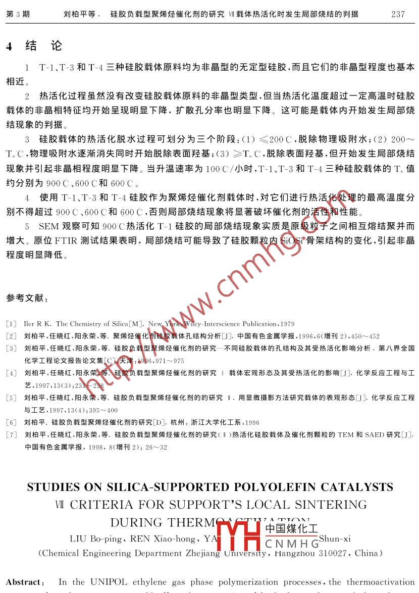 第16卷第3期化學反應工程與工藝16,No32000年9月Chemical Reaction Engineering and TechnologySept, 2000文章編號:1001-7631(2000)03-0233-06硅膠負載型聚烯烴催化劑的研究Ⅶ載體熱活化時發(fā)生局部燒結(jié)的判據(jù)劉柏平,任曉紅,陽永榮,戎順熙(浙江大學化工系聯(lián)合化學反應工程研究所,浙江杭州310027)摘要:硅膠載體熱活化過程中的局部燒結(jié)現(xiàn)象對催化劑的活性和性能有較大的破壞作用。本文利用ⅹRDSEM和原位FIIR等手段對三種熱活化硅膠載體進行了研究。研究表明,T-1、T-3和T-4三種硅膠載體發(fā)生局部燒結(jié)現(xiàn)象的起始溫度T、值約分別為9ωθ℃、600℃和6ωθ℃(升溫速率100℃小時),局部燒結(jié)現(xiàn)象將引起硅膠載體非晶程度下降,擴散孔分率下降。SEM觀察到了ρθ0℃熱活化T-1硅膠中的局部燒結(jié)現(xiàn)象,其實質(zhì)是原級粒子之間相互熔結(jié)聚并而增大。原位紅外結(jié)果則表明,局部燒結(jié)可能導致了硅膠顆粒內(nèi)部 SiSI骨架結(jié)構(gòu)的變化關(guān)鍵詞:聚烯烴催化劑載體;硅膠熱活化;局部燒結(jié)中圖分類號:TQ314.24-2文獻標識碼:A1前言近年來, UNIPOI氣相聚乙烯工藝由于其自身明顯的優(yōu)勢而在世界聚乙烯工業(yè)的發(fā)展中占據(jù)了主導地位,該工藝中使用的負載型催化劑載體材料主要為無定形硅膠。用作聚乙烯催化劑載體的硅膠,必須經(jīng)過一定溫度下的熱活化過程才能用于催化劑的制備。通過熱活化,一方面脫除物理吸附水另一方面脫除一部分表面羥基以調(diào)節(jié)表面羥基密度用于負載催化劑活性組分。但熱活化也會對載體的物理結(jié)構(gòu)形態(tài)產(chǎn)生影響-S,尤其當熱活化溫度升高到一定程度時會導致硅膠局部燒結(jié)現(xiàn)象的發(fā)生,局部燒結(jié)將對催化劑的活性和性能產(chǎn)生較大的破壞作用,但文獻中對這一現(xiàn)象的硏究報道很少,本文使用XRD、SEM和原位FTIR等手段對硅膠載體熱活化過程中的局部燒結(jié)現(xiàn)象進行了研究,得出了一些局部燒結(jié)現(xiàn)象發(fā)生的判據(jù)與規(guī)律。2實驗部分2.1原材料實驗中使用的原材料及其規(guī)格請參見文獻[5]2.2實驗方法V凵中國煤化工2.2.1載體硅膠的熱活化CNMHG硅膠載體的熱活化過程(升溫速率為100C/小時)請參見文獻[4]。收稿日期:1998-10-30;修訂1999-07-21作者簡介:劉柏平(1966),男,博士基金項目:國家自然科學基金項目(No.29706010)和中國石化總公司基金項目(X598038)234化學反應工程與工藝2000年2.2.2X射線衍射(XRD)方法ⅹRD是研究物質(zhì)物相結(jié)構(gòu)特征的主要手段。對載體及其熱活化樣品的XRD研究,可考察載體的物相結(jié)構(gòu)受熱活化影響的變化規(guī)律(A)實驗儀器日本理學( Rigaku)D/MAX一Ⅲ-B全自動X射線衍射儀。用CuK。輻射或FeK。輻射,功率1.2kw至1.6kw用石墨單色器濾波或在入射線束中加№i濾波方法除去Ka輻射,用定時階梯掃描方式收集數(shù)據(jù),階寬0.02°,時間2秒至20秒,20為70°,掃描速度:2°/min。對CuKa,λ=0.1542nm,對于FeKa,λ=0.1937nm。(B)制樣方法用膠泥將載樣框片的一面平整地密封。將硅膠樣品均勻地在框片的平板形框體中灑滿一層,然后用潔凈的玻璃將樣品壓緊壓平為確保樣品在測試過程中不至于疏松脫落,壓緊前可在樣品中滴入幾滴惰性溶劑如甲苯等。C)操作方法將載樣框片裝入Ⅹ射線衍射儀上的樣品臺,即可啟動儀器進行衍射實驗2.3SEM觀察及原位FTIR測試SEM方法請參見本系列之Ⅵ,原位FTIR測試請參見文獻[6]。3結(jié)果及討論T-3原料硅膠3.1不同類型原料硅膠的物相結(jié)構(gòu)T4原料硅膠負載型乙烯聚合催化劑所使用的載體要求必須是無定形硅膠即非晶型的硅膠。圖1所示是T-1、T-3和T-4三種原料硅膠的ⅩRD衍射曲線。這三條曲線均呈現(xiàn)為饅T-1原料硅膠頭峰,為典型的非晶型物相結(jié)構(gòu)特征。由此,可以得岀這樣的結(jié)論即這三種原料硅膠載體均為無定形硅膠。對表110中所給出的這三種原料硅膠的XRD曲線饅頭峰的特征值進行比較可知,峰的衍射角位、凈峰面積、積分寬和半寬高等特征值都非常接近,亦進一步說明了三種原料硅膠載體Fig1 X-ray diffraction diagrams of raw silicas的非晶程度比較相近。表1原料硅膠載體XRD衍射峰旳特征值比較Table 1 Characteristic numbers of raw silicas X-ray diffraction diagrams原料硅膠類型衍射峰角位()凈峰面積峰的積分寬峰的半寬高1693568.2357.1718.3737.569V凵中國煤化工3.2熱活化對硅膠物相結(jié)構(gòu)的影響CNMHG圖2所示是T-1硅膠在不同的活化溫度下的XRD衍射曲線。六條曲線均為典型的饅頭峰,所以它們?nèi)允欠蔷臀锵嘟Y(jié)構(gòu)。這說明在θ~9ωθ℃溫度范圍內(nèi)對T-1硅膠載體的熱活化沒有改變硅膠載體的非晶相結(jié)構(gòu)類型。T-3和T-4硅膠經(jīng)過600C、800C的熱活化后的XRD曲線也均呈現(xiàn)為典型的饅頭峰,從峰的特征也可得知相應溫度下的熱活化過程沒有改變T-3和T-4硅膠非晶相結(jié)構(gòu)類型。劉柏平等.硅膠負載型聚烯烴催化劑的研究Ⅵ載體熱活化時發(fā)生局部燒結(jié)的判據(jù)235表2熱活化硅膠載體XRD衍射峰的特征值Table 2 Characteristic numbers of thermoactivted900℃silica'sx-ray diffraction diagrams800℃洼膠衍射峰凈峰峰的類型角位(°)面積積分寬半寬高400℃T-1200C1247447,781T-1400C7.199200℃T-1600C23.51749578.6117.31I-1800C23.45原料T-1900C23.126.9522.73696528.3737.569T-3600C22.0573137.23665438.214圖2T