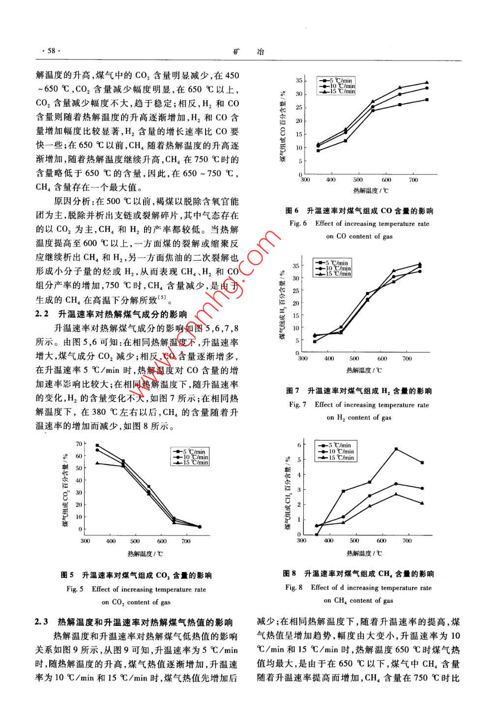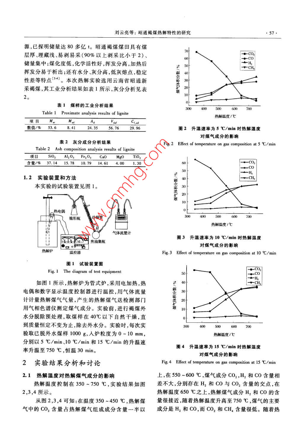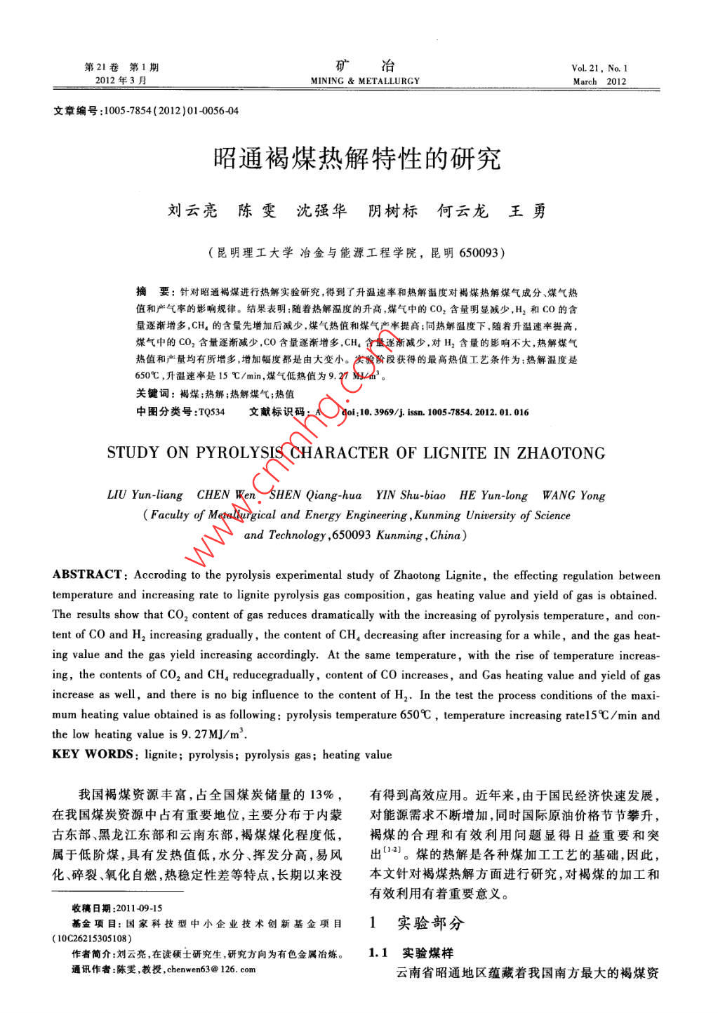 第21卷第1期礦冶Vol. 21, No. 12012年3月mining metallurgyMarch 2012章編號(hào):10057854(2012)01-005604昭通褐煤熱解特性的研究劉云亮陳雯沈強(qiáng)華陰樹標(biāo)何云龍王勇(昆明理工大學(xué)冶金與能源工程學(xué)院,昆明650093)摘要:針對(duì)昭通褐煤進(jìn)行熱解實(shí)驗(yàn)研究,得到了升溫速率和熱解溫度對(duì)褐煤熱解煤氣成分、煤氣熱值和產(chǎn)氣率的影響規(guī)律。結(jié)果表明:隨著熱解溫度的升高煤氣中的CO2含量明顯減少,H2和CO的含量逐漸增多,CH4的含量先增加后減少,煤氣熱值和煤氣產(chǎn)率提高;同熱解溫度下,隨著升溫速率提高煤氣中的CO2含量逐漸減少,CO含量逐漸增多,CH4含量逐漸減少,對(duì)H2含量的影響不大,熱解煤氣熱值和產(chǎn)量均有所增多,增加幅度都是由大變小。實(shí)驗(yàn)階段獲得的最高熱值工藝條件為;熱解溫度是650℃,升溫速率是15℃/min,煤氣低熱值為927MJ/m3。關(guān)鍵詞:褐煤;熱解;熱解煤氣;熱值中圖分類號(hào):TQs34文獻(xiàn)標(biāo)識(shí)碼:Ado:10.3969/Jisn.10057854.2012.01.016STUDY ON PYROLYSIS CHARACTER OF LIGNITE IN ZHAOTONGLIU Yun-liang CHEN Wen ShEN Qiang-hua YIN Shu-biao HE Yun-Long WANG YongFaculty of Metallurgical and Energy Engineering, Kunming University of Scienceand Technology, 650093 Kunming, China)ABSTRACT: Accroding to the pyrolysis experimental study of Zhaotong Lignite, the effecting regulation betweentemperature and increasing rate to lignite pyrolysis gas composition, gas heating value and yield of gas is obtained.The results show that CO, content of gas reduces dramatically with the increasing of pyrolysis temperature, and content of CO and H, increasing gradually, the content of CH, decreasing after increasing for a while, and the gas heat-ing value and the gas yield increasing accordingly. At the same temperature, with the rise of temperature increas-ing, the contents of CO, and CH, reducegradually, content of CO increases, and Gas heating value and yield of gasincrease as well, and there is no big influence to the content of H,. In the test the process conditions of the maxi-mum heating value obtained is as following: pyrolysis temperature 650C, temperature increasing rate15C/min andthe low heating value is 9. 27MJ/mKEY WORDS: lignite; pyrolysis; pyrolysis gas; heating value我國(guó)褐煤資源豐富,占全國(guó)煤炭?jī)?chǔ)量的13%,有得到高效應(yīng)用。近年來,由于國(guó)民經(jīng)濟(jì)快速發(fā)展,在我國(guó)煤炭資源中占有重要地位,主要分布于內(nèi)蒙對(duì)能源需求不斷增加,同時(shí)國(guó)際原油價(jià)格節(jié)節(jié)攀升,古東部、黑龍江東部和云南東部,褐煤煤化程度低,褐煤的合理和有效利用問題顯得日益重要和突屬于低階煤,具有發(fā)熱值低,水分、揮發(fā)分高,易風(fēng)出口12)。煤的熱解是各種煤加工工藝的基礎(chǔ),因此,化、碎裂、氧化自燃,熱穩(wěn)定性差等特點(diǎn),長(zhǎng)期以來沒本文針對(duì)褐煤熱解方面進(jìn)行研究,對(duì)褐煤的加工和有效利用有著重要意義。收稿日期:2011-09-15基金項(xiàng)目:國(guó)家科技型中小企業(yè)技術(shù)創(chuàng)新基金項(xiàng)目1實(shí)驗(yàn)部分(10c26215305108)作者簡(jiǎn)介:劉云亮,在讀碩士研究生,研究方向?yàn)橛猩饘僖睙挕?.1實(shí)驗(yàn)煤樣通訊作者:陳雯,教授,chenwen63@126.com云南省昭通地區(qū)蘊(yùn)藏著我國(guó)南方最大的褐煤資劉云亮等:昭通褐煤熱解特性的研究57源,已探明儲(chǔ)量達(dá)80多億t。昭通褐煤煤田具有煤層厚、埋藏淺、易剝易采(90%以上剝采比小于2)儲(chǔ)量集中;煤化度低,化學(xué)活性好,揮發(fā)分高,加熱后揮發(fā)分易于析出;還有水分、灰分高,低灰熔點(diǎn),穩(wěn)定性差等特點(diǎn)3。本次熱解實(shí)驗(yàn)選用云南省昭通新采褐煤,其工業(yè)分析結(jié)果如表1所示,灰分分析見表2表1煤樣的工業(yè)分析結(jié)果Table 1 Proximate analysis results of lignite熱解溫度/℃項(xiàng)目Md數(shù)值/%53.624.3556.7629.9圖2升溫速率為5℃/min時(shí)熱解溫度對(duì)煤氣成分的影響表2灰分成分分析結(jié)果Fig 2 Effect of temperature on gas composition at 5C/minTable 2 Ash composition analysis results of ligniteO, CaO含量/%37.1415.7810.7914.614.001.301.2實(shí)驗(yàn)裝置和方法本實(shí)驗(yàn)的試驗(yàn)裝置見圖1。電偶600200熱解溫度/℃氣體流量計(jì)圖3升溫速率為10℃/min時(shí)熱解溫度焦油集瓶對(duì)煤氣成分的影響溫控器Fig 3 Effect of temperature on gas composition at 10 C/min圖1試驗(yàn)裝置圖Fig. 1 The diagram of test equipment50如圖1所示,熱解爐為管式爐,采用電加熱,熱電偶和數(shù)字顯示溫度控制器進(jìn)行溫控,用氣體流量計(jì)計(jì)量熱解煤氣氣量,產(chǎn)生的熱解煤氣送檢測(cè)部門用氣相色譜儀測(cè)定煤氣成分。實(shí)驗(yàn)前,進(jìn)行褐煤外水分脫除預(yù)處理,取煤樣在40℃以下自然干燥,直到質(zhì)量恒定不變?yōu)橹?除去外水分。實(shí)驗(yàn)時(shí),每次實(shí)500700驗(yàn)取已脫外水煤樣1000g,人爐粒度為0~10mm熱解溫度/℃分別以5℃/min、10℃/min和15℃/min的升溫速率升溫至750℃,恒溫30min。圖4升溫速率為15℃/min時(shí)熱解溫度對(duì)煤氣成分的影響2實(shí)驗(yàn)結(jié)果分析和討論Fig 4 Effect of temperature on gas composition at 15 C/min2.1熱解溫度對(duì)熱解煤氣成分的影響上,在550~600℃,煤氣成分CO2,H2和CO含量相熱解溫度控制在350~750℃,實(shí)驗(yàn)結(jié)果如圖差不大,分別存在H2和CO與CO2含量的交點(diǎn),在2,3,4所示。熱解溫