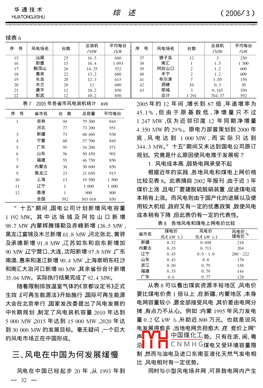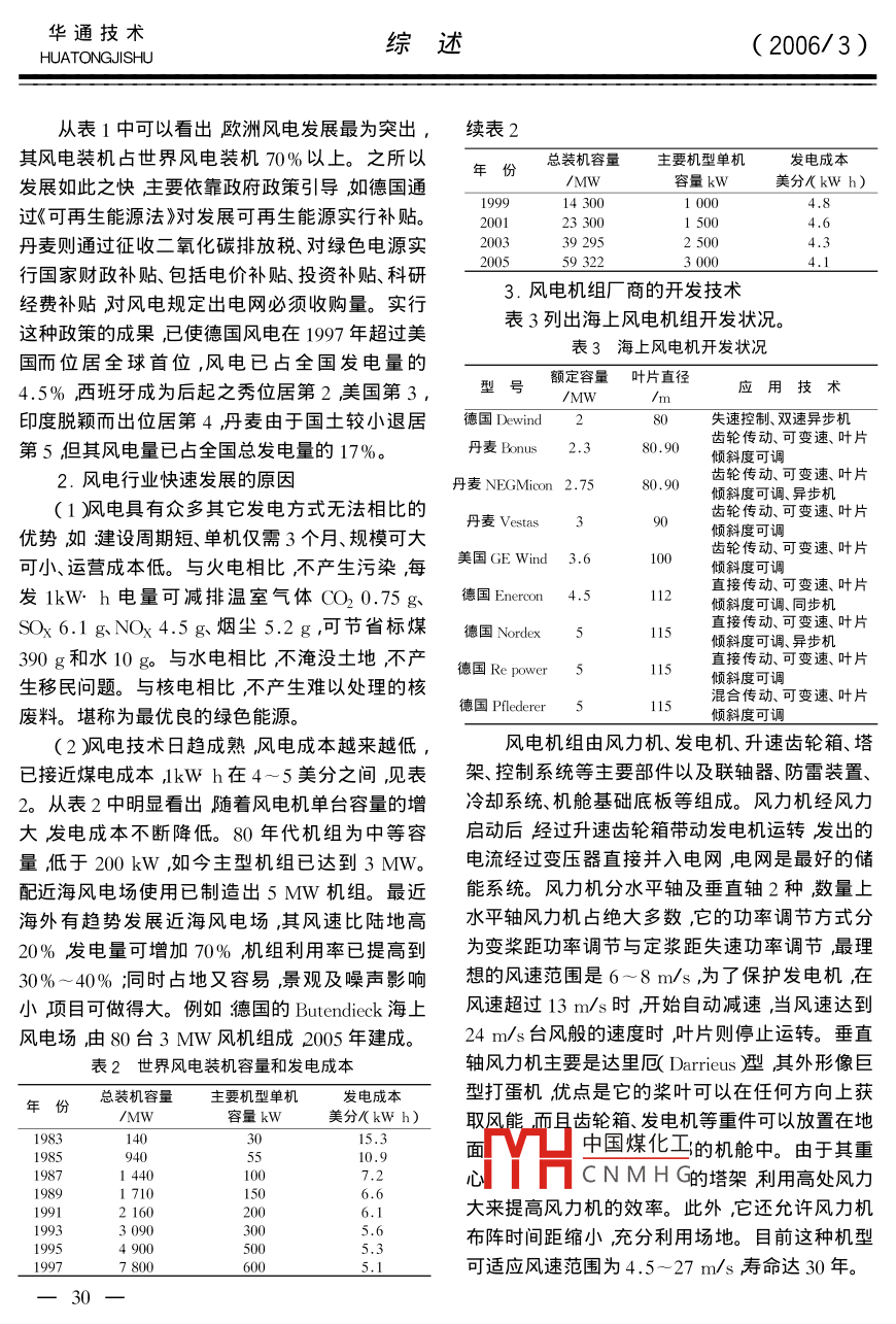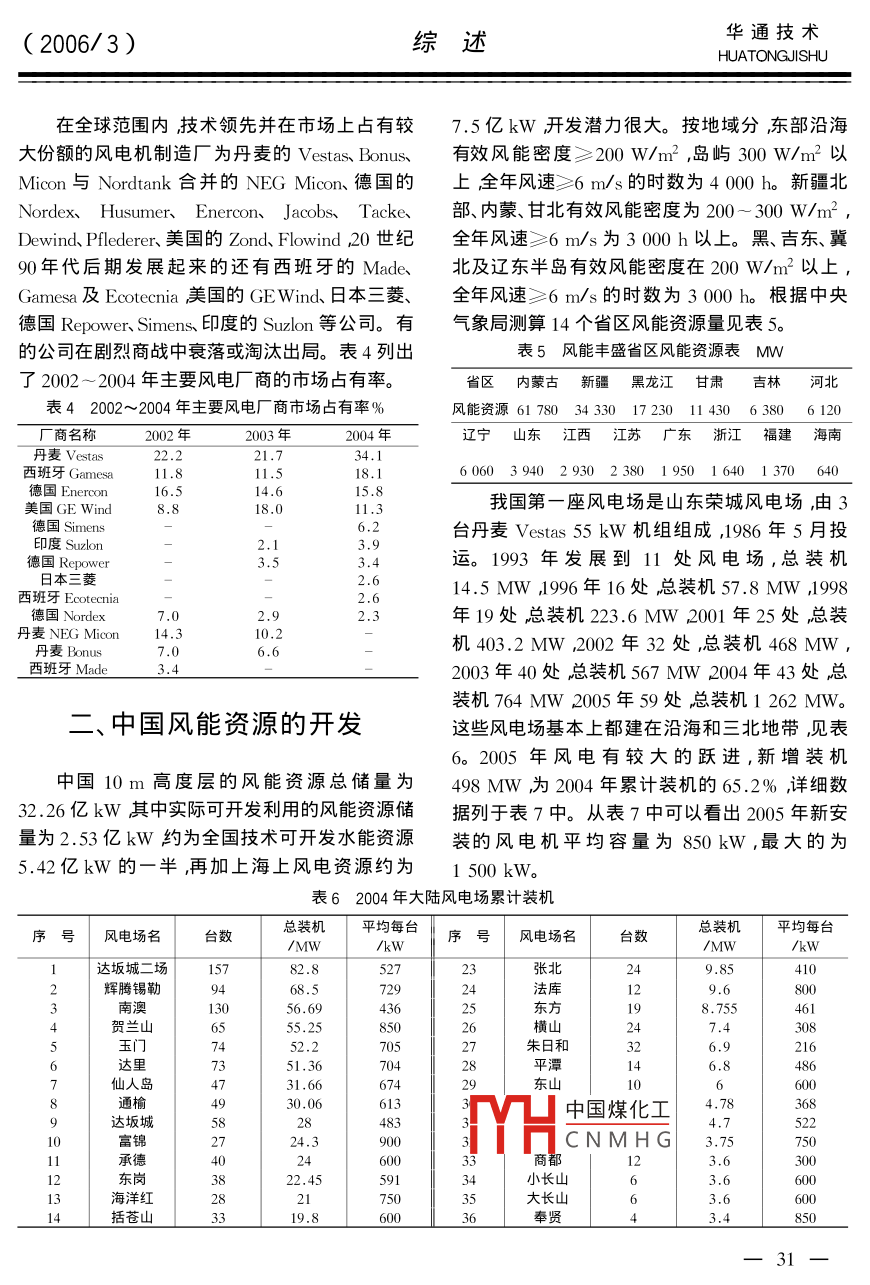(2006/3)綜述華通技術(shù)HUATONGJISHU風(fēng)電產(chǎn)業(yè)在中國(guó)陳宗器(中國(guó)新時(shí)代國(guó)際工程公司陜西西安710054)摘要綜述了風(fēng)力發(fā)電的優(yōu)越性、世界風(fēng)電的發(fā)展、我國(guó)風(fēng)能資源量及其分布、現(xiàn)有風(fēng)電場(chǎng)布局及十一五”發(fā)展目標(biāo)、風(fēng)電機(jī)國(guó)產(chǎn)化簡(jiǎn)況、發(fā)展中存在的問(wèn)題及展望關(guān)鍵詞新能源;風(fēng)能布局;風(fēng)力發(fā)電;風(fēng)電產(chǎn)業(yè)展望wind Power Generation Industry in ChinaChen ZongqiChina New Times International Engineering Corporation, Xi' an, Shaanxi 710054, China)Abstract General desciption of advantage of wind power generator development of world wind powerindustry china' s wind energy sources and their distribution existing wind power layout its stage targetspecified in the eleventh five-year plan", brief situation of wind power localization existing problems andexpectations in the developmentey words new energy source wind energy layout wind power generation expectation of windpower indust中圖分類(lèi)號(hào):IM614文獻(xiàn)標(biāo)識(shí)碼B文章編號(hào):1672-13142006)3-0029-07后由于石油危機(jī)的出現(xiàn)以及使用化石燃料發(fā)電世界風(fēng)電行業(yè)發(fā)展迅猛所帶來(lái)的嚴(yán)重環(huán)境污染特別是近年油價(jià)飆升風(fēng)力發(fā)電又重新受到重視。20世紀(jì)90年代以來(lái),1.世界上風(fēng)電技術(shù)領(lǐng)先的國(guó)家風(fēng)力發(fā)電以每年平均27.9%的速度增長(zhǎng),已成為丹麥?zhǔn)鞘澜缟鲜紫壤蔑L(fēng)力發(fā)電的國(guó)家,19世界上各種一次能源轉(zhuǎn)化為二次能源中增長(zhǎng)最快世紀(jì)90年代到20世紀(jì)20年代丹麥建立了許多的1種。據(jù)歐洲風(fēng)能協(xié)會(huì)預(yù)測(cè)到2020年全球10-20kW的風(fēng)電站。20世紀(jì)60年代由于石油風(fēng)力發(fā)電可占到全世界用電總量的12%。表1價(jià)格下降,風(fēng)力發(fā)電處于停滯狀態(tài)。1973年以列出了全球領(lǐng)先國(guó)家風(fēng)電場(chǎng)裝機(jī)容量。表1全球領(lǐng)先國(guó)家風(fēng)電場(chǎng)裝機(jī)容量M年份全球美國(guó)德國(guó)丹麥荷蘭英國(guó)西班牙意大利印度中國(guó)日本19933090175013014014.51535011300201794940166.519989689214128741420143002445444217384332771035268.32610610中國(guó)煤化工11456403.22752002311284685120012880CNMHGI70246929563701460931108732110200447616674016629311710785932291491002717171262年遞增27.914.840.216.118.336.239.745.198.3華通技術(shù)綜述HUATONGJISHU(2006/3)從表1中可以看出歐洲風(fēng)電發(fā)展最為突出,續(xù)表2其風(fēng)電裝機(jī)占世界風(fēng)電裝機(jī)70%以上。之所以年份總裝機(jī)容量主要機(jī)型單機(jī)發(fā)電成本發(fā)展如此之快主要依靠政府政策引導(dǎo)如德國(guó)通/MW容量kW美分/kWh)過(guò)《可再生能源法》對(duì)發(fā)展可再生能源實(shí)行補(bǔ)貼。233004,6丹麥則通過(guò)征收二氧化碳排放稅、對(duì)綠色電源實(shí)392952500行國(guó)家財(cái)政補(bǔ)貼、包括電價(jià)補(bǔ)貼、投資補(bǔ)貼、科研200559322經(jīng)費(fèi)補(bǔ)貼對(duì)風(fēng)電規(guī)定出電網(wǎng)必須收購(gòu)量。實(shí)行3.風(fēng)電機(jī)組廠商的開(kāi)發(fā)技術(shù)這種政策的成果已使德國(guó)風(fēng)電在1997年超過(guò)美表3列出海上風(fēng)電機(jī)組開(kāi)發(fā)狀況表3海上風(fēng)電機(jī)開(kāi)發(fā)狀況國(guó)而位居全球首位,風(fēng)電已占全國(guó)發(fā)電量的額定容量葉片直徑4.5%西班牙成為后起之秀位居第2美國(guó)第3,型應(yīng)用技術(shù)印度脫穎而出位居第4丹麥由于國(guó)土較小退居德國(guó)Dwnd2失速控制、雙速異步機(jī)第5但其風(fēng)電量已占全國(guó)總發(fā)電量的17%。丹麥 Bonus2.3齒輪傳動(dòng)、可變速、葉片傾斜度可調(diào)2.風(fēng)電行業(yè)快速發(fā)展的原因丹麥 NEGIon2.7齒輪傳動(dòng)、可變速、葉片(1)風(fēng)電具有眾多其它發(fā)電方式無(wú)法相比的傾斜度可調(diào)、異步機(jī)丹麥 Vestas齒輪傳動(dòng)、可變速、葉片優(yōu)勢(shì)如建設(shè)周期短、單機(jī)僅需3個(gè)月、規(guī)??纱髢A斜度可調(diào)可小運(yùn)營(yíng)成本低。與火電相比不產(chǎn)生污染每美國(guó) GE Wind3.6齒輪傳動(dòng)、可變速、葉片傾斜度可調(diào)發(fā)kW·h電量可減排溫室氣體CO30.75德國(guó) Enercon4直接傳動(dòng)、可變速、葉片頃斜度可調(diào)、同步機(jī)SOx6.1gNOx4.5g煙塵5.2g,可節(jié)省標(biāo)煤德國(guó)№ordx直接傳動(dòng)、可變速、葉片傾斜度可調(diào)、異步機(jī)390g和水10與水電相比不淹沒(méi)士地不產(chǎn)德國(guó) Re power 5直接傳動(dòng)、可變速、葉片生移民問(wèn)題。與核電相比不產(chǎn)生難以處理的核傾斜度可調(diào)德國(guó) Federer5混合傳動(dòng)、可變速、葉片廢料??胺Q(chēng)為最優(yōu)良的綠色能源。115傾斜度可調(diào)(2風(fēng)電技術(shù)日趨成熟風(fēng)電成本越來(lái)越低風(fēng)電機(jī)組由風(fēng)力機(jī)、發(fā)電機(jī)、升速齒輪箱、塔已接近煤電成本AkWh在4-5美分之間見(jiàn)表架、控制系統(tǒng)等主要部件以及聯(lián)軸器、防雷裝置、2。從表2中明顯看出隨著風(fēng)電機(jī)單臺(tái)容量的增冷令卻系統(tǒng)、機(jī)艙基礎(chǔ)底板等組成。風(fēng)力機(jī)經(jīng)風(fēng)力大發(fā)電