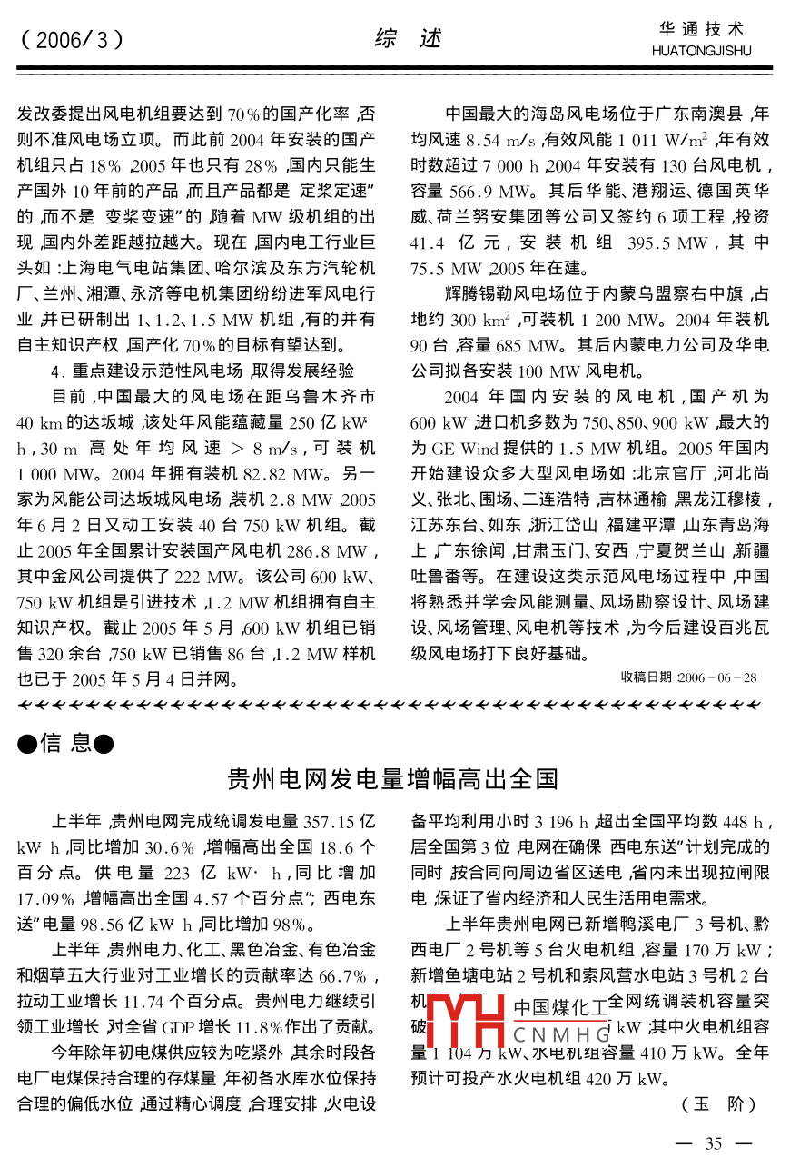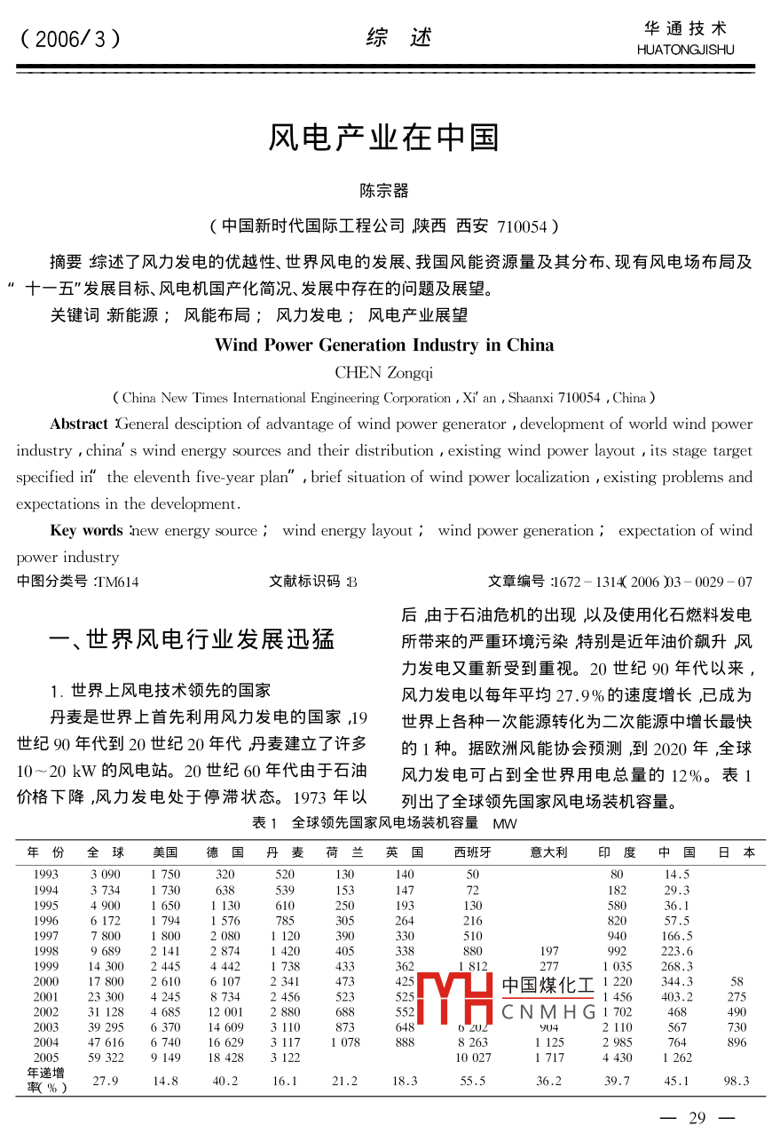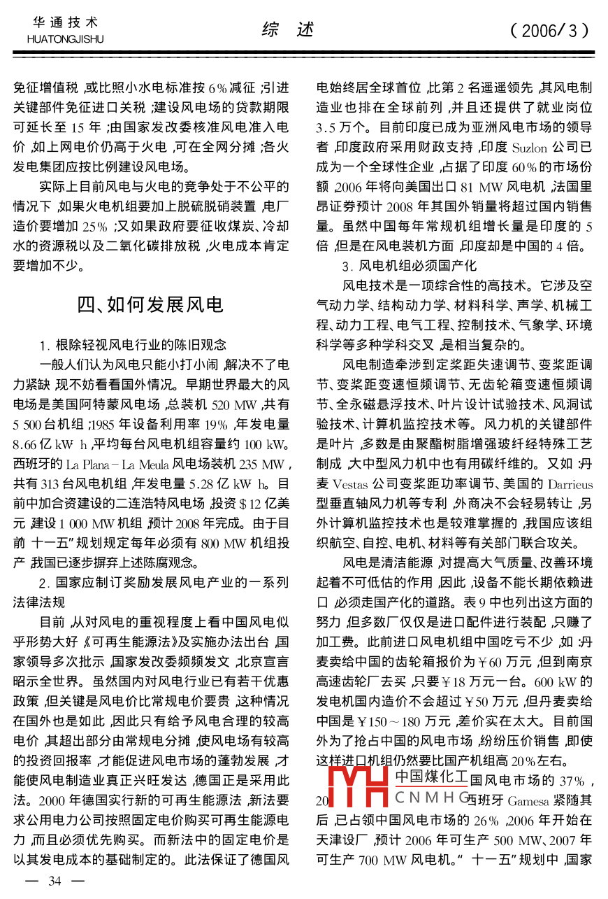 (2006/3)綜述華通技術(shù)HUATONGJISHU風(fēng)電產(chǎn)業(yè)在中國(guó)陳宗器(中國(guó)新時(shí)代國(guó)際工程公司陜西西安710054)摘要綜述了風(fēng)力發(fā)電的優(yōu)越性、世界風(fēng)電的發(fā)展、我國(guó)風(fēng)能資源量及其分布、現(xiàn)有風(fēng)電場(chǎng)布局及十一五”發(fā)展目標(biāo)、風(fēng)電機(jī)國(guó)產(chǎn)化簡(jiǎn)況、發(fā)展中存在的問(wèn)題及展望關(guān)鍵詞新能源;風(fēng)能布局;風(fēng)力發(fā)電;風(fēng)電產(chǎn)業(yè)展望wind Power Generation Industry in ChinaChen ZongqiChina New Times International Engineering Corporation, Xi' an, Shaanxi 710054, China)Abstract General desciption of advantage of wind power generator development of world wind powerindustry china' s wind energy sources and their distribution existing wind power layout its stage targetspecified in the eleventh five-year plan", brief situation of wind power localization existing problems andexpectations in the developmentey words new energy source wind energy layout wind power generation expectation of windpower indust中圖分類(lèi)號(hào):IM614文獻(xiàn)標(biāo)識(shí)碼B文章編號(hào):1672-13142006)3-0029-07后由于石油危機(jī)的出現(xiàn)以及使用化石燃料發(fā)電世界風(fēng)電行業(yè)發(fā)展迅猛所帶來(lái)的嚴(yán)重環(huán)境污染特別是近年油價(jià)飆升風(fēng)力發(fā)電又重新受到重視。20世紀(jì)90年代以來(lái),1.世界上風(fēng)電技術(shù)領(lǐng)先的國(guó)家風(fēng)力發(fā)電以每年平均27.9%的速度增長(zhǎng),已成為丹麥?zhǔn)鞘澜缟鲜紫壤蔑L(fēng)力發(fā)電的國(guó)家,19世界上各種一次能源轉(zhuǎn)化為二次能源中增長(zhǎng)最快世紀(jì)90年代到20世紀(jì)20年代丹麥建立了許多的1種。據(jù)歐洲風(fēng)能協(xié)會(huì)預(yù)測(cè)到2020年全球10-20kW的風(fēng)電站。20世紀(jì)60年代由于石油風(fēng)力發(fā)電可占到全世界用電總量的12%。表1價(jià)格下降,風(fēng)力發(fā)電處于停滯狀態(tài)。1973年以列出了全球領(lǐng)先國(guó)家風(fēng)電場(chǎng)裝機(jī)容量。表1全球領(lǐng)先國(guó)家風(fēng)電場(chǎng)裝機(jī)容量M年份全球美國(guó)德國(guó)丹麥荷蘭英國(guó)西班牙意大利印度中國(guó)日本19933090175013014014.51535011300201794940166.519989689214128741420143002445444217384332771035268.32610610中國(guó)煤化工11456403.22752002311284685120012880CNMHGI70246929563701460931108732110200447616674016629311710785932291491002717171262年遞增27.914.840.216.118.336.239.745.198.3華通技術(shù)綜述HUATONGJISHU(2006/3)從表1中可以看出歐洲風(fēng)電發(fā)展最為突出,續(xù)表2其風(fēng)電裝機(jī)占世界風(fēng)電裝機(jī)70%以上。之所以年份總裝機(jī)容量主要機(jī)型單機(jī)發(fā)電成本發(fā)展如此之快主要依靠政府政策引導(dǎo)如德國(guó)通/MW容量kW美分/kWh)過(guò)《可再生能源法》對(duì)發(fā)展可再生能源實(shí)行補(bǔ)貼。233004,6丹麥則通過(guò)征收二氧化碳排放稅、對(duì)綠色電源實(shí)392952500行國(guó)家財(cái)政補(bǔ)貼、包括電價(jià)補(bǔ)貼、投資補(bǔ)貼、科研200559322經(jīng)費(fèi)補(bǔ)貼對(duì)風(fēng)電規(guī)定出電網(wǎng)必須收購(gòu)量。實(shí)行3.風(fēng)電機(jī)組廠商的開(kāi)發(fā)技術(shù)這種政策的成果已使德國(guó)風(fēng)電在1997年超過(guò)美表3列出海上風(fēng)電機(jī)組開(kāi)發(fā)狀況表3海上風(fēng)電機(jī)開(kāi)發(fā)狀況國(guó)而位居全球首位,風(fēng)電已占全國(guó)發(fā)電量的額定容量葉片直徑4.5%西班牙成為后起之秀位居第2美國(guó)第3,型應(yīng)用技術(shù)印度脫穎而出位居第4丹麥由于國(guó)土較小退居德國(guó)Dwnd2失速控制、雙速異步機(jī)第5但其風(fēng)電量已占全國(guó)總發(fā)電量的17%。丹麥 Bonus2.3齒輪傳動(dòng)、可變速、葉片傾斜度可調(diào)2.風(fēng)電行業(yè)快速發(fā)展的原因丹麥 NEGIon2.7齒輪傳動(dòng)、可變速、葉片(1)風(fēng)電具有眾多其它發(fā)電方式無(wú)法相比的傾斜度可調(diào)、異步機(jī)丹麥 Vestas齒輪傳動(dòng)、可變速、葉片優(yōu)勢(shì)如建設(shè)周期短、單機(jī)僅需3個(gè)月、規(guī)??纱髢A斜度可調(diào)可小運(yùn)營(yíng)成本低。與火電相比不產(chǎn)生污染每美國(guó) GE Wind3.6齒輪傳動(dòng)、可變速、葉片傾斜度可調(diào)發(fā)kW·h電量可減排溫室氣體CO30.75德國(guó) Enercon4直接傳動(dòng)、可變速、葉片頃斜度可調(diào)、同步機(jī)SOx6.1gNOx4.5g煙塵5.2g,可節(jié)省標(biāo)煤德國(guó)№ordx直接傳動(dòng)、可變速、葉片傾斜度可調(diào)、異步機(jī)390g和水10與水電相比不淹沒(méi)士地不產(chǎn)德國(guó) Re power 5直接傳動(dòng)、可變速、葉片生移民問(wèn)題。與核電相比不產(chǎn)生難以處理的核傾斜度可調(diào)德國(guó) Federer5混合傳動(dòng)、可變速、葉片廢料??胺Q(chēng)為最優(yōu)良的綠色能源。115傾斜度可調(diào)(2風(fēng)電技術(shù)日趨成熟風(fēng)電成本越來(lái)越低風(fēng)電機(jī)組由風(fēng)力機(jī)、發(fā)電機(jī)、升速齒輪箱、塔已接近煤電成本AkWh在4-5美分之間見(jiàn)表架、控制系統(tǒng)等主要部件以及聯(lián)軸器、防雷裝置、2。從表2中明顯看出隨著風(fēng)電機(jī)單臺(tái)容量的增冷令卻系統(tǒng)、機(jī)艙基礎(chǔ)底板等組成。風(fēng)力機(jī)經(jīng)風(fēng)力大發(fā)電