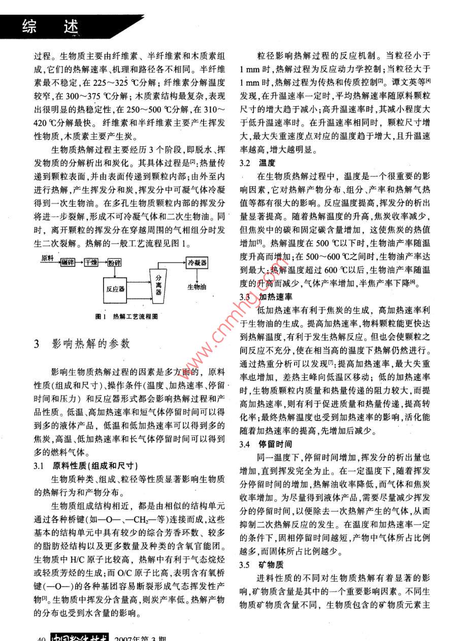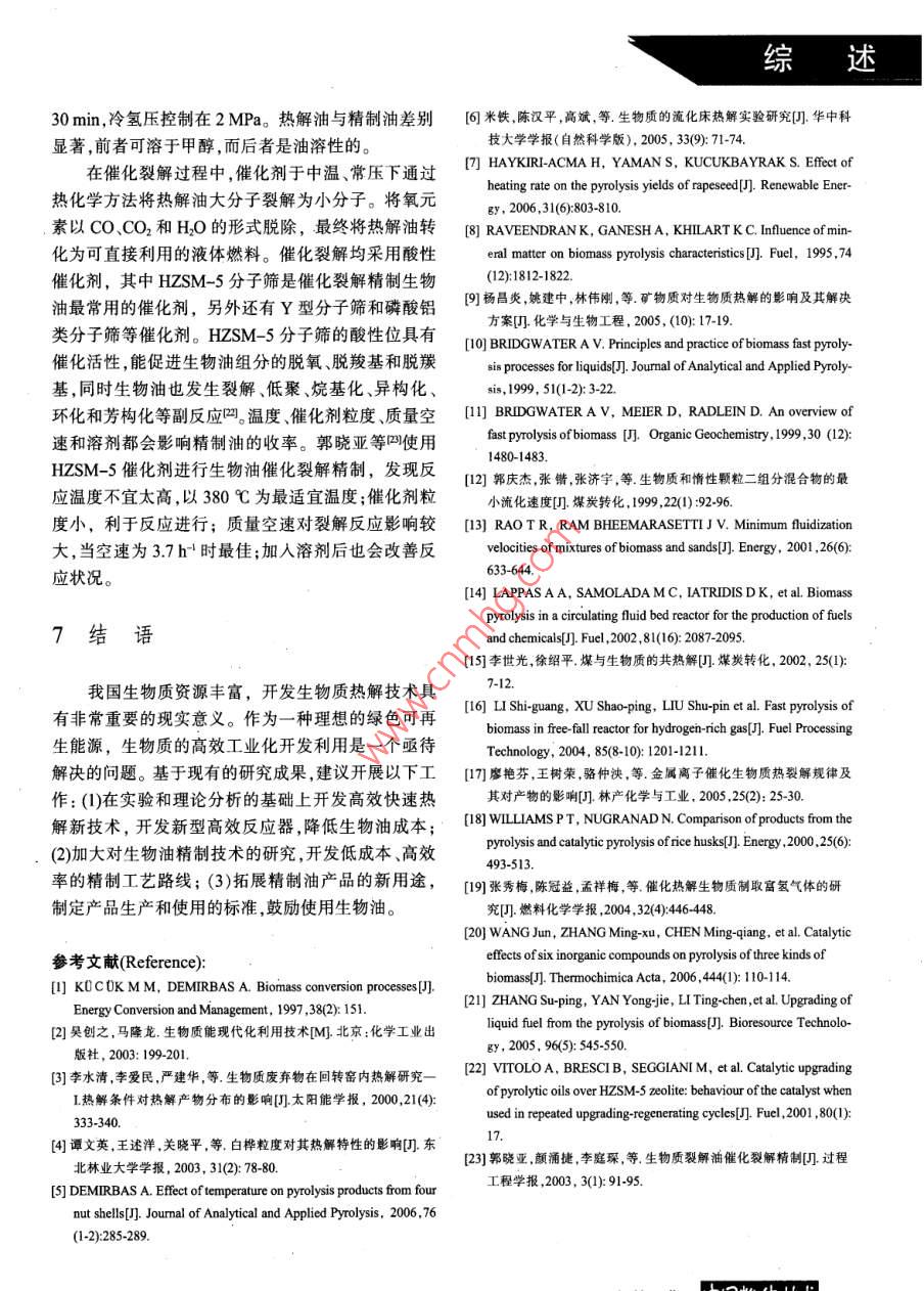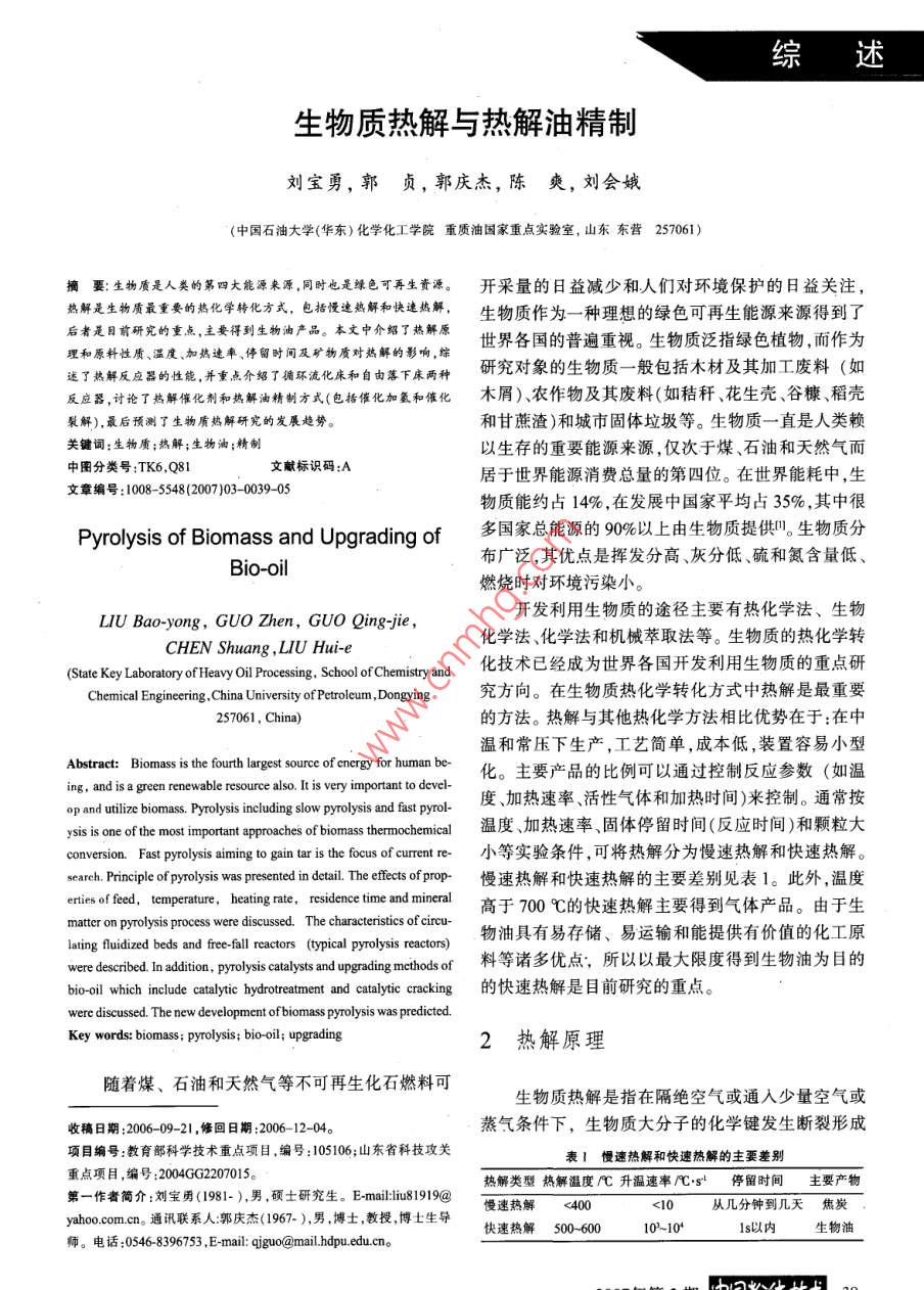 綜述生物質(zhì)熱解與熱解油精制劉寶勇,郭貞,郭慶杰,陳爽,劉會娥(中國石油大學(xué)(華東)化學(xué)化工學(xué)院重質(zhì)油國家重點(diǎn)實(shí)驗(yàn)室, 山東東營257061)摘要:生物質(zhì)是人類的第四大能源來源,同時也是綠色可再生資源。開采量的日益減少和人們對環(huán)境保護(hù)的日益關(guān)注,熱解是生物質(zhì)最重要的熱化學(xué)轉(zhuǎn)化方式,包括慢連熱解和快速熱解,生物質(zhì)作為一-種理想的綠色可再生能源來源得到了后者是目前研究的重點(diǎn),主要得到生物油產(chǎn)品。本文中介紹了熱解原世界各國的普遍重視。生物質(zhì)泛指綠色植物,而作為理和原料性質(zhì)、溫度、加熱速率、停留時間及礦物質(zhì)對熱解的影響,綜研究對象的生物質(zhì)--般包括木材及其加工廢料(如述了熱解反應(yīng)器的性能,并重點(diǎn)介紹了循環(huán)流化床和自由落下床兩種反應(yīng)器,討論了熱解催化劑和熱解油精制方式(包括催化加氫和催化木屑)、農(nóng)作物及其廢料(如秸稈、花生殼、谷糠、稻殼裂解),最后預(yù)測了生物質(zhì)熱解研究的發(fā)展趨勢。和甘蔗渣)和城市固體垃圾等。生物質(zhì)-直是人類賴關(guān)鍵詞:生物質(zhì);熱解;生物油;精制以生存的重要能源來源,僅次于煤、石油和天然氣而中團(tuán)分類號:TK6,Q81文獻(xiàn)標(biāo)識碼:A居于世界能源消費(fèi)總量的第四位。在世界能耗中,生文章編號:1008-5548(2007)03-0039-05物質(zhì)能約占14% ,在發(fā)展中國家平均占35%,其中很Pyrolysis of Biomass and Upgrading of多國家總能源的90%以上由生物質(zhì)提供"。生物質(zhì)分布廣泛,其優(yōu)點(diǎn)是揮發(fā)分高、灰分低硫和氮含量低、Bio-oil燃燒時對環(huán)境污染小。開發(fā)利用生物質(zhì)的途徑主要有熱化學(xué)法、生物L(fēng)IU Bao-yong, GUO Zhen, GUO Qing-jie ,化學(xué)法、化學(xué)法和機(jī)械萃取法等。生物質(zhì)的熱化學(xué)轉(zhuǎn)CHEN Shuang ,LIU Huie(State Key Laboratory ofHeavy Oil Processing. School of Chemistry and化技術(shù)已經(jīng)成為世界各國開發(fā)利用生物質(zhì)的重點(diǎn)研Chemical Enginering.China University ofPetrolecum,Dongying究方向。在生物質(zhì)熱化學(xué)轉(zhuǎn)化方式中熱解是最重要257061 , China)的方法。熱解與其他熱化學(xué)方法相比優(yōu)勢在于:在中溫和常壓下生產(chǎn),工藝簡單,成本低,裝置容易小型Abstract: Biomass is the fourth largest source of cenergy for human be-化。主要產(chǎn)品的比例可以通過控制反應(yīng)參數(shù)(如溫ing, and is a green renewable resource also. It is very important to devel-度加熱速率、活性氣體和加熱時間)來控制。通常按op and utilize biomass. Pyrolysis including slow pyrolysis and fast pyrol-ysis is one of the most important approaches of biomass thermochemical溫度、加熱速率、固體停留時間(反應(yīng)時間)和顆粒大conversion. Fast pyrolysis aiming to gain tar is the focus of current re-小等實(shí)驗(yàn)條件,可將熱解分為慢速熱解和快速熱解。search. Principle of pyolysis was presented in detail. The efets of prop-慢速熱解和快速熱解的主要差別見表1。此外,溫度ertiesof fed, temperature, heating rate, residence time and mineral高于700 C的快速熱解主要得到氣體產(chǎn)品。由于生matter on pyrolysis process were discussed. The charateristics of circu-物油具有易存儲、易運(yùn)輸和能提供有價值的化工原lating fluidized beds and free fall reactors (typical pyrolysis Treactors)were described In addition, pyrolysis catalysts and upgrading methods of料等諸多優(yōu)點(diǎn),所以以最大限度得到生物油為目的bio-oil which include catalytic hydrotreatment and catalytic cracking的快速熱解是目前研究的重點(diǎn)。were discussed. The new development ofbiomass pyrolysis was predicted.Key words: biomas; pyrolysis; bio-oil; upgrading2熱解原理隨著煤、石油和天然氣等不可再生化石燃料可生物質(zhì)熱解是指在隔絕空氣或通人少量空氣或收稿日期:2006- _09 21,修回日期:2006-12-04。蒸氣條件下,生物質(zhì)大分子的化學(xué)鍵發(fā)生斷裂形成項(xiàng)目編號:教育部科學(xué)技術(shù)重點(diǎn)項(xiàng)目,編號:105106;山東省科技攻關(guān)表!慢速熱解和快連 熱解的主要差別重點(diǎn)項(xiàng)目,編號:2004GG2207015。熱解類型熱解溫度/所C升溫速率/C.st停 留時間主要產(chǎn)物.第一作者簡介:劉寶勇(1981- ),男,碩土研究生。E-mail:lu81919@慢速熱解<400<10從幾分鐘到幾天焦炭yahoo.com. cn。通訊聯(lián)系人:郭慶杰(1967-),男,博士,教授,博士生導(dǎo)快速熱解500-60010-104Is以內(nèi)生物油師。電話:0546-8396753 ,E-mai: qjguo@mil.dpu edu.cn。綜述過程。生物質(zhì)主要由纖維素、半纖維素和木質(zhì)素組粒徑影響熱解過程的反應(yīng)機(jī)制。當(dāng)粒徑小于成,它們的熱解速率,機(jī)理和路徑各不相同。半纖維1 mm時,熱解過程為反應(yīng)動力學(xué)控制;當(dāng)粒徑大于素最不穩(wěn)定,在225~325 C分解;纖維素分解溫度1mm時,熱解過程為傳熱和傳質(zhì)控制2。譚文英等(較窄,在300~375C分解;木質(zhì)素結(jié)構(gòu)最復(fù)雜,表現(xiàn)發(fā)現(xiàn),在升溫速率--定時,平均熱解速率隨原料顆粒出很明顯的熱穩(wěn)定性,在250~5009C分解,在310~尺寸的增大趨于減小;高升溫速率時,其減小程度大420 C分解最快。纖維素和半纖維素主要產(chǎn)生揮發(fā)于低升溫速率時。 在升溫速率相同時,顆粒尺寸增性物質(zh