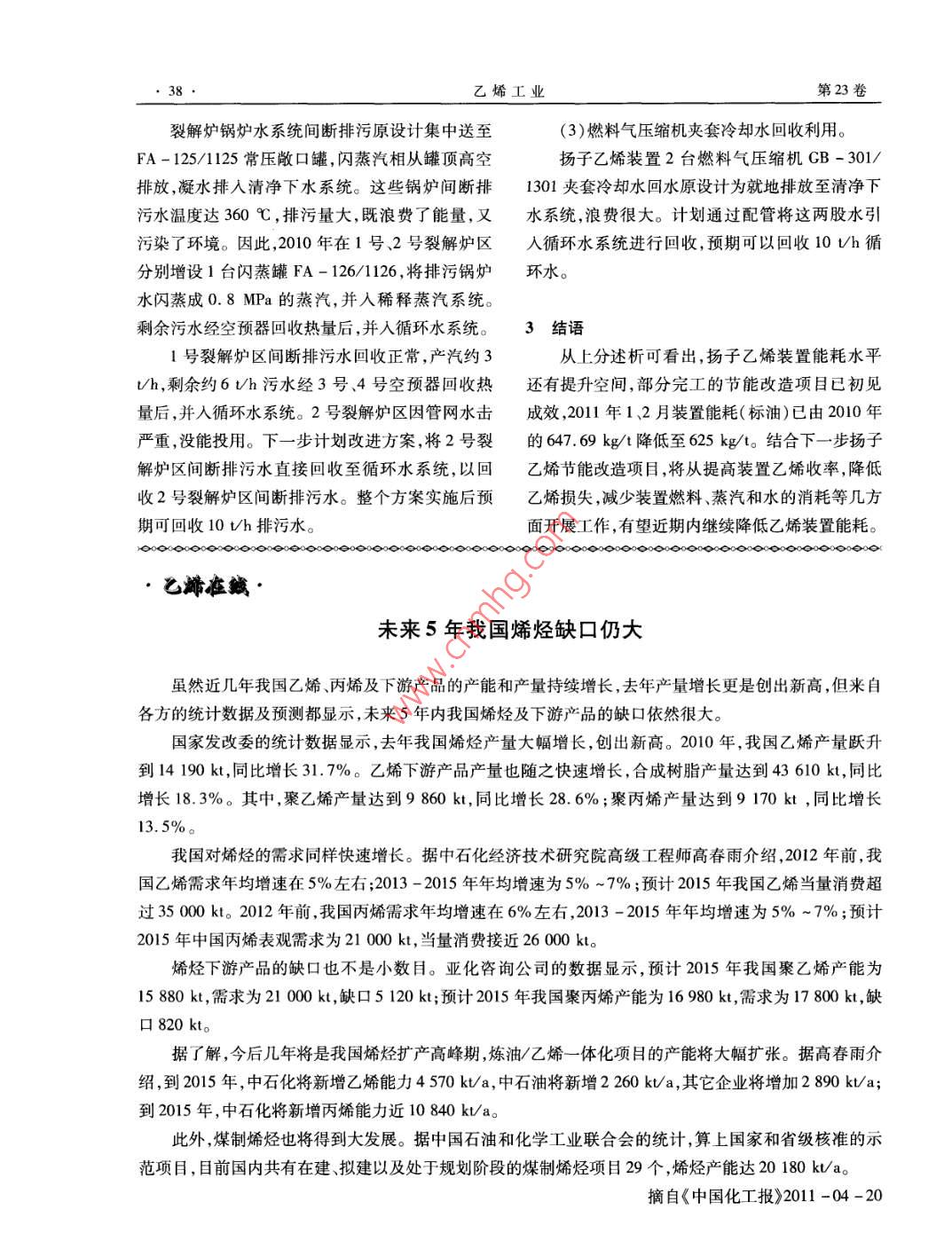 乙烯工業(yè).第23卷裂解爐鍋爐水系統(tǒng)間斷排污原設(shè)計(jì)集中送至(3)燃料氣壓縮機(jī)夾套冷卻水回收利用。FA - 125/1125常壓敞口罐,閃蒸汽相從罐頂高空揚(yáng)子乙烯裝置2臺(tái)燃料氣壓縮機(jī)GB - 301/排放,凝水排入清凈下水系統(tǒng)。這些鍋爐間斷排1301夾套冷卻水回水原設(shè)計(jì)為就地排放至清凈下污水溫度達(dá)360 C ,排污量大,既浪費(fèi)了能量,又水系統(tǒng),浪費(fèi)很大。計(jì)劃通過配管將這兩股水引污染了環(huán)境。因此,2010 年在1號(hào)、2號(hào)裂解爐區(qū)人循環(huán)水系統(tǒng)進(jìn)行回收,預(yù)期可以回收10 Vh循分別增設(shè)1臺(tái)閃蒸罐FA - 126/1126 ,將排污鍋爐環(huán)水。水閃蒸成0.8 MPa 的蒸汽,并人稀釋蒸汽系統(tǒng)。剩余污水經(jīng)空預(yù)器回收熱量后,并人循環(huán)水系統(tǒng)。3結(jié)語1號(hào)裂解爐區(qū)間斷排污水回收正常,產(chǎn)汽約3從上分述析可看出,揚(yáng)子乙烯裝置能耗水平V/h,剩余約6th污水經(jīng)3號(hào).4號(hào)空預(yù)器回收熱還有提升空間,部分完工的節(jié)能改造項(xiàng)目已初見量后,并入循環(huán)水系統(tǒng)。2號(hào)裂解爐區(qū)因管網(wǎng)水擊成效,2011年1、2月裝置能耗(標(biāo)油)已由2010年嚴(yán)重,沒能投用。下一步計(jì)劃改進(jìn)方案,將2號(hào)裂的647.69 kg/t降低至625 kg/t。結(jié)合下-步揚(yáng)子解爐區(qū)間斷排污水直接回收至循環(huán)水系統(tǒng),以回乙烯節(jié)能改造項(xiàng)目,將從提高裝置乙烯收率,降低收2號(hào)裂解爐區(qū)間斷排污水。整個(gè)方案實(shí)施后預(yù)乙烯損失,減少裝置燃料、蒸汽和水的消耗等幾方期可回收10 t/h排污水。面開展工作,有望近期內(nèi)繼續(xù)降低乙烯裝置能耗。o。000000。。0oo 00o00e0 o●己烯在緘●未來5年我國烯烴缺口仍大雖然近幾年我國乙烯丙烯及下游產(chǎn)品的產(chǎn)能和產(chǎn)量持續(xù)增長,去年產(chǎn)量增長更是創(chuàng)出新高,但來自各方的統(tǒng)計(jì)數(shù)據(jù)及預(yù)測都顯示,未來5年內(nèi)我國烯烴及下游產(chǎn)品的缺口依然很大。國家發(fā)改委的統(tǒng)計(jì)數(shù)據(jù)顯示,去年我國烯烴產(chǎn)量大幅增長,創(chuàng)出新高。2010年,我國乙烯產(chǎn)量躍升到14 190 kt,同比增長31.7%。乙烯下游產(chǎn)品產(chǎn)量也隨之快速增長,合成樹脂產(chǎn)量達(dá)到43 610 kt,同比增長18. 3%。其中,聚乙烯產(chǎn)量達(dá)到9 860 kt,同比增長28. 6% ;聚丙烯產(chǎn)量達(dá)到9170 kt ,同比增長13. 5%。我國對烯烴的需求同樣快速增長。據(jù)中石化經(jīng)濟(jì)技術(shù)研究院高級(jí)工程師高春雨介紹,2012年前,我國乙烯需求年均增速在5%左右;2013-2015年年均增速為5%~7%;預(yù)計(jì)2015年我國乙烯當(dāng)量消費(fèi)超過35000kt。2012年前,我國丙烯需求年均增速在6%左右,2013-2015年年均增速為5%~7%;預(yù)計(jì)2015年中國丙烯表觀需求為21 000 kt,當(dāng)量消費(fèi)接近26 000 kt。烯烴下游產(chǎn)品的缺口也不是小數(shù)目。亞化咨詢公司的數(shù)據(jù)顯示,預(yù)計(jì)2015年我國聚乙烯產(chǎn)能為15 880 kt,需求為21 000 kt,缺口5120 kt;預(yù)計(jì)2015年我國聚丙烯產(chǎn)能為16 980 kt,需求為17 800 kt,缺口820 kt。據(jù)了解,今后幾年將是我國烯烴擴(kuò)產(chǎn)高峰期,煉油/乙烯一體化項(xiàng)目的產(chǎn)能將大幅擴(kuò)張。據(jù)高春雨介紹,到2015年,中石化將新增乙烯能力4570kt/a,中石油將新增2260kV/a,其它企業(yè)將增加2890kt/a;到2015年,中石化將新增丙烯能力近10 840 kt/a。此外,煤制烯烴也將得到大發(fā)展。據(jù)中國石油和化學(xué)工業(yè)聯(lián)合會(huì)的統(tǒng)計(jì),算上國家和省級(jí)核準(zhǔn)的示范項(xiàng)目,目前國內(nèi)共有在建、擬建以及處于規(guī)劃階段的煤制烯烴項(xiàng)目29個(gè),烯烴產(chǎn)能達(dá)20 180 kt/a。摘自《中國化工報(bào)》2011 -04 -20.