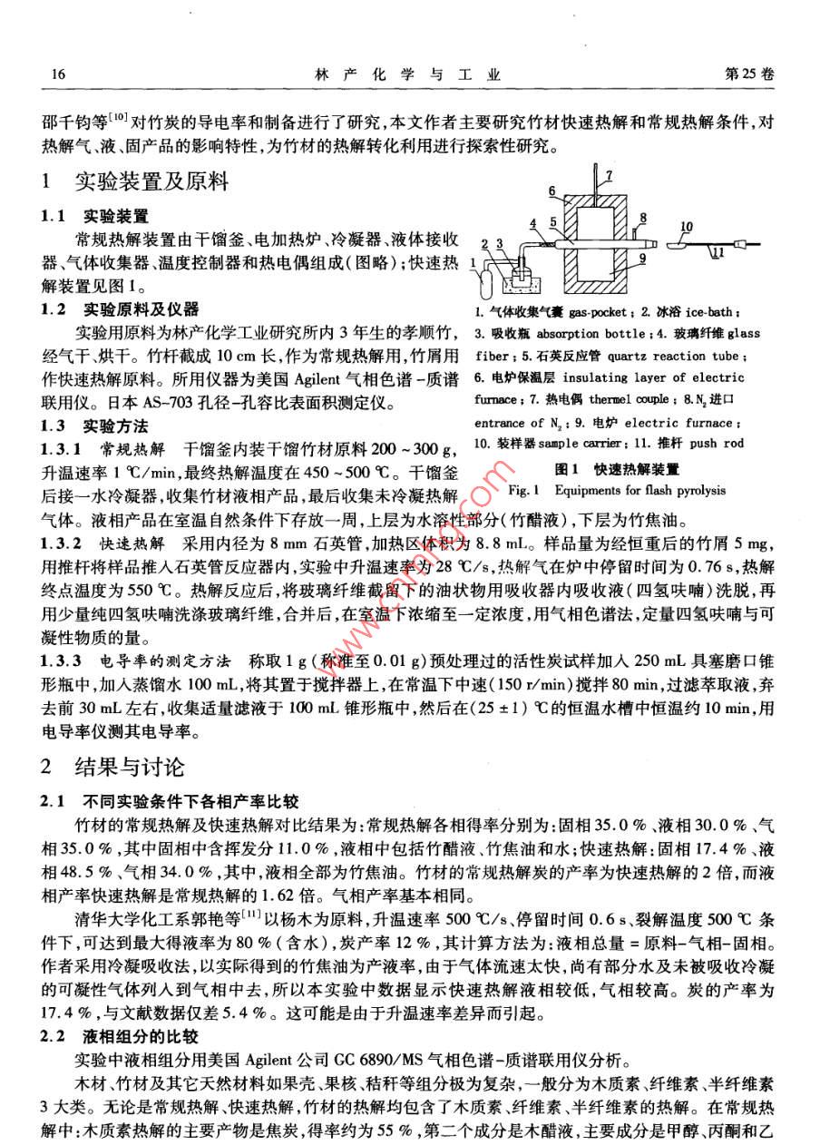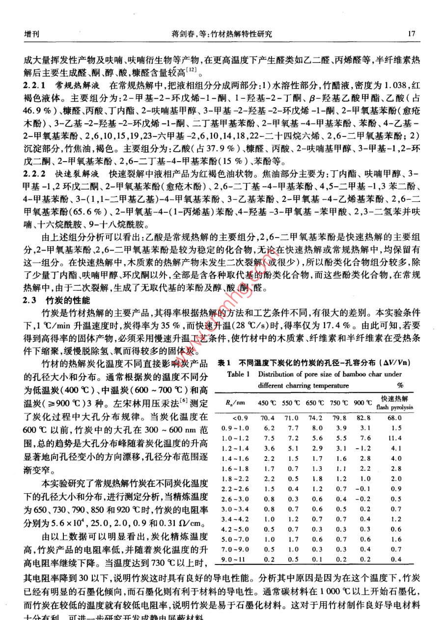 第25卷增刊林產(chǎn)化學(xué)與工業(yè)Vol. 25 Supplement2005年10月Chemistry and Industry of Forest ProductsOct. 2005研究報告竹材熱解特性研究蔣劍春,鄧先倫,張燕萍,施蔭銳(中國林業(yè)科學(xué)研究院林產(chǎn)化學(xué)工業(yè)研究所,江蘇南京210042).摘要:主要研究了竹材在快速熱解與常規(guī)熱解下液相、固相及氣相產(chǎn)品的得率差異??焖?,熱解下升溫28 C/s,停留時間0.76s,溫度500C,液相產(chǎn)品竹焦油得率為48.5 %,主要組分JIANG JC為2,6-二甲氧基苯酚和2-甲氧基苯酚(愈瘡木酚),在常規(guī)熱解下升溫速率1 C/min,溫度500C ,液相得率為30 %(包括水),組分主要為乙酸。在常規(guī)或緩慢熱解中,固相產(chǎn)物,炭的微孔結(jié)構(gòu)中,當(dāng)熱解溫度低于550 C的情況下,主要孔徑在6.0-22.0 nm,當(dāng)熱解溫度在650 ~750C,主要孔.徑<2 nm。關(guān)鍵詞:熱解;微孔;酚類化合 物;竹材中圖分類號:TQ351.2文獻標(biāo)識碼:A文章編號:0253 - 2417(2005)S0 -0015 -04STUDY ON THE CHARACTERISTIC FEATUREOF BAMBOO PYROLYSISJIANG Jian-chun, DENG Xian-lun, ZHANG Yan-ping, SHI Yin-rui( Insitute of Chemical Industry of Forest Products, CAF, Nanjing 210042, China)Abstract: The characteristic feature of flash pyrolysis and conventional pyrolysis of barmboo were investigaled. Theoperating conditions of flash pyrolysis was: temperature 500 C, residence time of volatile matter 0.76 s and heatingrate 28 C/s. The yield of the liquid product was 48. 5 %,containing 2 ,6-dimethoxy phenol and 2-methoxy phenol asmajor constituents. The processing condition of conventional bamboo pyrolysis was: heating rate 1 C/min andtemperature 500C. The yield of liquid products including water was 30 %,containing acetic acid as majorconstituent. In conventinal pyrolysis at temperature less than 550 C, the main pore diameters were 6.0 - 22.0 nm.At pyrolysis temperature 650 - 750 C, the main pore diameters were less than 2 nm.Key words: pyrolysis ; micropore ;phenols ;bamboo竹材由于生長速度快,繁殖能力強,可不斷再生,具有極大開發(fā)利用潛力。中國是世界竹林面積最大,產(chǎn)量最高的國家。中國竹林主要分布在浙江、江西、福建、湖南、湖北、安徽、廣東、廣西和四川等省區(qū)”。自20世紀90年代以來,日本興起了“竹炭熱”,進而引發(fā)了中國各地開發(fā)燒制竹炭的熱潮,并出口國外。日本在竹材炭化過程、竹炭應(yīng)用、竹醋液和竹活性炭的研究方面做了大量研究工作2) ,我國福建省、浙江省對竹炭、竹醋液竹活性炭也開展了大量開發(fā)研究工作,從氣、液、固3方面的利用進行了研究。如:胡永煌(3]發(fā)表了“竹炭竹醋液生產(chǎn)技術(shù)及應(yīng)用開發(fā)"的綜述文章。張文標(biāo)等[4]研究了高純度竹醋液的生產(chǎn)工藝。張玲等[5]用竹節(jié)制取雙電層電容器用高比表面積活性炭的研究。左宋林(6]進行了竹材炭化機理的研究。周建斌等[7)用磷酸-復(fù)合活化劑制竹屑活性炭進行了研究。樊希安等[8]利用微波輻射處理竹節(jié)廢料制備活性炭進行了研究。陳金根等[9]也用微波輻照制取竹類活性炭進行了研究,收稿日期:2005 -06 -20作者簡介.蔣創(chuàng)春(1955- )。男江蘇溧陽人研究員、博十,博十生導(dǎo)師研究方向,牛物質(zhì)能源和活性炭的開發(fā)與研究。16林產(chǎn)化學(xué)與工業(yè)第25卷.邵千鈞等[10]對竹炭的導(dǎo)電率和制備進行了研究,本文作者主要研究竹材快速熱解和常規(guī)熱解條件,對熱解氣、液、固產(chǎn)品的影響特性,為竹材的熱解轉(zhuǎn)化利用進行探索性研究。1實驗裝置及原料1.1實驗裝置生5}98常規(guī)熱解裝置由干餾釜、電加熱爐、冷凝器、液體接收231叮器、氣體收集器、溫度控制器和熱電偶組成(圖略);快速熱1上解裝置見圖1。1.2 實驗原料及儀器1.氣體收集氣囊gas-pocket; 2.冰浴ice-bath :實驗用原料為林產(chǎn)化學(xué)工業(yè)研究所內(nèi)3年生的孝順竹,3. 吸收瓶absorption bottle;4. 玻璃纖維gless經(jīng)氣干、烘干。竹桿截成10 cm長,作為常規(guī)熱解用,竹屑用fiber ; 5.石英反應(yīng)管quartz reaction tube;作快速熱解原料。所用儀器為美國Agilent 氣相色譜-質(zhì)譜6. 電爐保溫層insulating layer of electric聯(lián)用儀。日本AS -703孔徑-孔容比表面積測定儀。furnace; 7.熱電偶thermel c∞ouple; 8.N, 進口1.3 實驗方法entrance of N,: 9.電爐electric furnace ;1.3.1常規(guī)熱解 干餾釜內(nèi)裝干餾竹材原料 200 ~300g,10. 裝樣器saple cr:1推桿push rod升溫速率1 C/ min,最終熱解溫度在450 ~500C。干餾釜圖1快速熱解裝置后接--水冷凝器,收集竹材液相產(chǎn)品,最后收集未冷凝熱解Fig. 1 Equipments for flash pyrolysis氣體。液相產(chǎn)品在室溫自然條件下存放- -周,上層為水溶性部分(竹醋液),下層為竹焦油。1.3.2快速熱解采用內(nèi)徑為 8 mm石英管,加熱區(qū)體積為8.8 mL。樣品量為經(jīng)恒重后的竹屑5 mg,用推桿將樣品推入石英管反應(yīng)器內(nèi),實驗中升溫速率為28 C/s ,熱解氣在爐中停留時間為0. 76 s,熱解終點溫度為550C。熱解反應(yīng)后,將玻璃纖維截留下的油狀物用吸收器內(nèi)吸收液(四氫呋喃)洗脫,再用少量純四氫呋喃洗滌玻璃纖維,合并后,在室溫下濃縮至- -定濃度 ,用氣相色譜法,定量四氫呋喃與可凝性物質(zhì)的量。1.3.3電導(dǎo)率的測定方法 稱取1 g (稱準至0. 01 g)預(yù)處理過的活性炭試樣加入250 mL具塞磨口錐形瓶中,加入蒸餾水100 mL,將其置于攪拌器上,在常溫下中速( 150 r/ min)攪拌80 min,過濾萃取液,棄去前30 mL左右,收