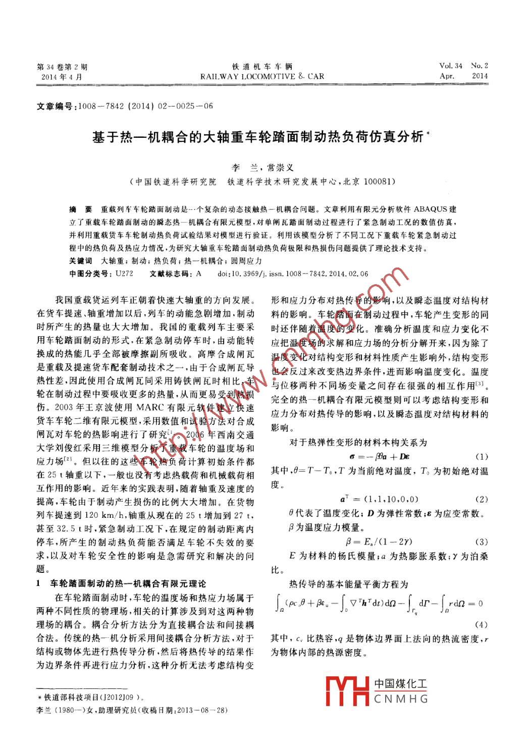 第34卷第2期鐵道機(jī)車車Vol 34 No. 22014年4月RAILWAY LOCOMOTIVE & CARApr.2014文章編號(hào):1008-7842(2014)02-0025-06基于熱一機(jī)耦合的大軸重車輪踏面制動(dòng)熱負(fù)荷仿真分析李蘭,常崇義(中國(guó)鐵道科學(xué)研究院鐵道科學(xué)技術(shù)研究發(fā)展中心,北京100081)摘要重載列車車輪踏面制動(dòng)是…個(gè)復(fù)雜的動(dòng)態(tài)接觸熱一機(jī)耦合問(wèn)題。文章利用有限元分析軟件 ABAQUS建立了重載車輪踏面制動(dòng)的瞬態(tài)熱一機(jī)耦合有限元模型,對(duì)單閘瓦踏面制動(dòng)過(guò)程進(jìn)行了緊急制動(dòng)工況的數(shù)值仿真并利用重載貨車車輪制動(dòng)熱負(fù)荷試驗(yàn)結(jié)果對(duì)模型進(jìn)行驗(yàn)證。利用該模型分析了不同工況下重載車輪緊急制動(dòng)過(guò)程中的熱負(fù)荷及熱應(yīng)力情況,為研究大軸重車輪踏面制動(dòng)熱負(fù)荷極限和熱損傷問(wèn)題提供了理論技術(shù)支持關(guān)鍵詞大軸重;制動(dòng);熱負(fù)荷;熱一機(jī)耦合;圓周應(yīng)力中圖分類號(hào):U272文獻(xiàn)標(biāo)志碼:Adoi:10.3969/.issn.1008-7842.2014.02.06我國(guó)重載貨運(yùn)列車正朝著快速大軸重的方向發(fā)展。形和應(yīng)力分布對(duì)熱傳導(dǎo)的影響,以及瞬態(tài)溫度對(duì)結(jié)構(gòu)材在貨車提速、軸重增加以后,列車的動(dòng)能急劇增加,制動(dòng)料的影響。車輪踏面在制動(dòng)過(guò)程中,車輪產(chǎn)生變形的同時(shí)所產(chǎn)生的熱量也大大增加。我國(guó)的重載列車主要采時(shí)還伴隨著溫度的變化。準(zhǔn)確分析溫度和應(yīng)力變化不用車輪踏面制動(dòng)的形式,在緊急制動(dòng)停車時(shí),由動(dòng)能轉(zhuǎn)應(yīng)把溫度場(chǎng)的求解和應(yīng)力場(chǎng)的分析分解開(kāi)來(lái),因?yàn)槌藫Q成的熱能幾乎全部被摩擦副所吸收。高摩合成閘瓦溫度變化對(duì)結(jié)構(gòu)變形和材料性質(zhì)產(chǎn)生影響外,結(jié)構(gòu)變形是重載及提速貨車配套制動(dòng)技術(shù)之一,由于合成閘瓦導(dǎo)也會(huì)反過(guò)來(lái)改變熱邊界條件,進(jìn)而影響溫度變化。溫度熱性差,因此使用合成閘瓦同采用鑄鐵閘瓦時(shí)相比,車與位移兩種不同場(chǎng)變量之間存在很強(qiáng)的相互作用輪在制動(dòng)過(guò)程中要吸收更多的熱量,從而更易受到熱損完全的熱一機(jī)耦合有限元模型則可以考慮結(jié)構(gòu)變形和傷。2003年王京波使用MARC有限元軟件建立快速貨車車輪二維有限元模型,采用數(shù)值和試驗(yàn)方法對(duì)合成影響應(yīng)力分布對(duì)熱傳導(dǎo)的影響,以及瞬態(tài)溫度對(duì)結(jié)構(gòu)材料的閘瓦對(duì)車輪的熱影響進(jìn)行了研究。2006年西南交通大學(xué)劉俊紅采用三維模型分析了重載車輪的溫度場(chǎng)和對(duì)于熱彈性變形的材料本構(gòu)關(guān)系為應(yīng)力場(chǎng)21。但以往的這些車輪熱負(fù)荷計(jì)算初始條件都如a+DE(1)在25t軸重以下,一般也沒(méi)有考慮熱載荷和機(jī)械載荷相其中,0=T-T,T為當(dāng)前絕對(duì)溫度,T。為初始絕對(duì)溫互作用的影響。近年來(lái)的實(shí)踐表明,隨著軸重及速度的度。提高,車輪由于制動(dòng)產(chǎn)生損傷的比例大大增加。在貨物a=(1,1,10,0,0)列車提速到120km/h,軸重從現(xiàn)在的25t增加到27t,0代表了溫度變化;D為彈性常數(shù);E為應(yīng)變常數(shù)。甚至32.5t時(shí),緊急制動(dòng)工況下,在規(guī)定的制動(dòng)距離內(nèi)β為溫度應(yīng)力模量停車,所產(chǎn)生的制動(dòng)熱負(fù)荷能否滿足車輪不失效的要=E2/(1-2y)求,以及對(duì)車輪安全性的影響是急需研究和解決的問(wèn)E為材料的楊氏模量;a為熱膨脹系數(shù);γ為泊桑題比1車輪踏面制動(dòng)的熱一機(jī)耦合有限元理論熱傳導(dǎo)的基本能量平衡方程為在車輪踏面制動(dòng)時(shí),車輪的溫度場(chǎng)和熱應(yīng)力場(chǎng)屬于(ac+Bk。-|hd)ddr-rdo=0兩種不同性質(zhì)的物理場(chǎng),相關(guān)的計(jì)算涉及到對(duì)這兩種物理場(chǎng)的耦合。耦合分析方法分為直接耦合法和間接耦(4)合法。傳統(tǒng)的熱一機(jī)分析采用間接耦合分析方法,對(duì)于其中,c比熱容,q是物體邊界面上法向的熱流密度,r結(jié)構(gòu)或物體先進(jìn)行熱傳導(dǎo)分析,然后將熱傳導(dǎo)的結(jié)果作為物體內(nèi)部的熱源密度。為邊界條件再進(jìn)行應(yīng)力分析,這種分析無(wú)法考慮結(jié)構(gòu)變中國(guó)煤化工*鐵道部科技項(xiàng)目(」2012J09)CNMHG李蘭(1980-)女,助理研究員(收稿日期:2013-08-28)26鐵道機(jī)車車輛第34卷通過(guò)物體的熱流密度(通過(guò)單位面積的熱流量)是KL由傅里葉定律控制L-M-E△」L△0△p+△g(t-△)h=-kv6(5)其中k為熱傳導(dǎo)系數(shù);h為熱流密度。其中,0≤ε≤1(21)TPea為熱一機(jī)耦合過(guò)程的機(jī)械能,在傳統(tǒng)的熱一這里采用更新拉格朗日方法求解熱一機(jī)耦合問(wèn)題。機(jī)非耦合分析中被忽略。溫度變化<