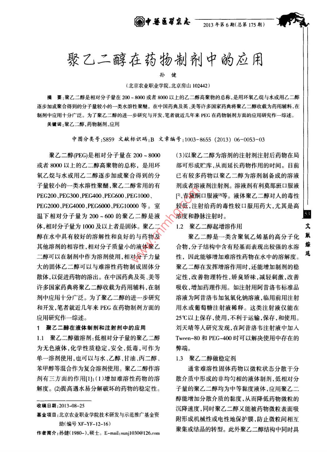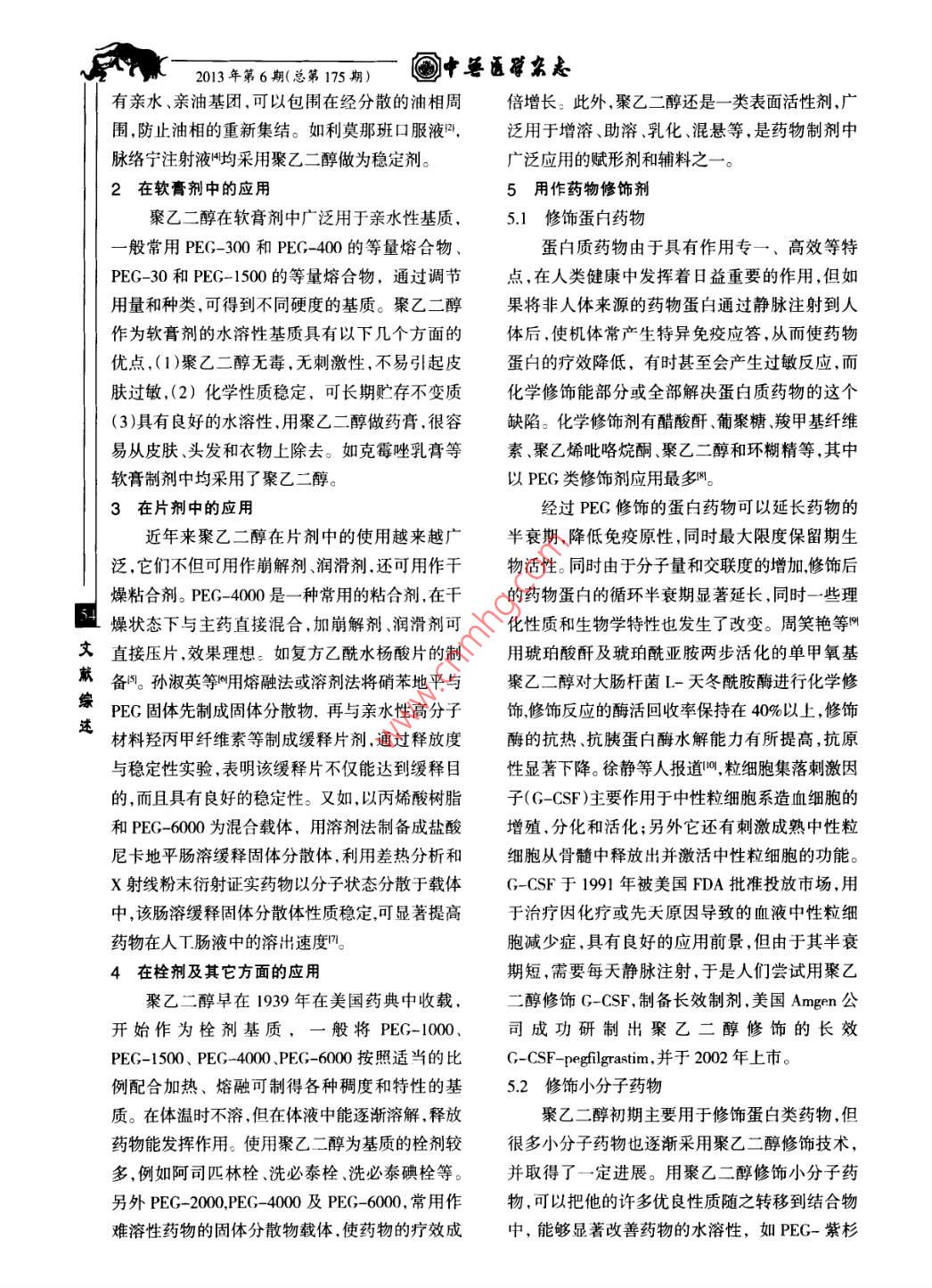 中通雜志2013年第6期(總第175期)聚乙二醇在藥物制劑中的應(yīng)用孫健(北京農(nóng)業(yè)職業(yè)學(xué)院,北京房山102442)摘要:聚乙二醇是相對分子量在200~8000或者800以上的乙二醇高聚物的總稱,是用環(huán)氧乙烷與水或用乙二醇逐步加成聚合得到的分子量較小的一類水溶性聚醚。在中國藥典及英、美等許多國家藥典將聚乙二醇收載為藥用輔料在制劑中應(yīng)用十分廣泛。為了聚乙二醇的進一步研究與開發(fā),筆者就近幾年來PEG在藥物制劑方面的應(yīng)用研究作一綜述。關(guān)鍵詞:聚乙二醇,藥物制劑,應(yīng)用中圖分類號:S859文獻標(biāo)識碼:B文章編號:1003-8655(2013)06-0053-03聚乙二醇(PEG)是相對分子量在200~8000(3)以聚乙二醇為溶劑的注射劑注射后藥物在局或者8000以上的乙二醇高聚物的總稱,是用環(huán)部可形成貯庫,從而延長藥物作用的時間。目前氧乙烷與水或用乙二醇逐步加成聚合得到的分已有較多藥物以聚乙二醇為溶劑制備成的溶液子量較小的一類水溶性聚醚聚乙二醇常用的有劑或者溶液劑注射劑。溶液劑有利莫那班口服液PEG200、PEG300、P400、PEG600、PEG1000、青黛酮口服液等。液體聚乙二醇對人的毒性P2000Peg4000、Pg600、PEG1000等。室較低,注射給藥的毒性較口服用藥大,尤其是高溫下相對分子量為200~600的聚乙二醇是液濃度和靜脈注射時。體,相對分子量為1000及以上者是固體。聚乙二1.2聚乙二醇起增溶作用文醇在水中具有較好的溶解性和良好的與藥物及聚乙二醇是一類含聚氧乙烯基的高分子化獻其他溶劑的相容性,相對分子質(zhì)量小的液體聚乙合物,分子結(jié)構(gòu)中含有羥基而表現(xiàn)出較強的水溶綜二醇可以在制劑中作為溶劑使用,相對分子力量性,因此能夠增加難溶性藥物在水中的溶解度。迷大的固體乙二醇可以與難溶性藥物制成固體分聚乙二醇在發(fā)揮增溶作用時,還能增加制劑的穩(wěn)散體以促進藥物的溶出在中國藥典及英美等定性,改善物理特性,矯臭矯味,減輕刺激,改善許多國家藥典將聚乙二醇收載為藥用輔料,在制吸收,增加藥理作用。如注射用阿昔洛韋標(biāo)準(zhǔn)品劑中應(yīng)用十分廣泛。為了聚乙二醇的進一步研究溶液為阿昔洛韋加氫氧化鈉溶液,臨用前用注射和開發(fā),筆者就近幾年來PEG在藥物制劑方面的用水或葡萄糖注射液稀釋。這類注射液僅能在應(yīng)用研究作一綜述。25℃以上保存,使用,不利于運輸,保存,和使用。1聚乙二醇在液體制劑和注射劑中的應(yīng)用劉天晴等人研究發(fā)現(xiàn),在阿昔洛韋注射液中加入11聚乙二醇做溶劑低相對分子量的聚乙二醇 Tween--80和PEG-400時可以解決使用中存在的為無色液體,化學(xué)性質(zhì)穩(wěn)定,安全,低毒,可作為弊端。單一溶劑使用,也可以與水、乙醇、甘油、丙二醇、1.3聚乙二醇做穩(wěn)定劑苯甲醇等混合作為復(fù)合溶劑使用。聚乙二醇作溶通常難溶性固體藥物以微粒狀態(tài)分散于分劑有三方面的作用]:(1)增加難溶性藥物的溶散介質(zhì)中形成的非均勻相的液體制劑,低相對分解度。(2)提高遇水易分解破壞的藥物的穩(wěn)定性子量的聚乙二醇均為中等黏度液體,應(yīng)用聚乙二一醇能增加分散介質(zhì)的黏度,從而降低藥物微粒的收稿日期:2013-08-25沉降速度,同時聚乙二醇又能被藥物微粒表面吸基金項目:北京農(nóng)業(yè)職業(yè)學(xué)院技術(shù)研發(fā)與示范推廣基金資附形成機械性或電性地保護膜,防止微粒間相互助(編號xf-y-12-16)作者簡介:孫健(1980-),碩士e-mail:sunj1030126.com聚集或結(jié)晶的轉(zhuǎn)型。此外聚乙二醇結(jié)構(gòu)中同時具2013年第6期(總第175期)中醫(yī)雜志有親水、親油基團,可以包圍在經(jīng)分散的油相周倍增長此外,聚乙二醇還是一類表面活性劑,廣圍,防止油相的重新集結(jié)。如利莫那班口服液2泛用于增溶、助溶、乳化、混懸等,是藥物制劑中脈絡(luò)寧注射液均采用聚乙二醇做為穩(wěn)定劑。廣泛應(yīng)用的賦形劑和輔料之一。2在軟膏劑中的應(yīng)用5用作藥物修飾劑聚乙二醇在軟膏劑中廣泛用于親水性基質(zhì)5.1修飾蛋白藥物一般常用PEG-300和PEG-400的等量熔合物、蛋白質(zhì)藥物由于具有作用專一、高效等特PEG-30和PEG-1500的等量熔合物,通過調(diào)節(jié)點,在人類健康中發(fā)揮著日益重要的作用,但如用量和種類可得到不同硬度的基質(zhì)。聚乙二醇果將非人體來源的藥物蛋白通過靜脈注射到人作為軟膏劑的水溶性基質(zhì)具有以下幾個方面的體后,使機體常產(chǎn)生特異免疫應(yīng)答,從而使藥物優(yōu)點,(1)聚乙二醇無毒,無刺激性,不易引起皮蛋白的療效降低,有時甚至?xí)a(chǎn)生過敏反應(yīng),而膚過敏,(2)化學(xué)性質(zhì)穩(wěn)定,可長期貯存不變質(zhì)化學(xué)修飾能部分或全部解決蛋白質(zhì)藥物的這個(3)具有良好的水溶性用聚乙二醇做藥膏很容缺陷。化學(xué)修飾劑有醋酸酐、葡聚糖、羧甲基纖維易從皮膚、頭發(fā)和衣物上除去。如克霉唑乳膏等素、聚乙烯吡咯烷酮、聚乙二醇和環(huán)糊精等,其中軟膏制劑中均采用了聚乙二醇。以PEG類修飾劑應(yīng)用最多3在片劑中的應(yīng)用經(jīng)過PEG修飾的蛋白藥物可以延長藥物的近年來聚乙二醇在片劑中的使用越來越廣半衰期,降低免疫原性,同時最大限度保留期生泛,它們不但可用作崩解劑、潤滑劑還可用作干物活性同時由于