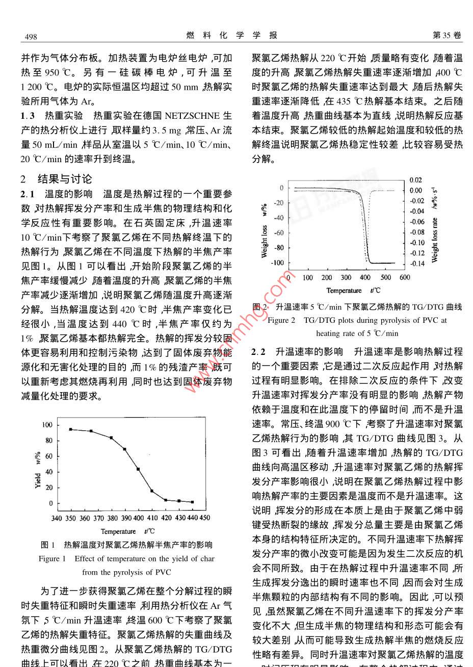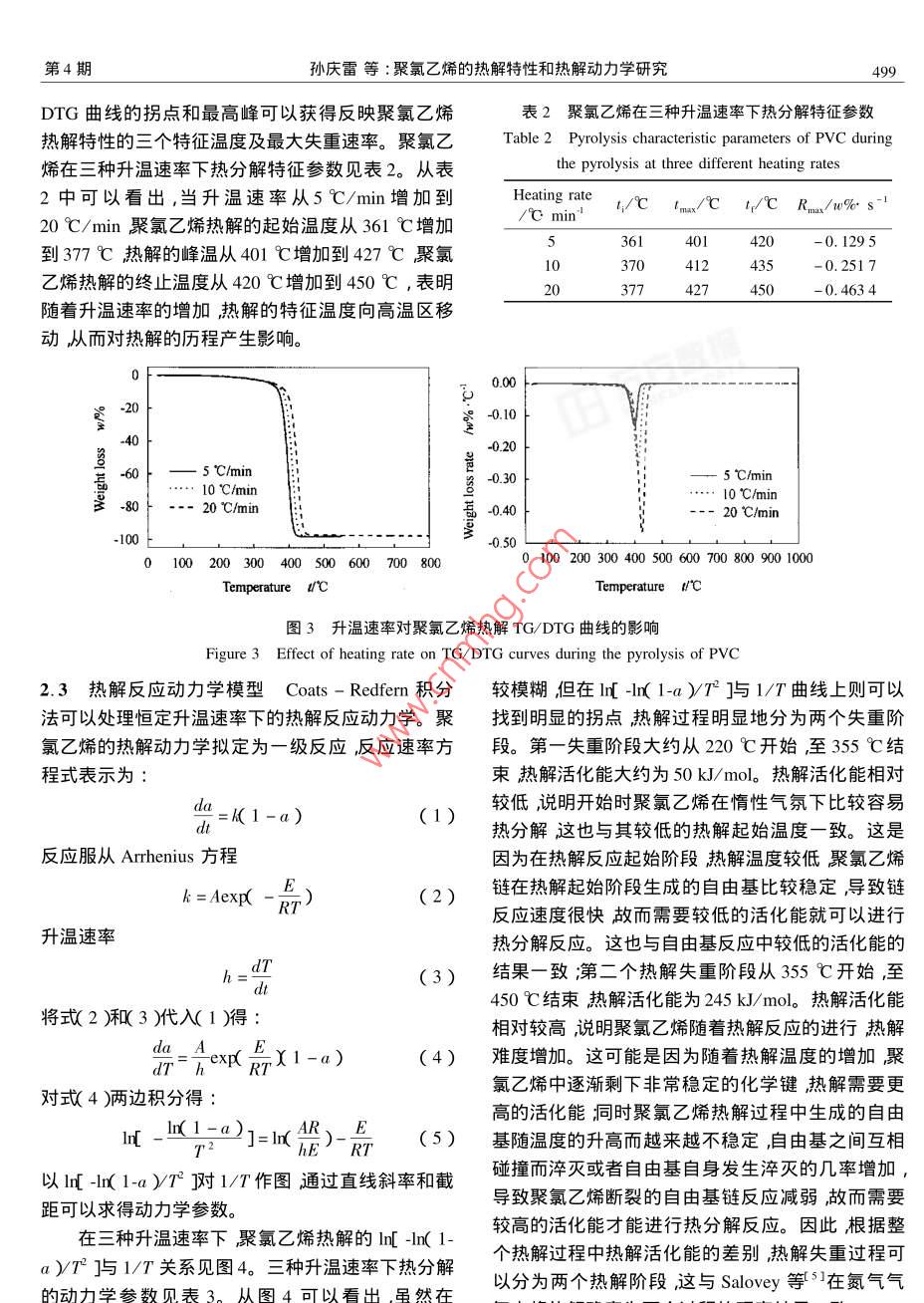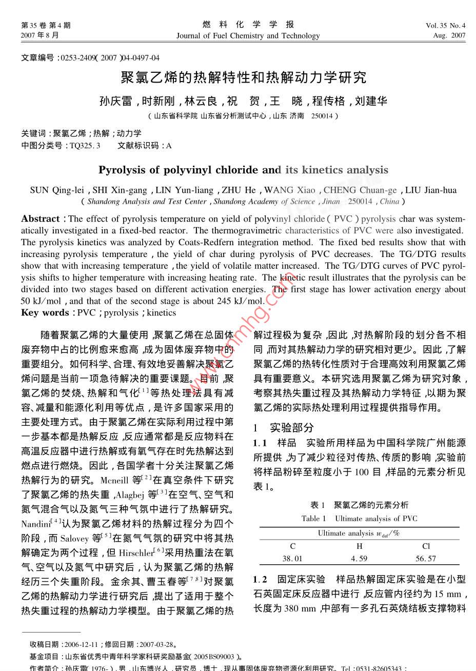 第35卷第4期燃料化學學報Vol. 35 No.42007年8月Journal of Fuel Chemistry and TechnologyAug.2007文章編號:0253-2409( 2007 )04-0497-04聚氯乙烯的熱解特性和熱解動力學研究孫慶雷,時新剛,林云良,祝賀,王曉,程傳格 ,劉建華(山東省科學院山東省分析測試中心,山東濟南250014 )關鍵詞:聚氯乙烯;熱解;動力學中圖分類號:TQ325.3文獻標識碼:APyrolysis of polyvinyl chloride and its kinetics analysisSUN Qing-lei , SHI Xin-gang , LIN Yun-liang ,ZHU He , WANG Xiao , CHENG Chuan-ge , LIU Jian-hua( Shandong Analysis and Test Center , Shandong Academy of Science ,Jinan 250014 , China )Abstract :The effect of pyrolysis temperature on yield of polyvinyl chloride ( PVC ) pyrolysis char was system-atically investigated in a fixed-bed reactor. The thermogravimetric characteristics of PVC were also investigated.The pyrolysis kinetics was analyzed by Coats-Redfern integration method. The fixed bed results show that withincreasing pyrolysis temperature , the yield of char during pyrolysis of PVC decreases. The TG/DTG resultsshow that with increasing temperature,the yield of volatile matter increased. The TG/ DTG curves of PVC pyrol-ysis shifts to higher temperature with increasing heating rate. The kinetic result ilustrates that the pyrolysis can bedivided into two stages based on different activation energies. The first stage has lower activation energy about50 kJ/mol ,and that of the second stage is about 245 kJ/ 'mol.Key words : PVC ; pyrolysis ; kinetics隨著聚氯乙烯的大量使用,聚氯乙烯在總固體解過程極為復雜,因此,對熱解階段的劃分各不相廢棄物中占的比例愈來愈高,成為固體廢棄物中的同,而對其熱解動力學的研究相對更少。因此了解重要組分。如何科學、合理、有效地妥善解決聚氯乙聚氯乙烯的熱轉化性質(zhì)對于合理高效利用聚氯乙烯烯問題是當前一項急待解決的重要課題。目前聚具有重要意義。本研究選用聚氯乙烯為研究對象,氯乙烯的焚燒熱解和氣化等熱處理法具有減考察其熱失重過程及其熱解動力學特征,以期為聚容、減量和能源化利用等優(yōu)點,是許多國家采用的氯乙烯的實際熱處理利用過程提供指導作用。主要處理方式。由于聚氯乙烯在實際利用過程中第1實驗部分一步基本都是熱解反應,反應通常都是反應物料在1.1 樣品實驗所 用樣品為中國科學院廣州 能源高溫反應器中進行熱解或有氧氣存在時先熱解達到所提供,為了減少粒徑對傳熱、傳質(zhì)的影響,實驗前燃點進行燃燒。因此, 各國學者十分關注聚氯乙烯.將樣品粉碎至粒度小于100目樣品的元素分析見熱解行為的研究。Meneill 等21在真空條件下研究表1。了聚氯乙烯的熱失重,Alagbej 等3]在空氣、空氣和氮氣混合氣以及氮氣三種氣氛中進行了熱解研究。表1聚氯乙烯的元素分析Table 1 Ultimate analysis of PVCNandint4們認為聚氯乙烯材料的熱解過程分為四個Utimate analysis twan/%階段,而Salovey等5]在氮氣氣氛的研究中將其熱CHCl解確定為兩個過程, 但Hirschler °]采用熱重法在氧38. 014.5956. 57氣、空氣以及氮氣中研究后,認為聚氯乙烯的熱解經(jīng)歷三個失重階段。金余其、曹玉春等78]對聚氯1.2固定床實驗樣品熱解固定床實驗是在小型乙烯的熱解動力學進行研究后,提出了適用于整個石英固定床反應器中進行反應管內(nèi)徑約為15 mm熱失重過程的熱解動力學模型。由于聚氯乙烯的熱長度為380mm,中部有-多孔石英燒結板支撐物料收稿日期:2006-12-11 ;修回日期:2007 03-28?;痦椖?山東省優(yōu)秀中青年科學家科研獎勵基金2005BS09003 )。作者簡介↓孫慶雷(1976-).男.山東博業(yè)人研究昂博十現(xiàn)從事固體龐棄物資源化利用研究。Tel:053182605343.498燃料化學學報第35卷并作為氣體分布板。加熱裝置為電爐絲電爐,可加聚氯乙烯熱解從220 C開始質(zhì)量略有變化隨著溫熱至950C。另有一硅碳棒電爐,可升溫至度的升高聚氯乙烯熱解失重速率逐漸增加400C1 200 C。電爐的實際恒溫區(qū)均超過50 mm熱解實時聚氯乙烯的熱解失重速率達到最大,隨后熱解失驗所用氣體為Ar。.重速率逐漸降低,在435 C熱解基本結束。之后隨1.3 熱重實驗熱重實驗在德國NETZSCHNE生著溫度升高熱重曲線基本為直線說明熱解反應基產(chǎn)的熱分析儀上進行取樣量約3.5 mg常壓、Ar流本結束。聚氯乙烯較低的熱解起始溫度和較低的熱量50mL/min樣品從室溫以5 C/min、10 C/min、解終溫說明聚氯乙烯熱穩(wěn)定性較差比較容易受熱20 C/ min的速率升到終溫。分解。2結果 與討論0.022.1溫度的影響溫度是熱解過程的一個重要參0.00 E20 .-0.02 E數(shù)對熱解揮發(fā)分產(chǎn)率和生成半焦的物理結構和化-0.0410 t學反應性有重要影響。在石英固定床,升溫速率-0.068 -60-0.0810 C/min下考察了聚氯乙烯在不同熱解終溫下的-0.1080熱解行為聚氯乙烯在不同溫度下熱解的半焦產(chǎn)率-0.12見圖1。從圖1可以看出,開始階段聚氯乙烯的半-100-0.14焦產(chǎn)率緩慢減少隨著溫度的升高聚氯乙烯的半焦0 100200300400 500 600Temperature心C產(chǎn)率減少逐漸增加,說明聚氯乙烯隨溫度升高逐漸分解。當熱解溫度達到420 C時半焦產(chǎn)率變化已圖2升溫速率5 C/min下聚氯乙烯熱解的TG/DTG曲線經(jīng)很小,當溫度達到440 C時,半焦產(chǎn)率僅約為Figure 2 TG/DTG plots during pyrolysis of PVC atheating rate of5 C/min1%聚氯乙烯基本都熱解完全。熱解的揮發(fā)分較固體更容易利用和控制污染物,達到了固體廢棄物能2.2升溫速率的影響升溫速率是影響熱解過程源化和無害化處理的目的而1%的殘渣產(chǎ