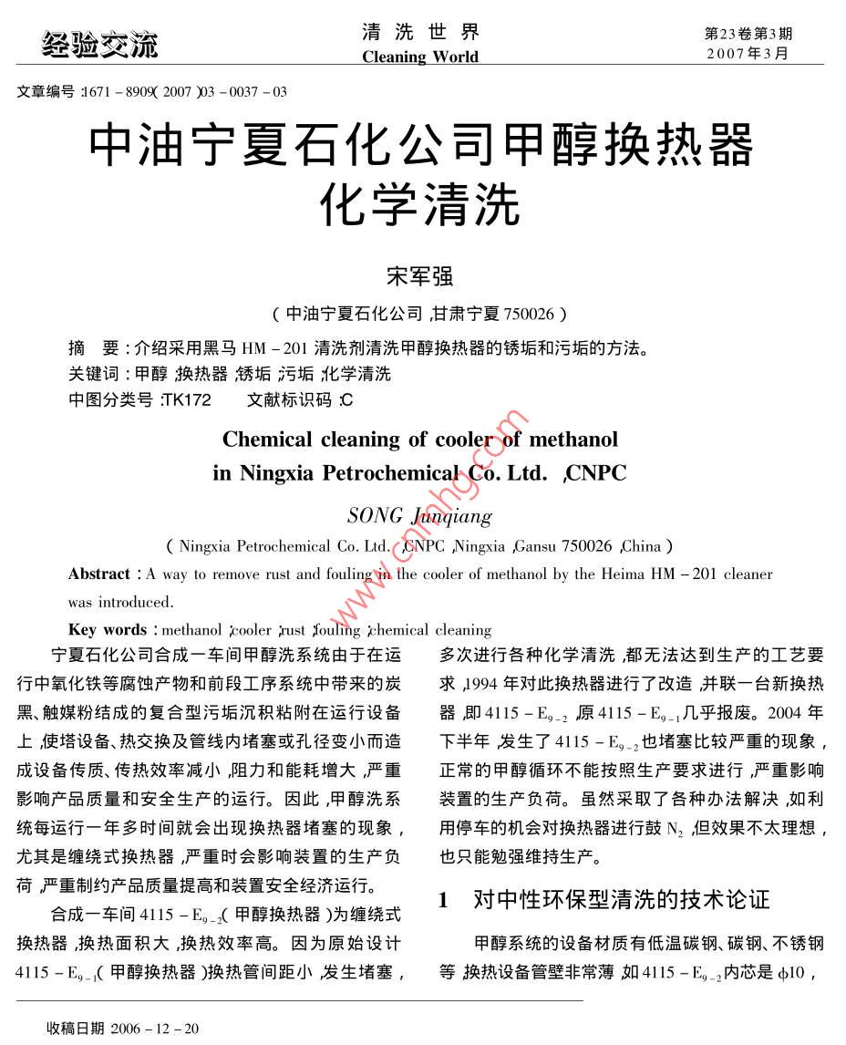 中油寧夏石化公司甲醇換熱器化學清洗