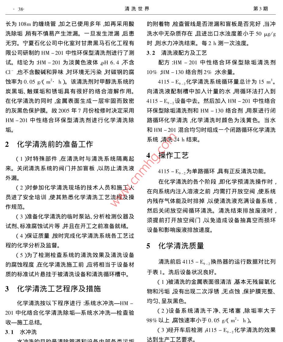 經(jīng)驗交流清洗世界第23卷第3期Cleaning World2007年3月文章編號1671-89092007)3-0037-03中油寧夏石化公司甲醇換熱器化學清洗宋軍強中油寧夏石化公司甘肅寧夏750026)摘要:介紹采用黑馬HM-α0Ⅰ凊洗劑清凊洗甲醇換熱器的銹垢和污垢的方法。關(guān)鍵詞:甲醇換熱器銹垢污垢沘學清洗中圖分類號「K172文獻標識碼忑Chemical cleaning of cooler of methanolin Ningxia Petrochemical Co Ltd. CNPCSONG JungangNingxia Petrochemical Co Ltd. CNPC Ningxia Gansu 750026 ChinaAbstract: A way to remove rust and fouling in the cooler of methanol by the Heima HM-201 cleanerwas introducedKey words: methanol ' cooler aust fouling chemical cleaning寧夏石化公司合成一車間甲醇洗系統(tǒng)由于在運多次進行各種化學清洗都無法達到生產(chǎn)的工藝要行中氧化鐵等腐蝕產(chǎn)物和前段工序系統(tǒng)中帶來的炭求J994年對此換熱器進行了改造并聯(lián)一臺新?lián)Q熱黑、觸媒粉結(jié)成的復合型污垢沉積粘附在運行設備器即4115-E。3原4115-E。幾乎報廢。2004年上使塔設備、熱交換及管線內(nèi)堵塞或孔徑變小而造下半年發(fā)生了415-E。也堵塞比較嚴重的現(xiàn)象,成設備傳質(zhì)、傳熱效率減小阻力和能耗增大嚴重正常的甲醇循環(huán)不能按照生產(chǎn)要求進行,嚴重影響影響產(chǎn)品質(zhì)量和安全生產(chǎn)的運行。因此甲醇洗系裝置的生產(chǎn)負荷。雖然采取了各種辦法解決如利統(tǒng)毎運行一年多時間就會岀現(xiàn)換熱器堵塞的現(xiàn)象,用停車的機會對換熱器進行鼓N2但效果不太理想尤其是纏繞式換熱器,嚴重時會影響裝置的生產(chǎn)負也只能勉強維持生產(chǎn)。荷嚴重制約產(chǎn)品質(zhì)量提高和裝置安全經(jīng)濟運行。合成一車間4115-E甲醇換熱器)為纏繞式1對中性環(huán)保型清洗的技術(shù)論證換熱器換熱面積大,換熱效率高。因為原始設計甲醇系統(tǒng)的設備材質(zhì)有低溫碳鋼、碳鋼、不銹鋼415-E。(甲醇換熱器)腴換熱管間距小發(fā)生堵塞,等換熱設備管壁非常薄如4115-E內(nèi)芯是小l0,收稿日期2006-12-20清洗世界第3期長為108m的纏繞管加之已使用多年如再采用酸的附著物檢查管線是否泄漏和盲板是否完好,當沖洗除垢稍有不慎易產(chǎn)生泄漏。一旦發(fā)生泄漏后患洗水中無雜質(zhì)存在且進出口水濁度差小于50μg/g無窮。寧夏石化公司中化室對甘肅黑馬石化工程有時則水力沖洗結(jié)束。每2h測一次濁度。限公司研制的HM-201中性環(huán)保型清洗劑進行了測3.2清洗液配方及工藝試。結(jié)論為HM-201為淡黃色液體nH6.4不含配方:HM-201中性絡合環(huán)保型除垢清洗劑CⅠˉ也不含酸堿和異味對環(huán)境無污染對碳鋼的腐10%HM-130絡合劑2%水余量。蝕率為0.05g(m2·h)。該清洗劑對甲醇洗系統(tǒng)的415-E2化學清洗系統(tǒng)循環(huán)量總計為15m3。炭黑垢、觸媒垢和銹垢具有很好的絡合溶解作用。向清洗液配制槽中加入計量的水用循環(huán)法打入到在化學清洗的同時金屬表面生成一層牢固而致密4115-E2設備中去。然后加入HM-201中性絡合的灰黑色保護膜。故2005年⑦月份檢修時決定采用環(huán)保型除垢清洗劑和HM-130絡合劑用泵進行閉HM-20中性絡合環(huán)保型清洗劑進行化學清洗除路循環(huán)化學清洗化學清洗時顏色為淺黃色。當水垢和HM-201混合均勻時組成一個閉路循環(huán)化學清洗2化學清洗前的準備工作系統(tǒng)清洗24h結(jié)束。(1)對特殊部件在清洗時與清洗系統(tǒng)隔離起操作工藝來。關(guān)閉凊洗系統(tǒng)的閥門并加盲板以防止清洗液4115-E2為單路循環(huán)具有正反清洗功能。外漏。在化學清洗的各個階段,即化學預清洗操作時(2)對參加化學清洗現(xiàn)場的技術(shù)人員和施工人在向系統(tǒng)內(nèi)注入溶液之前均需打開放空閥使系統(tǒng)員進了安全培訓使其熟悉化學清洗工藝流程及操內(nèi)殘存氣體能及時排掉,以使清洗液充滿設備系統(tǒng),作規(guī)范。然后關(guān)閉放空閥循環(huán)清洗。清洗結(jié)束排放廢液時3)準備化學清洗的臨時泵站、分析檢測儀器及須提前打開放空閥門,以免造成設備抽真空而損壞試劑、標準腐蝕試片等并且在開工之前準備就緒設備和影響廢液排放速度。(4)保證質(zhì)量按時完成化學清洗系統(tǒng)各工藝過程的化學分析及監(jiān)督。5化學清洗質(zhì)量5)為了檢測檢査系統(tǒng)的清洗效果及清洗設備的腐蝕程度在化學清洗施工前應將相當于設備材清洗前后4115-E。-換熱器的運行數(shù)據(jù)對比列質(zhì)的標準試片懸掛于被清洗設備和清洗循環(huán)槽中。于表1。洗后設備狀況良好。1)被清洗的金屬表面很清潔基本無殘留氧化3化學清洗工藝程序及措施物和污垢沒有岀現(xiàn)二次浮銹無點蝕保護膜完整、化學清洗按以下程序進行:系統(tǒng)水沖洗-HM均勻、呈灰黑色。201中化絡合化學清洗除垢一系統(tǒng)水沖洗—檢查驗2)設備系統(tǒng)清洗干凈、無堵塞,除垢率大于收一施工總結(jié)。98%以上腐蝕速率小于0.05g(m2.h3.1水沖洗(3)經(jīng)開車后檢測A115-E2化學清洗的效果w吽的日的旦害險悄訊譏氫內(nèi)米÷達到生產(chǎn)工藝要求。第23卷宋軍強.中油寧夏石化公司甲醇換熱器化學清洗39表14115-E2換熱器設計數(shù)據(jù)和清洗前后運行數(shù)據(jù)的對比項目E2管程進口E2管程出口F-2殼程進口E2殼程進囗設計數(shù)據(jù)投用后數(shù)據(jù)35,0清洗前數(shù)