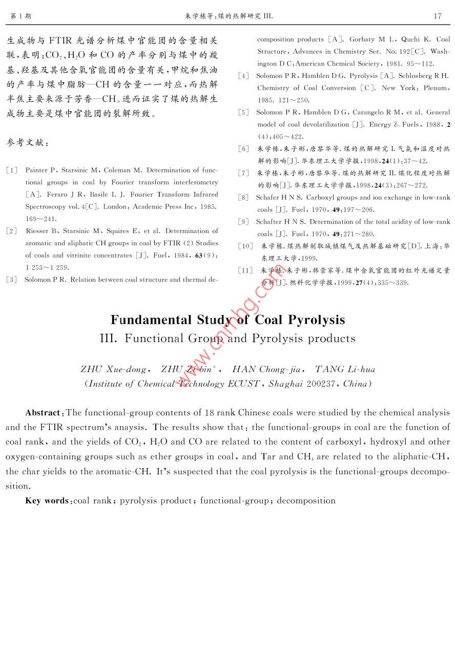 Vol. 26 No.114Journal of East China University of Science and Teehnology2000-02文章編號:1006-3080(2000)01-0014-04煤的熱解研究III. 煤中官能團(tuán)與熱解生成物”,”...一七 “(>1<<< 9tl/ -o”200237)摘要:%oC ceflS.”TTIR ,”-.9. ,,3年9f50.^.. ”。 B< ,~-”2 i只%呻。CO2、H2O”CO干∈°,一- CH”2 i ?0%,,"干咱~ ,, ;但CH ”2 i 2-%。君木咱。,。一”-%。申。“一”,“- ~, 0。關(guān)鍵詞:^年T;-%。中. ;,,~- ;11 ~中圖分類號:TQ520; O657.3文獻(xiàn)標(biāo)識碼:A煤結(jié)構(gòu)性質(zhì)的研究一直是煤化學(xué)工作者關(guān)注的1.2 含氧官能團(tuán)的化學(xué)分析重要問題,借助FTIR光譜對煤中官能團(tuán)性質(zhì)的確煤樣中總酸性基團(tuán)測定用BaCl2和Ba (OH)2定和定量分析,已得到了眾多學(xué)者的認(rèn)同[1~41?;旌先芤哼M(jìn)行陽離子交換8,而羧酸基團(tuán)測定用醋煤中官能團(tuán)結(jié)構(gòu)的研究表明,煤的有機(jī)組分是酸鋇溶液陽離子交換法[叩],由于煤中酸性基團(tuán)主要由含有高取代基的芳香環(huán)族以各種相對弱的脂肪橋是羧酸基和酚羥基,其他酸性基團(tuán)很少,由此認(rèn)為煤鍵和醚鍵連接組成,官能團(tuán)的數(shù)量與煤化程度有關(guān)。中酚羥基為總酸性基團(tuán)與羧酸基團(tuán)的含量之差。其Solomon[53~1]認(rèn)為煤都是由相同性質(zhì)的官能團(tuán)組成它含氧官能團(tuán)的氧含量則由元素分析氧差減酚羥基的,煤種的差異僅為官能團(tuán)數(shù)量的變化。把煤的熱解和羧酸基中的氧含量之差所得。與弱橋鍵斷裂相關(guān)聯(lián),即煤的熱解是由于煤的官能1.3 煤的FTIR光譜團(tuán)斷裂反應(yīng)引起,則煤熱解的小分子氣體生成物與用KBr壓片法,準(zhǔn)確稱取1.5mg煤樣和300mg煤中對應(yīng)的取代官能團(tuán)有關(guān),并可建立描述小分子干燥后KBr,一起放入磨樣機(jī)內(nèi),在氮?dú)獗Wo(hù)下研磨.氣體生成的官能團(tuán)熱解模型0。約30min 并使之充分混合。KBr壓片在105°C真空本文在借助化學(xué)方法和FTIR光譜分析煤中官條件下干燥48h,在Niclet Magna- IR550紅外光譜能團(tuán)含量的基礎(chǔ)上,把我國煤化程度有明顯差異的分析儀上進(jìn)行分析,波數(shù)范圍400~4 000cm : 1,分18種煤的熱解結(jié)果與FTIR光譜分析煤中官能團(tuán)辨率4cm-',樣品的掃描次數(shù)為32次,同時(shí)對比空含量相關(guān)聯(lián),進(jìn)一步考察了煤的熱解生成物與相應(yīng)白樣時(shí)KBr壓片的32次掃描背景,以獲得高質(zhì)量官能團(tuán)之間的關(guān)系。的光譜。然后以1mg/em?(daf)有機(jī)物質(zhì)為標(biāo)準(zhǔn)歸一化,并進(jìn)行光譜基線的修正和差減低溫灰光譜1實(shí)驗(yàn)部分(1mg/cm2(daf)有機(jī)物質(zhì)所含)以消除灰分的影響[101。1.1 煤樣及熱解實(shí)驗(yàn)煤樣的熱解裝置和實(shí)驗(yàn)方法見文獻(xiàn)[6],實(shí)驗(yàn)選2實(shí)驗(yàn)結(jié)果和討論用我國碳含量(wc)介于0.69~0.87(daf)煤化程度不同的18 種煤作煤樣,其分析數(shù)據(jù)和熱解結(jié)果見文2.1煤中的含氧官 能團(tuán)獻(xiàn)[7]。圖1為含氧官能團(tuán)中氧含量(wo)與煤化程度(用煤中碳含量we表示)的關(guān)系,從圖可知,隨煤化1)現(xiàn)工作單位:曲阜師范大學(xué)化學(xué)系¥E-mail: xdzhu@ dnsl. qfnu. edu. cn程度增加,煤中含氧官能團(tuán)逐漸減少,煤中的氧有少第1期朱學(xué)棟等:煤的熱解研究II.i5大半。w.u是煤中脂肪碳含量,WC.wu是總碳含量(即為元素分析值).x是描述脂肪物質(zhì)CH,的化學(xué)計(jì)量,x0.16p的值取1.853。由此得到18種煤中脂肪- CH 和芳。Oaher0.12-玄OoH香一CH的含量見表1。?OcOoH2gQ08-3000.04-舍250200。、1500.650.700.750.800.850.900.95w圖1煤化程度與煤中官能團(tuán)氧含量分布間的關(guān)系0100200300400500600700Ag(W'nt - whoH)Fig.Distribution of oxygen -containingfunctional groups in the coals as圖2脂肪氫和芳香氫吸光度系數(shù)的確定function of carbon contentFig.2 Regression analysis to determine aromatic2.2煤中的脂肪一 CH和芳香一CHand aliphatic absorptivities根據(jù)FTIR譜圖上煤中官能團(tuán)吸收波帶的歸屬表1煤中含氫官能團(tuán)的氫和含碳官能團(tuán)的碳分布表和吸收面積,本文使用紅外光譜2 900cm-1附近的Table 1 Distribution of hydrogen of hydrogen- containing脂肪-CH伸縮振動(dòng)吸收強(qiáng)度(吸收面積,Aa)和function groups and carbon of carbon containing800em- |附近芳香- -CH的面外彎曲振動(dòng)吸收強(qiáng)度function groups in coals(吸收面積,A.)來表征煤中脂肪氫和芳香氫4。光譜分解及各峰吸收面積的計(jì)算見文獻(xiàn)[11]。考慮到CoalAromatic Aliphatic AliphatieAromatic在830cm-處出現(xiàn)了脂肪-CH的搖擺振動(dòng)吸收,但HCH可以從800cm-1附近(即900~700cm!吸收帶)芳Yangquan0.012 960.014 940.114 50. 7759香-CH的A。中加以消除,差減830cm-I處吸收強(qiáng)Xishan0. 030 880.025 910. 168 60. 7504度后,以此作為分析煤中芳香-CH中芳香氫的基Caojiazhuang 0. 027 550.03051 0. 203 90.706 0礎(chǔ)[10。Kailuan0. 023 960.031 43 0.240 90. 6334根據(jù)元素分析獲得的煤中氫含量(wH.r)和煤中Datong0. 020 200.03300 0. 253 00. 6281羥基氫含量(w.ou)的值,利用Riesser[h]提 出的方Houbulian 0.018 160.0224 O. 17050.6799法,以Aa/ (WH,r一WH.oH)和Aar/ (WH.τ- -WH.0H)分別Shenmu0.01548 0.02092 0. 16040.671 7為橫坐標(biāo)和縱坐標(biāo)作圖(見圖2),由圖可知它們成Guojiawan 0.021 63 0.037 860. 29020. 5804線性關(guān)系,直線與坐標(biāo)軸交點(diǎn)即為吸光度系數(shù)的值,Huafeng0.0168