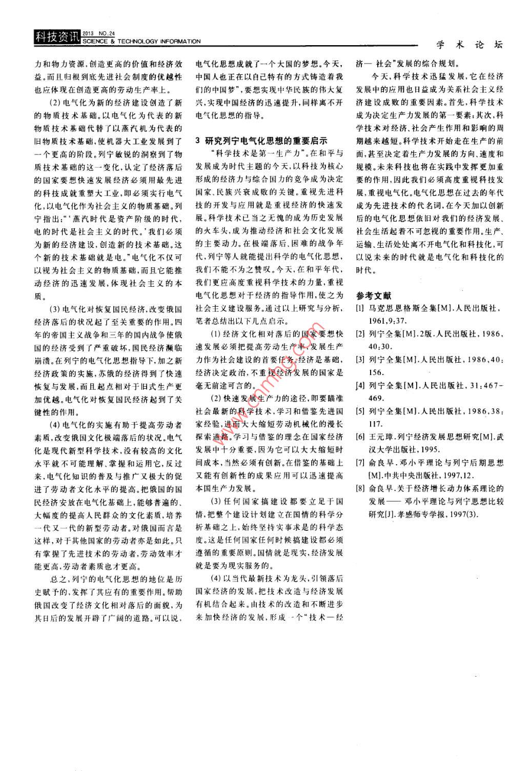 SCENCE & TECNOLOGY NFOMATION科技資訊2013NO-24學術論壇列寧的電氣化思想研究及其啟示°張燕紅(呼和浩特職業(yè)學院馬列部內(nèi)蒙古呼和浩特 010058)摘要:本文從俄國當時經(jīng)濟文化相對落后的現(xiàn)狀出發(fā), 結合科技革命的發(fā)展,從它與社會主義本應建立在較為先進的經(jīng)濟基礎之上的矛盾入手,系統(tǒng)論證了列寧電氣化思想提出的重要性和正確性。從兩得出重視科技,走以科技為龍頭帶動整個經(jīng)濟社會發(fā)展的結論,并就此研究,筆者總結出幾點重要啟示。關鍵詞:電氣化科技革命科學技術中圖分類號: A8文獻標識碼: A .文章編號: 1672-3791(2013)08(e)-0219-021列寧電氣化思想提出的背景和依據(jù)果,才能擺脫落后的面貌,迅速趕上西方家 工業(yè)化進程的作用,強調指出只有通過歷史上俄國曾是一個十分落后的小農(nóng)發(fā) 達國家。當時又正值以電力為標志的第實現(xiàn)電氣化, 才能建立起蘇聯(lián)的大工業(yè)基國家,16世紀由于封建農(nóng)奴制的禁錮使得二次科技革命 的興起。在以上理論的指導礎 。并由此形成了列寧新的經(jīng)濟戰(zhàn)略思想:俄國經(jīng)濟文化遠遠落后于西方其他工業(yè)國下,俄共(布)高度重視體現(xiàn)當時科學技術即 在新的國家制度建立起來以后,以最先家,甚至到20世紀亦是如此,加之前兩次最高成就的電氣化在俄國社會主義建設中進的科學技術帶動社會主義的發(fā)展,走跨的科技革命,尤其是以電的發(fā)明和廣泛應的作用, 旗幟鮮明地提出"共產(chǎn)主義就是蘇越式的 工業(yè)化道路。毋庸置疑.通過研究列用為標志的第二次科技革命,直接促進了維埃政權加全國電氣化”。 并不遺余力的寧 的電氣化思想和新經(jīng)濟戰(zhàn)略,為我國的當時資本主義國家生產(chǎn)的發(fā)展,使英美等推動代表當時技術發(fā)展方向和先進生產(chǎn)經(jīng)濟 建設提供了寶貴的經(jīng)驗。歐洲國家迅速崛起,而落后的俄國由于沒力的電氣化進程。 列寧認為要在小生產(chǎn)占俄羅斯國家電氣化計劃于1920年12有適時的抓住科技革命的機遇,繼續(xù)沿用優(yōu)勢的狀況下過渡到社會主義,必須有一月召開的蘇維埃第八次代表大會 上予以批粗放式的經(jīng)營道路,被西方國家遠遠地甩個條件,這個條件就是電氣化。而要向社會 準。這部計 劃共分為六個部分:(1)電氣化在了后面。第二次科技革命之后,人們對科主義過渡.就必須從俄國的基本國情出發(fā),和國家經(jīng)濟計 劃;(2)燃料供應:(3)水力;技與生產(chǎn)的密切關系的認識逐漸加深。采取一些中間途徑,以便由宗法制度、小生(4) 農(nóng)業(yè);(5)運輸業(yè):(6)工業(yè)。誠然,這只早在馬、恩時代,他們就已關注到科學產(chǎn)這些前資本主義因素過渡到社會主義。是 一個大致的.初步的計劃,但那里有專技術的巨大社會功能。馬克思堅信,在從資19 世紀70年代,科技領域掀起了以電的家們關于一切基 本經(jīng)濟問題所作的確切本主義向社會主義過渡的歷史進程中,革發(fā)現(xiàn)和應用為標志的第二次科技革命,從計 劃。蘇維埃的全俄電氣化計劃》使俄國命所起的作用是幫助在資本主義母體中成此人類社會由蒸汽時代進入了電氣時代, 的社會主義經(jīng)濟建設與社會技術改造有熟起來的社會主義胚胎分娩出來,而科學電力的廣泛應用使科學同技術密切結合機的結合 起來,成為指導蘇俄經(jīng)濟建設的和技術則是推動歷史前進的有力杠桿。因起來,在推動生產(chǎn)發(fā)展和人類社會進步的 重要 綱領。而馬克思稱革命是“助產(chǎn)士",科技是“大過程中發(fā)揮 了積極的作用。列寧對作為推列寧逝世以后斯大林領導的蘇聯(lián)社杠桿"。恩格斯以同樣的熱情投入到“科學動生產(chǎn) 力發(fā)展的科學技術給予了高度的重會 主義工業(yè)化運動實質是列寧領導的社會技術一生產(chǎn)力一社會制度"之間的互動關視,并明確將科學技術與社會主義制度的主 義電氣化運動的延續(xù),在本質上仍然屬系上,深刻指出科學技術可以改變一個時生存聯(lián)系起來。 于是代表當時最先進的科于第二次科技革命。 如果說列寧的電氣化代,人們要認識“在這個時代里,蒸汽和風技成果的電力技 術被列寧等人高度重視運動是電 工技術革命的初級階段,那么斯力,電力和印刷機、大炮和金礦的聯(lián)合作用起來, 電氣化思想應用而生。大林的工業(yè)化運動則是電工技術革命的高在一年當中引起的變化和革命要多過以往級階段。通過兩個五年計劃的完成,蘇聯(lián)工整整一個世紀”。隨著科技革命的推動,社2 列寧電氣化思想的重要作用業(yè)總產(chǎn)值已超過了當時的德、英、法,躍居會政治經(jīng)濟結構發(fā)生了翻天覆地的變化。列寧領導和參與制定了全俄電氣化歐洲第一、 世界第二,蘇聯(lián)人在短期內(nèi)實現(xiàn)19世紀電力革命興起后,馬.恩敏銳的預計劃,并把它確立 為俄共(布)的“第二個黨了幾代人 夢寐以求的工業(yè)化強國夢想。測到,電力技術將掀起更加巨大的,開辟綱"。他指出“ 我們要挖掉資本主義的老根那么,列寧為什么如此重視“電氣化”新的道路的社會革命。通過研究,我們不只有一種辦法,那就是把國家經(jīng)濟,包括農(nóng)在俄國 社會主義建設中的作用呢?因為難看出在馬克思、恩格斯對生產(chǎn)力與生產(chǎn)業(yè)在內(nèi)