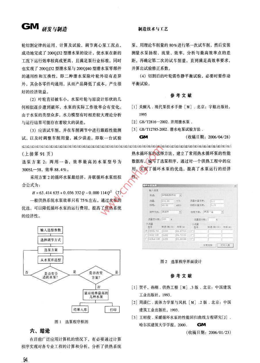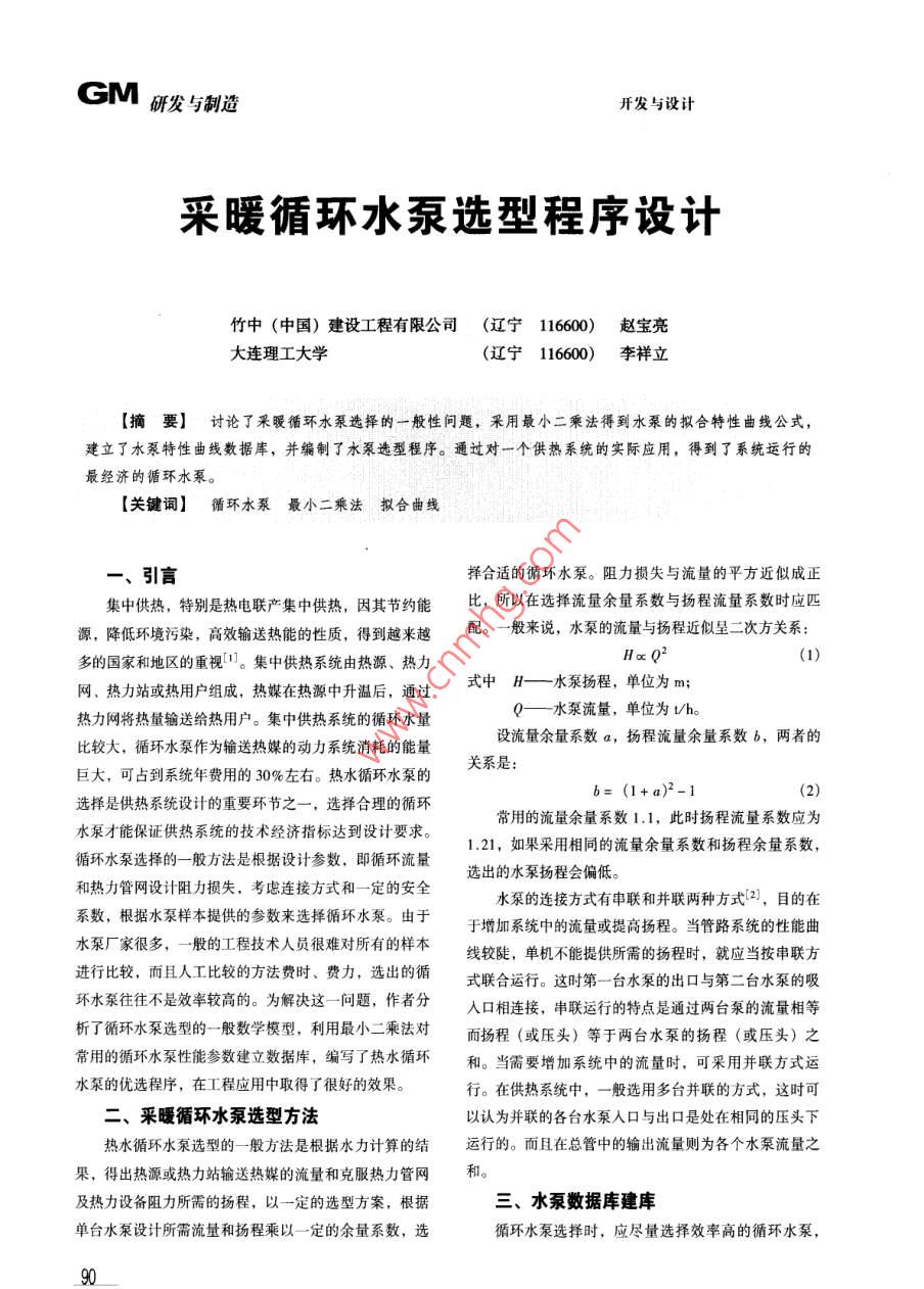 GGM研發(fā)與制造開發(fā)與設(shè)計采暖循環(huán)水泵選型程序設(shè)計竹中(中國)建設(shè)工程有限公司(遼寧116600)趙寶亮大連理工大學(xué)(遼寧1160李樣立【摘要】討論了采暖循環(huán)水泵選擇的一般性問題,采用最小二乘法得到水泵的擬合特性曲線公式建立了水泵特性曲線數(shù)據(jù)庫,并編制了水泵選型程序。通過對一個供熱系統(tǒng)的實際應(yīng)用,得到了系統(tǒng)運行的最經(jīng)濟的循環(huán)水泵?!娟P(guān)鍵詞】循環(huán)水泵最小二乘法擬合曲線引言擇合適的循環(huán)水泵。阻力損失與流量的平方近似成正集中供熱,特別是熱電聯(lián)產(chǎn)集中供熱,因其節(jié)約能比,所以在選擇流量余量系數(shù)與揚程流量系數(shù)時應(yīng)匹源,降低環(huán)境污染,高效輸送熱能的性質(zhì),得到越來越配。一般來說,水泵的流量與揚程近似呈二次方關(guān)系多的國家和地區(qū)的重視。集中供熱系統(tǒng)由熱源、熱力(1)網(wǎng)、熱力站或熱用戶組成,熱媒在熱源中升溫后,通過式中H——水泵揚程,單位為m;熱力網(wǎng)將熱量輸送給熱用戶。集中供熱系統(tǒng)的循環(huán)水量Q—水泵流量,單位為t/h比較大,循環(huán)水泵作為輸送熱媒的動力系統(tǒng)消耗的能量設(shè)流量余量系數(shù)a,揚程流量余量系數(shù)b,兩者的巨大,可占到系統(tǒng)年費用的30%左右。熱水循環(huán)水泵的關(guān)系是:選擇是供熱系統(tǒng)設(shè)計的重要環(huán)節(jié)之一,選擇合理的循環(huán)b=(1+a)2-1常用的流量余量系數(shù)1.1,此時揚程流量系數(shù)應(yīng)為水泵才能保證供熱系統(tǒng)的技術(shù)經(jīng)濟指標達到設(shè)計要求。1.21,如果采用相同的流量余量系數(shù)和揚程余量系數(shù),循環(huán)水泵選擇的一般方法是根據(jù)設(shè)計參數(shù),即循環(huán)流量選出的水泵揚程會偏低和熱力管網(wǎng)設(shè)計阻力損失,考慮連接方式和一定的安全水泵的連接方式有串聯(lián)和并聯(lián)兩種方式2),目的在系數(shù),根據(jù)水泵樣本提供的參數(shù)來選擇循環(huán)水泵。由于于增加系統(tǒng)中的流量或提高揚程。當(dāng)管路系統(tǒng)的性能曲水泵廠家很多,一般的工程技術(shù)人員很難對所有的樣本線較陡,單機不能提供所需的揚程時,就應(yīng)當(dāng)按串聯(lián)方進行比較,而且人工比較的方法費時、費力,選出的循式聯(lián)合運行。這時第一臺水泵的出口與第二臺水泵的吸環(huán)水泵往往不是效率較高的。為解決這一問題,作者分入口相連接,串聯(lián)運行的特點是通過兩臺泵的流量相等析了循環(huán)水泵選型的一般數(shù)學(xué)模型,利用最小二乘法對而揚程(或壓頭)等于兩臺水泵的揚程(或壓頭)之常用的循環(huán)水泵性能參數(shù)建立數(shù)據(jù)庫,編寫了熱水循環(huán)和。當(dāng)需要增加系統(tǒng)中的流量時,可采用并聯(lián)方式運水泵的優(yōu)選程序,在工程應(yīng)用中取得了很好的效果。行。在供熱系統(tǒng)中,一般選用多臺并聯(lián)的方式,這時可采暖循環(huán)水泵選型方法以認為并聯(lián)的各臺水泵入口與出口是處在相同的壓頭下熱水循環(huán)水泵選型的一般方法是根據(jù)水力計算的結(jié)運行的。而且在總管中的輸出流量則為各個水泵流量之果,得出熱源或熱力站輸送熱媒的流量和克服熱力管網(wǎng)和。及熱力設(shè)備阻力所需的揚程,以一定的選型方案,根據(jù)三、水泵數(shù)據(jù)庫建庫單臺水泵設(shè)計所需流量和揚程乘以一定的余量系數(shù),選循環(huán)水泵選擇時,應(yīng)盡量選擇效率高的循環(huán)水泵開發(fā)與設(shè)計研發(fā)與制造M使水泵工作在高效段,節(jié)約電能。由于各個廠家生產(chǎn)的式7水泵效率;水泵性能不同,很難用解析形式表示。根據(jù)水泵特性曲、a1、a2水泵流量、揚程擬和系數(shù);線形狀,考慮二次多項式作為擬合基函數(shù),采用最小二b、b1、b2水泵流量、效率擬和系數(shù)。乘法對各種水泵的性能曲線和效率曲線回歸13,建立水選擇供熱系統(tǒng)中常用的SH、SA、SL、SLA、RXL泵數(shù)據(jù)庫,作為備選集,通過選泵程序來選擇水泵。循等水泵進行回歸,對每種水泵選擇12個點進行采樣,環(huán)水泵揚程和效率的擬合基函數(shù)如下式所示:同時在取點時盡量在選擇水泵運行的高效區(qū)取點。由于=a0+a,Q+a2Q(3)篇幅所限,現(xiàn)僅列出部分數(shù)據(jù)如表1所示。m=b0+ b0+b2Q表1水泵參數(shù)表額定轉(zhuǎn)速流量揚程流量揚程流量揚程流量效率流量效率流量效率水泵型號最低級數(shù)最高級數(shù)/(r/mi)系數(shù)/ao系數(shù)/a1系數(shù)/b系數(shù)/b1系數(shù)/b2E032125129021.7601542-0582981395942-4402SRS0-32-1251450495287823248.492614sh-61470132.08840.0601-0.0004294.824040.39593-0.0056114s-9147089090387-0.∞01932-103160:563-0.0078D6525(多級泵)295025.30920.89792-0.6107458-0.90288241.5298-8.78723四、選泵方案的確定(2)分階段改變流量質(zhì)調(diào)節(jié)在供暖期中按室外溫選擇水泵時,需要給出熱力網(wǎng)的調(diào)節(jié)方式并預(yù)先確度高低分成幾個階段。在室外溫度較低的階段中,保持定循環(huán)數(shù)泵的選型方案,然后根據(jù)確定的方案選擇效率設(shè)計最大流量;而在室外溫度較高的階段中,保持較小最高的循環(huán)泵。首先確定調(diào)節(jié)方式,熱力網(wǎng)的調(diào)節(jié)方式的流量有流