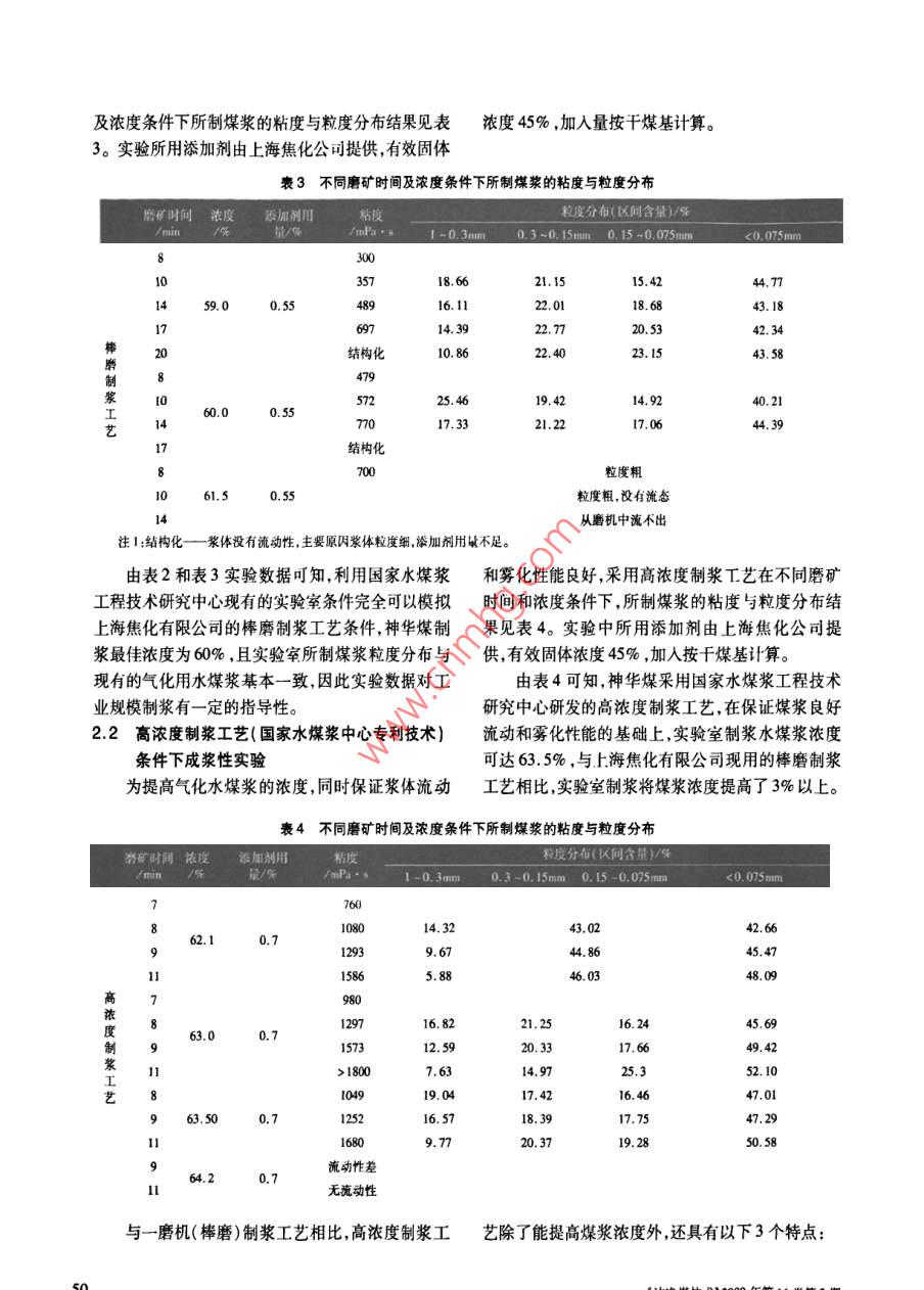 轉(zhuǎn)化利用全國中文核心期刊礦業(yè)類核心期刊《CACD規(guī)范》執(zhí)行優(yōu)秀期刊提高神華煤氣化水煤漿濃度的可行性研究段清兵,梁興,張勝局,郭志新,何國鋒(國家水煤漿工程技術(shù)研究中心,北京100013)摘要:在實驗寶分別采用自主研發(fā)的高濃度制漿新工藝與上海焦化有限公司氣化水煤漿的制漿工藝進(jìn)行了實驗,實驗結(jié)果表明:新工藝可使煤漿濃度提高3%以上,并對新工藝和添加劑SHPF與上海焦化現(xiàn)采用的制漿工藝和添加劑進(jìn)行了對比。關(guān)鍵詞:神華煤;氣化水煤漿;濃度中圖分類號:TQ536文獻(xiàn)標(biāo)識碼:A文章編號:100672(200902004904水煤漿制備工藝是水煤漿氣化技術(shù)的關(guān)鍵部分12主要實驗儀器與設(shè)備之一,采用高濃度水煤漿制備新工藝可有效地提高(1)鄂式破碎機(jī);水煤漿濃度并改善流變性,從而提高氣化效率和煤(2)XMB-Φ240×300棒磨機(jī)氣中有效氣組分含量并降低氣化氧耗和電耗。(3)NXS4C型水煤漿粘度計;上海焦化有限公司H前擁有4套德士古氣化裝(4)BT2002型激光粒度分布儀。置,制漿原料煤為神華煤,制漿T藝采用一磨機(jī)(棒先將煤樣粒度破碎至小于3mm,然后利用磨)制漿工藝,目前生產(chǎn)的水煤漿濃度僅為60%,且XMB④240×300棒磨機(jī)在不同磨礦時間及濃度條粒度較粗漿體的流動和劣化性能均較差。針對上件下制備煤漿,并利用NXS4C型水煤漿粘度計和述問題函家水煤漿工程技術(shù)研究中心利用自主開BT-2002型激光粒度分布儀測量煤漿的粘度與粒度發(fā)的高濃度制漿新工藝,探討提高神華煤’化水煤分布。漿濃度的技術(shù)與經(jīng)濟(jì)可行性。2實驗室研究結(jié)果與討論1實驗煤樣及儀器設(shè)備2.1模擬上海焦化有限公司現(xiàn)有制漿工藝條件下1.1采樣與煤質(zhì)分析的成漿性實驗實驗室研究煤樣采自天津塘沽港,煤樣量現(xiàn)有的制漿工藝為一磨機(jī)(棒磨)制漿工藝,煤160kg。所采煤樣為上海焦化有限公司目前采用的煤種(優(yōu)補(bǔ)混)。所采煤樣的煤質(zhì)分析結(jié)果見表l。漿的濃度為60%,粒度分布情況見表2表2上海焦化有限公司氣化用水煤漿的粒度分布表1煤質(zhì)分析結(jié)果煤樣全水灰分揮發(fā)分全硫低位發(fā)熱量粒度分布(區(qū)間含量)0.075mm<0.075m神華煤14.869036.850.230.3%-0.5%1%%-21%29%~38%36%-44%優(yōu)補(bǔ)混)利用實驗室條件模擬該工藝在不同的磨礦時間收稿日期:2008-10-29作者簡介:段滿兵(1979-),男,山東泰安人碩士,主要從事水煤漿工程和技術(shù)研究方面工作。及濃度條件下所制煤漿的粘度與粒度分布結(jié)果見表濃度45%,加入量按干煤基計算。3。實驗所用添加劑由上海焦化公司提供,有效固體表3不同磨礦時間及濃度條件下所制煤漿的粘度與粒度分布粒度分布(區(qū)間含量)%量/0.15-0.075mm21.1522.0122.77結(jié)構(gòu)化23.1543.58增025.4619,4214.9240.2117.3321.2217.06結(jié)構(gòu)化粒度粗1061.50.55粒度粗,沒有流態(tài)從磨機(jī)中流不出注1:結(jié)構(gòu)化—漿體沒有流動性,主要原因漿體粒度細(xì),添加劑用嵊不足由表2和表3實驗數(shù)據(jù)可知,利用國家水煤漿和霧化性能良好,采用高濃度制漿工藝在不同磨礦工程技術(shù)研究中心現(xiàn)有的實驗室條件完全可以模擬時間和濃度條件下,所制煤漿的粘度與粒度分布結(jié)上海焦化有限公司的棒磨制漿工藝條件,神華煤制果見表4。實驗中所用添加劑由上海焦化公司提漿最佳濃度為60%,且實驗宰所制煤漿粒度分布與供,有效固體濃度45%,加入按干煤基計算現(xiàn)有的氣化用水煤漿基本一致,因此實驗數(shù)據(jù)對工由表4可知神華煤采用國家水煤漿工程技術(shù)業(yè)規(guī)模制漿有一定的指導(dǎo)性研究中心研發(fā)的高濃度制漿工藝,在保證煤漿良好22高濃度制漿工藝(國家水煤漿中心專利技術(shù))流動和霧化性能的基礎(chǔ)上,實驗室制漿水煤漿濃度條件下成漿性實驗可達(dá)63.5%,與上海焦化有限公司現(xiàn)用的棒磨制漿為提高氣化水煤漿的濃度,同時保證漿體流動工藝相比,實驗室制漿將煤漿濃度提高了3%以上表4不同磨礦時間及濃度條件下所制煤漿的粘度與粒度分布帶礦時間濃度添加劑用粘度粒度分布(區(qū)問含量)/保/mPa.s0.3-0.15mm0.15-0.075mm<0.075mm96744.8645,4748.09濃16.8221.2516.2445.69度63.00.7制9157312.5917,6649.42漿7,6314.9752.10藝19.04l7.4247010.718.17.7519.28u90.7與一磨機(jī)(棒磨)制漿工藝相比,高濃度制漿工藝除了能提高煤漿濃度外,還具有以下3個特點:轉(zhuǎn)化利用全國中文核心期刊礦業(yè)類核心期刊(CAcD規(guī)范行優(yōu)秀期刊(1)煤漿的粒度級配趨于合理煤粒的平均粒煤生產(chǎn)高濃度水煤漿(63.5%)添加劑最佳用量為徑降低,霧化性能明顯提高,這將有效地提高煤漿的0.7%(干煤基),與上海焦化有限公司原有制漿工氣化效率;藝相比,添加劑用量增加0.1%~0.15%。因此,必(2)煤漿粒度級配的改善,提高了煤漿的流動須開發(fā)性價比更高的添加劑以降低制漿成本。性,可有效降低煤漿輸送設(shè)備與噴嘴的磨損。同時2.4新型添加劑的研究煤漿的穩(wěn)定性也明顯提高;將國家水煤漿中心自主研發(fā)的添加劑與上海焦(3)高濃度制漿工藝可明顯提高煤漿的磨礦效化公司提供的添加劑進(jìn)行了比較添加劑的有效固率,可使同等規(guī)格磨機(jī)的產(chǎn)量增加。體濃度均為45%,均采用高濃度制漿工藝,制漿濃23不同添加劑用量對成漿性的影