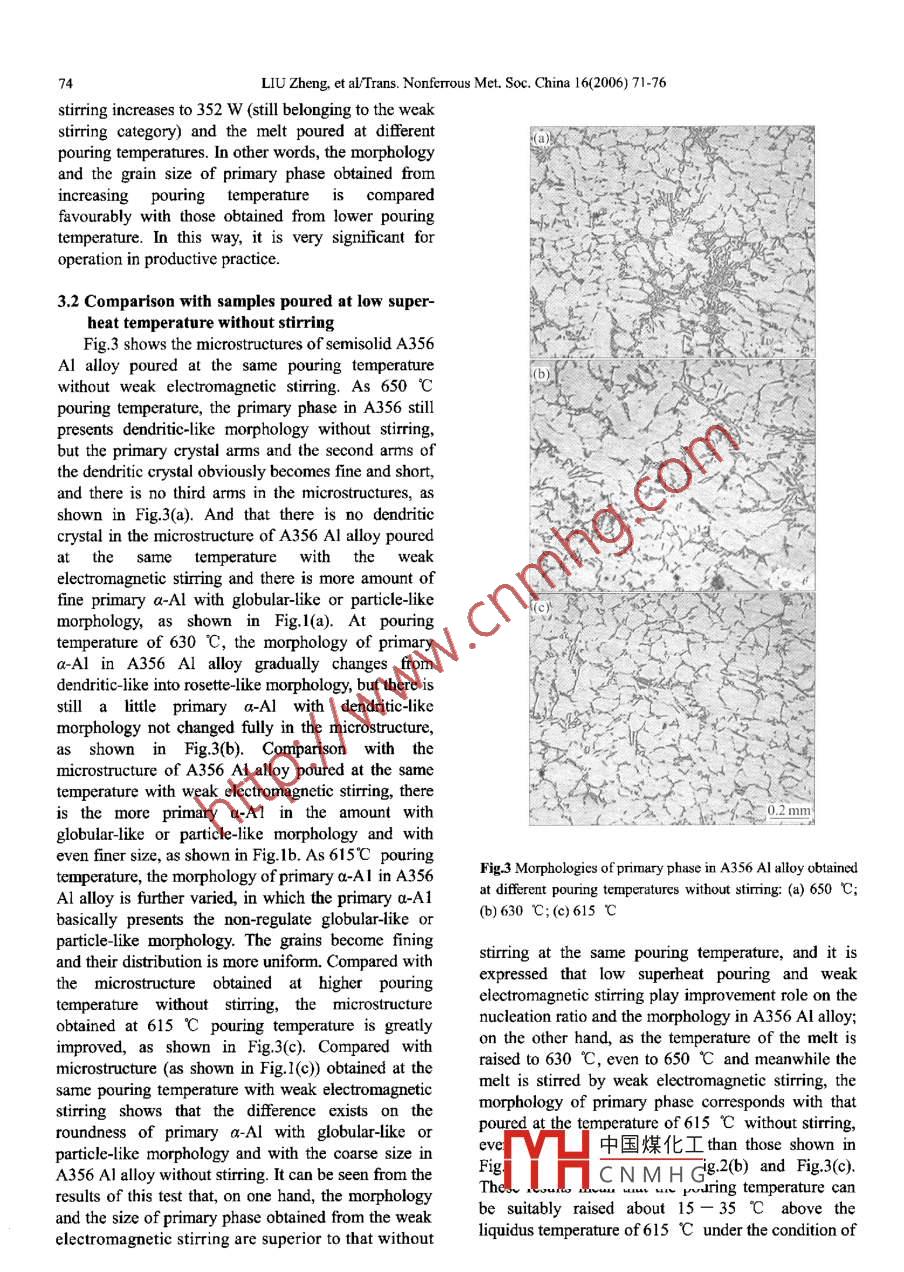 Available online at www.sciencedirect.comsCIENGE @)DIRECT'Transactions ofNonferrous Metals罵Society of ChinaScienceTrans. Nonferrous Met. Soc. China 16(2006) 71-76Presswww.csu.cdu.cn/ysxb/Effect of pouring temperature on semi-solid slurry ofA356 Al alloy prepared by weak electromagnetic stirringLIU Zheng(劉政).2, MAO Wei-min(毛衛(wèi)民),ZHAO Zheng duo(趙振鐸)'1. School of Materials Science and Engineering, University of Science and Technology Bijing,Beijing 100083, China;2. Faculty of Material and Chemical Engineering, Jiangxi University of Science and Technology,Ganzhou 341000, ChinaReceived 10 May 2005; accepted 15 September 2005Abstract: The semi-solid slury of A356 Al alloy was manufactured by low superheat pouring and weak electromagnetic stiring. Theeffects of pouring temperature on the slurry manufactured by weak electromagnctic stirring were researched. The results indicate that itis feasible to manufacture the slurry with particle-like primary phases by low superheat pouring and weak electromagnetic stiring, andthere is an important efct of the pouring temperature (superheat temperature) on the morphology and the size of primary a-AI in A356Al aloy. By the action of suitable weak electromagnetic stiring, increasing pouring temperature to put low superheat pouring in practiceis capable of obtaining semi-solid slurry of A356 Al alloy with particle-like primary phase. Compared with the samples made only bylow superheat pouring without stiring, raising pouring temperature by 15- :35 C above the liquidus temperature under condition ofweak electromagnetic stirring can ensure the same grain size and morphology of the primary phase.Key words: A356 Al aloy; semi-solid slurry; low superheat pouring; weak electromagnetic stiringof the a-Al phase, when they studied the evolution of1 Introductionmicrostructure in A356 Al alloy prepared by NRCprocessing. To obtain the semi-solid slurry to satisfyThe rheo-forming has been paid more attention tortheo forming, the pouring temperature and coolingduring the preparation of semi-solid metals to saverate of liquid alloy[4, 8, 9] are strictly controlled or thecost. In recent years, some of the new technologies,melt is held at the solid-liquid phase area[ 10] to ensuresuch as controlled nucleation method[1], controllingthe morphology of primary phase, or the alloy iscrystal method[2], liquidus casting[3], Nano casting[4],reheated again to the solid-liquid area to hold somecame forth. These new technologies are all based upontime[11]. In this way, the primary phase particle withcontrolling pouring temperature or ultilizing lowsound morphology is obtained, but it is difficult topouring temperature to control the morphology ofoperate in practice. On the basis of keeping thesolid particle, and results in fine grain size oreconomics of low temperature pouring technology, itimproved grain morphology[5]. .is very significant that the pouring temperature isBut the morphology of primary phase must besuitably raised so that the low temperature pouring isstrictly controlled if the semi-solid slurry prepared byconveniently operated. Based on the long-timelow temperature pouring is directly used to rheoresearches on SSM, the authors of this paper develop aforming because the morphology of primary phase innew technology- -low superheat pouring and weakthe slurry used to thixo forming can be improved byelectromagnetic stirring. The liquid aluminum alloythe remediation of the succedent reheating process[6].poured at low superheat is stirred for a short time by aSome research[7] reported that the final microstructuresimp中國(guó)煤化工equipment to realizewas very sensitive to the superheat of melt and lowtheenergy consumption,pouring temperatures promote spheroidal morphologyYHC N M H G increasing workingFoundation item: Project (G2002AA336080) suppurted by Hi-tech Research and Developmnent Program of China; Projeet (50374012) supported by theNational Natural Science Foundation of ChinaCorrespondence: MAO Wei-min; Tcl: +86- 10-62332882; E-mail: weiminmnao@ 263.net72LIU Zheng, et al/Trans. Nonferrous Met. Soc. China 16(2006) 71-76efficiency and ensuring the quality of slurry. Theffect of pouring temperature on the semi-solid slurryof A356 Al alloy under the condition of weakelectromagnetic stirring is studied in this paper.2 ExperimentalA356 Al alloy, as a kind of hypoeutectic Al-Sialloy, is extensively used to semisolid processingbecause of the wider solid-liquid range and goodfluidity. A356 Al alloy was used to study low superheatpouring and weak electro- magnetic stiring in this test.The composition of A356 was 7.46 Si, 0.49Mg andbalance Al.bThe liqudus temperature of A356 Al alloy isdetermined as 615.3 C by DTA. A356 Al alloy ismelted in an electric resistance fumnace. The meltingtemperature is 700 C. The mould, a cylinder made ofstainless steel with 102 mm in diameter and 220 mm indepth, is placed in an electromagnetic stirrer.During electromagnetic stirring liquid alloy, thestirring force is an important factor to present the qualityof slurry, but the actual stirring force is difficult tomeasure in practice. In this test, the stirring power isindirectly represented as the stirring force because(Cseveral of stirring power can be gotten to adjust theinput voltage of the stirrer at the same currentfrequency.To research the effect of pouring temperature onA356 Al alloy stirred by weak electromagnetic stirring,the pouring temperature is determined as 650, 630 and615 C.When liquid A356 Al alloy is prepared andpoured into the mould at the set temperature, the stirreris started and weakly stirs the liquid alloy at the samestirring power for a short time, respectively. Then the0.2 mmmould is quenched in order to maintain the structurestirred.Fig.1 Morphologies of primary phase in A356 Al alloy obtainedTo check the efect of weak electromagneticat different pouring temperatures (tirring power is 136 W): (田)stirring on low superheat pouring A356 Al alloy, t