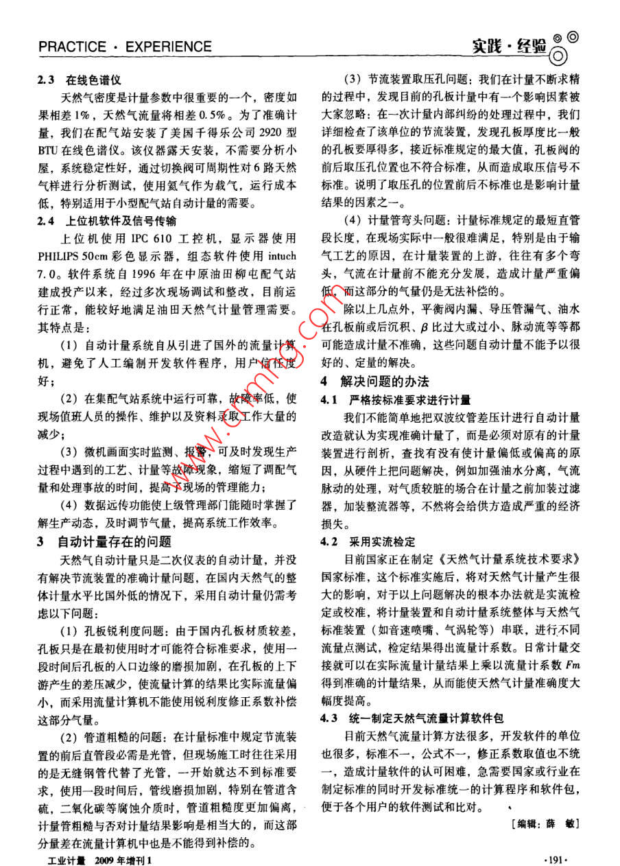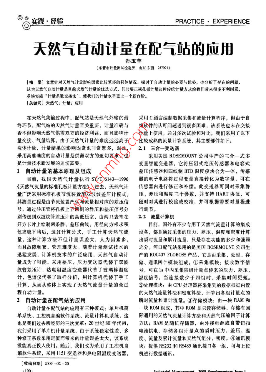只實踐·經(jīng)PRACTICE· EXPERIENCE天然氣自動計量在配氣站的應用孫玉蘋(東營市計量測試檢定所,山東東營257091)摘要]文章針對天然氣計量影響因素比較繁多的具體情況,探討了自動計量的必要與優(yōu)勢,也分析了存在的問題認為天然氣自動計量是目前天然氣計量的優(yōu)選方式,同時要正視孔板計量這種傳統(tǒng)計量方式給我們帶來很多不利因素,盡快實施“計量系數(shù)交接法”,使我們的計量水平更上一個新臺階。[關鍵詞]天然氣;計量;應用在天然氣集輸過程中,配氣站是天然氣外輸?shù)淖畈捎肅語言編制數(shù)據(jù)采集和流量計算程序,但由于自終環(huán)節(jié),配氣站的天然氣計量至關重要,計量準確與編軟件的認可問題遇到很多困難,該系統(tǒng)也未在交接否不但影響天然氣供需雙方的經(jīng)濟利益,而且影響計計量上使用。通過多次試驗和對比,我們采用了以下量交接、氣量結算。由于天然氣計量的難度遠遠高于比較成熟的流量計算系統(tǒng),其主要部件如下:液體計量,計量結果的影響因素也非常繁多,因此,2.1三合一變送器采用高準確度的自動計量是供需雙方的迫切要求,也采用美國 ROSEMOUNT公司生產(chǎn)的三合一式多是計量技術新發(fā)展的迫切需要。變量智能變送器,它將壓阻式絕壓傳感器和電容式1自動計量的基本原理及組成差壓傳感器和四線制RTD溫度模塊合為一體,傳感目前,我國天然氣計量執(zhí)行SYT6143-196器的電子電路將過程變量直接轉化為數(shù)字量,可在《天然氣流量的標準孔板計量方法》,過去,天然氣計傳感器內(nèi)進行修正和補償。此變送器可同時采集靜量廣泛采用標準孔板節(jié)流裝置配雙波紋差壓計模式。壓、差壓和溫度三個參數(shù),并支持HART協(xié)議,可其測量過程是由節(jié)流裝置產(chǎn)生與流量相對應的差壓信隨時對其進行校驗或校準,并可根據(jù)需要對量程進號,通過導壓管將孔板上下兩側的靜壓和差壓信號分行調(diào)節(jié)。別傳送到雙波紋管差壓計的高低壓室,由兩只表筆在2.2流量計算機開方卡片上繪制兩條靜、差壓曲線。用徑向方根求積目前,國外有不少專用于天然氣流量計算的集成儀求取平均后,通過計算公式,手工計算天然氣流設備,都是通過采集的壓力、差壓、溫度和密度計算量,這種計算方法不但計量誤差大,人為因素多,出瞬時流量和累計流量,只是存在功能的多少和強弱而且故障頻繁,管理難度大。隨著計量測試技術的之分。河口配氣站采用的是美國 ROSEMOUNT公司生迅猛發(fā)展,計算機技術的廣泛應用,天然氣自動計產(chǎn)的R0C407 FLOBOSS產(chǎn)品,它是由采集、處理、存量成為了可能,采用差壓、壓力變送器代替了雙波儲、通訊四個模塊組成。①采集模塊:接收數(shù)字信紋管差壓計,熱電阻溫度變送器代替了玻璃棒溫度號,可在1s中內(nèi)采集四組計量點傳來的壓力、差壓計,色譜儀代替了取樣分析,用計算機代替了手工溫度信號,當連接數(shù)少于四組時,采集時間更短。計算,從而從整體上實現(xiàn)了天然氣流量計量的全過②處理模塊:由CPU處理器將采集到的數(shù)據(jù)根據(jù)內(nèi)置程自動計量。的天然氣流量算法和密度算法,計算出各組計量點的2自動計量在配氣站的應用瞬時流量和累計流量。③存儲模塊:由一塊RAM和自動計量在配氣站的應用有三種模式:單片機簡塊ROM組成,其中ROM是只讀存儲器,存儲有國單系統(tǒng)、工控機自編軟件系統(tǒng)、流量計算機系統(tǒng),這際通用的天然氣流量計算方法和天然氣壓縮因子計算也是我們過去所經(jīng)歷的三次變革:20世紀80年代初,方法;RAM是隨機存儲器,由外接電源或自帶鈕扣我們采用了單片機計量系統(tǒng),由于系統(tǒng)穩(wěn)定性差、多電池供電,存儲各組計量點的瞬時壓力、差壓、溫種修正系數(shù)采用定值而帶來的計量誤差太大,該系統(tǒng)度、流量及累計流量和天然氣組分、密度。④通訊模沒能真正投入使用。隨后,我們改為采用了工控機自塊:提供RS232和RS485通訊接口各一組,可與上位編軟件系統(tǒng),采用1151變送器和熱電阻溫度變送器,機進行數(shù)據(jù)通訊。[收稿日期]2009-02-20PRACTICE· EXPERIENCE實踐·經(jīng)驗2.3在線色譜儀3)節(jié)流裝置取壓孔問題:我們在計量不斷求精天然氣密度是計量參數(shù)中很重要的一個,密度如的過程中,發(fā)現(xiàn)目前的孔板計量中有一個影響因素被果相差1%,天然氣流量將相差0.5%。為了準確計大家忽略:在一次計量內(nèi)部糾紛的處理過程中,我們量,我們在配氣站安裝了美國千得樂公司2920型詳細檢查了該單位的節(jié)流裝置,發(fā)現(xiàn)孔板厚度比一般BTU在線色譜儀。該儀器露天安裝,不需要分析小的孔板要厚得多,接近標準規(guī)定的最大值,孔板閥的屋,系統(tǒng)穩(wěn)定性好,通過切換閥可周期性對6路天然前后取壓孔位置也不符合標準,從而造成取壓信號不氣樣進行分析測試,使用氦氣作為載氣,運行成本標準。說明了取壓孔的位置前后不標準也是影響計量低,特別適用于小型配氣站自動計量的需要。結果的因素之2.4上位機軟件及信號傳輸(4)計量管彎頭問題:計量標準規(guī)定的最短直管上位機使用IPC610工控機,顯示器使用段長度,在現(xiàn)場實際中一般很難滿足,特別是由于輸PHILIPS50cm彩色顯示器,組態(tài)軟件使用 intech氣工藝的原因,在計量裝置的上游,往往有多個彎7.