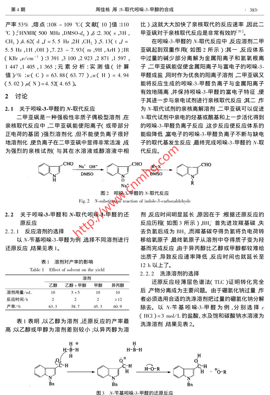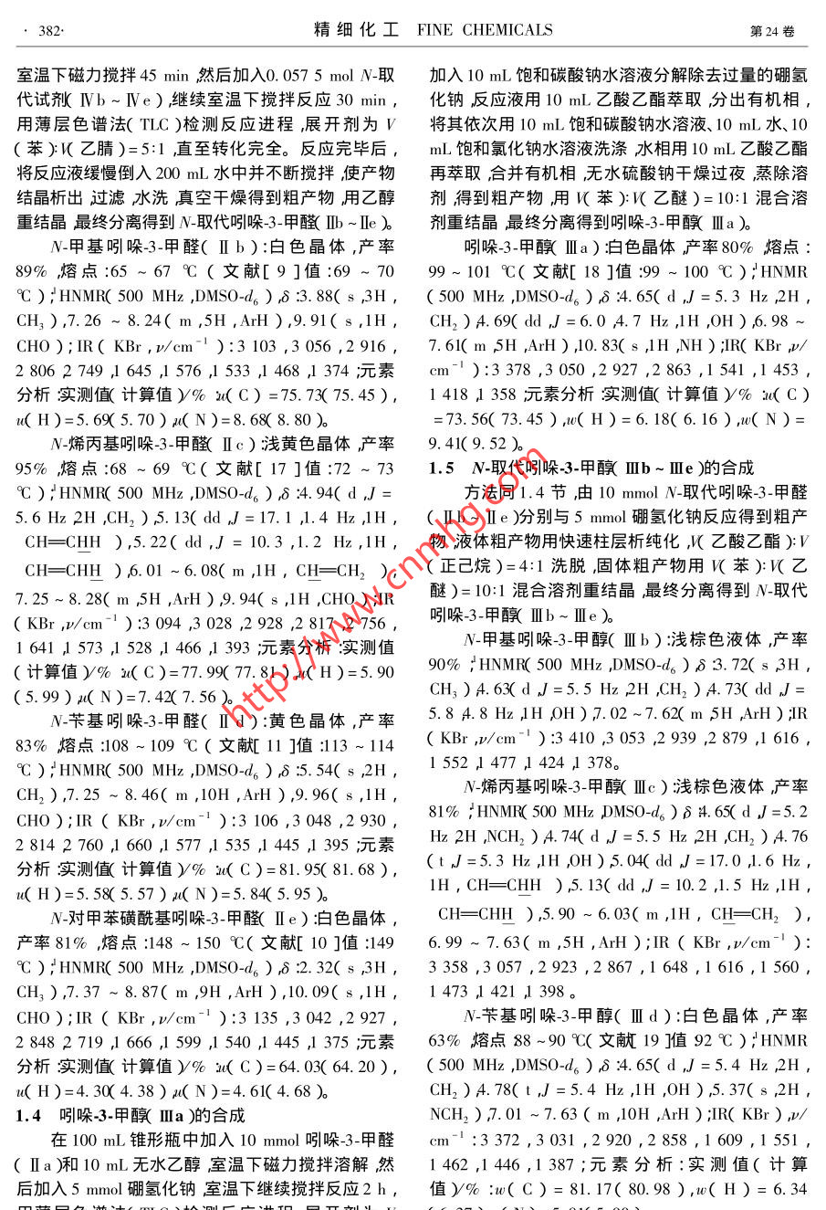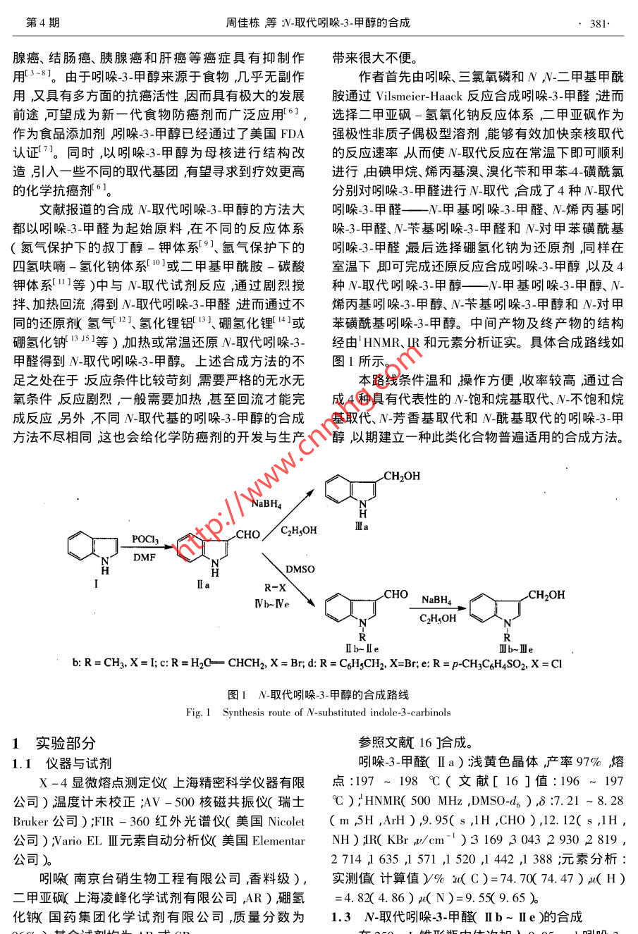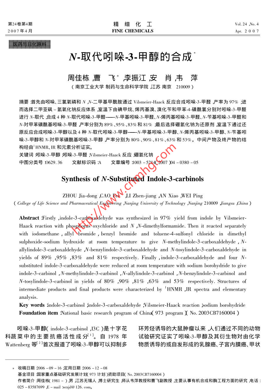 第24卷第4期精細(xì)化工Vol.24 ,No. 4.2007年4月FINE CHEMICALS .Apr. 2007N-取代吲哚-3-甲醇的合成周佳棟,曹飛*李振江安肖韋萍(南京工業(yè)大學(xué)制藥與生命科學(xué)學(xué)院江蘇南京210009 )摘要首先由吲哚、三氯氧磷和N ,N-二甲基甲酰胺通過Vilsmeier-Haack反應(yīng)合成吲哚-3-甲醛產(chǎn)率為97%進(jìn)而選擇二甲亞砜-氫氧化鈉反應(yīng)體系室溫下由碘甲烷、烯丙基溴、溴化芐和甲苯4~磺酰氯分別對(duì)吲哚-3-甲醛進(jìn)行N_取代合成4種N-取代吲哚3~甲醛一N 甲基吲哚~3-甲醛、N烯丙基吲哚3-甲醛、N-芐基吲哚3-甲醛和N_對(duì)甲苯磺?;胚?3-甲醛產(chǎn)率分別為89%, 95%、83%和81% ;最后選擇硼氫化鈉為還原劑室溫下通過還原反應(yīng)合成吲哚-3-甲醇以及4種N_取代吲哚-3-甲醇一N- 甲基吲哚3~甲醇N~烯丙基吲哚3~甲醇、N_芐基吲哚3-甲醇和N-對(duì)甲苯磺酰基吲哚-3~甲醇產(chǎn)率分別為80%、90%、81%、63%和53%。中間產(chǎn)物及終產(chǎn)物的結(jié)構(gòu)經(jīng)由' HMR、IR和元素分析證實(shí)。關(guān)鍵詞吲哚-3-甲醇吲哚3-甲醛;Vilsmeier Haack反應(yīng)棚氫化鈉中圖分類號(hào):0629. 36文獻(xiàn)標(biāo)識(shí)碼:A文章編號(hào):1003 - 5214( 2007 )04 -0380 -05Synthesis of N-Substituted Indole-3-carbinolsZHOU Jia-dong CAO Fei* LI Zhen-jiang AN Xiao ,WEI Ping( College of Life Science and Phrmaceutical Engineering Nanjing University of Technology ,Nanjing 210009 ,Jiangsu China )Abstract :F irstly ,indole-3 -carboxaldehyde was synthesized in 97% yield from indole by Vilsmeier-Haack reaction with phosphorus oxychloride and N ,N-dimethylformamide. Then it reacted separatelywith iodomethane , allyl bromide , benzyl bromide and toluene-4-sulfonyl chloride in dimethylsulphoxide-sodium hydroxide at room temperature to give N-methylindole-3 -carboxaldehyde , N-allylindole-3-carboxaldehyde ,N-benzylindole-3 -carboxaldehyde and N-tosylindole-3-carboxaldehyde inyields of 89% ,95% ,83% and 81% respectively. Finally , indole-3 -carboxaldehyde and four N-substituted indole-3 -carboxaldehyde were reduced at room temperature with sodium borohydride to giveindole-3-carbinol ,N-methylindole-3 -carbinol ,N-allylindole-3-carbinol ,N-benzylindole-3 -carbinol andN-tosylindole-3-carbinol in yields of 80% ,90% ,81% ,63% and 53% respectively. Structures olintermediate products and final products were characterized by' HNMR ,IR spectra and elementaryanalysis.Key words :indole-3 -carbinol ,indole 3 -carboxaldehyde ;V ilsmeier-Haack reaction sodium borohydrideFoundation item :National basic research program of China( 973 program X No.2003CB7160004 )吲哚-3-甲醇( indole-3-carbinol ,I3C )是十字花環(huán)芳烴誘導(dǎo)的大鼠腫瘤以來人們通過不同的動(dòng)物科蔬菜中的主要抗癌活性成分1。自1978年試驗(yàn)研究證實(shí)了吲哚-3-甲醇及其衍生物對(duì)由化學(xué)Wattenberg等2]首次報(bào)道了吲哚-3-甲醇可以抑制多物質(zhì)誘導(dǎo)的或自發(fā)形成的乳腺癌、子宮內(nèi)膜癌、甲狀*收稿日期2006 -09- 16定用日期2006 -12 -08基金項(xiàng)目國(guó)家重點(diǎn)基礎(chǔ)研究發(fā)展計(jì)戈劃973計(jì)劃)資助項(xiàng)目( No. 2003CB7160004 )作者簡(jiǎn)介周佳棟( 1981 - )男江蘇無錫人博士研究生師從韋萍教授和曹飛副教授主要從事有機(jī)合成和酶工程方面的研究電話:025 - 83587699 E - mail swrzjd@ 126. com。.聯(lián)系人:曹飛1975- )男河南洛陽(yáng)人副教授博士主要從事生物化工方面的研究電話025 - 83587699 E - mail xesaofeiw @ eyou.com。第4期周佳棟等:N-取代吲哚-3-甲醇的合成381.腺癌、結(jié)腸癌、胰腺癌和肝癌等癌癥具有抑制作帶來很大不便。用3-8。由于吲哚-3-甲醇來源于食物幾乎無副怍作者首先由吲哚、三氯氧磷和NN-二甲基甲酰用,又具有多方面的抗癌活性,因而具有極大的發(fā)展胺通過Vilsmeier-Haack反應(yīng)合成吲哚-3-甲醛進(jìn)而前途,可望成為新一代食物防癌劑而廣泛應(yīng)用[6],選擇二甲亞砜-氫氧化鈉反應(yīng)體系二甲亞砜作為作為食品添加劑吲哚-3_甲醇已經(jīng)通過了美國(guó)FDA強(qiáng)極性非質(zhì)子偶極型溶劑,能夠有效加快親核取代認(rèn)證7。同時(shí),以吲哚-3_甲醇為母核進(jìn)行結(jié)構(gòu)改的反應(yīng)速率,從而使N_取代反應(yīng)在常溫下即可順利造引入一些不同的取代基團(tuán)有望尋求到療效更高進(jìn)行,由碘甲烷、烯丙基溴、溴化芐和甲苯4-磺酰氯的化學(xué)抗癌劑61。分別對(duì)吲哚-3-甲醛進(jìn)行N-取代合成了4種IN-取代文獻(xiàn)報(bào)道的合成N-取代吲哚-3_甲醇的方法大吲哚-3-甲醛一-N-甲 基吲哚-3-甲醛、N_烯丙基吲都以吲哚-3-甲醛為起始原料,在不同的反應(yīng)體系哚-3-甲醛、N-_芐基吲哚3-甲醛和N_對(duì)甲苯磺?;?氮?dú)獗Wo(hù)下的叔丁醇-鉀體系9]、氬氣保護(hù)下的吲哚-3-甲醛最后選擇硼氫化鈉為還原劑同樣在四氫呋喃-氫化鈉體系0]或二甲基甲酰胺-碳酸室溫下,即可完成還原反應(yīng)合成吲哚-3-甲醇,以及4鉀體系["]等)中與N_取代試劑反應(yīng),通過劇烈攪種N-取代吲哚-3-甲醇一-N-甲 基吲哚-3-甲醇、N-拌、加熱回流得到N-取代吲哚-3~甲醛進(jìn)而通過不烯丙基吲哚-3-甲醇、N-芐基吲哚-3-甲醇和N-對(duì)甲同的還原劑氫氣21、氫化鋰鋁[13]、硼氫化鋰14]或苯磺?;胚?3-甲醇。中間產(chǎn)物及終產(chǎn)物的結(jié)構(gòu)硼氫化鈉13.5]等)加熱或常溫還原N-取代吲哚3-經(jīng)由'HNMR、IR和元素分析證實(shí)。具體合成路線如甲醛得到N-取代吲哚-3-甲醇。.上 述合成方法的不圖1所示。足之處在于:反
