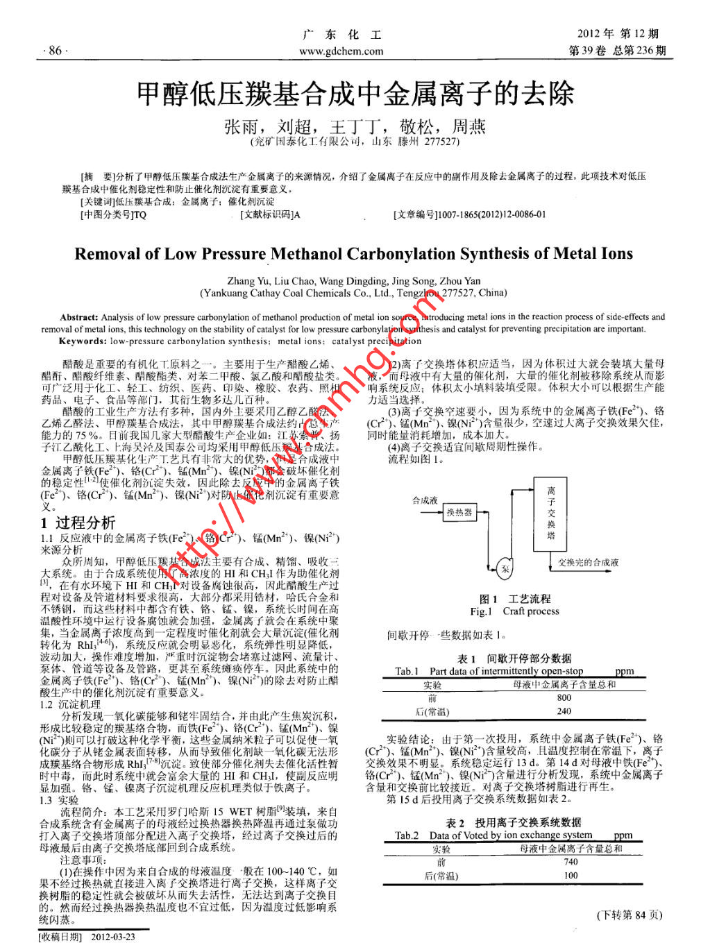 廣東化工2012年第12期. 86.www.gdchem.com第39卷總第236期甲醇低壓羰基合成中金屬離子的去除張雨,劉超,王丁丁,敬松,周燕(究礦國泰化工有限公司,山東滕州277527)[摘要]分析了 甲醇低壓羰基合成法生產(chǎn)金屬離子的來源情況,介紹了金屬離子在反應(yīng)中的副作用及除去金屬離子的過程,此項(xiàng)技術(shù)對(duì)低壓羰基合成中催化劑穩(wěn)定性和防止催化劑沉淀有重要意義。[關(guān)鍵間]低壓羰基合成:金屬離子:催化劑沉淀[中圖分類號(hào)]TQ[文獻(xiàn)標(biāo)識(shí)碼]A[文章編號(hào)1007-18652012)120086-01Removal of Low Pressure Methanol Carbonylation Synthesis of Metal IonsZhang Yu, Liu Chao, Wang Dingding, Jing Song. Zhou Yan(Y ankuang Cathay Coal Chemicals Co., Ltd., Tengzhou 277527, China)Abstract: Analysis of low pressure carbonylation of methanol production of metal ion source, introducing metal ions in the reaction process of side ffects andremoval of metal ions, this technology on the stability of catalyst for low pressure carbonylation synthesis and catalyst for preventing precipitation are important.Keywords: low-pressure carbonylation synthesis; metal ions: catalyst precipitation醋酸是重要的有機(jī)化工原料之一。主要用于生產(chǎn)酷酸厶烯、(2)離子交換塔體積應(yīng)適當(dāng),因?yàn)轶w積過大就會(huì)裝填大量母醋酐、醋酸纖維素、醋酸酯類、對(duì)苯二甲酸、氯乙酸和酷酸鹽類。而母液中有大量的催化劑,大量的催化劑被移除系統(tǒng)從而影可廣泛用于化工、輕工、紡織、醫(yī)藥、印染、橡膠、農(nóng)藥、照相響系統(tǒng)反應(yīng):體積太小填料裝填受限。體積大小可以根據(jù)生產(chǎn)能五泛用于化工。紡紙醫(yī)藥印染、橡股啊東藥品、電子、食品等部門,其衍生物多達(dá)幾百種。力適當(dāng)選擇。醋酸的工業(yè)生產(chǎn)方法有多種,國內(nèi)外主要采用乙醇乙醛法、(3)離子交換空速 要小,因?yàn)橄到y(tǒng)中的金屬離子鐵(e2).鉻乙烯乙醛法、甲醇羰基合成法,其中甲醇羰基合成法約占總生產(chǎn)(C2)、錳(Mn2)、鎳(NF )含量很少,空速過人離子交換效果欠佳,能力的75%。日前我國幾家大型醋酸生產(chǎn)企業(yè)如:江蘇索晉、揚(yáng)同時(shí)能量消耗增加,子江乙?;?、上海吳涇及國泰公司均采用甲醇低壓羰基合成法。(4)離子交換適宜間歇周期性操作。甲醇 低壓羰基化生產(chǎn)T藝具有非常大的優(yōu)勢(shì),但是合成液中流程如圖1.金屬離子鐵(Fe2)、 鉻(C2)、錳(Mn2)、鎳(N? )都會(huì)破壞催化劑的穩(wěn)定性12)使催化劑沉淀失效,因此除去反應(yīng)中的金屬離子鐵離(Fe的)、鉻(C2")、 錳(Mn2)、鎳(Ni2 ")對(duì)防止催化劑沉淀有重要意合成液一一換熱器 ]交1過程分析換1.1反應(yīng)液中的金屬離子鐵(Fe2)、鉻(C2)、錳(Mn2*)、 鎳(Ni")來源分析眾所周知,甲醇低壓羰基合成法主要有合成、精餾、吸收三,父換完的合成液大系統(tǒng)。由于合成系統(tǒng)使用了高濃度的HI和CH;I作為助催化劑0可,在有水環(huán)境下HI和CHI對(duì)設(shè)備腐蝕很高,因此醋酸生產(chǎn)過程對(duì)設(shè)備及管道材料要求很高,大部分都采用鋯材,哈氏合金和圖1工藝流程不銹鋼,而這些材料中都含有鐵、鉻、錳、鎳,系統(tǒng)長(zhǎng)時(shí)間在高Fig.l Craft process溫酸性環(huán)境中運(yùn)行設(shè)備腐蝕就會(huì)加強(qiáng),金屬離子就會(huì)在系統(tǒng)中集,當(dāng)金屬離子濃度高到一定程度時(shí)催化劑就會(huì)大最沉淀(催化劑間歇開停一些數(shù)據(jù)如表1。轉(zhuǎn)化為Rhi,146), 系統(tǒng)反應(yīng)就會(huì)明顯悲化,系統(tǒng)彈性明顯降低,波動(dòng)加大,操作難度增加,嚴(yán)重時(shí)沉淀物會(huì)堵塞過濾網(wǎng)、流量計(jì)、表1間歇開停部分?jǐn)?shù)據(jù)泵體、管道等設(shè)備及管路,更甚至系統(tǒng)癱瘓停車。因此系統(tǒng)中的Tab.1 Part data of intermittently open-stopppm金屬離子鐵(Fe2)、鉻(Cr2)、錳(Mn2)、 鎳(Ni?*)的除 去對(duì)防止醋實(shí)驗(yàn)?zāi)敢褐薪饘匐x子含量總酸生產(chǎn)中的催化劑沉淀有重要意義。8001.2沉淀機(jī)理分析發(fā)現(xiàn)一氧化碳能夠和銠牢固結(jié)合,并由此產(chǎn)生焦炭沉積,石(常溫)240形成比較穩(wěn)定的羰基絡(luò)合物,而鐵(Fe2)、 鉻(Cr2)、 錳(Mn2)、 鎳(Ni2)則可以打破這種化學(xué)平衡,這些金屬納米粒子可以促使一一拿實(shí)驗(yàn)結(jié)論:由于第一次投用,系統(tǒng)中金屬離子鐵(Fe2)、鉻化碳分子從銠金屬表面轉(zhuǎn)移,從而導(dǎo)致催化劑缺-氧化碳無法形(Cr2)、錳(Mn2)、鎳(Ni*)含量較高, 且溫度控制在常溫下,離子成羰基絡(luò)合物形成RhI/78|沉淀。致使部分催化劑失去催化活性暫交換效果不明顯。系統(tǒng)穩(wěn)定運(yùn)行13d。第14d對(duì)母液中鐵(Fe2)、時(shí)中毒,而此時(shí)系統(tǒng)中就會(huì)富余大量的HI和CH3I,使副反應(yīng)明鉻(C2)、錳(Mn2).鎳QNit)含 量進(jìn)行分析發(fā)現(xiàn),系統(tǒng)中金屬離子顯加強(qiáng)。鉻、錳、鎳離子沉淀機(jī)理反應(yīng)機(jī)理類似于鐵離子。加強(qiáng)。含量和交換前比較接近。對(duì)離子交換塔樹脂進(jìn)行再生。1.3實(shí)驗(yàn)第15 d后投用離子交換系統(tǒng)數(shù)據(jù)如表2。流程簡(jiǎn)介: 本工藝采用羅門哈斯15 WET樹脂|0]裝填,來自合成系統(tǒng)含有金屬離子的母液經(jīng)過換熱器換熱降溫再通過泵做功表2投用離子交換系統(tǒng)數(shù)據(jù)打入離子交換塔頂