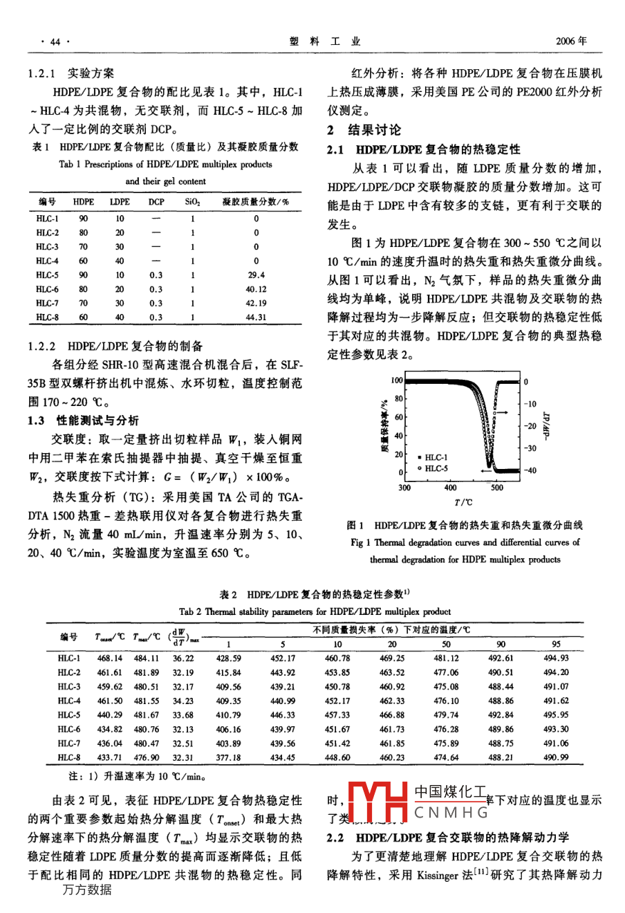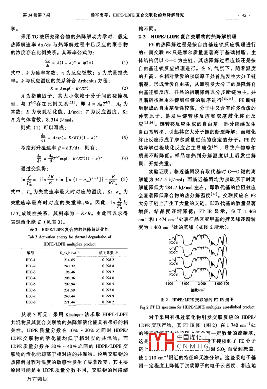 第34卷第7期塑料工業(yè)2006年7月CHINA PLASTICS INDUSTRY43HDPE/LDPE復(fù)合交聯(lián)物的熱降解研究楊軍忠,劉偉,景振華,王軍2,王延偉2(1.石油化工科學(xué)研究院,北京100863;2.中國(guó)石化洛陽(yáng)分公司,河南洛陽(yáng)471012)摘要:采用熱重分析儀(TG)考察了高密度聚乙烯(HDE)/低密度聚乙烯(LDPE)復(fù)合交聯(lián)物的熱穩(wěn)定性。結(jié)果顯示,HDE/IDPE復(fù)合交聯(lián)物的熱穩(wěn)定性低于HDPE/①DPE共混物。rTIR分析證實(shí),交聯(lián)反應(yīng)使聚乙烯(PE)的支化程度提高,取代基的位阻效應(yīng)在一定程度上影響了PE的熱降解過(guò)程。在N2氣氛下, HDPE/LDPE共混物及交聯(lián)物的熱降解過(guò)程均為一步降解反應(yīng)。 Kissinger法求解HPE/DPE共混物及其復(fù)合交聯(lián)物的熱降解活化能發(fā)現(xiàn),LDPE質(zhì)量分?jǐn)?shù)在20%~30%之間變化時(shí),HDPE/LDPE交聯(lián)物的熱降解過(guò)程對(duì)溫度的敏感性發(fā)生了突變。關(guān)鍵詞:高密度聚乙烯;低密度聚乙烯;復(fù)合交聯(lián)物;熱降解中圖分類號(hào):TQ325.1+2文獻(xiàn)標(biāo)識(shí)碼:A文章編號(hào):1005-5770(2006)07-0043-04Study on Thermal Degradation of HDPE/LDPE Crosslinked ProductYANG Jun-zhong, LIU Wei, JING Zhen-hua', WANG Jun, WANG Yan-wei(1. Research Institute of Petrochemical Sci. Beijing 100083, China2. Luoyang Subsidiary Company, SINOPEC, Luoyang 471012, China)Abstract: The thermal stability of HDPE/LDPE crosslinked product was studied by means of thermogravimetrnalysis(TGA). The results showed that the thermal stability of HDPE/LDPE crosslinked product was poorer thanthat of HDPE/LDPE blend. The result of FTIR analysis informed that the branch concentration of the crosslinked PEwas increased significantly by crosslinking reaction, their substituted alkyl groups would subsequently effect thewhole degradation of the crosslinked PE. Furthermore, it was found that the thermal degradation reactions forHDPE/LDPE blend and HDPE/LDPE crosslinked products were much more similar and both belong to one-stepmechanism. It was also noticed that the sensitivity to temperature for the thermal stability of HDPE/LDPEcrosslinked products was changed sharply while the amounts of LDPE changed from 20% to 30% in calculating theactivated energy of the blend in thermal degradation by means of Kissinger methodKeywords: HDPE; LDPE; Multiplex Crosslinked Product; Thermal Degradation自從聚乙烯(PE)工業(yè)化以來(lái),研究人員圍繞過(guò)選擇合適的原料配比和合適的交聯(lián)工藝可以獲得微各種牌號(hào)PE進(jìn)行了大量的改性研究和應(yīng)用開(kāi)發(fā)。尤觀結(jié)構(gòu)相對(duì)完善的網(wǎng)絡(luò)交聯(lián)結(jié)構(gòu)0。為全面掌握這其在交聯(lián)PE領(lǐng)域,相繼開(kāi)發(fā)出了硅烷交聯(lián)工藝121、類交聯(lián)物的性能,本文采用熱重分析儀(TGA)和紅過(guò)氧化物交聯(lián)工藝、輻射交聯(lián)工藝3等。由于不需要外分析儀(FTR)研究HDPE/LDPE復(fù)合交聯(lián)物的熱特殊且昂貴的加工設(shè)施,有機(jī)過(guò)氧化物交聯(lián)工藝備受降解特性和熱降解動(dòng)力學(xué),并對(duì)HDE復(fù)合交聯(lián)物的重視,典型的過(guò)氧化物交聯(lián)工藝有 Engel法4]、Poun-熱降解機(jī)理進(jìn)行分析。a' Mousson法、超高頻交聯(lián)技術(shù)6以及德國(guó)cus-1實(shí)驗(yàn)部分tavsberg公司的Az法。國(guó)內(nèi)在有機(jī)過(guò)氧化物交聯(lián)1.1原料PE方面也開(kāi)展了一系列研究8。筆者在研究高密度HDPE:5000S,齊魯石化公司;LDPE:TN26,齊聚乙烯(HDPE)交聯(lián)物的制備過(guò)程中發(fā)現(xiàn),在魯石化公司;引發(fā)劑:DCP,上海高橋石化公司;氣HDPE/DCP交聯(lián)體系中加入低密度聚乙烯(LDPE),相法中國(guó)煤化工可以改善HDPE的交聯(lián)過(guò)程和交聯(lián)物的微觀結(jié)構(gòu),通1.2HHaCNMHG聯(lián)系人010-82368254,liuwei4258cn@sina.com作者簡(jiǎn)介:楊軍忠,男,高級(jí)工程師,博士研究生,主要從事聚烯烴改性研究。44塑料工業(yè)2006年1.2.1實(shí)驗(yàn)方案紅外分析:將各種HDPE/LDPE復(fù)合物在壓膜機(jī)HDPE/IDPE復(fù)合物的配比見(jiàn)表1。其中,HC1上熱壓成薄膜,采用美國(guó)PE公司的PE200紅外分析HLC4為共混物,無(wú)交聯(lián)劑,而HC5~HLC8加儀測(cè)定。人了一定比例的交聯(lián)劑DCP。2結(jié)果討論表1HDPE/LDPE復(fù)合物配比(質(zhì)量比)及其凝膠質(zhì)量分?jǐn)?shù)2,1HDPE/LDPE復(fù)合物的熱穩(wěn)定性Tab l Prescriptions of HDPE/LDPE multiplex products從表1可以看出,隨LDPE質(zhì)量分?jǐn)?shù)的增加and their gel contentHDPE/LDPE/DCP交聯(lián)物凝膠的質(zhì)量分?jǐn)?shù)增加。這可號(hào)HDPE LDPECPSi02凝膠質(zhì)量分?jǐn)?shù)/%能是由于DPE中含有較多的支鏈,更有利于交聯(lián)的HLC-1HIC28020HLC370300000發(fā)生。圖1為HDPE/LDPE復(fù)合物在300~550℃之間以C4604010℃/min的速度升溫時(shí)的熱失重和熱失重微分曲線。HLC-5 90HLC-6 80200.31從圖1可以看出,N2氣氛下,樣品的熱失重微分曲HLC-7 700.342,19線均為單峰,說(shuō)明HDPE/LDPE共混物及交聯(lián)物的熱HLC-80.3降解過(guò)程均為一步降解反應(yīng);但交聯(lián)物的熱穩(wěn)定性低1.2.2HDPE/DPE復(fù)合物的制備于其對(duì)應(yīng)的共混物。HDPE/IDPE復(fù)合物的典型熱穩(wěn)各組分經(jīng)SH10型高速混合機(jī)混合后,在SUF.定性參數(shù)見(jiàn)表2。35B型雙螺桿擠出機(jī)中混煉、水環(huán)切粒,溫度控制范圍170~220℃。13性能測(cè)試與分析交聯(lián)度:取一定量擠出切粒樣品