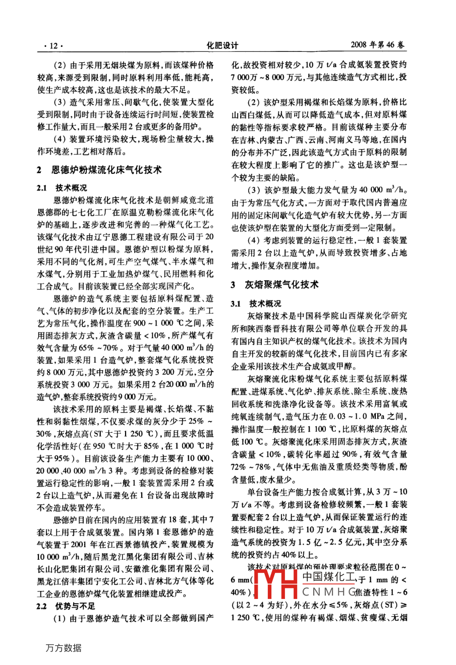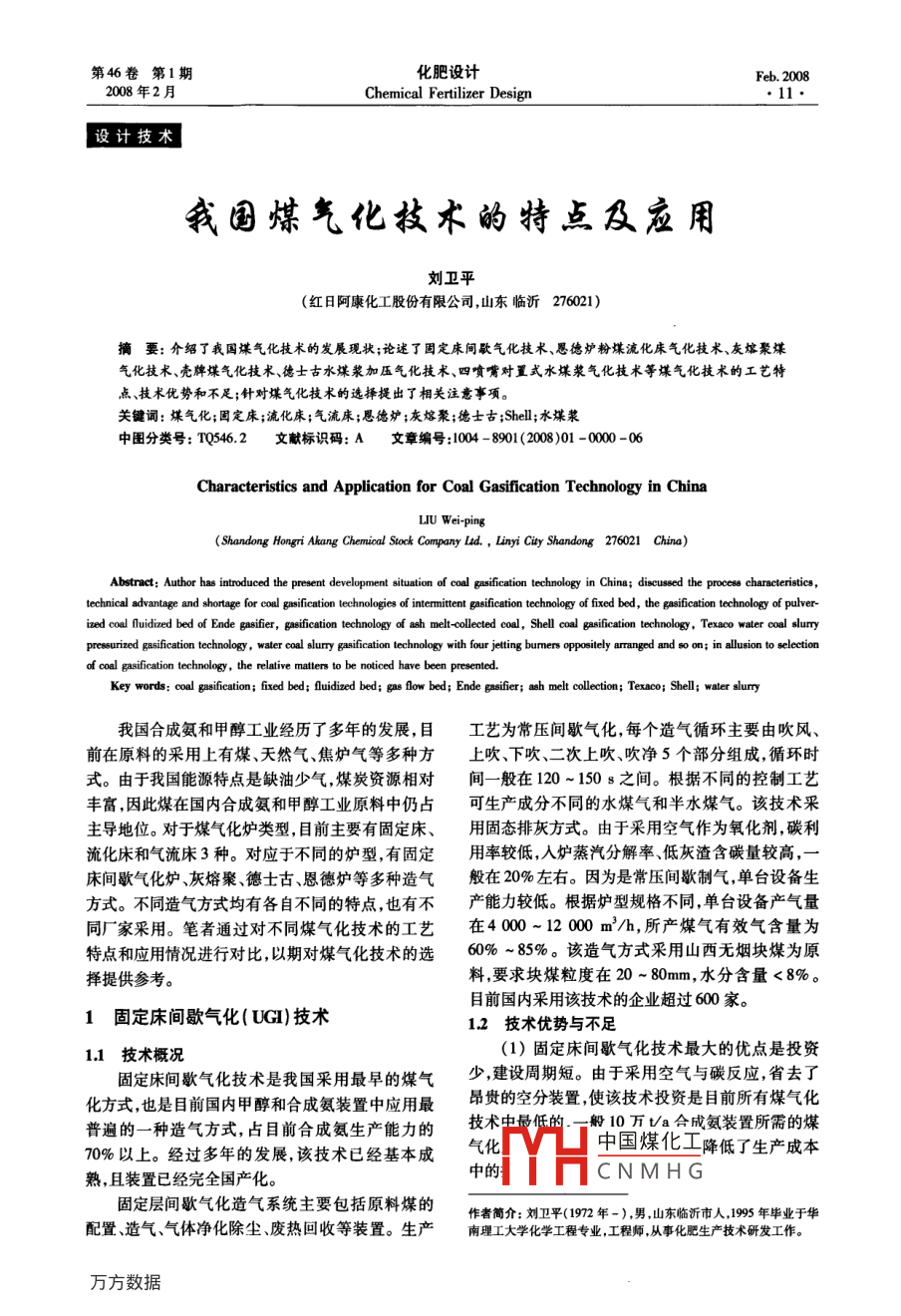 第46卷第1期化肥設(shè)計(jì)Feb.2008008年2月Chemical Fertilizer design設(shè)計(jì)技術(shù)我國(guó)媒氣化技術(shù)的特點(diǎn)及應(yīng)用劉衛(wèi)平(紅日阿康化工股份有限公司,山東臨沂276021)摘要:介紹了我國(guó)煤氣化技術(shù)的發(fā)展現(xiàn)狀;論迷了固定床間歇?dú)饣夹g(shù)、懇德?tīng)t粉煤流化床氣化技術(shù)、灰熔聚煤氣化技術(shù)、殼牌煤氣化技術(shù)、德士古水煤漿加壓氣化技術(shù)、四噴嘴對(duì)置式水煤漿氣化技術(shù)等煤氣化技術(shù)的工藝特點(diǎn)、技術(shù)優(yōu)勢(shì)和不足;針對(duì)煤氣化技術(shù)的選擇提出了相關(guān)注意事項(xiàng)。關(guān)鍵詞:煤氣化;固定床;流化床;氣流床;恩德?tīng)t;灰熔聚;德士古;Shel;水煤漿中圖分類號(hào):TQ546.2文獻(xiàn)標(biāo)識(shí)碼:A文章編號(hào):1004-8901(2008)01-0000-06Characteristics and Application for Coal Gasification Technology in ChinaLIU Wei-pingShandong Hongri Akang Chemical Stock Company Lad, Linyi City Shandong 276021 China)Abstract: Author has introduced the present development situation of coal gasification technology in China; discussed the process characteristicschnical advantage and shortage for coal gasification technologies of intermittent gasification technology of fixed bed, the gasification technology of pulver-coal fluidized bed of Ende gasifier, gasification technology of ash melt-collected coal, Shell coal gasification technology, Texaco water coal slurrypressurized gasification technology, water coal slurry gasification technology with four jetting burners oppositely arranged and so on; in allusion to selectionof coal gasification technology, the relative matters to be noticed have been presented.Key words: coal gasification; fixed bed; fluidized bed; gas flow bed; Ende gasifier; ash melt collection; Texaco; Shell; water slurry我國(guó)合成氨和甲醇工業(yè)經(jīng)歷了多年的發(fā)展,目工藝為常壓間歇?dú)饣?每個(gè)造氣循環(huán)主要由吹風(fēng)前在原料的采用上有煤、天然氣、焦?fàn)t氣等多種方上吹、下吹、二次上吹、吹凈5個(gè)部分組成,循環(huán)時(shí)式。由于我國(guó)能源特點(diǎn)是缺油少氣,煤炭資源相對(duì)間一般在120~150s之間。根據(jù)不同的控制工藝豐富,因此煤在國(guó)內(nèi)合成氨和甲醇工業(yè)原料中仍占可生產(chǎn)成分不同的水煤氣和半水煤氣。該技術(shù)采主導(dǎo)地位。對(duì)于煤氣化爐類型,目前主要有固定床、用固態(tài)排灰方式。由于采用空氣作為氧化劑,碳利流化床和氣流床3種。對(duì)應(yīng)于不同的爐型,有固定用率較低,人爐蒸汽分解率、低灰渣含碳量較高,床間歇?dú)饣癄t、灰熔聚、德士古、恩德?tīng)t等多種造氣般在20%左右。因?yàn)槭浅洪g歇制氣,單臺(tái)設(shè)備生方式。不同造氣方式均有各自不同的特點(diǎn),也有不產(chǎn)能力較低。根據(jù)爐型規(guī)格不同,單臺(tái)設(shè)備產(chǎn)氣量同廠家采用。筆者通過(guò)對(duì)不同煤氣化技術(shù)的工藝在400-1200m3/h,所產(chǎn)煤氣有效氣含量為特點(diǎn)和應(yīng)用情況進(jìn)行對(duì)比,以期對(duì)煤氣化技術(shù)的選60%~85%。該造氣方式采用山西無(wú)煙塊煤為原擇提供參考。料,要求塊煤粒度在20~80mm,水分含量<8%1固定床間歇?dú)饣?UG)技術(shù)目前國(guó)內(nèi)采用該技術(shù)的企業(yè)超過(guò)600家12技術(shù)優(yōu)勢(shì)與不足11技術(shù)概況固定床間歇?dú)饣夹g(shù)最大的優(yōu)點(diǎn)是投資固定床間歇?dú)饣夹g(shù)是我國(guó)采用最早的煤氣少,建設(shè)周期短。由于采用空氣與碳反應(yīng),省去了化方式也是目前國(guó)內(nèi)甲醇和合成氨裝置中應(yīng)用最昂貴的空分裝置,使該技術(shù)投資是目前所有煤氣化普遍的一種造氣方式占目前合成氨生產(chǎn)能力的技術(shù)中量低的般10萬(wàn)Ma合成氨裝置所需的煤70%以上,經(jīng)過(guò)多年的發(fā)展該技術(shù)巳經(jīng)基本成氣化中國(guó)煤化工降低了生產(chǎn)成本熟,且裝置已經(jīng)完全國(guó)產(chǎn)化。中的CNMHG固定層間歇?dú)饣鞖庀到y(tǒng)主要包括原料煤的作者簡(jiǎn)介:劉衛(wèi)平(1972年-),男,山東臨沂市人,199年畢業(yè)于華配置造氣、氣體凈化除塵廢熱回收等裝置。生產(chǎn)南理工大學(xué)化學(xué)工程專業(yè),工程師從事化肥生產(chǎn)技術(shù)研發(fā)工作化肥設(shè)計(jì)208年第46卷(2)由于采用無(wú)煙塊煤為原料,而該煤種價(jià)格化故投資相對(duì)較少,10萬(wàn)ta合成氨裝置投資約較高,來(lái)源受到限制,同時(shí)原料利用率低,能耗高,7000萬(wàn)~8000萬(wàn)元,與其他連續(xù)造氣方式相比,投使生產(chǎn)成本較高,這也是該技術(shù)的最大不足資較低。(3)造氣采用常壓、間歇?dú)饣?使裝置大型化(2)該爐型采用褐煤和長(zhǎng)焰煤為原料,價(jià)格比受到限制,同時(shí)由于設(shè)備連續(xù)運(yùn)行時(shí)間短,使裝置檢山西白煤低,從而可以降低造氣成本,但對(duì)原料煤修工作量大而且一般采用2臺(tái)或更多的備用爐。的黏性等指標(biāo)要求較嚴(yán)格。目前該煤種主要分布4)裝置環(huán)境污染較大,現(xiàn)場(chǎng)粉塵量較大,操在吉林、內(nèi)蒙古廣西、云南河南義馬等地,在國(guó)內(nèi)作環(huán)境差,工藝相對(duì)落后。的分布并不廣泛,因此該造氣方式由于原料的限制2恩德?tīng)t粉煤流化床氣化技術(shù)在較大程度上影響了它的推廣。這也是該爐型個(gè)