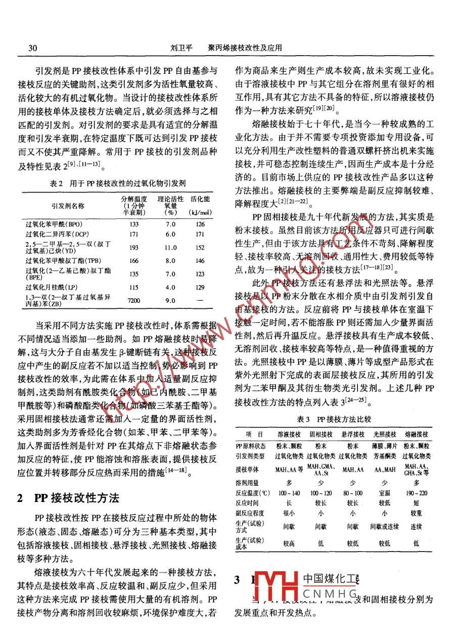 №2(Sum.142)塑料科技March 2001PLASTICS SCI. TECHNOLOG文章編號(hào):1005360(2001)-02002904聚丙烯接枝改性及應(yīng)用劉衛(wèi)平(岳陽(yáng)石油化工總廠研究院,湖南岳陽(yáng)414014)摘要:綜述了聚丙烯接枝改性體系的組成、接枝改性的各種方法與技術(shù)進(jìn)展,并介紹了聚丙烯接枝改性產(chǎn)品應(yīng)用狀況。關(guān)鍵詞:聚丙烯;接枝;改性中圖法分類號(hào):TQ325.1+5文獻(xiàn)標(biāo)識(shí)碼:AgM)M為接枝單體140前言PP接枝改性體系由基礎(chǔ)樹(shù)脂PP、接枝單體、引發(fā)聚丙烯(P)作為當(dāng)今最重要的通用塑料之一,自劑及其它助劑構(gòu)成。P可選擇均聚級(jí)也可選擇共聚五十年代中后期實(shí)現(xiàn)工業(yè)化生產(chǎn)以來(lái)已有四十多年的級(jí),可選擇P粒料也可選擇P粉料。一般選擇適當(dāng)歷史。由于PP具有吸水吸濕低、耐應(yīng)力開(kāi)裂耐疲勞粒徑的P粉料更有利于接枝改性,這是因?yàn)槭沟肞P屈服、電氣絕緣性優(yōu)異、化學(xué)穩(wěn)定性良好等特性,加之更易與體系中其它組分有最大的接觸面積,從而使少其密度小、易加工成型、成本低廉等因素,使得P在日量的接枝單體及引發(fā)劑獲得良好的分散狀態(tài),有利于常用品包裝材料家用電器汽車工業(yè)建筑施工等行產(chǎn)品質(zhì)量的穩(wěn)定業(yè)得到了應(yīng)用。然而,PP由于其分子為非極性結(jié)晶接枝單體是PP接枝改性體系中重要的組成部分,型,難以與極性聚合物或無(wú)機(jī)增強(qiáng)填充材料相容。因這些接枝單體是含有可用于按枝的官能團(tuán)或活性基團(tuán)此P力學(xué)性能差、尺寸穩(wěn)定性不佳熱變形溫度低、耐的低分子有機(jī)化合物,具有在工藝操作條件下不易分候抗老化不良采用合金化技術(shù)或復(fù)合化技術(shù)達(dá)到高解、熱穩(wěn)定性良好揮發(fā)性低、對(duì)環(huán)境和人體不造成危性能的目的較為困難。同時(shí)亦由于P缺乏極性使得害不削弱或抵消引發(fā)劑發(fā)揮作用等特點(diǎn)??捎糜赑P的親水性染色性、抗靜電性粘接性、可印刷性也接枝改性的接枝單體較多常用的有馬來(lái)酸酐(MAH)、很差,這樣就大大制約了PP應(yīng)用領(lǐng)域的拓展。為了適丙烯酸(AA)、甲基丙烯酸環(huán)氧丙酯(CMA)、苯乙烯應(yīng)市場(chǎng)需求,提高P的使用價(jià)值,克服P性能上的不(St)。足之處,人們對(duì)PP進(jìn)行了大量的改性研究工作,這其表1用于P接枝改性的接枝單體中經(jīng)濟(jì)可行、簡(jiǎn)便有效的方法就是對(duì)PP進(jìn)行接枝改性。本文將對(duì)PP接枝改性體系的組成、接枝改性技術(shù)酸酐馬來(lái)酸酐雙鍵、酸酐基及其產(chǎn)品主要應(yīng)用情況作一介紹。丙烯酸、甲基丙烯酸、甲雙鍵、羥基、羧基、不飽和一元酸(酯)基兩烯酸甲酯PP接枝改性體系不飽和二元酸(酯)牌來(lái)馬,5米迷羥基,度基含環(huán)氧基化合物甲基丙烯酸環(huán)氧丙酯環(huán)氧基、羥基PP接枝改性機(jī)理實(shí)質(zhì)上是PP自由基接枝,通?;筮蜻衔锂愑舷┗蜻I麻唑啉基、雙鍵由引發(fā)劑使得PP裂解為自由基,并與PP上a氫生成中國(guó)煤化工雙鍵大分子自由基,再與接枝單體反應(yīng)形成PP接枝物(PPCNMHG收稿日期:200012-06劉衛(wèi)平聚丙烯接枝改性及應(yīng)用引發(fā)劑是PP接枝改性體系中引發(fā)PP自由基參與作為商品來(lái)生產(chǎn)則生產(chǎn)成本較高,故未實(shí)現(xiàn)工業(yè)化接枝反應(yīng)的關(guān)鍵助劑,這類引發(fā)劑多為活性氧量較高、由于溶液接枝中PP與其它組分在溶劑里有很好的相活化較大的有機(jī)過(guò)氧化物。當(dāng)設(shè)計(jì)的接枝改性體系所互作用,具有其它方法不具備的特征,所以溶液接枝仍用的接枝單體及接枝方法確定后,就必須選擇與之相作為一種方法來(lái)研究[9)匹配的引發(fā)劑。對(duì)引發(fā)劑的要求是具有適宜的分解溫熔融接枝始于七十年代,是當(dāng)今一種較成熟的工度和引發(fā)半衰期,在特定溫度下既可達(dá)到引發(fā)P接枝業(yè)化方法。由于并不需要專項(xiàng)投資添加專用設(shè)備,可而又不使其嚴(yán)重降解。常用于PP接枝的引發(fā)劑品種以充分利用生產(chǎn)改性塑料的普通雙螺桿擠出機(jī)來(lái)實(shí)施及特性見(jiàn)表29113接枝,并可穩(wěn)態(tài)控制連續(xù)生產(chǎn),因而生產(chǎn)成本是十分經(jīng)表2用于P接枝改性的過(guò)氧化物引發(fā)劑濟(jì)的。目前市場(chǎng)上供應(yīng)的P接枝改性產(chǎn)品多以這種方法推出。熔融接枝的主要弊端是副反應(yīng)抑制較難、分解溫度理論活性活化能引發(fā)劑名稱降解程度大212-2o)(kmol)PP固相接枝是九十年代新發(fā)展的方法,其實(shí)質(zhì)是過(guò)氧化苯甲酰(BPO)過(guò)氧化二異丙苯(DCP)6.0粉末接枝。雖然目前該方法所用反應(yīng)器只可進(jìn)行間歇2,5一二甲基-2,5一雙(叔丁性生產(chǎn),但由于該方法具有工藝條件不苛刻、降解程度過(guò)氧基)己炔(YD)過(guò)氧化苯甲酸叔丁酯(TPB)輕、接枝率較高、無(wú)溶劑回收、通用性大、費(fèi)用較低等特過(guò)氧化(2一乙基已酸)叔丁酯點(diǎn),故為一種引人關(guān)注的接枝方法7-1812過(guò)氧化月桂酰(LF129此外PP接枝方法還有懸浮法和光照法等。懸浮3雙(2一叔丁基過(guò)氧基異72009.0接枝是以PP粉末分散在水相介質(zhì)中由引發(fā)劑引發(fā)自由基接枝的方法