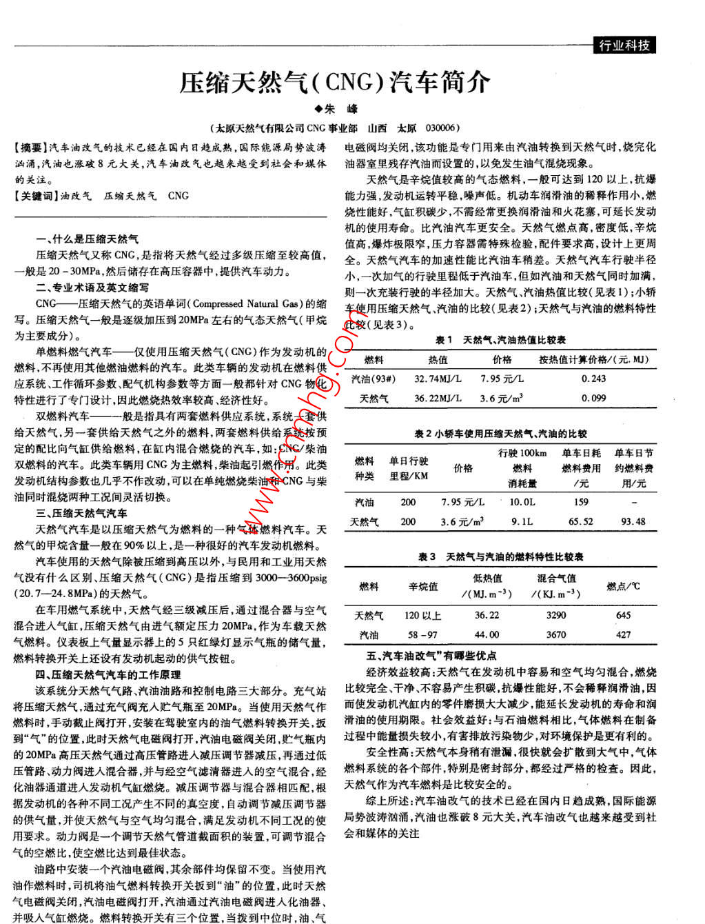 行業(yè)科技壓縮天然氣(CNG)汽車簡介◆朱峰(太原天然氣有限公司CNG事業(yè)部山西太原030006)摘要】汽車油改氣的技術(shù)已經(jīng)在國內(nèi)日趨成熟,國際能源局勢波濤電磁閥均關(guān)閉,該功能是專門用來由汽油轉(zhuǎn)換到天然氣時(shí),燒完化洶涌,汽油也漲破8元大關(guān),汽車油改氣也越來越受到社會(huì)和媒體油器室里殘存汽油而設(shè)置的,以免發(fā)生油氣混燒現(xiàn)象。天然氣是辛烷值較高的氣態(tài)燃料,一般可達(dá)到120以上,抗爆關(guān)鍵詞】油改氣壓縮天然氣CNG能力強(qiáng),發(fā)動(dòng)機(jī)運(yùn)轉(zhuǎn)平穩(wěn),噪聲低。機(jī)動(dòng)車潤滑油的稀釋作用小,燃燒性能好,氣缸積碳少,不需經(jīng)常更換潤滑油和火花塞,可延長發(fā)動(dòng)機(jī)的使用壽命。比汽油汽車更安全。天然氣燃點(diǎn)高,密度低,辛烷一、什么是壓縮天然氣值高爆炸極限窄,壓力容器需特殊檢驗(yàn),配件要求高,設(shè)計(jì)上更周壓縮天然氣又稱CNG,是指將天然氣經(jīng)過多級壓縮至較高值,全。天然氣汽車的加速性能比汽油車稍差。天然氣汽車行駛半徑般是20-30MPa,然后儲(chǔ)存在高壓容器中,提供汽車動(dòng)力。小,一次加氣的行駛里程低于汽油車,但如汽油和天然氣同時(shí)加滿二專業(yè)術(shù)語及英文縮寫則一次充裝行駛的半徑加大。天然氣、汽油熱值比較(見表1);小轎CNG—一壓縮天然氣的英語單詞( Compressed Natural Gas)的縮車使用壓縮天然氣汽油的比較(見表2);天然氣與汽油的燃料特性寫。壓縮天然氣一般是逐級加壓到20MPa左右的氣態(tài)天然氣(甲烷比較(見表3)。為主要成分)。表1天然氣、汽油熱值比較表單燃料燃?xì)馄嚒獌H使用壓縮天然氣(CNG)作為發(fā)動(dòng)機(jī)的燃料,不再使用其他燃油燃料的汽車。此類車輛的發(fā)動(dòng)機(jī)在燃料供價(jià)格按熱值計(jì)算價(jià)格/(元M)應(yīng)系統(tǒng)、工作循環(huán)參數(shù)配氣機(jī)構(gòu)參數(shù)等方面一般都針對CNG物化汽油(93#)32.4M1.95元L0.243特性進(jìn)行了專門設(shè)計(jì),因此燃燒熱效率較高、經(jīng)濟(jì)性好。天然氣36.2MJ/L3.6元/m3雙燃料汽車———般是指具有兩套燃料供應(yīng)系統(tǒng),系統(tǒng)一套供給天然氣,另一套供給天然氣之外的燃料,兩套燃料供紿系統(tǒng)按預(yù)表2小轎車使用壓縮天然氣汽油的比較定的配比向氣缸供給燃料,在缸內(nèi)混合燃燒的汽車,如:CNG/柴油行駛100km單車日耗單車日節(jié)雙燃料的汽車。此類車輛用CNG為主燃料,柴油起引燃作用。此類燃料單日行駛價(jià)格燃料種類里程/KM燃料費(fèi)用約燃料費(fèi)發(fā)動(dòng)機(jī)結(jié)構(gòu)參數(shù)也幾乎不作改動(dòng),可以在單純?nèi)紵裼秃虲NG與柴消耗量元用/元油同時(shí)混燒兩種工況間靈活切換汽油2007.95元幾L10.0L159三、壓縮天然氣汽車天然氣汽車是以壓縮天然氣為燃料的一種氣體燃料汽車。天天然氣2003.6元/m39.1Ln934865.52然氣的甲烷含量一般在90%以上,是一種很好的汽車發(fā)動(dòng)機(jī)燃料。汽車使用的天然氣除被壓縮到高壓以外,與民用和工業(yè)用天然表3天然氣與汽油的燃料特性比較衰氣沒有什么區(qū)別、壓縮天然氣(CNG)是指壓縮到3000-3600psig低熱值辛烷值(20.7-24.8MPa)的天然氣燃料/(M.m-3)/(K.m-3)燃點(diǎn)/℃在車用燃?xì)庀到y(tǒng)中,天然氣經(jīng)三級減壓后,通過混合器與空氣天然氣120以上36.22混合進(jìn)入氣缸,壓縮天然氣由進(jìn)氣額定壓力20MPa,作為車載天然氣燃料。儀表板上氣量顯示器上的5只紅綠燈顯示氣瓶的儲(chǔ)氣量,汽油3670427燃料轉(zhuǎn)換開關(guān)上還設(shè)有發(fā)動(dòng)機(jī)起動(dòng)的供氣按鈕。五、汽車油改氣”有哪些優(yōu)點(diǎn)四、壓縮天然氣汽車的工作原理經(jīng)濟(jì)效益較高:天然氣在發(fā)動(dòng)機(jī)中容易和空氣均勻混合燃燒該系統(tǒng)分天然氣氣路汽油油路和控制電路三大部分。充氣站比較完全、干凈、不容易產(chǎn)生積碳抗爆性能好,不會(huì)稀釋潤滑油因?qū)嚎s天然氣,通過充氣閥充入貯氣瓶至20MPa。當(dāng)使用天然氣作而使發(fā)動(dòng)機(jī)汽缸內(nèi)的零件磨損大大減少,能延長發(fā)動(dòng)機(jī)的壽命和潤燃料時(shí),手動(dòng)截止閥打開,安裝在駕駛室內(nèi)的油氣燃料轉(zhuǎn)換開關(guān)扳滑油的使用期限。社會(huì)效益好:與石油燃料相比氣體燃料在制備到“氣”的位置,此時(shí)天然氣電磁閥打開汽油電磁閥關(guān)閉,貯氣瓶內(nèi)過程中能量損失較小,有害排放污染物少,對環(huán)境保護(hù)是更有利的。的20MPa高壓天然氣通過高壓管路進(jìn)入減壓調(diào)節(jié)器減壓,再通過低安全性高:天然氣本身稍有泄漏,很快就會(huì)擴(kuò)散到大氣中,氣體壓管路動(dòng)力閥進(jìn)人混合器并與經(jīng)空氣濾清器進(jìn)入的空氣混合,經(jīng)燃料系統(tǒng)的各個(gè)部件特別是密封部分都經(jīng)過嚴(yán)格的檢查。因此化油器通道進(jìn)入發(fā)動(dòng)機(jī)氣缸燃燒。減壓調(diào)節(jié)器與混合器相匹配,根天然氣作為汽車燃料是比較安全的。據(jù)發(fā)動(dòng)機(jī)的各種不同工況產(chǎn)生不同的真空度,自動(dòng)調(diào)節(jié)減壓調(diào)節(jié)器綜上所述:汽車油改氣的技術(shù)已經(jīng)在國內(nèi)日趨成熟,國際能源的供氣量,并使天然氣與空氣均勻混合,滿足發(f
