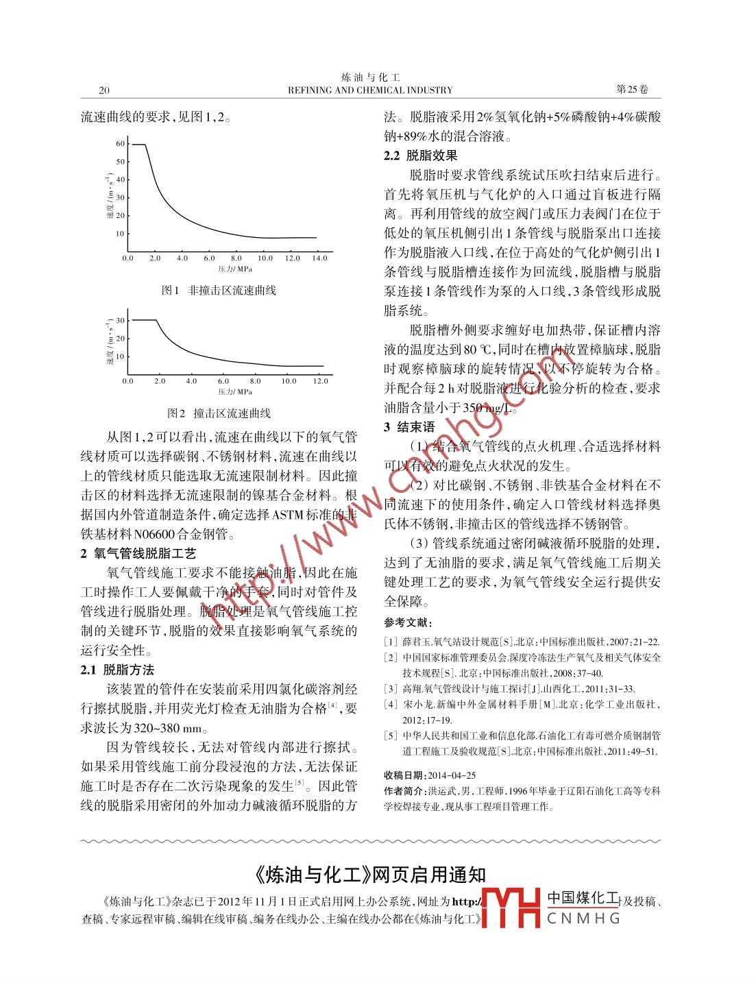 煉油與化工014年第3期REFINING AND CHEMICAL INDUSTRY合成氣裝置氧氣管線選材與脫脂工藝探討洪運武(大慶石化公司乙烯工程指揮部,黑龍江大慶163714)摘要∷根據氧氣壓縮機與氣化爐之間輸送氧氣管線的操作條件,確定裝置的撞擊區(qū)的材料選擇非鐵基材料№06600合金鋼管,其它區(qū)域選擇3η4奧氏體不銹鋼管。同時探討了氧氣管線焊接施工后的脫脂處理的工藝方法。關鍵詞:氧氣管線;材料;性能;脫脂中圖分類號:TQ02.15文獻標識碼:B文章編號:1671-4962(2014)03-0019-02合成氣裝置的氧氣由外網通過管道以2.3MPa管線;(2)氧氣管線工藝閥門和儀表閥門處壓力通過緩沖罐輸送到氧氣壓縮機,將氧氣壓力DNIO0mm管線;(3)工藝燒嘴處。提高到設計壓力6.6MPa。然后通過管線輸送到氣14材料特點化爐燒嘴進入氣化爐。選擇合適的管道材料、加氧氣管道在選材時應首先考慮材料的阻燃特強施工過程的潔凈化處理對裝置的安全運行極為性,在遇到點火的情況,要求材料本身不燃燒或體重要現出阻燃的性能,不銹鋼在氧氣的壓力、純度、溫1管線材料的選擇度、合金化學組分不同的條件下,表現的阻燃性也1.1影響材料選擇的因素不同。高阻燃的工程用合金為銅、純鎳、鎳基合根據氧氣點火機理,管線系統(tǒng)金屬、非金屬材金,這些合金在任何氧氣流速下均有阻燃特性,在料在選材時要考慮3個因素。壓力、溫度、氣體流一定的壓力、溫度條件下免除流速限制,能夠通過速的相關工況;撞擊區(qū)、非撞擊區(qū)的位置;材料特粒子碰撞或在富氧條件下的點火試壓,但是造價較高1.2氧氣流速的確定管線內部潔凈程度是保障氧氣管線運行時減根據工藝條件,在質量一定的條件下,流速計少顆粒物產生的必要條件,碳鋼管線在加工過程算公式見(1)式:中容易因表面氧化產生金屬顆粒,雖然后期經過V=4×Q÷[3600×3.14×(D÷1000)(1)鈍化、吹掃處理,也無法完全避免產生顆粒物。不式中—流速,m/s;Q流量,m/h;D-管線直銹鋼管線的抗氧化能力強,經過后期酸洗、鈍化、徑,,mm。吹掃處理可以達到內部潔凈的要求2。通過計算得知1.5材料的選擇V2=4×7529÷[3600×3.14×(200÷1000)2]根據氧氣流速V=6.7m/s,V3=18.56m/s,V=6.7m/s8.25m/s可以確定V=4×5247÷[3600×3.14×(100÷1000)2])外網輸送管線材質可以選擇碳鋼和奧氏體不銹鋼。但從內部潔凈考慮只選擇普通奧氏體V=4×5247÷[3600×3.14×(150÷1000)2不銹鋼。(2)管徑DN150mm管線非撞擊區(qū)的pxV1.3撞擊區(qū)和非撞擊區(qū)的劃分545MPa·m/s小于80MPa·m/s,氧氣管線材質可以使氣體流動方向突然改變或產生漩渦的位選擇奧氏體不銹鋼置,從而引起氣體中顆粒對管壁的碰撞,這種位置(3)管徑DNO0mm管線撞擊區(qū)的pV=12為撞擊區(qū),其它位置為非撞擊區(qū)。MPa·m/s大于4中國煤化工材質不能結合工藝流程可以將撞擊區(qū)確定為3處。滿足工藝要求CNMHG(1)氮塞線與氧氣管線的接口處的DN100mm非撞擊區(qū)人的沉遝遠而滿足撞擊煉油與化工REFINING AND CHEMICAL INDUSTRY第25卷流速曲線的要求,見圖1,2。法。脫脂液采用2%氫氧化鈉+5%磷酸鈉+4%碳酸鈉+89%水的混合溶液。22脫脂效果脫脂時要求管線系統(tǒng)試壓吹掃結束后進行。首先將氧壓機與氣化爐的入口通過盲板進行隔離。再利用管線的放空閥門或壓力表閥門在位于低處的氧壓機側引出1條管線與脫脂泵出口連接08.010.012.014.0作為脫脂液入口線,在位于高處的氣化爐側引出1條管線與脫脂槽連接作為回流線,脫脂槽與脫脂圖1非撞擊區(qū)流速曲線泵連接1條管線作為泵的入口線,3條管線形成脫脂系統(tǒng)。三20脫脂槽外側要求纏好電加熱帶,保證槽內溶液的溫度達到80℃,同時在槽內放置樟腦球,脫脂時觀察樟腦球的旋轉情況,以不停旋轉為合格。8.012.0并配合每2h對脫脂液進行化驗分析的檢査,要求2撞擊區(qū)流速曲線油脂含量小于350mg/從圖1,2可以看出,流速在曲線以下的氧氣管3結束語線材質可以選擇碳鋼、不銹鋼材料,流速在曲線以(1)結合氧氣管線的點火機理、合適選擇材料上的管線材質只能選取無流速限制材料。因此撞可以有效的避免點火狀況的發(fā)生。擊區(qū)的材料選擇無流速限制的鎳基合金材料。根(2)對比碳鋼、不銹鋼、非鐵基合金材料在不同流速下的使用條件,確定人口管線材料選擇奧據國內外管道制造條件,確定選擇ASTM標準的非氏體不銹鋼,非撞擊區(qū)的管線選擇不銹鋼管。鐵基材料N06600合金鋼管。2氧氣管線脫脂工藝(3)管線系統(tǒng)通過密閉堿液循環(huán)脫脂的處理,氧氣管線施工要求不能接觸油脂,因此在施達到了無油脂的要求,滿足氧氣管線施工后期關工時操作工人要佩戴干凈的手套,同時對管件及鍵處理工藝的要求,為氧氣管線安全運行提供安管線進行脫脂處理。脫脂處理是氧氣管線施工控全保障。制的關鍵環(huán)節(jié),脫脂的效果直接影響氧氣系統(tǒng)的參考文獻[1]薛君玉氧氣站設計規(guī)范[S]北京:中國標準出版社,2007:21-2運行安全性。[2]中國國家標準管理委員會深度冷凍法生產氧氣及相關氣體安全21脫脂方法技術規(guī)程[S].北京:中國標準出版社,2008:37-40該裝置的管件在安裝前采用四氯化碳溶劑經[3]高翔氧氣管線設計與施工探討[J山西化工,2011:31-3行擦拭脫脂,并用熒光燈檢查無油脂為合格“,要41宋小龍新編中外金屬材料手冊M.北京:化學工業(yè)出版社求波長為320~380mm2012:17-19[5]中華人民共和國工業(yè)和信息化部石油化工有毒可燃介質鋼制管因