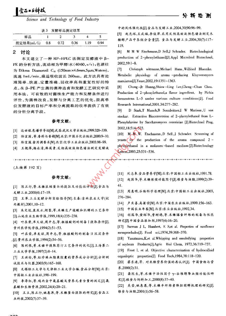 食…分桁檢測(cè)Science and Technology of Food IndustryRP-HPLc法測(cè)定發(fā)前液中β-苯乙醇的研究劉東亞,金征宇(江南大學(xué)食品學(xué)院,江蘇無(wú)錫214036)饔:運(yùn)用反相高效液相色譜對(duì)發(fā)酵液中的β-蘋(píng)乙醇進(jìn)行定1材料與方法性定量分析確定了RP-HPLC測(cè)定發(fā)酵液中β-苯乙醇1.1材料與儀器的含量的方法。色譜柱: Dikma Diamonsil C1(150m46mm,5μm, Waters),流動(dòng)相:甲醇:水=40:60(w/),流速B-苯乙醇標(biāo)準(zhǔn)品 sigma;L-舉丙氨酸1.0mL/min,紫外檢測(cè)波長(zhǎng):260nm,拄溫:30℃,外標(biāo)法定色結(jié)果:RP-HPLC法測(cè)定濃度在420L/10m時(shí)線(xiàn)級(jí),江蘇無(wú)錫晶海氨基酸股份有限公司;甲醇性關(guān)系良好,r=0998,平均加樣回收率為叨71%,RSD純,江蘇漢邦科技有限公司;超純水自制。為1.04%(n=5)。此方法準(zhǔn)確,靈敏,簡(jiǎn)單,重現(xiàn)性好,適合于發(fā)酵液這種復(fù)雜體系中β一萃乙醇的定量分析。UV-1201紫外可見(jiàn)分光光度計(jì)北京瑞利分析美鑣調(diào):β-苯乙醉,發(fā)酵液,反相高效液相色譜法儀器公司; Agilent Il00高效液相色譜儀系列包括中圖分類(lèi)號(hào):TS201.1文獻(xiàn)標(biāo)識(shí)碼:A四元泵、DAD檢測(cè)器、自動(dòng)進(jìn)樣器和色譜工作站;電文章編號(hào):1002-0306(2006)01-0198-03子天平 METTLER TOLEDO,AB104- N MAXIO1g,d=0.lmg;045m微孔濾膜上海興亞凈化材料廠(chǎng)臺(tái)式離心機(jī)TD-5上海安亭科學(xué)儀器廠(chǎng)。B-苯∠醉(B-PE)足一種有著濃郁的玫塊香味12實(shí)驗(yàn)方法的醇,玫瑰香料的廣泛需求使得B-PE成為香料和化1.2.1色譜分析條件色譜柱: Dikma Diamonsil CI妝品行業(yè)中使用量最多的香味成分。天然β-PE存在(150mm×4.6mm,5μm, Waters);流動(dòng)相:甲醇:水于很多花和植物,如玫瑰、風(fēng)信子、某莉、水仙、百合(40:60/v);流速:lm/min;柱溫:30℃;進(jìn)樣量等的精油中,玫瑰精油中β-PE的含量較高,最高可達(dá)60%,向濃度的產(chǎn)品只有用溶劑抽提才可生產(chǎn)出10uL;檢測(cè)波長(zhǎng):260nm。122溶液的制備來(lái),但損失很大,提取價(jià)格昂貲。歐美食品立法機(jī)構(gòu)把用物理法、酶法或是微生物法處理自然資源生產(chǎn)122.1標(biāo)準(zhǔn)品溶液精確量取01mLB-苯乙醇標(biāo)出來(lái)的香味成分定義為天然香料。酵母的 Ehrlich代準(zhǔn)品,用甲醇溶解,定容至10mL,配成濃度為謝途徑屮,通過(guò)把L-舉丙氨酸生物轉(zhuǎn)化為2-PE是100μL/10mL的貯備液,分別吸取貯備液0.0、0.40.8、1.2、1.6、20mL以甲醇定容至10mL,得0、4、8種很好的生產(chǎn)天然阝-苯乙醇的方法。在β-苯乙醇產(chǎn)生菌的菌種選育和發(fā)酵工藝研究過(guò)程屮,需要建立12、16、20μL10mL的標(biāo)準(zhǔn)液,經(jīng)045μm微孔濾膜過(guò)種對(duì)阝-苯乙醇組分和含量的快速檢測(cè)方法。日濾后,濾液用于HPIC測(cè)定1.2.2.2發(fā)酵液樣品溶液苯乙醇發(fā)酵液以前,已報(bào)道的檢測(cè)方法有GC法、HPLC法,國(guó)內(nèi)該方4000r/min離心15min,去除菌體,取上清液用面研究目前尚無(wú)相關(guān)報(bào)道。本文利用反相高效液相045μm過(guò)濾,即得待測(cè)樣品溶液。色譜法對(duì)發(fā)酵液中β-苯乙醇的定量測(cè)定進(jìn)行了研檢測(cè)波長(zhǎng)的確定將β-苯乙醇標(biāo)準(zhǔn)品溶解于究,狄得了較為滿(mǎn)意的結(jié)果可作為β-苯乙醇的定量甲醇中,制備成濃度約20μL/10mL的溶液,在200-測(cè)定方法。400mm的波長(zhǎng)范圍進(jìn)行紫外光全波掃描,β-苯乙醇在218、260m有2個(gè)紫外吸收峰,實(shí)驗(yàn)中以218nm收稿日期:2005-03-12為檢測(cè)波長(zhǎng)時(shí)干擾較大,260mm時(shí)色譜圖基線(xiàn)平穩(wěn)作者簡(jiǎn)介;劉東亞(1981-),男,在讀碩士研究生,研究方向:生物技術(shù)在食品中的應(yīng)用。峰形良好,故選擇260mm作為檢測(cè)波長(zhǎng)食品業(yè)鐘核分析檢測(cè)ol.27,No.O1,2006好,如表1所示(n=5)。1.27回收率實(shí)驗(yàn)取已知β-PE含量的發(fā)酵液315份,向其中分別加入三個(gè)濃度水平的B-PE標(biāo)樣,測(cè)定加入標(biāo)樣后的回收率,算得平均加樣回收率為9771%,符合測(cè)試要求,如表2所示。01.2.8發(fā)酵液樣品測(cè)定12.8.1發(fā)酵液的預(yù)處理β-PE發(fā)酵液以4000r/mi波長(zhǎng)(m)離心15min,去除菌體,取上清液用0.45μm過(guò)濾,即圖1得待測(cè)樣品溶液。124流動(dòng)相和流速的確定文獻(xiàn)中采用乙腈-水以1.28.2標(biāo)樣及樣品的分離色譜圖在上述優(yōu)化的相關(guān)配比作為流動(dòng)相??紤]到乙腈價(jià)格較高,同時(shí)參色譜條件下,標(biāo)準(zhǔn)品和樣品溶液得到充分的洗脫和考其他文獻(xiàn),分別配制不同組成的流動(dòng)相進(jìn)行實(shí)驗(yàn),分離,保留時(shí)間分別為7207和7220min,色譜圖見(jiàn)經(jīng)過(guò)多次篩選,結(jié)果表明,甲醇-水(40:60,vv的系統(tǒng)圖3、圖4。從圖中可知,在本色譜條件下,發(fā)酵液中效果最好。同時(shí),對(duì)不同流速(080、100、120ml/min)條的β-PE能得到很好的分離,保留時(shí)間與標(biāo)準(zhǔn)品基本件下的分離情況進(jìn)行研究。與1.00 ml min相比較,流致,峰形對(duì)稱(chēng)且無(wú)明顯的干擾峰。速為080mL/min時(shí)保留時(shí)間增加,分離效果較差;流速為L(zhǎng)20ml/min時(shí)保留時(shí)間縮短,但不明顯,且分離效果與100mL/min相差不大。考慮到柱壓的因素,最終選用流速為100mmin。1.25標(biā