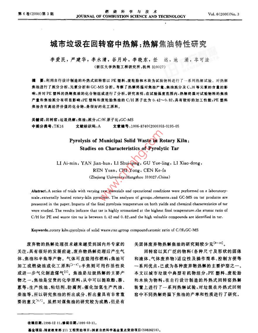 城市垃圾在回轉(zhuǎn)窯中熱解:熱解焦油特性研究