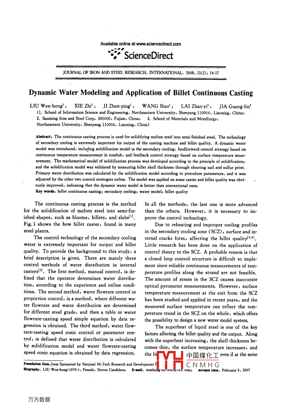 Available online at www.sciencedirect.comScienceDirectJOURNAL OF IRON AND STEEL RESEARCH, INTERNATIONAL.2008, 15(2); 14-17Dynamic Water Modeling and Application of Billet Continuous CastingLIU Wen-hong',XIE Zhi',J1 Zhen-ping' ,WANG Biao',LAI Zhao-yi", JIA Guanglin'(1. School of Information Science and Engineering, Norheastern University, Shenyang 10004, Liaoning, China;2. Sanming Iron and Steel Corp, 365000 Fujian, China; 3. School of Materials and Metallurgy,Northeastern University, Shenyang 110004, Liaoning, China)of secondary cooling is extremely important for output of the casting machine and bllet quality. A dynamie watermodel was introduced, including solidification model in the secondary cooling, feedforward control strategy based oncontinuous temperature measurement in tundish, and feedback control strategy based on surface temperature meas-urement. The mathematical model of solidification process was developed according to the principle of solidification,and the solidification model was validated by measuring bllet shell thickness through shooting nail and sulfur print.Primary water distribution was calculated by the solidification model according to procedure parameters, and it wasadjusted by the other two control strategics online. The model was applied on some caster and bllt quality was obvi-ously improved, indicating that the dynamic water model is better than conventional ones,Key words: billet continuous casting; secondary cooling; water model; bllt qualityThe continuous casting process is the method In all the methods, the last one is more advancedfor the solidification of molten steel into semi-fin- than the others. However, it is necessary to im-ished shapes, such as blooms, bllets, and slabs1.prove the control technology.Fig.1 shows the bow bllet caster, found in manyDue to reheating and improper cooling profilessteel plants.in the secondary cooling zone (SCZ), surface and in-The control technology of the secondary cooling ternal cracks form, affecting the billet qualty3.J.water is extremely important for output and billetLittle research has been done on the application ofquality. To provide the background to this study, a control theory to the SCZ. A probable reason is thatbrief description is given. There are mainly threea closed loop control structure is difficult to imple-control methods of water distribution in internal ment since reliable continuous measurements of tem-casterse?. The first method, manual control, is de-perature profiles along the strand are not feasible.fined that the operator determines water distribur The amount of steam in the SCZ causes inaccuratetion, according to the experience and online condi-optical pyrometer measurements. However, surfacetions. The second method, water flowrate control or temperature measurement at the exit from the sCzproportion control, is a method, where dfferent wa- has been studied and applied in recent years, and theter flowrate and water dstribution are determined measured surface temperature can relet the tem-for dfferent steel grade, and then a table or water perature trend in the SCZ on the whole, which ofersflowrate-casting speed simple equation by data re the psbilitit to design a new water model system.gression is obtained. The third method, water flow-The superheat of liquid steel is one of the keytate-casting speed conic control or parameter con- factors afcine the bllet quality and the output. Alongtrol, is defined that water distribution is calculatedwith the superheat increasing, the shell thickness be-by sldification model and water flowratecasting comes thin, the surface temperature increases, andspeed conic equation is obtained by data regression.the li中國(guó)煤化工even if at the sameFoundation lem; Item Sponsored by National H-Tech Research and Development F;1HCNMH GBiogrnphy: LIU Wen-hong(1978-), Female, Doctor Candidate; E- mil; wenhong 1u040410353 com, Kevisea Date: February 5, 2007Issue 2Dynamic Water Modeling and Application of Billet Continuous Casting●15●In the radiation zone-入工T=eo(T-I)(5). Ladlewhere, T。is casting temperature; a, b are con-Continuous tenperaturestants; h is heat transfer coefficient; Tw is tempera-measurement in tundishture of cooling water; Tb. is surface temperature ofTundish, Stopper rodbillet; ε is emissivity; σ is Stefan-Boltzman con-Mould、stant; and n is exterior normal of cooling boundary.MeniscusLiquid phaseTo eliminate the effect of superheat variation,- Rollersthe feedforward control strategy is proposed basedon continuous temperature measurement in tundish.MetallurgicalCutterIt is assumed that the other procedure parametersSecondarycoolingStrandare invariable, water compensation is calculated byoodmodel and the coefficient values of equations with000 Cone variable are obtained through linear regression.Fig1 Bow billet casterThe integrated equation is given as:sQ,(T)=a;(T。- T)+b;, i=l,2,*,m (6)casting speed5. Thus, the superheat is taken intowhere 0Q,(T,) is the compensative water flowrateaccount for the water model system,of segment i; T. is casting temperature; T is liqui-In this study, the water distribution aspects ofdus temperature; a; and b; are coefficients, and i isthe SCZ was investigated, and the dynamic waterthe number of segments in the SCZ.model system was built based on solidification modelFor calculating the water compensation, a pre-in the SCZ, feedforward control strategy, and feed-cise soldification model is first needed. The shoot-back control strategy. It is assumed that sufficienting nail and sulfur print are adopted here to measurecooling has been realized in the mold.the actual shell thickness and validate the model for1 Dynamic Water Modelthe first time in China.One of the metallurgical criteria is that the surfaceThe soldification model is developed accordingtemperature of the strand before straightener rollsto the metallurgical criteria for billet and target tem-should be controlled out of embrittlement tempera-p