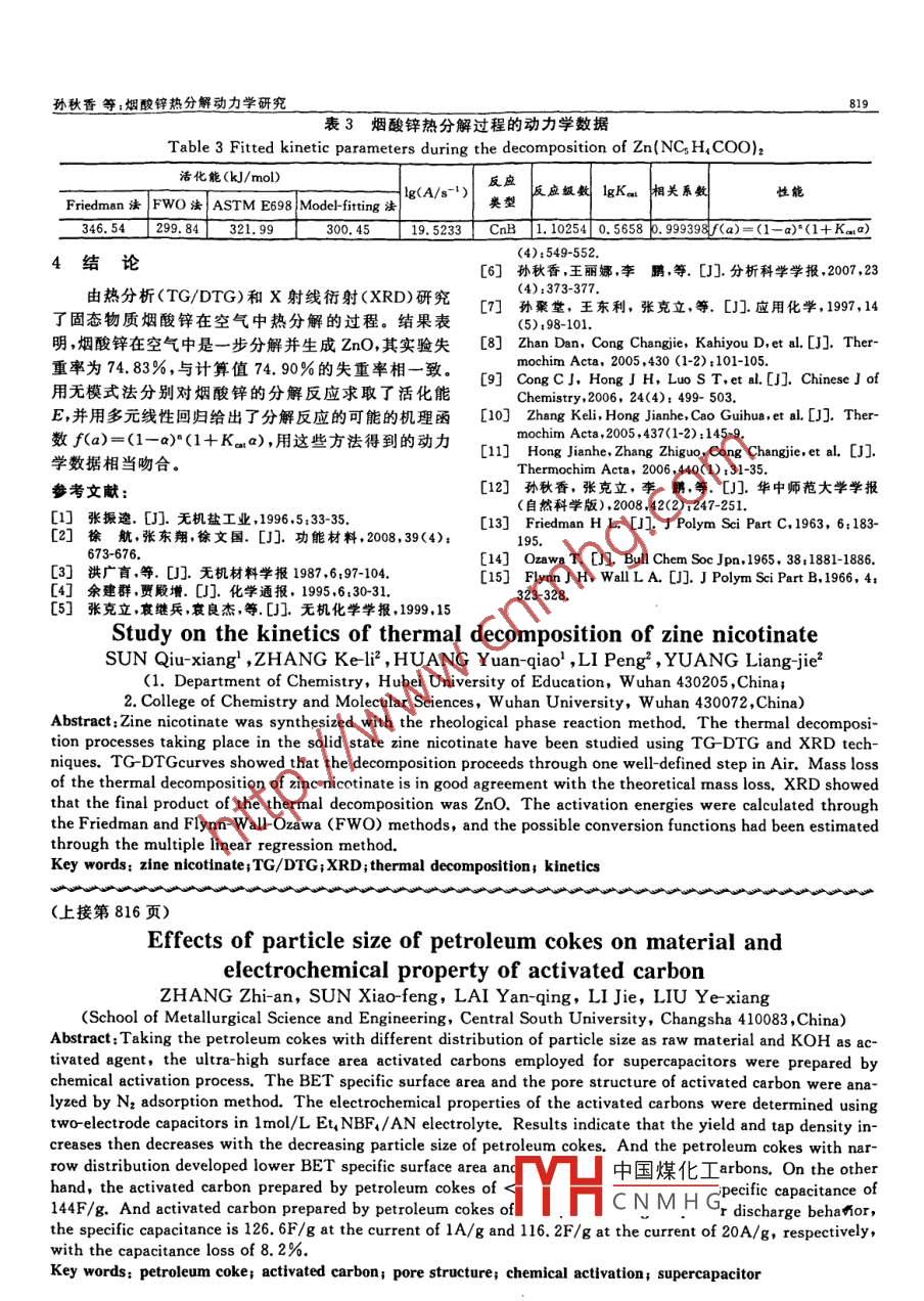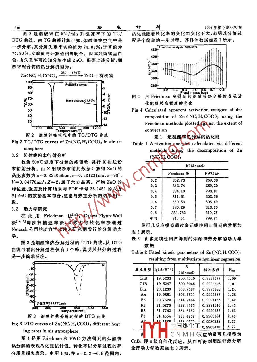 孫秋香等:煙酸鋅熱分解動力學(xué)研充煙酸鋅熱分解動力學(xué)研究孫秋香1,張克立2,黃元喬,李彭2,袁良杰(1.湖北第二師范學(xué)院化學(xué)系,湖北武漢430205;2.武漢大學(xué)化學(xué)與分子科學(xué)學(xué)院,湖北武漢430072)摘要:采用流變相反應(yīng)法合成了煙酸鋅配合物,用粉灰狀,越細(xì)越好),然后移到反應(yīng)釜內(nèi)膽(聚四氟乙熱分析(TG/DTG)、X射線衍射(XRD)技術(shù)研究了固烯)中,加入適量水調(diào)成流變態(tài),內(nèi)膽密封,再放入反應(yīng)態(tài)物質(zhì)煙酸鋅在空氣中熱分解的過程。熱分析結(jié)果表釜的不銹鋼外套中,外套旋緊密封好。將反應(yīng)釜置于明,煙酸鋅在空氣中是一步分解,其失重率與理論計算100℃的烘箱中反應(yīng)約10h,取出來,自然冷卻后,打開失重率相吻合。XRD結(jié)果表明,煙酸鋅分解的終產(chǎn)物反應(yīng)釜。反應(yīng)物用無水乙醇洗滌3次,沉淀物在為ZnO。用 Friedman法和 Flynn-Wall-Ozawa(FWoO)120℃的烘箱中烘干即得到無水煙酸鋅Zn(Nic)2(Nic法求取了分解過程的活化能E,并用多元線性回歸法為NC5H4COO)給出了可能的機理函數(shù),由這些方法得到的動力學(xué)數(shù)2.3熱分析據(jù)相互比較吻合固體配合物的熱穩(wěn)定性是該化合物的重要特性之關(guān)鍵詞:煙酸鋅;TG/DTG;XRD;熱分解;動力學(xué)熱分析研究的是物質(zhì)的物理性質(zhì)和化學(xué)性質(zhì)隨溫中圖分類號:O643.12文獻(xiàn)標(biāo)識碼:A度變化的關(guān)系。煙酸鋅的TG/DTG在 Netzsch ST文章編號:1001-9731(2009)05-0817-03449C綜合熱分析儀進(jìn)行。樣品重量約為7.50mg。升1引言溫速率為5、10、20℃/min。升溫范圍,從室溫1200℃。根據(jù)熱分析曲線上的數(shù)據(jù),進(jìn)一步在綜合熱高活性氧化鋅和超微氧化鋅在磁性材料、橡膠工分析儀上收集分解產(chǎn)物。業(yè)、日用化工、光吸收、熱阻、催化等方面具有奇特的性2.4微量X射線粉末衍射質(zhì)和廣泛的用途-3)。納米級氧化鋅粒子作為聯(lián)系宏用微量X射線粉末衍射法,在 Bruker d8-Ad-觀物質(zhì)及微觀粒子的橋梁,其潛在的重要性備受關(guān) vance X射線衍射儀上測定煙酸鋅分解產(chǎn)物的X射線注[。粉末衍射譜圖。實驗條件為:鎳濾光片和石墨單色器近年來,對芳香族羧酸鹽配合物的熱分解性質(zhì)做濾波,旋轉(zhuǎn)陰極銅靶Ka輻射,管壓40kV,管流50mA,了很多研究-7。羧酸鹽配合物熱分解的最終產(chǎn)物大波長0.154178m,掃描速率4/min,樣品為熱分析過多數(shù)為納米級別尺寸的金屬氧化物。本文較詳細(xì)的研程中的固體殘留物,質(zhì)量為5mg左右。究了煙酸鋅的合成和熱分解過程,得到了氧化鋅產(chǎn)品。并用等轉(zhuǎn)換率法研究煙酸鋅熱分解過程的動力學(xué)。在3結(jié)果與討論未知動力學(xué)方程的情況下先得到活化能,再應(yīng)用多元3.1熱分析線性回歸法對非等溫?zé)岱治鰯?shù)據(jù)進(jìn)行擬合以確定反應(yīng)圖1是煙酸鋅在不同升溫速率下于靜態(tài)空氣中的的動力學(xué)方程和參數(shù)-12TG/DTG曲線。由圖1可知,在不同升溫速率下,樣2實驗品的失重率基本一致2.1試劑、儀器2.1.1試劑氧化鋅(ZnO)、煙酸(NC5H4COOH或CH5O2N縮寫為HNic)、無水乙醇,均為分析純試劑2.1.2儀器Netzsch StA449綜合熱分析儀; Bruker D8Ad升溫速率51020cmlnvance X射線衍射儀。2.2樣品制備圖1煙酸鋅在空氣中的TG/DTG曲線首先稱取一定量的(按物質(zhì)的量比)煙酸和氧化鋅Fig(2:1)。將兩種試劑放在研缽中混合均勻,研細(xì)(研成中國煤化工CH,COO)2 In air atCNMHG基金項目:國家自然科學(xué)基金資助項目(20071026);湖北第二師范學(xué)院校管重點資助課題(2007A002)收到初稿日期:2008-1020收到修改稿日期:2009-022通訊作者:張克立作者簡介:孫秋香(1955-),女,湖北黃岡人,副教授,主要從事無機固體和材料化學(xué)研究818私料2009年第5期(40)卷圖2是煙酸鋅在5℃/min升溫速率下的TG/活化能隨著轉(zhuǎn)化率的變化而變化不大,表明其分解過DTG曲線。由TG曲線計算可知,煙酸鋅在空氣中是程是個簡單的一步過程。其具體數(shù)據(jù)如表1所一步分解,其分解失重率實驗值為74.83%;計算值為「 Friedman analysis煙酸3TG74.90%實驗值與計算值相當(dāng)吻合。固體殘留物呈白色,由失重率可推知分解生成ZnO。根據(jù)上述分析,煙酸鋅配合物的熱分解機理為:380~470℃Zn(NC H, coO)2ZnO+有機物圖4用 Friedman法得到的煙酸鋅熱分解的表觀活Mass charge:-,83%化能隨反應(yīng)程度的變化Fig 4 Calculated apparent activation energies of de-composition of Zn(NCs H, COO)2 using theFriedman methods plotted against the extent ofconversion圖2煙酸鏵在空氣中的TG/DTG曲線表1煙酸酸鋅熱分解的活化能Fig 2 TG/DTG curves of Zn(NC H, Coo)2 in air at- Table 1 Activation energies calculated via differentmethods during the decomposition of Zn3.2X射線粉末衍射分析(NCs H, COO)2收集500℃溫度下分解的殘留物,進(jìn)行X射線粉ECk/moD)末衍射分析。由X射線粉末衍射數(shù)據(jù)計算得ZnO的晶胞參數(shù)為a=0.325068nm,c=0.521231nm,a=90°Friedman法FWO法v=0.04770nm3,Z=2,屬于六方晶系。產(chǎn)物ZnO的342.74峰位置、強度及計算結(jié)果與PDF卡號36-1451的六方0.4334.10298.81相ZnO的數(shù)據(jù)基本吻合,這也與熱重分析的結(jié)果相311.61302.56致50.53305.493.3動力學(xué)研究30.29313.700.8在此用 Friedman法1), Ozawa- Flynn-Wall319.75平均346.54299.84法11即多掃描速率法,又稱為等轉(zhuǎn)化率法通過Netzsch公司的動力