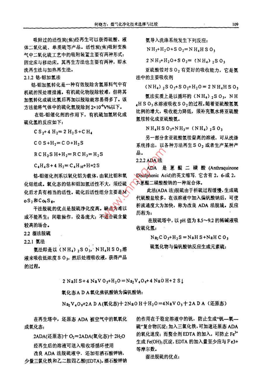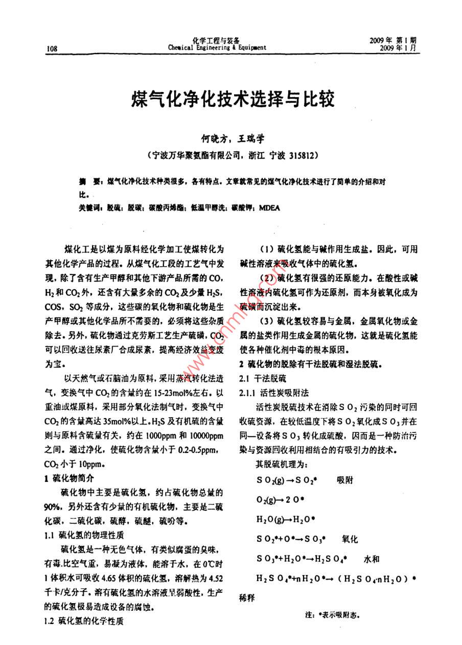 化學(xué)工程與裝備2009年108Chenical Engineering Equip ment2009年1月煤氣化凈化技術(shù)選擇與比較何曉方,王瑞學(xué)(寧波萬華聚氨酯有限公司,浙江寧波315812)摘要:煤氣化凈化技術(shù)種類很多,各有特點(diǎn)。文章就常見的煤氣化凈化技術(shù)進(jìn)行了簡單的介紹和對關(guān)鍵詞;脫硫;脫碳;碳酸丙烯酯;低溫甲醇洗;碳酸鉀: MDEA煤化工是以煤為原料經(jīng)化學(xué)加工使煤轉(zhuǎn)化為(1)硫化氫能與堿作用生成鹽。因此,可用其他化學(xué)產(chǎn)品的過程。從煤氣化工段的工藝氣中發(fā)賊性溶液來吸收氣體中的硫化氫?,F(xiàn),除了含有生產(chǎn)甲醇和其他下游產(chǎn)品所需的co, .(2)硫化氫有很強(qiáng)的還原能力。在酸性或堿H2和CO2外,還含有大量多余的CO2及少量H2S,性溶液內(nèi)硫化氫可作為還原劑,而本身被氧化成為COS, SO2 等成分,這些碳的氧化物和硫化物是生硫磺而沉淀出來。產(chǎn)甲醇或其他化學(xué)品所不需要的,必須將這些雜質(zhì)(3)硫化氫較容易與金屬,金屬氧化物或金除去。另外,硫化物通過克勞斯工藝生產(chǎn)硫磺,CO2屬的鹽類作用生成金屬的硫化物,這就是硫化氫能可以回收送往尿素廠合成尿素,提高經(jīng)濟(jì)效益變廢使各種催化劑中毒的根本原因。為寶.2硫化物的脫除有干法脫硫和濕法脫硫.以天然氣或石腦油為原料,采用蒸汽轉(zhuǎn)化法造2.1 干法脫硫氣,變換氣中CO2的含量約在15-23mol%左右。以2.1.1 活性炭吸附法重油域煤原料,采用部分氧化法制氣時,變換氣中活性炭脫硫技術(shù)在消除S 02污染的同時可回CO2的含量高達(dá)35moi%以上.H2S及有機(jī)硫的含量收硫資源,在較低溫度下將S O2氧化成S 0;并在則與原料含硫量有關(guān),約在100ppm和1000ppm同- -設(shè)備將S 0z轉(zhuǎn)化成硫酸,因而是一種防治污之間。通過凈化,使硫化物含量小于0.2-0.5ppm,染與資源回收利用相結(jié)合的有吸引力的技術(shù)。CO2小于loppm.其脫硫機(jī)理為:1硫化物簡介SO2(g)-→S 02*吸附硫化物中主要是硫化氫,約占硫化物總量的02(g)→2 0*90%,另外還含有少量的有機(jī)硫化物,主要是二硫化碳,二硫化碳,硫醇,硫醚,硫吩等。H20(g)- +H20*1.1硫化氫的物理性質(zhì)S02*+0*-→SOz*氧化硫化氫是一-種無色氣體,有類似腐蛋的臭味,SOj*+H20*- +H2SO+水和有毒比空氣重,易凝為液體,能溶于水,在0個時1體積水可吸收4.65體積的硫化氫,溶解熱為4.52H2S 0p*+nH20*→(H2S 0:nH2O)●千卡/克分子。溶有硫化氫的水溶液呈弱酸性,生產(chǎn)稀釋的硫化氫極易造成設(shè)備的腐蝕。注:嚷示吸附態(tài)。1.2硫化氫的化學(xué)性質(zhì)何曉方:煤氣化凈化技術(shù)選擇與比較109 ,吸附過的活性炭(焦)經(jīng)再生可以獲得硫酸、液氨導(dǎo)入洗滌系統(tǒng)發(fā)生下列反應(yīng):體二氧化硫、單質(zhì)硫等產(chǎn)品?;钚蕴?焦)吸附變換NHy+H2O+SO2=NHgHSOz氣中二氧化硫工藝中的吸附裝置主要有兩種形式:固定床與移動床。其再生方法也主要有兩種,即水2NH;+H20+S02= (NH4) 2SO3洗再生法與加熱再生法。亞硫酸銨對S 02有更好的吸收能力,它是氨2.1.2鈷-鉬加氫法法中的主要吸收劑鈷-鉬加氫轉(zhuǎn)化是一種有效脫除含氫原料氣中有(NH4) 2S0j+S 0z+H20= 2NHgHS O3機(jī)硫的預(yù)處理措施。有機(jī)硫化物脫除較難,但將其加氫轉(zhuǎn)化成硫比氫后再加以脫除就容易得多了。該氨法實(shí)質(zhì)上是以循環(huán)的(NH4) 2S03, NH方法能將氣體中的硫化氫脫除到2x10*V%以下.HSs03水溶液吸收S02的過程。隨著亞硫酸氫氨在鈷-鉬催化劑的作用下,有機(jī)硫加氫轉(zhuǎn)化成比例的增大,吸收能力降低,須補(bǔ)充氨水將亞硫酸氫銨轉(zhuǎn)化成亞硫酸氨。硫化氫的反應(yīng)如下:NH.HSOz+NHz= (NHs) 2SO3CS2+4 H2=2H2S+CH .另一部分含亞硫酸氫銨量高的溶液,可從洗滌C0S+H2=C0+H2S系統(tǒng)排出,以各種方法再生S O2或者生產(chǎn)某種產(chǎn)RCH2SH+H2=RCH3=H2S品。2.2.2 ADA法C.H,S+4 H2= C.Hro+H=2SADA是蒽醌二磺酸(Anthraquinone鈷-鉬催化劑系以氧化鋁為載體,由氧比鉬和氧Disulphonic Acid)的英文縮寫.它含有2, 6-或2,化鈷組成。氧化態(tài)的鈷和鉬加氫活性不大,須經(jīng)硫7~蒽酲二磺酸酸鈉的一一種混合體?;蟛啪哂邢喈?dāng)?shù)幕钚浴A蚧蠡钚越M分主要是M此法(ADA法)脫硫由于析硫過程緩慢,生成硫代硫酸鹽較多,在該溶液中加入偏釩酸鈉后,可使oS2和CoqSg.干法脫硫的優(yōu)點(diǎn)是脫硫凈化度高。缺點(diǎn)為難以析流通度大為加快,稱為改良ADA法脫琉。反應(yīng)或不能再生:間歇操作,設(shè)備龐大:不適合硫含量歷程為:在脫硫塔中,以pH值為8.5~9.2的稀堿液吸較高的場合。收硫化氫:2.2濕法脫硫NaCOz+H2S=NaHS+NaHCO32.2.1氨法氨法即是以(NH) 2S03, NH,HS 03溶硫氫化物與偏釩酸鈉反應(yīng)生成元素硫:液來吸收低濃度S 03,然后處理吸收液,獲得產(chǎn)品的過程。2NaHS+4 NaV 0j+H20=NaV,Og+4NaOH+2S↓氧化態(tài)A D A氧化焦釩酸鈉為偏釩酸鈉:NaV40g+2A D A(氧化態(tài))+ 2NaOH+H20=4NaV0;十2ADA (還原態(tài))在再生塔中,還原態(tài)ADA被空氣中的氧氧化的作用在于穩(wěn)定溶液中的釩,防止生成“釩-氧一成氧化態(tài):硫”復(fù)合物沉淀:加入三氯化鐵,可加速還原態(tài)ADA2ADA(還原態(tài))十O2= 2ADA(氧化態(tài))+ 2H2O的氧化速度;而整合劑EDTA的加入,可防止Fe'*生成Fe(OH)3沉淀,EDTA的加入量至少應(yīng)與Fe3+經(jīng)再生后的溶液可送入吸收塔循環(huán)使用等摩爾數(shù)。改良ADA法脫硫液中.還加有灑石酸鉀鈉,濕