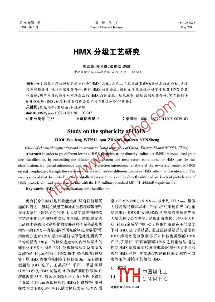 第25卷第3期天津化工Vol 25 No. 32011年5月Tianjin Chemical IndustryHMX分級工藝研究周武鋒,聞利群,張建仁,韻勝(中北大學化工與環(huán)境學院,山西太原030051)摘要:為了制備不同粒徑級的奧克托今(HMX)晶體,采用二甲基亞砜(DMSO)重結(jié)晶粒度分級,通過控制稀釋速度,攪拌和溫度等條件,進行HMX粒度分級。通過光學顯微鏡分析了重結(jié)晶HMX的晶體形貌,用不同目的篩子對重結(jié)晶后的HMX晶體分級。結(jié)果表明:通過控制結(jié)晶條件,可直接制得6種粒度的HMX,粒度和質(zhì)量均符合美軍標MIL,H-45444B要求。關(guān)鍵詞:奧克托今;重結(jié)晶;粒度分級doi:10.3969/issn.1008-1267.2011.03013中圖分類號:TJ55文獻標志碼:A文章編號:1008-1267(2011)03-0039-03Study on the sphericity of HMXZHoU Wu-feng, WEN Li-qun, ZHANG Jian-ren, YUN Sheng(Shool of chemical engineering and environment, North university of China, Taiyuan Shanxi 030051, China)Abstract: In order to get different levels of HMX particles, using dimethyl sulfoxide(DMSO)recrystallized grsize classification, by controlling the dilution rate, agitation and temperature conditions, for HMX particle sizeclassification. By optical microscope and scanning electron microscopy, analysis of the re-crystallization of HMXcrystal morphology, through the sieve on the recrystallization different purposes HMX after the classification. Theresults showed that: by controlling the crystallization conditions can be directly obtained six kinds of particle size ofHMX, particle size and quality are in line with the U.S. military standard MIL, H-45444B requirementsKey words: HMX; re-crystallization; size classification奧克托今(HMX)是目前能量高、綜合性能最優(yōu)至120MPa,d50由5158mm減小到272mm,但壓越的炸藥之一,但其機械感度和沖擊波感度較敏感,力過高容易破壞晶形;王保民門利用超臨界CO2重在許多條件下限制了它的使用。大量實驗表明HMX結(jié)晶細化HMX時發(fā)現(xiàn),HMX丙酮溶液隨超臨界壓重結(jié)晶細化后機械感度降低,能量輸岀増加,滿足火力增大粒度分布變窄,晶形則由棒狀、塊狀變?yōu)槠て芳夹g(shù)鈍感化和高能化的發(fā)展趨勢。制備晶形規(guī)狀、針狀;余咸旱用γ2丁內(nèi)酯作溶劑在不同溫度則均一的HMX一直是國內(nèi)外研究的熱點徐瑞娟采下對HMX進行重結(jié)晶,通過控制重結(jié)晶的溫度和用物理方法對HMX原材料進行球形化處理得到了HMX溶液濃度分別制得了6種粒度類別的HMX平均粒徑為330μm的顆粒透光均勻內(nèi)外缺陷少的產(chǎn)品;安崇偉"用丙酮溶解HMX進行重結(jié)晶通過球形化HMX;付廷明采用物理研磨法制備出微米控制HMX溶液濃度和滴加速率分別得到了不同形級(d50=5-10μm)的球形HMX粉體;楊光成通過噴貌的HMX晶體。本文通過控制稀釋速度,攪拌和溫霧干燥HMX丙酮溶液制備了粒徑在3μm左右的β度等條件,制備不同級的HMX型超細HMX粒子;王晶禹η采用二甲基亞砜(DMSO作為HMX的溶劑水為非溶劑隋性液體在1實階中國煤化工溶解溫度65℃、流體介質(zhì)噴射壓力04MPa下得到1.1CNMHG了062-1.10μm近似球形的HMX;何得昌利用對撞技術(shù)對HMX進行粉碎,隨對撞壓力從40MPa增收稿日期:2010114天津化T2011年5月將一定量的HMX溶于二甲亞砜(DMSO)中,使稀釋劑濃度最大均為52%,1、2級濃度為48%。之達到或接近飽和濃度,然后加入非溶劑(稀釋劑)2.2.2加料速度的影響進行稀釋,使DMSO濃度下降逐漸析出HMX結(jié)晶稀釋劑加入速度影響溶液的狀態(tài),加人速度緩?fù)ㄟ^控制稀釋速度,攪拌和溫度等條件,制備不同慢,使溶液狀態(tài)維持在第一介穩(wěn)區(qū),利于晶核長大,級的HMX晶體易于得到3、4級HMX;若加入速度較快,使溶液狀1.2工藝流程(見圖1)態(tài)處于不穩(wěn)區(qū),利于生成晶核,則能形成大小比較HMxX□DMso[Ho均勻的細小結(jié)晶2、5級HMX;1、6級相近,但6級粒度略小于1級,因此在制備工藝中,6級加入稀釋劑的速度應(yīng)大于A級HMX溶液稀釋劑2.23加晶種的影響在工業(yè)結(jié)晶過程中為了控制晶體的數(shù)目和大結(jié)品一過濾及洗滌小,普通習慣是結(jié)晶前在溶液中加入溶質(zhì)的不同大小的顆粒作為晶種,對溶液此后的結(jié)晶將發(fā)生感染作用,在制各大顆粒結(jié)晶時,加入晶種的作用尤為明顯。制4級HMX時,需加入一定量的晶種,晶種2結(jié)果與分析為3級產(chǎn)品中35~60目之間的HMX,不能直接以3級產(chǎn)品作晶種,以免結(jié)晶大小相差懸殊,不能獲得21實驗結(jié)果合格4級HMX。HMX的6種粒度(見表1沖中,3、4級較大,較相2.24洗滌液的影響近,2、5級較小也較接近,1、6級同屬于中等粒度除4級外,其它各級均為水洗滌過濾后的結(jié)相近兩級粒度盡量采用相同的工藝條件,即采用相晶,水洗以洗凈母液為目的。為節(jié)約溶劑回收費用,近的稀釋劑用量和濃度,通過改變稀釋劑加入速不必用過量水洗滌。如用水直接洗滌4級,相當于度,控制溶液的狀態(tài),若狀態(tài)維持在第一介穩(wěn)區(qū),則用水稀釋,會使母液中溶解的HMX形成細結(jié)晶析制出3、4級HMX,如狀態(tài)在第二介穩(wěn)區(qū)可得到1、6出。應(yīng)先用含DMSO和水的DMsO溶液洗滌,然后級HMX,狀態(tài)在不穩(wěn)區(qū),其粒度為2、5級HMX。以水洗凈DMSO即可。表HMX粒度2.25攪拌速度的影響美國標各級通過/%制取大粒度HMX時的攪拌速度較小,制備中準篩號等粒度HMX,采用適中的轉(zhuǎn)速100~150r/min,制細(目)256小粒度HMX時,攪拌速度較大,以利于稀釋劑迅速分散形成細小結(jié)晶99~10085~10099~10010-403結(j