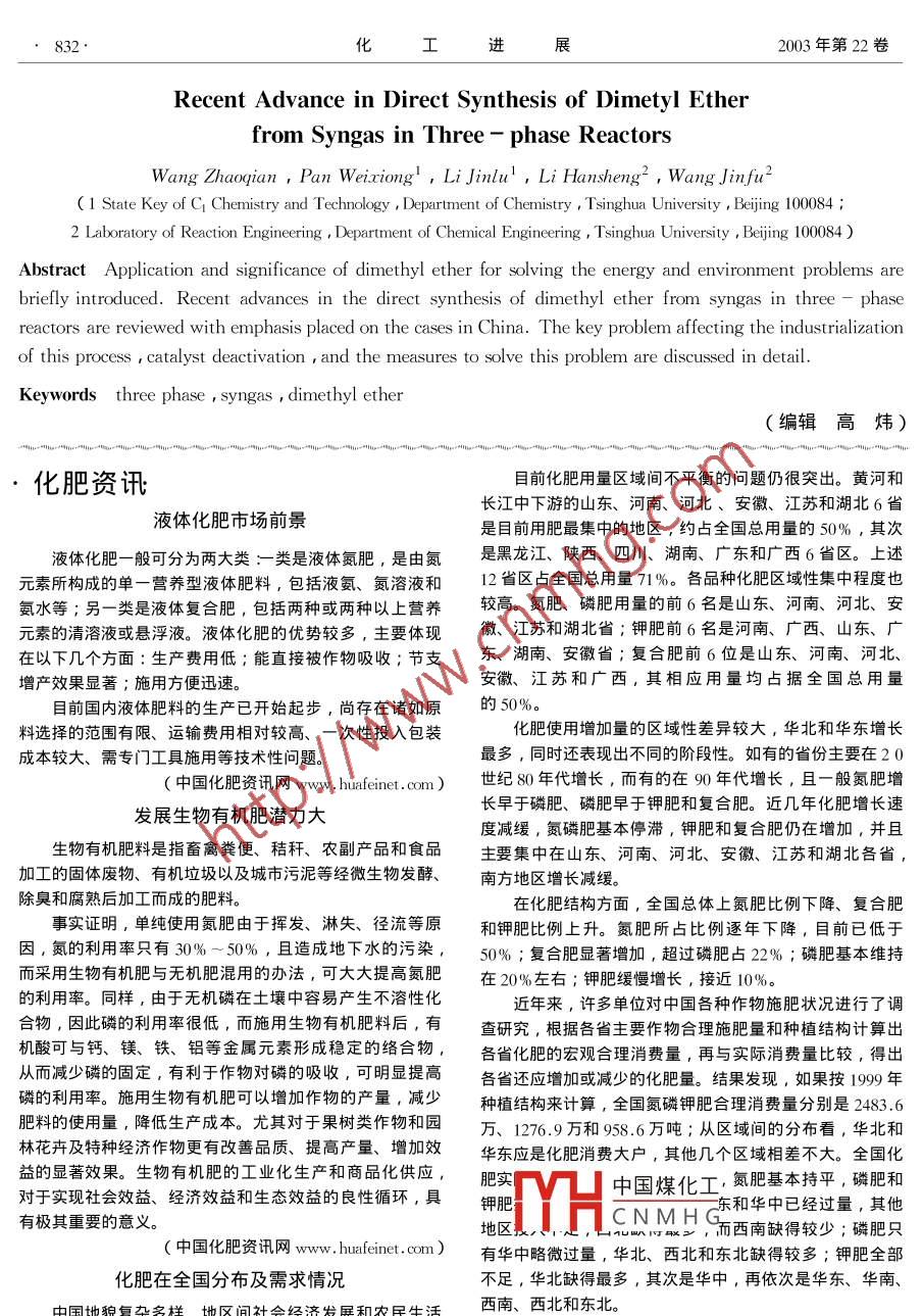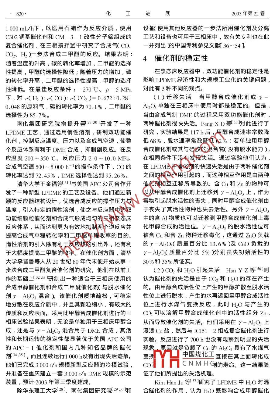 化展828HEMICAL INDUSTRY AND ENGINEERING PROGRESS2003年第22卷第8期三相床中合成氣直接合成二甲醚的新進(jìn)展王兆謙潘偉雄1李晉魯1黎漢生2王金?!?清華大學(xué)一碳化學(xué)與化工國(guó)家重點(diǎn)實(shí)驗(yàn)室,北京100084;2清華大學(xué)化學(xué)工程系反應(yīng)工程實(shí)驗(yàn)室,北京100084)要簡(jiǎn)單介紹了二甲醚旳用途及對(duì)解決能源和環(huán)境問題的重要意義。綜述了國(guó)內(nèi)外特別是國(guó)內(nèi)三相床反應(yīng)器中由合成氣直接合成二甲醚的研究和開發(fā)新進(jìn)展。重點(diǎn)介紹了影響該工藝過程工業(yè)化的關(guān)鍵問題——催化劑失活的原因和改進(jìn)措施關(guān)鍵詞三相床,合成氣,二甲醚中圖分類號(hào)TQ223.2文獻(xiàn)標(biāo)識(shí)碼A文章編號(hào)1000-661x2003)8-0828-05二甲醚(DME)是最簡(jiǎn)單的有機(jī)醚類化合物,混合制成復(fù)合催化劑,在固定床反應(yīng)器中合成作為重要的甲醇下游產(chǎn)品之一,具有廣泛的用途,DME。一步法是指將合成甲醇及甲醇脫水兩步反如用作溶劑、有機(jī)合成中間體。由于它無毒、無異應(yīng)合并在一個(gè)反應(yīng)器中進(jìn)行,主要包括以下3個(gè)味、不破壞臭氧層1,可以替代氟里昂用作氣霧反應(yīng)劑、推進(jìn)劑、冷凍劑等。同時(shí),由于其容易液化、2+4H2=2CHOH△H298Kk=-181.59kJ(1)儲(chǔ)存和運(yùn)輸,燃燒性能優(yōu)于液化石油氣和柴油,燃2CH, OH-CHSCCH+ HO AHxsk=-2343 kJ (2)燒過程中無殘液、黑煙,可實(shí)現(xiàn)低NO和無硫排CO+HO-CO,+H AH2gsK=-41 kJ (3)放,既可用作民用燃料,也能用于驅(qū)動(dòng)柴油機(jī),被總反應(yīng)是譽(yù)為21世紀(jì)的”綠色燃料”,是解決中國(guó)能源與環(huán)30+3H2=CH3OCH3+CO2△H29K=-246.02k境問題的關(guān)鍵選擇2國(guó)內(nèi)對(duì)發(fā)展二甲醚代用燃在式(1)(3這3個(gè)串聯(lián)-平行反應(yīng)中,每個(gè)料的呼聲也很高。僅2001~2002年,國(guó)內(nèi)期刊上反應(yīng)的一個(gè)產(chǎn)物是其他反應(yīng)的一個(gè)反應(yīng)物,構(gòu)成很發(fā)表的有關(guān)二甲醚的文章就有百余篇,這里列出幾強(qiáng)的推動(dòng)力,從而克服熱力學(xué)平衡限制,使CO的篇最新的綜述文章3-7供查閱單程轉(zhuǎn)化率較二步法有很大提高。此外,由于總反DME的生產(chǎn)技術(shù)已基本成熟,經(jīng)濟(jì)上具有應(yīng)只需要H2CO摩爾比為1的合成氣,故特別適定的競(jìng)爭(zhēng)力,潛在市場(chǎng)十分巨大。據(jù)估計(jì),到合使用中國(guó)資源豐富的煤氣化得到的合成氣2010年,僅在亞洲地區(qū),作為液化石油氣和發(fā)動(dòng)上述3個(gè)反應(yīng)均為放熱反應(yīng),在固定床反應(yīng)器機(jī)燃料的DME潛在市場(chǎng)就有100Mt/江8。近5年中氣固相反應(yīng)產(chǎn)生的熱量不易導(dǎo)出,使反應(yīng)器內(nèi)形內(nèi)中國(guó)DME的需求量有5-10Mt/t2成局部熱點(diǎn),從而導(dǎo)致催化劑效率降低且容易失活。本文作者首先簡(jiǎn)述DME的合成方法的演變過三相床合成技術(shù)是將催化劑細(xì)粒懸浮在作為熱程及三相床由合成氣直接合成二甲醚的特點(diǎn),然后量吸收劑的惰性介質(zhì)中,合成氣以鼓泡方式通過漿介紹國(guó)內(nèi)外該技術(shù)進(jìn)展?fàn)顩r,最后討論催化劑失活液進(jìn)行反應(yīng)。1975年,美國(guó) Chem System Inc.開的原因及應(yīng)對(duì)措施。發(fā)了三相床合成甲醇工藝13美國(guó) EastmanChemical c.采用此項(xiàng)技術(shù)成功地在田納西州的1DME合成方法Kingsport煤氣廠建成年產(chǎn)約79kt甲醇的工廠14在成功開發(fā)三相床甲醇工藝( LPMEOH的基礎(chǔ)上合成DME經(jīng)歷了甲醇液相脫水泫(用硫酸作美國(guó) Air products and Chemicals Inc.公司(簡(jiǎn)稱催化劑)甲醇?xì)庀嗝撍从珊铣蓺庀群铣杉状糀PC)又致力干三相床技術(shù)在其他反應(yīng)主要是那些然后使用固體酸催化劑進(jìn)行甲醇脫水的二步法),隨反現(xiàn)已進(jìn)入由合成氣為原料一步合成DME的階段。中國(guó)煤化工加劇的反應(yīng)中的應(yīng)用,最初合成氣一步法制取DME用的是固定床反應(yīng)甲醇CNMHG反應(yīng)中的一個(gè)。APC器。許多研究者進(jìn)行了這方面的研究,如 Chang9收稿日期2003-02-17;修改稿日期2003-04-08。Slaugh 1o 1 Fujimoto"!、 pp Jorgensen12等。他們第一作者簡(jiǎn)介王兆謙1971-),男,碩士研究生。聯(lián)系人李晉將甲醇合成催化劑和甲醇脫水制DME催化劑機(jī)械魯,教授。電話00-6272592。E- mail lijin tsinghua.dh,cmb第8期王兆謙等三相床中合成氣直接合成二甲醚的新進(jìn)展表1DME合成工藝開發(fā)者合成氣來源K(H2YCO)反應(yīng)溫度/℃反應(yīng)壓力/MH單程轉(zhuǎn)化率/%產(chǎn)品純度進(jìn)展情況NKK煤層甲烷和天然氣1.05-655-60DME:99%1989年:實(shí)驗(yàn)室1995年:50kg/d999年:5t/dAPC0250-2805~10DME+MeOH1986年:實(shí)驗(yàn)室(DME:30%~80%)1991年:4v/d1999年:10t/dHaldor TopsOe天然氣2.0210-290DME+ MeOH 1993=F: 50 kg/d(DME:60%~70%公司將三相床技術(shù)用于合成氣一步合成二甲醚,成 LPMEOR的2倍。功地開發(fā)出這一新工藝15461,被稱為 LPDME。該工藝操作方式與 LPMEOH類似,只是在三相床反2國(guó)外 LPDME開發(fā)情況應(yīng)器中還加入一種甲醇脫水催化劑,使由合成氣合國(guó)外 LPDME新工藝主要有APC公司的工藝成二甲醚的反應(yīng)一步完成,當(dāng)使用需較高反應(yīng)溫度和日本鋼管公司NKK的工藝19201,表1列出了