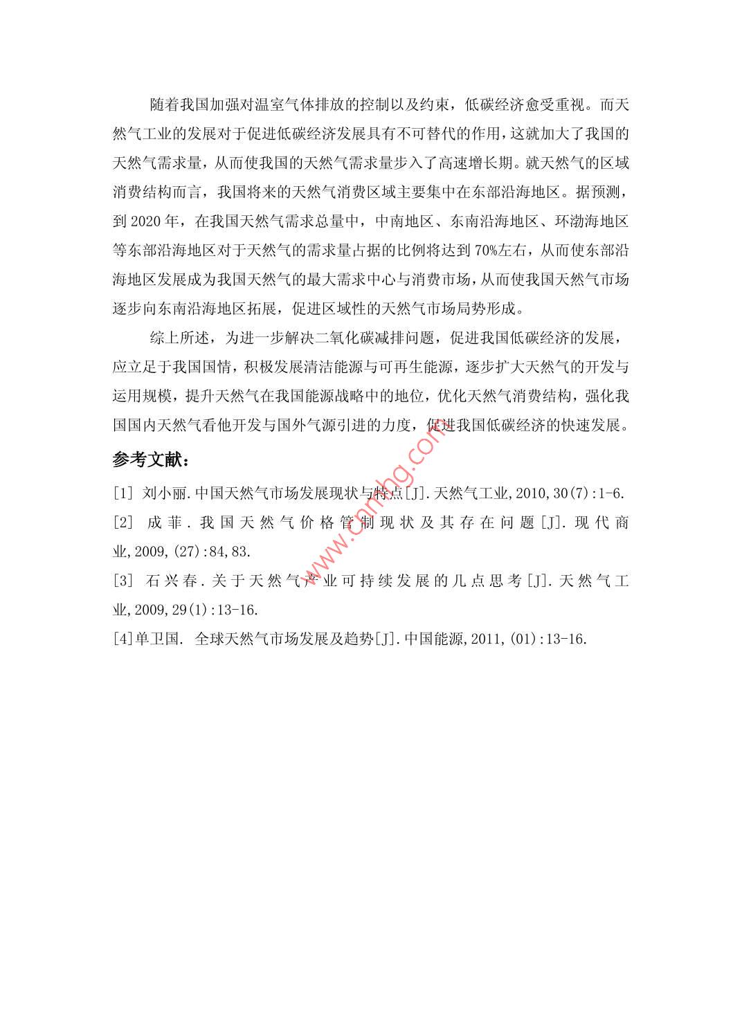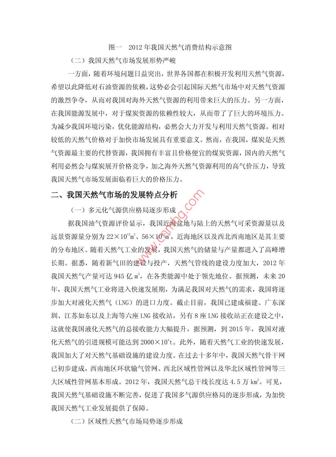 天然氣市場發(fā)展現(xiàn)狀與特點任雪雷華港燃?xì)饧瘓F(tuán)有限公司062552摘要:天然氣是世界各國爭相開發(fā)與利用的三大石化能源之一,它在環(huán)節(jié)環(huán)境污染問題,促進(jìn)低碳經(jīng)濟(jì)發(fā)展等方面發(fā)揮著重要作用。在我國當(dāng)前天然氣市場中天然氣的產(chǎn)量與儲量持續(xù)增長,但相較于國外而言,我國天然氣市場中出現(xiàn)了嚴(yán)重的供需缺口。因此,為了更好地幫助我國制定科學(xué)的天然氣發(fā)展規(guī)劃,有必要加強(qiáng)對我國天然氣市場發(fā)展?fàn)顩r進(jìn)行研究。本文以我國天然氣市場的發(fā)展現(xiàn)狀為著眼點,進(jìn)一步分析了我國天然氣市場發(fā)展的特點。關(guān)鍵詞:天然氣市場;發(fā)展現(xiàn)狀;特點中圖分類號:F407.22文獻(xiàn)標(biāo)識碼:A文章編號一、我國天然氣市場的發(fā)展現(xiàn)狀分析(一)天然氣消費(fèi)快速增長當(dāng)前,我國天然氣市場中,天然氣的消費(fèi)結(jié)構(gòu)與消費(fèi)量都產(chǎn)生了重大的變化。據(jù)統(tǒng)計,2012年,我國天然氣消費(fèi)量達(dá)1070億m,天然氣消費(fèi)快速增長。同時,隨著我國天然氣市場的不斷發(fā)展,我國天然氣消費(fèi)結(jié)構(gòu)由過去的單一的以化工或工業(yè)消費(fèi)為重心的結(jié)構(gòu)逐步轉(zhuǎn)變?yōu)槎嘣南M(fèi)結(jié)構(gòu)。據(jù)調(diào)査,在2012年的天然氣消費(fèi)結(jié)構(gòu)(如圖一所示)中,化工燃?xì)庀陆档?6%,城市燃?xì)?如商業(yè)、民用等)的比例增加了20%左右,發(fā)電用氣比重增加到10%左右,我國天然氣消費(fèi)結(jié)構(gòu)向多元化發(fā)展。隨著我國城市化進(jìn)程的加快,城市燃?xì)鈱⑹翘烊粴庀M(fèi)的主要增長領(lǐng)域。此外,隨著近年來的天然氣主干管道的建設(shè)力度增加,從而使天然氣供應(yīng)向著跨區(qū)供應(yīng)的方向發(fā)展,逐步形成了天然氣區(qū)域市場。化工原料工讓燃料圖一2012年我國天然氣消費(fèi)結(jié)構(gòu)示意圖二)我國天然氣市場發(fā)展形勢嚴(yán)峻一方面,隨著環(huán)境問題日益突出,世界各國都在積極開發(fā)利用天然氣資源,希望以此降低對石油資源的依賴,這勢必會引起國際天然氣市場中對天然氣資源的激烈爭奪,從而對我國對海外天然氣資源的利用帶來巨大的壓力。另一方面,在我國能源發(fā)展中,對于煤炭資源的依賴性較大,從而帶了了巨大的環(huán)境壓力。為減少我國環(huán)境污染,優(yōu)化能源結(jié)構(gòu),必然會大力開發(fā)與利用天然氣資源。相對較低的天然氣價格對于加快市場發(fā)展具有重要意義。然而,在我國,煤炭是天然氣資源最主要的代替資源,我國擁有豐富且價格便宜的煤炭資源,國內(nèi)的天然氣利用必然會與煤炭展開價格競爭,加之海外天然氣資源利用的高氣價壓力,導(dǎo)致我國天然氣市場發(fā)展面臨著巨大的價格壓力。、我國天然氣市場的發(fā)展特點分析(一)多元化氣源供應(yīng)格局逐步形成據(jù)我國油氣資源評價顯示,我國近海盆地與陸上的天然氣可采資源量以及遠(yuǎn)景資源量分別為22×10m3、56×10m3,近海地區(qū)以及西北西南地區(qū)是其主要的分布地區(qū)。隨著天然氣工業(yè)的發(fā)展,我國天然氣的儲量與產(chǎn)量都進(jìn)入了高峰增長期。據(jù)悉,隨著新氣田的建設(shè)與投產(chǎn),天然氣管線的建設(shè)力度加大,2012年我國天然氣產(chǎn)量可達(dá)945億m,在各類能源中處于領(lǐng)先地位。據(jù)預(yù)測,未來20年,我國天然氣工業(yè)將進(jìn)入快速發(fā)展期,為滿足我國對天然氣的需求,我國將逐步加大對液化天然氣(LNG)的進(jìn)口力度。截止目前,我國已建成福建、廣東深圳、江蘇如東以及上海等六座LNG接收站,另有8座LNG接收站正在建設(shè)之中,這就使我國液化天然氣的總接收能力大幅提升,據(jù)預(yù)測,到2015年,我國對液化天然氣的引進(jìn)規(guī)??赡苓_(dá)到2000×10t。此外,隨著天然氣工業(yè)的快速發(fā)展,我國加大了對天然氣基礎(chǔ)設(shè)施的建設(shè)力度。在過去十多年中,我國天然氣骨干網(wǎng)已初步建成,西南地區(qū)環(huán)狀輸氣管網(wǎng)、西北區(qū)域性管網(wǎng)以及華北區(qū)域性管網(wǎng)等三大區(qū)域性管網(wǎng)基本形成。2012年,我國天然氣總干線長度達(dá)4.5萬km2??梢?我國天然氣基礎(chǔ)設(shè)施不斷完善,促進(jìn)了我國多氣源供應(yīng)格局的逐步形成,為加快我國天然氣工業(yè)發(fā)展提供了保障。二)區(qū)域性天然氣市場局勢逐步形成隨著我國加強(qiáng)對溫室氣體排放的控制以及約束,低碳經(jīng)濟(jì)愈受重視。而天然氣工業(yè)的發(fā)展對于促進(jìn)低碳經(jīng)濟(jì)發(fā)展具有不可替代的作用,這就加大了我國的天然氣需求量,從而使我國的天然氣需求量步入了高速增長期。就天然氣的區(qū)域消費(fèi)結(jié)構(gòu)而言,我國將來的天然氣消費(fèi)區(qū)域主要集中在東部沿海地區(qū)。據(jù)預(yù)測,到2020年,在我國天然氣需求總量中,中南地區(qū)、東南沿海地區(qū)、環(huán)渤海地區(qū)等東部沿海地區(qū)對于天然氣的需求量占據(jù)的比例將達(dá)到70%左右,從而使東部沿海地區(qū)發(fā)展成為我國天然氣的最大需求中心與消費(fèi)市場,從而使我國天然氣市場逐步向東南沿海地區(qū)拓展,促進(jìn)區(qū)域