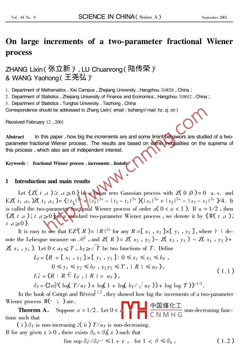 Vol.44 No.9SCIENCE IN CHINA( Series A)September 2001On large increments of a two- parameter fractional WienerprocessZHANG Lixin(張立新) , LU Chuanrong(陸傳榮}& WANG Yaohong(王堯弘)1. Department of Mathematics , Xixi Campus , Zhejiang University , Hangzhou 310028 , China ;2. Department of Statistics , Zhejiang University of Finance and Economics , Hangzhou 310012 , China ;3. Department of Statistics ,Tunghai University , Taizhong , ChinaCorrespondence should be adressed to Zhang Lixin( email : lxzhang@ mail. hz. zj. cn)Received February 12 ,2001AbstractIn this paper , how big the increments are and some liminf behaviors are studied of a two-parameter fractional Wiener process. The results are based on some inequalities on the suprema ofthis process , which also are of independent interest.Keywords : fractional Wiener process , increments , liminfs.1 Introduction and main resultsLet {Z(t ,s );t ,s≥0}be a mean zero Gaussian process with Z(0 0)=0 a.s. andEZ( t; si)z( t2 s2)={It|2a+ 1t2|2a- It2-t|2a }{|s|2a + Is2|2a-Is2- sμ|2a }/4. Itis called the two-parameter fractional Wiener process of order a(00 ,there exists θo= 0( ε ) such thatlimsup8δo/8d+1≤1+ε,for1<θ≤θo,(1.2)h→∞then1116SCIENCE IN CHINA( Series A)Vol.44lim supsupδr | W( R)1= lim sup supδr | W( R )|= 1 a.s.( 1.3)R∈ipT→∞R∈4Furthermore ,if( ii)lim{log T/ar)+ log1 + log br/ / ar )}loglogT=∞,thenlimsupδr|W叭R)1=limsupδr|W(R)|=1a.s.(1.4)下∞R∈LR∈年Lir 2] and Zhang'’ 41 studied the liminf's when condition( ii ) is not satisfied.Almost all results of Csorgo and Revest 11 on the increments of one- parameter W iener pro-cess were extended to other and more general one- parameter Gaussian processes( cf. refs.[ 5一8 ]). Also , some authors tried to extend Theorem A to other two- parameter Gaussian processes( cf. ref.[9]). But to the best of our knowledge , there were no pioneering results actually in-cluding Theorem A. Especially , the equalities in( 1.3 ) were not obtained for other two-parame-ter Gaussian processes. The purpose of this paper is to extend Theorem A to a two-parameterfractional Wiener process of order a. Our results read as follows.Theorem1. Let0< ar≤T and br ≥V T be two functions of T. Suppose that br isquasi-increasing ,i.e. for some co ,br, ≤cobr, for all T≤T2. Thenlim sup supδrZ( R )= lim sup supδτ | Z( R )|= 1 a.s.( 1.5)R∈lFurthermore , if condition( ii ) in Theorem A is satisfied , thenlim supδpZ( R )= lim supδr | Z( R)I= 1 a.s.( 1.6)Remark.In our Theorem 1 , conditions( i),( ii )and( 1.2 ) in Theorem A are not used.Also , the functions ar and br may be not non-decreasing.If condition( ii ) is not satisfied , we have the following result on the liminfs.Theorem 2. Let0< ar≤T and br≥V T be two non-decreasing functions of T. LetYτ = {2af( log( T/ar)+ log1 + log br/↓ar ))- logloglogT )}-1/2.Assume that Yτ and ar/ T are both non- increasing , and Yr satisfies condition( 1.2 ) , and thatlim inf.log T/ar)+ log1 + log br/V ar))= r>1.(ili')logloglogTIf r= +∞or00 , thenlim inf supYrZ( R )= lim inf supYr 1 Z( R)1= 1 a.s.R∈Take br= T and ar= T. From Theorems 1 and 2 , it follows thatCorollary 1. We havelim supZ( T,T)= lim supxy山_1a.s.V 27a loglogT一∞中國(guó)煤化工Z(x,y)CCH.CNMH G)1lim sup。sup= 1 a.s.y=T" / 472a loglogT°0∈x y≤" V 472° loglogT功≤Tlim inf sup=liminfsup.| Z(xry)II∞0σ≤ε≈°V 2 T2a loglogT0≤xvi≤T√2 T2a loglogT可=T炒y≤7The石涼整據(jù)Theorems 1 and 2 are based on the fllwing propositions.No.9ON LARGE INCREMENTS OF A TWO-PARAMETER FRACTIONAL WIENER PROCESS1117Proposition1. Let L* ={R=[x| x2]x[ y1ry2]:R∈Lj ,0≤x1≤x2≤VT }.Assume that0< ar≤T ,br≥V T. Then for any δ>0 ,there exists C= C( δ )> 0 ,such thatp{pz(?)E uais }呀}≤p{supZ( R )≤uaiy }≤exp{{-c(1v(2kexp{ --20u2}( 1.7)for any k large enough. Furthermore ,if0 0 , i.e. for some constant Co ,d(x )x≤co( y Vy" for all 0< x≤y. Then for any given ε >0 ,there exists C= C(ε )such thatPtsup | X(R)|≤ud(ar)}≥expT(1 + log,67)(1-<2+e)川},( 1.10)ar+.01小。for all u≥1 0