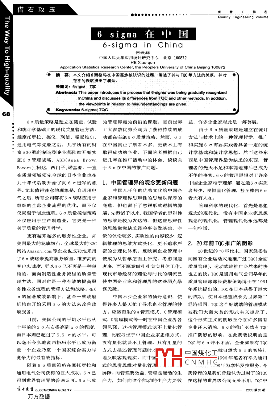 借石攻玉質量工程卷Quality Engineering Volume乏<-0工o6 sigma在中國6-sigma in China何曉群中國人民大學應用統(tǒng)計研究中心北京100872E Xiao-qun摘要:本文介紹6西格瑪在中國逐步被認識的過程,闡述了其與TQc等方法的關系,并對存在的誤區(qū)提出了看法關鑣詞:6s1 gma TOCAbstract This paper introduces the process that 6-sigma was being gradually recognizedin China and discusses its differences from toc and other methods. In additionthe viewpoints in relation to misunderstandings are givenKy。rds:6- sigma;T。c686σ質量策略是建立在測量、試驗為管理界最為前沿的課題。目前世界益,許多企業(yè)家對此是一籌莫展。和統(tǒng)計學基礎上的現(xiàn)代質量管理方法。上大多數(shù)優(yōu)秀公司為了獲得持續(xù)的成由于6σ質量策略是建立在統(tǒng)計·繼摩托羅拉、德儀、聯(lián)信、霍尼維爾、功都在實施6σ質量策略。然而,6σ方法與技術上的一種管理哲學,推廣·通用電氣等先驅之后,幾乎所有的財在中國真正了解者不多,更談不上有和實施6需要實踐者具備一定的統(tǒng)·富500強的制造型企業(yè)都陸續(xù)開始實取得成功的企業(yè)。下面筆者根據(jù)自己計學基礎和統(tǒng)計學思想。然而這些東施6σ管理戰(zhàn)略,ABB( Asea brown近幾年在推廣活動中的體會,談談關西是中國管理界最為缺乏的東西,管Boveri),柯達,西門子,諾基亞。一直于6a在中國的推廣問題。理者的先天不足和本能地排斥已成為在質量領域領先全球的日本企業(yè)也在不爭的事實。6σ的管理思想對于許多九十年代后期開始了向6進軍的旅1.中國管理界的觀念更新問題中國企業(yè)家難于理解,能吃透6實質程。尤其值得注意的現(xiàn)象是,自通用電中國幾千年的優(yōu)秀文化給中國企者甚少,畏懼量化管理,甚至棒擊6σ氣之后,所有公司都將6σ戰(zhàn)略應用于業(yè)家和管理界思辯性的思維以深厚的者大有人在組織的全部企業(yè)流程的優(yōu)化,而不僅底蘊,但也留下了忽視形式邏輯的弊管理科學的現(xiàn)代化,首先是思想僅局限于制造流程。6σ質量控制策略端。先秦諸子以來,我國學者的思辯性觀念的現(xiàn)代化,沒有中國企業(yè)家思想不僅應用于生產制造業(yè),它更是一種的思維是較為發(fā)達的,但這些思辯性觀念的現(xiàn)代化,管理現(xiàn)代化永遠都是關于質量的管理哲學的思維常常缺乏經(jīng)驗事實做基礎,空一句空話更有越來越多的服務性企業(yè),如談的議論較多,實質性的內容較少,邏美國最大的花旗銀行、全球最大的B2C輯推理的思維方式淡化,更不追求嚴2.20年前T0C推廣的陰影網(wǎng)站Amazon.com等企業(yè)也成功地采用密的公理化體系。反映到企業(yè)管理中20世紀的70年代末,國家經(jīng)委曾了6σ戰(zhàn)略來提高服務質量、維護高的便成為從哲學層面上研究、考慮問題向國有企業(yè)運動式地推廣過TQC(全面客戶忠誠度,所以6σ已不再是一種單者多,而不愿意做扎扎實實具體工作。質量管理),運動式地推廣必然來的快純的、面向制造性業(yè)務流程的質量管現(xiàn)代市場經(jīng)濟的理論與時代的潮流已也去的快。TQC是通用電氣公司早年的理方法,同時也是一種有效的提高服使中國企業(yè)家和管理界的這些弱點暴質量管理部部長費根堡姆博士在1961務性業(yè)務流程的管理方法和戰(zhàn)略。在6露無疑年系統(tǒng)提出的,TQC在日本獲得了巨大a的顯著成效影響下,甚至一些政府中國不少企業(yè)家的仙丹意識,使的成功,使日本迅速成長為世界第二機構也開始采用6σ的方法來改善政得許多人整天忙于尋求企業(yè)管理的妙經(jīng)濟強國。TQC這個好端端的管理模式府服務方。應運而生的A管理模式,C管理模被我們大轟大翁的形式主義扼殺了。目前,美國公司的平均水平已從式,D管理模式等一時在中國企業(yè)界各這個形式主義的陰影至今在許多國有十年前的3σ左右提高到5σ的程度,領風騷。這些管理模式談不上量化管企業(yè)還未消除,6σ的推廣必然有TQ而日本則已超過了5.5的水平??衫?比較習慣于中國企業(yè)家思維方式。推廣陰影的影響。在此我要說明的是以毫不夸張地說西格瑪水平已成為衡沒有量化就談不上管理。只有用量的TQC與6σ并不矛盾,企業(yè)如果有TQ量一個企業(yè)乃至一個國家綜合實力與方式去描述管理問題時中國煤化工就自然為60的實施打競爭力的最有效指標地反映客觀現(xiàn)實。而中隨著6σ質量策略在摩托羅拉和式的思辨思維對量化管THCNMHG1996年筆者有幸為通用年為摩托羅拉服務,令通用電氣公司獲得的巨大成功,6σ已屏障。向管理要效益,管理是能動的生我驚訝的是我們曾經(jīng)認為過時了的TQC得到世界管理界的普遍認可。6σ已成產力,如何向這個能動的生產力要效在這樣的世界級公司無處不用,TQC中黿尋履量 ELECTRONICS QUALITY質量工程卷借石攻玉Quality Engineering Volume·······●.·●●●的七種工具在今天的6σ管理策略中構的不規(guī)范操作,已使109000認證在下,許多大公司都在走下坡路,但韋爾o也是必不可少的常用工具。中國名聲不好。而且這方面存在著嚴奇的通用電氣近幾年的利潤平均兩位重的誤區(qū),許多企業(yè)認為IS09000就能數(shù)增長。中國企業(yè)家看到了正是從3.中國國有企業(yè)忙于改制代替TQC,只要通過了1S09000就一好1996年通用電氣實施了6的質量策中國的國有企業(yè)長期以來把政府百好,