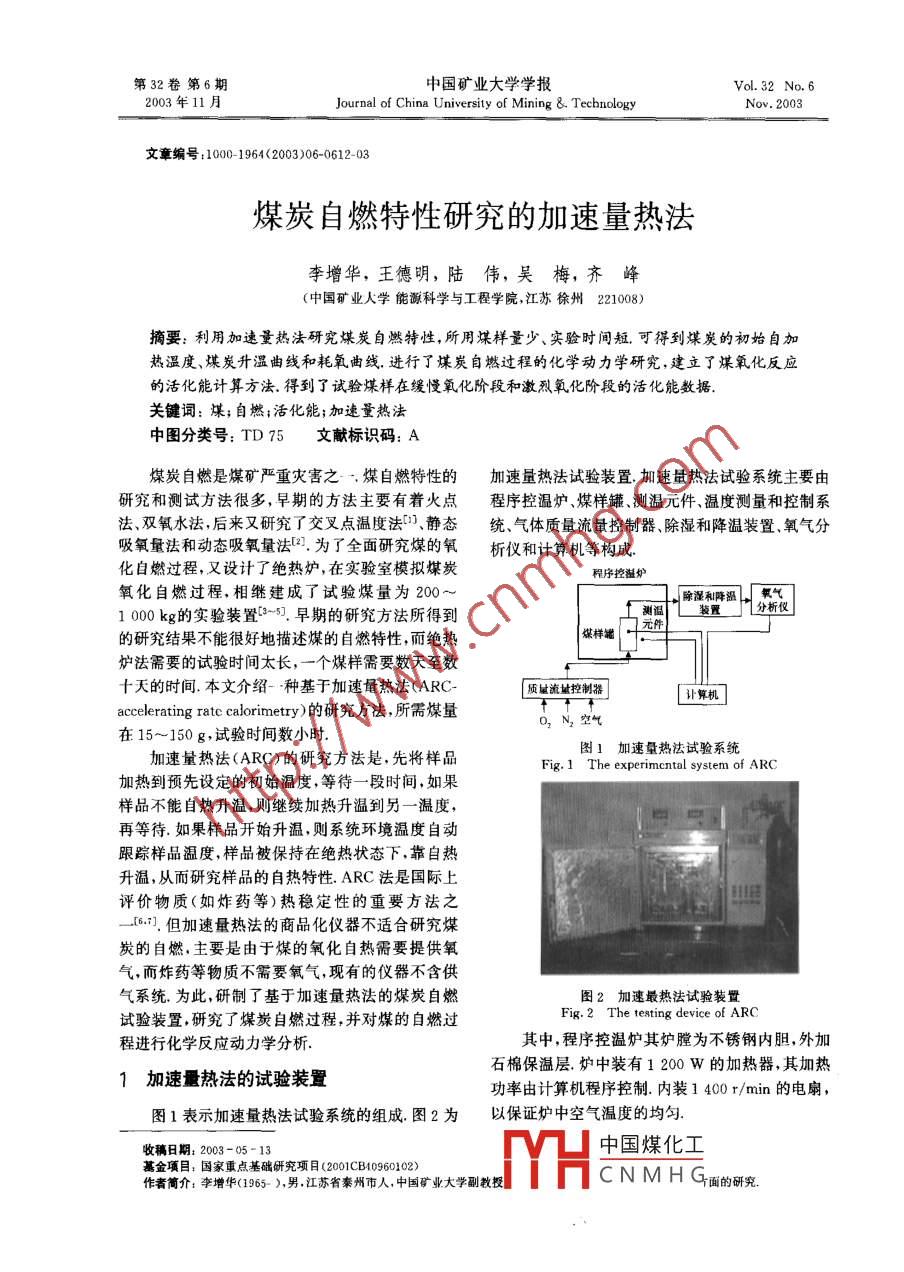 第32卷第6期中國礦業(yè)大學學報Vol. 32 No. 62003年11月Journal of China University of Mining &. TechnologyNov. 2003文章編號:1000-1964<2003)06-0612-03煤炭自燃特性研究的加速量熱法李增華,王德明,陸偉,吳梅,齊峰(中國礦業(yè)大學能源科學與工程學院,江蘇徐州221008)摘要:利用加速量熱法研究煤炭自燃特性,所用煤樣量少、實驗時間短.可得到煤炭的初始自加熱溫度、煤炭升溫曲線和耗氧曲線.進行了煤炭自燃過程的化學動力學研究,建立了煤氧化反應的活化能計算方法.得到了試驗煤樣在緩慢氧化階段和激烈氧化階段的活化能數(shù)據(jù).關鍵詞:煤;自燃;活化能;加速量熱法中圖分類號: TD 75文獻標識碼: A煤炭自燃是煤礦嚴重災害之-. 煤自燃特性的加速:量熱法試驗裝置.加速量熱法試驗系統(tǒng)主要由研究和測試方法很多,早期的方法主要有著火點程序控溫爐、煤樣罐、測溫元件、溫度測量和控制系法、雙氧水法,后來又研究了交叉點溫度法以、靜態(tài)統(tǒng)、氣體質(zhì)量流量控制器、除濕和降溫裝置、氧氣分吸氧量法和動態(tài)吸氧量法[2].為了全面研究煤的氧析儀和計算札等構成.化自燃過程,又設計了絕熱爐,在實驗室模擬煤炭程序控溢爐氧化自燃過程,相繼建成了試驗煤量為200~ .除濕利降溫,氣測溫轉(zhuǎn)置中分析儀1000kg的實驗裝置B~-5.早期的研究方法所得到元件的研究結果不能很好地描述煤的自燃特性,而絕熱煤樣錯爐法需要的試驗時間太長,一個煤樣需要數(shù)天至數(shù)十天的時間本文介紹- .種基于 加速量熱法(ARC-[質(zhì)城流址控制器][訃算機]accelerating ratc calorimetry)的研究方法,所需煤量0, N,空氣在15~150 g,試驗時間數(shù)小時.圖]加速 量熱法試驗系統(tǒng)加速量熱法(ARC)的研究方法是,先將樣品Fig. 1 The experimcntal system of ARC加熱到預先設定的初始溫度,等待一段時間,如果樣品不能自熱升溫,則繼續(xù)加熱升溫到另--溫度,再等待.如果樣品開始升溫,則系統(tǒng)環(huán)境溫度自動跟蹤樣品溫度,樣品被保持在絕熱狀態(tài)下,靠自熱升溫,從而研究樣品的自熱特性.ARC法是國際上業(yè)日路評價物質(zhì)(如炸藥等)熱穩(wěn)定性的重要方法之-L[.7.但加速量熱法的商品化儀器不適合研究煤炭的自燃,主要是由于煤的氧化自熱需要提供氧氣,而炸藥等物質(zhì)不需要氧氣,現(xiàn)有的儀器不含供氣系統(tǒng).為此,研制了基于加速量熱法的煤炭自燃圖2加速最熱法試驗裝置試驗裝置,研究了煤炭自燃過程,并對煤的自燃過Fig.2 The testing device of ARC程進行化學反應動力學分析.其中,程序控溫爐其爐膛為不銹鋼內(nèi)膽,外加石棉保溫層.爐中裝有1200w的加熱器,其加熱1加速量熱法的試驗裝置功率由計算機程序控制.內(nèi)裝1 400 r/min的電扇,圖1表示加速量熱法試驗系統(tǒng)的組成.圖2為以保證爐中空氣溫度的均勻.收稿日期: 2003-05-13中國煤化工基金項目:國家重點基礎研究項日(2001CB10960102)作者簡介:李增華(1965- ),男,江蘇省秦州市人,中國礦業(yè)大學副教授,MYHCNMHG面的研究。第6期李增華等:煤炭自燃特性研究的加速量熱法613程序控溫爐的溫度控制方式有:1)恒溫,爐溫無明顯變化,此后開始下降,煤耗氧增加.從保持在計算機設定的溫度,控溫精度為士0.1C;885 min(煤溫170 C)開始氧氣濃度直線下降,在2)程序升溫,爐溫可按照設定的溫度程序自動升5 min時間內(nèi)氧氣濃度從17%降低至4. 3%.溫,最大升溫速率為20 C /min;3)跟蹤控制,爐溫25始終跟隨煤樣罐內(nèi)的溫度變化,此時煤樣罐和外界沒有溫差,處于絕熱狀態(tài).; 10煤樣罐采用鑄銅結構,密封材料為聚四氟乙烯,能耐350C以上的高溫,并在其內(nèi)部安裝精密0200 400 ,600 800 100鉑電阻感溫元件.氧氣分析儀為電化學式氧氣在線監(jiān)測儀.測量圖4氧氣濃度變化曲線Fig.4 The curve of oxygen concentration versus time范圍0.5 %~30 %.氣體流量控制采用質(zhì)量流量控制器,流量范圍3煤樣自燃過程的化學動力學分析為10~4 000 mL/min.可單獨供氧氣、氮氣或者空氣,也可以同時通人氧氣和氮氣,調(diào)節(jié)氧氣和氮氣煤的氧化反應方程式為煤+O2-→產(chǎn)物+Q,的流量,可獲得不同氧氣濃度的混合氣體,從而研究煤樣在不同氧氣濃度下的氧化情況.式中:Q為氧化反應熱,J/mol.根據(jù)化學反應動力學理論可知,且在煤的初期2試驗過程及結果自熱階段,煤量消耗很少,可視為常數(shù),因此化學反試驗煤樣來自神木東勝煤田,將煤樣破碎,篩應速度方程為(1)取粒徑為0.4 ~0.5 mm的煤樣,稱取18g,裝人煤樣罐.空氣流量為1100 mL/min.圖3為爐溫和式中:V為化學反應速度,mol/(m'●s);n為反應煤溫變化曲線.級數(shù);ko為指數(shù)前因子,m30-1)/(mol-1 .s);co,為250氧氣濃度, mol/m';T為煤溫,K;E為活化能,200 罐J/mol;R氣體常數(shù),8.314 J/(mol. K).100 z煤氧化反應的放熱速度為q=VQ=Qkc", exp(- E/RT).8 400 600 800 To00在絕熱條件' F ,煤的氧化熱使煤溫升高.因此t /minq=cpdT/d,圖3爐溫和煤溫 曲線rig.3 The curves of the oven and coal式中:q為單位體積內(nèi)氧化反應的放熱速率,temperature versus timeJ/(m* . s);c為煤的比熱容,J/(kg●K);p為煤的先將爐溫的控制方式設定為恒溫控制,初始溫密度,kg/m*;T為溫度,K;t為時間,s.度設為90 C,從圖3可見,煤溫逐漸上升,直至因此有90C,但在60min內(nèi)沒有進一步升高.將爐溫升Qkc6,exp(- E/RT)= cpdT/dt,高到95 C,煤溫逐漸上升,直至95 C,也沒有進-兩邊取對數(shù),有步升高.用相同的方法將爐溫分別升高到100,105 C,