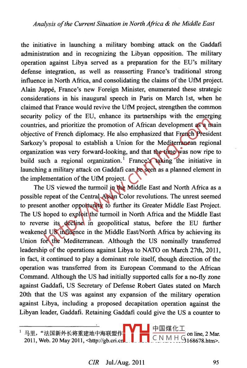 Analysis of the Current Situation in North Africa & the Middle EastAnalysis of the Current Situation in NorthAfrica & the Middle EastLin Hongyu Li Xiaosan'Abstract: After the upsurge of domestic turmoil in Tunis last December,unrest spread rapidly through North Africa and the Middle East, having aprofound effect on current international relations. It will continue to affectrelations between the major powers and the international system as awhole for some time to come. The regional turmoil of North Africa and theMiddle East is of particular interest to International Political Economy (IPE)studies. It seems to embody a geostrategic conflict between the US andthe EU in contending for leadership in North Africa and the Middle East. Itis also an expression of the competition for dominance of the globalfinancial structure between the major powers during a period of transitionin the international system. Lastly, it is a manifestation of America'sstruggle to maintain its global economic hegemony.ince the first outbreak of turmoil in Tunis last December, the Ben AliSiregime in Tunisia and Mubarak regime in Egypt have beenoverturned. Protests and turmoil spread successively to Algeria, Syria,Yemen, Bahrain, Jordan and Morocco, and Libya has collapsed into civilwar. The regional situation in North Africa and the Middle East hasbecome extremely unstable.Geostrategic Conflict between the US and the EU inContending for Leadership in North Africa and theMiddle EastThe Middle East (including some parts of North Africa) is the area of中國煤化工* Dr. Lin Hongyu is a Professor at the Univ二lations, Beijing.Li Xiaosan is a postgraduate in interMYHCN MH G University ofInternational Relations.CIR Jul./Aug. 201193Lin Hongyu Li Xiaosanmost important geostrategic significance for the US. Since the collapse ofthe Bretton Woods System in the 1970s, the economic underpinning ofAmerican hegemony has been transferred from a Gold-Dollar to anOil-Dollar base. Controlling the politics of the Middle East was the basisfor the Oil-Dollar system. When the Cold War ended, the significance ofthe Middle East increased further, as manifested by the two wars againstIraq initiated by the Bush family. America's geopolitical barycenter shiftedfrom Westerm Europe to the Middle East in the post-Cold War era. Afterthe 9/11 terrorist attacks, the Bush administration exploited the War onTerror to advance its Greater Middle East Project. While the Marshall Planhad aimed at maintaining control of Western Europe in the bipolar ColdWar global system, the purpose of this Greater Middle East Project is tomaintain America's dominance in the Middle EastNorth Africa region.North Africa, lying across the Mediterranean from Europe, is theEU's backyard, and its gateway into the rest of Africa. It is also one of thethree main sources of the EU's oil imports. To boost its influence in thisregion, France, on behalf of the EU, took the lead in proposing the Unionfor the Mediterranean (UfM) in 2008, which also includes some parts ofthe Middle East. After the Treaty of Lisbon was passed by the EU memberstates in 2009, the EU accelerated its implementation of the UfM. Americafelt its own position in the region threatened by this initiative. Geostrategicconflict between the US and the EU helped to make the recent turmoil inNorth Africa and the Midle East inevitable.Libya was always a likely intersection between the Greater MiddleEast Project and the Union for the Mediterranean. It was one of the onlycountries to refuse to support the Greater Middle East Project (FormerEgyptian President Hosni Mubarak and the King of Saudi Arabia alsoopposed the plan), and also opposed the Ufm. The Libyan leader, Gaddafi,publicly denounced the UfM, saying that it attempted to undermine theunity of the Arab world and the African countries. Therefore, the US andthe EU found a common cause in attacking the Gaddafi administration.Due to the impact of the international financial crisis and the EU'ssovereign debt crisis, France and thMYH中國煤化工vere anxious tostabilize the Mediterranean region ac N M H Gus, France took94CIR Vol.21 No. 4Analysis of the Current Situation in North Africa & the Middle Eastthe initiative in launching a military bombing attack on the Gaddafiadministration and in recognizing the Libyan opposition. The militaryoperation against Libya served as a preparation for the EU's militarydefense integration, as well as reasserting France's traditional stronginfluence in North Africa, and consolidating the claims of the UfM project.Alain Juppe, France's new Foreign Minister, enumerated these strategicconsiderations in his inaugural speech in Paris on March lst, when heclaimed that France would revive the UfM project, strengthen the commonsecurity policy of the EU, enhance its partnerships with the emergingcountries, and prioritize the promotion of A frican development as a mainobjective of French diplomacy. He also emphasized that French PresidentSarkozy's proposal to establish a Union for the Mediterranean regionalorganization was very forward-looking, and that the time was now ripe tobuild such a regional organization. France's taking the initiative inlaunching a military attack on Gaddafi can be seen as a planned element inthe implementation of the UfM project.The US viewed the turmoil in the Middle East and North Africa as a .possible repeat of the Central Asian Color revolutions. The unrest seemedto present another opportunity to further its Greater Middle East Project.The US hoped to exploit the turmoil in North Africa and the Middle Eastto reverse its decline in geopolitical status, before the EU furtherweakened US influence in the Middle EastNorth Africa by achieving itsUnion for the Mediterranean. Although the US nominally transferredleadership of the operations against Libya to NATO on March 27th, 2011,in fact, it continued to play a dominant role itself, though direction of theoperation was transferred from its European Command to the Africa