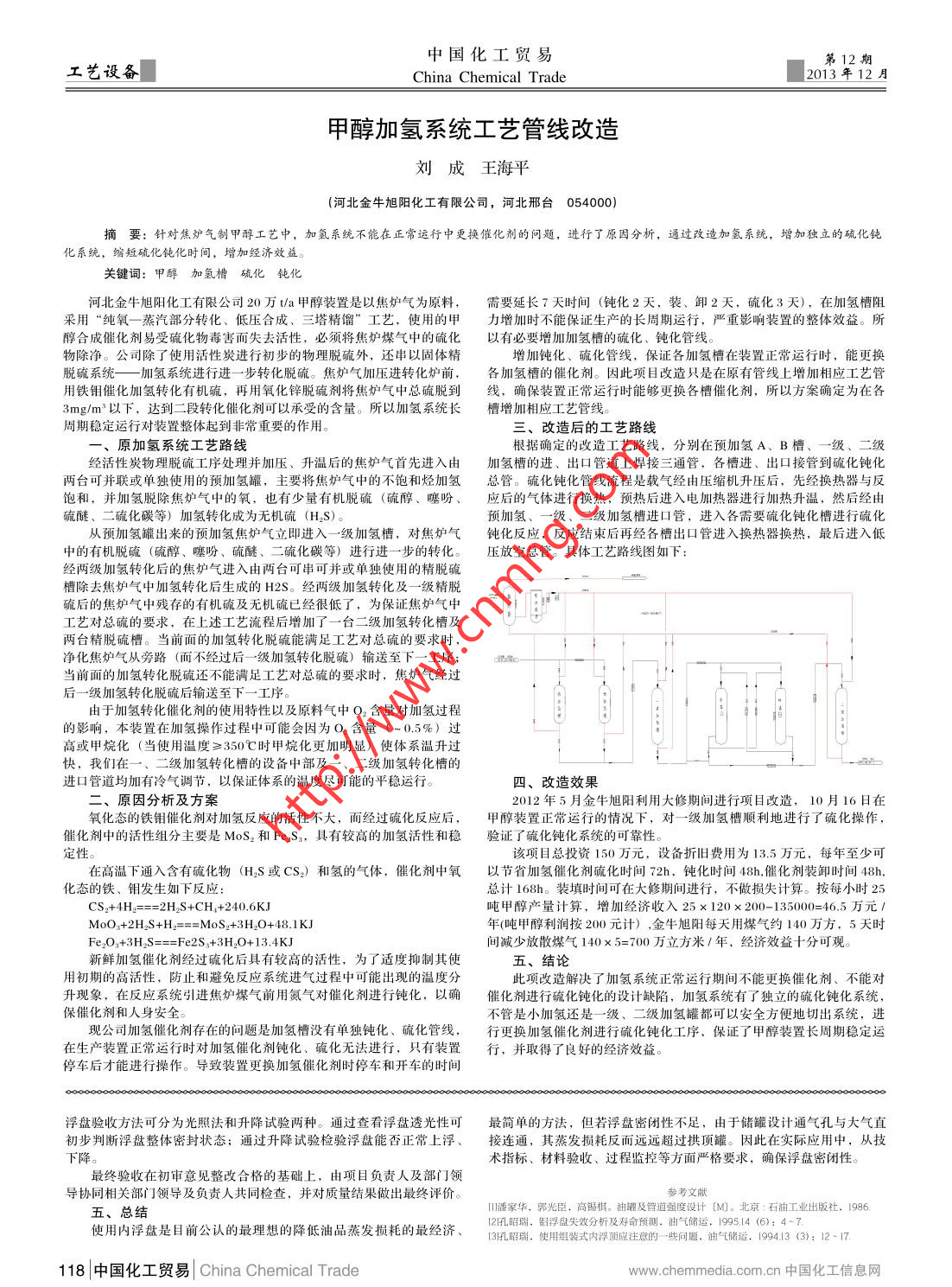 中國化工貿易第12期工藝設備China Chemical Trade2013年12月甲醇加氫系統(tǒng)工藝管線改造劉成王海平(河北金牛旭陽化工有限公司,河北邢臺054000)摘要:針對焦爐氣制甲醇工藝中,加氫系統(tǒng)不能在正常運行中更換催化劑的問題,進行了原因分析,通過改造加氫系統(tǒng),增加獨立的硫化鈍化系統(tǒng),縮短硫化鈍化時間,增加經(jīng)濟效益。關鍵詞:甲醇加氫槽硫化鈍化河北金牛旭陽化工有限公司20萬t/a甲醇裝置是以焦爐氣為原料,需要延長 7天時間(鈍化2天, 裝、卸2天,硫化3天),在加氫槽阻采用“純氧一蒸汽部分轉化、低壓合成、三塔精餾”工藝,使用的甲力增加時不能保證生產的長周期運行,嚴重影響裝置的整體效益。所醇合成催化劑易受硫化物毒害而失去活性,必須將焦爐煤氣中的硫化以有必要增加加氫槽的硫化、鈍化管線。物除凈。公司除了使用活性炭進行初步的物理脫硫外,還串以固體精增加鈍化、硫化管線,保證各加氫槽在裝置正常運行時,能更換脫硫系統(tǒng)一加氫系統(tǒng)進行進一 - 步轉化脫硫。焦爐氣加壓進轉化爐前,各加氫槽的催化劑。因此項目改造只是在原有管線上增加相應工藝管用鐵鉬催化加氫轉化有機硫,再用氧化鋅脫硫劑將焦爐氣中總硫脫到線, 確保裝置正常運行時能夠更換各槽催化劑,所以方案確定為在各3mg/m3以下,達到二段轉化催化劑可以承受的含量。所以加氫系統(tǒng)長槽增 加相應工藝管線。周期穩(wěn)定運行對裝置整體起到非常重要的作用。三、改造后的工藝路線一、 原加氫系統(tǒng)工藝路線.根據(jù)確定的改造工藝路線,分別在預加氫A、B槽、一級、二級經(jīng)活性炭物理脫硫工序處理并加壓、升溫后的焦爐氣首先進入由加氫槽的進、出口管道上焊接三通管,各槽進、出口接管到硫化鈍化兩臺可并聯(lián)或單獨使用的預加氫罐,主要將焦爐氣中的不飽和烴加氫總管。硫化鈍化管線流程是載氣經(jīng)由壓縮機升壓后,先經(jīng)換熱器與反飽和,并加氫脫除焦爐氣中的氧,也有少量有機脫硫(硫醇、噻吩、應后的氣體進行換熱,預熱后進入電加熱器進行加熱升溫,然后經(jīng)由硫醚、二硫化碳等)加氫轉化成為無機硫(H2S)。從預加氫罐出來的預加氫焦爐氣立即進入- -級加氫槽,對焦爐氣鈍化反 應,反應結束后再經(jīng)各槽出口管進入換熱器換熱,最后進入低中的有機脫硫(硫醇、 噻吩、硫醚、二硫化碳等)進行進一步的轉化。 壓放空總管。 具體工藝路線圖如下:經(jīng)兩級加氫轉化后的焦爐氣進入由兩臺可串可并或單獨使用的精脫硫槽除去焦爐氣中加氫轉化后生成的H2S。經(jīng)兩級加氫轉化及-級精脫碗后的焦爐氣中殘存的有機碗及無機硫已經(jīng)很低了,為保證焦爐氣中自曬下工藝對總硫的要求,在上述工藝流程后增加了一臺二級加氫轉化槽及兩臺精脫硫槽。當前面的加氫轉化脫硫能滿足工藝對總硫的要求時,凈化焦爐氣從旁路(而不經(jīng)過后- -級加氫轉 化脫硫)輸送至下一-工序;當前面的加氫轉化脫硫還不能滿足工藝對總硫的要求時,焦爐氣經(jīng)過后一級加氫轉化脫硫后輸送至下一-工序。由于加氫轉化催化劑的使用特性以及原料氣中O2含量對加氫過程的影響,本裝置在加氫操作過程中可能會因為O2含量(~0.5%)過高或甲烷化(當使用溫度≥350C時甲烷化更加明顯)使體系溫升過快,我們在一、二級加氫轉化槽的設備中部及一-、二級加氫轉化槽的進口管道均加有冷氣調節(jié),以保證體系的溫度盡可能的平穩(wěn)運行。四、改造效果二、原因分析及方案2012年5月金牛旭陽利用大修期間進行項目改造,10月 16日在.氧化態(tài)的鐵鉬催化劑對加氫反應的活性不大,而經(jīng)過硫化反應后,甲醇裝置正常運行的情況下,對一級加氫槽順利地進行了硫化操作,催化劑中的活性組分主要是MoS2和FesSa,具有較高的加氫活性和穩(wěn)驗證了硫化鈍化系統(tǒng)的可靠性。定性。該項目總投資150 萬元,設備折舊費用為13.5萬元,每年至少可在高溫下通入含有硫化物(H2S或CS2)和氫的氣體,催化劑中氧以節(jié)省加氫催化劑硫化時間72h,鈍化時間48h,催化劑裝卸時間48h,化態(tài)的鐵、鉬發(fā)生如下反應: .總計168h。裝填時間可在大修期間進行,不做損失計算。按每小時25CS+4H===2H2S+CH.+240.6KJ噸甲醇產量計算,增加經(jīng)濟收入25 x 120 x 200-135000=46.5萬元/MoO.+2H2S+Hz=== MoS:+3H2O+48.1KJ年(噸甲醇利潤按200元計) ,金牛旭陽每天用煤氣約140萬方,5天時Fe2O+3HsS===Fe2S+3H20+13.4KJ間減少放散煤氣140x 5=700萬立方米1年,經(jīng)濟效益十分可觀。新鮮;加氫催化劑經(jīng)過硫化后具有較高的活性,為了適度抑制其使五、結論用初期的高活性,防止和避兔反應系統(tǒng)進氣過程中可能出現(xiàn)的溫度分此項改造解決了加氫系統(tǒng)正常運行期間不能更換催化劑、不能對升現(xiàn)象,在反應系統(tǒng)引進焦爐煤氣前用氮氣對催化劑進行鈍化,以確催化劑進行硫化鈍化的設計缺陷,加氫系統(tǒng)有了獨立的硫化鈍化系統(tǒng),保催化劑和人身安全。不管是小加氫還是- -級、 二級加氫罐都可以安全方便地切出系統(tǒng),進現(xiàn)公司加氫催化劑存在的問題是加氫槽沒有單獨鈍化、硫化管線,行更換加氫催化劑進行硫化鈍化工序,保證了甲醇裝置長周期穩(wěn)定運在生產裝置正常運行時對加氫催化劑鈍化、硫化無法進行,只有裝置行, 并取得了良好的經(jīng)濟效益