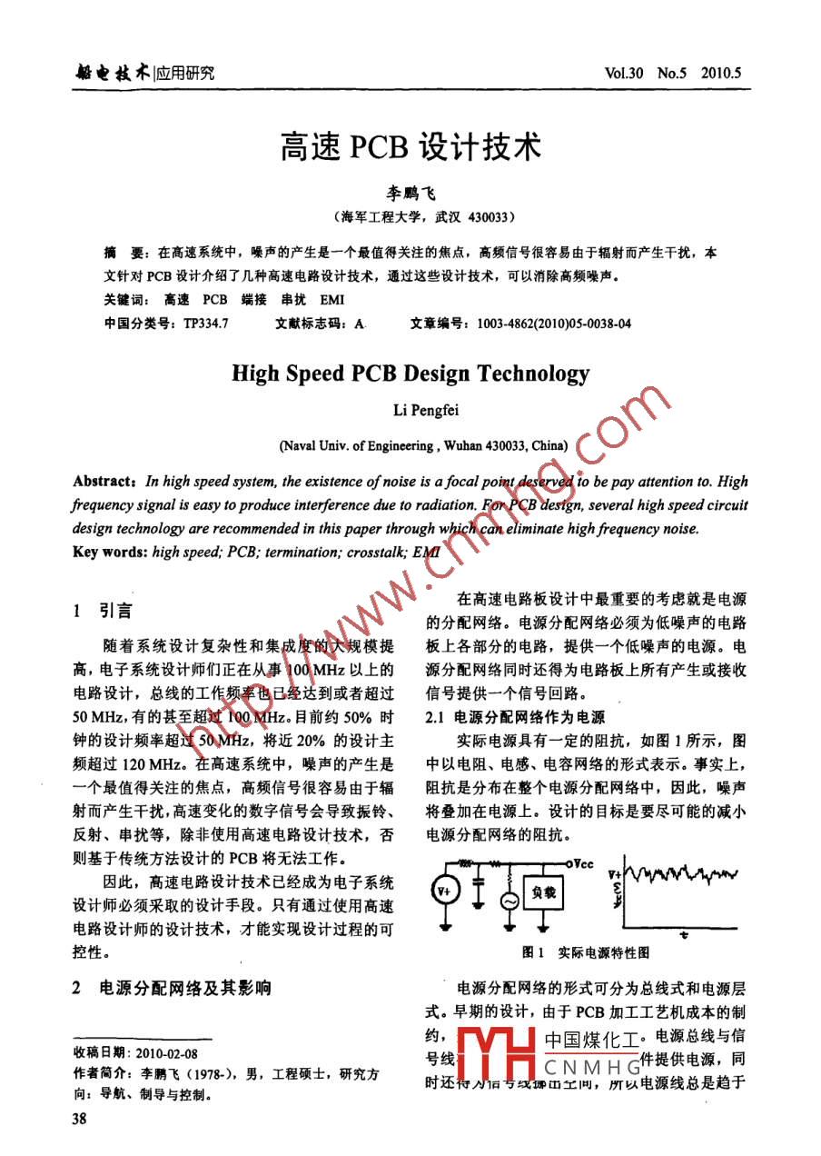 船電技術(shù)|應(yīng)用研究VoL.30 No.5 2010.5高速PCB設(shè)計(jì)技術(shù)李鵬飛(海軍工程大學(xué),武漢430033)摘要:在高速系統(tǒng)中,噪聲的產(chǎn)生是-一個(gè)最值得關(guān)注的焦點(diǎn),高頻信號(hào)很容易由于輻射而產(chǎn)生干擾,本文針對(duì)PCB設(shè)計(jì)介紹了幾種高速電路設(shè)計(jì)技術(shù),通過(guò)這些設(shè)計(jì)技術(shù),可以消除高頻噪聲.關(guān)鍵詞:高速PCB端接串?dāng)_EMI中國(guó)分類(lèi)號(hào): TP334.7文獻(xiàn)標(biāo)志碼: A.文章編號(hào): 1003-4862(2010)05-0038-04High Speed PCB Design TechnologyLi Pengfei(Naval Univ. of Engineering , Wuhan 430033, China)Abstract: In high speed system, the existence of noise is a focal point deserved to be pay attention to. Highfrequency signal is easy to produce interference due t0 radiation. For PCB design, several high speed circuitdesign technology are recommended in this paper through which can eliminate high frequency noise.Key words: high speed; PCB,; termination; crosstalk; EMI在高速電路板設(shè)計(jì)中最重要的考慮就是電源1引言的分配網(wǎng)絡(luò)。電源分配網(wǎng)絡(luò)必須為低噪聲的電路隨著系統(tǒng)設(shè)計(jì)復(fù)雜性和集成度的大規(guī)模提板.上各部分的電路,提供-一個(gè)低噪聲的電源。電高,電子系統(tǒng)設(shè)計(jì)師們正在從事100 MHz以上的源分配網(wǎng)絡(luò)同時(shí)還得為電路板上所有產(chǎn)生或接收電路設(shè)計(jì),總線(xiàn)的工作頻率也已經(jīng)達(dá)到或者超過(guò)信號(hào)提供一個(gè)信號(hào)回路。50MHz,有的甚至超過(guò)100MHz.目前約50%時(shí)2.1電源分配網(wǎng)絡(luò)作為電源鐘的設(shè)計(jì)頻率超過(guò)50 MHz,將近20%的設(shè)計(jì)主實(shí)際電源具有一定的阻抗,如圖1所示,圖頻超過(guò)120 MHz。在高速系統(tǒng)中,噪聲的產(chǎn)生是中以電阻、電感、電容網(wǎng)絡(luò)的形式表示。事實(shí)上,-一個(gè)最值得關(guān)注的焦點(diǎn),高頻信號(hào)很容易由于輻阻抗是分布在整個(gè)電源分配網(wǎng)絡(luò)中,因此,噪聲射而產(chǎn)生干擾,高速變化的數(shù)字信號(hào)會(huì)導(dǎo)致振鈴、將疊加在電源上。設(shè)計(jì)的目標(biāo)是要盡可能的減小反射、串?dāng)_等,除非使用高速電路設(shè)計(jì)技術(shù),否電源分配網(wǎng)絡(luò)的阻抗。則基于傳統(tǒng)方法設(shè)計(jì)的PCB將無(wú)法工作。oVcc因此,高速電路設(shè)計(jì)技術(shù)已經(jīng)成為電子系統(tǒng)設(shè)計(jì)師必須采取的設(shè)計(jì)手段。只有通過(guò)使用高速↓電路設(shè)計(jì)師的設(shè)計(jì)技術(shù),才能實(shí)現(xiàn)設(shè)計(jì)過(guò)程的可↓↓控性。圖1實(shí)際電源特 性圖.2電源 分配網(wǎng)絡(luò)及其影響電源分配網(wǎng)絡(luò)的形式可分為總線(xiàn)式和電源層式。早期的設(shè)計(jì),由于PCB加工工藝機(jī)成本的制約,中國(guó)煤化工.電源總線(xiàn)與信收稿日期: 2010-02-08號(hào)線(xiàn)M.HCNMH G件提供電源,同作者簡(jiǎn)介:李鵬飛(1978-), 男,工程碩士,研究方時(shí)還待為舊號(hào)線(xiàn)擁中工間,所以電源線(xiàn)總是趨于向:導(dǎo)航、制導(dǎo)與控制。38V.l.30 No.5 2010.5船電技術(shù)|應(yīng)用研究長(zhǎng)且細(xì)的帶狀線(xiàn)。這就相當(dāng)于電源線(xiàn)上串有一個(gè)小。如果傳輸線(xiàn)和負(fù)載端的阻抗不匹配,那么輸小電阻,盡管這個(gè)電阻很小,但它的影響卻很大。出的電流信號(hào)和信號(hào)最終的穩(wěn)定狀態(tài)將不同,這而對(duì)于電源層式的電源分配方案由于電源通過(guò)整就引起信號(hào)在接收端產(chǎn)生反射,這個(gè)反射信號(hào)將個(gè)層的金屬來(lái)分配電源,其電源阻抗會(huì)小得多,傳回信號(hào)發(fā)射端并再次反射回來(lái)。隨著能量的減所以電源噪聲也會(huì)比總線(xiàn)式的小得多。弱反射信號(hào)的幅度將減小,直到信號(hào)的電壓和電單電源層并不能消除電源的線(xiàn)路噪聲,因?yàn)榱鬟_(dá)到穩(wěn)定。.所有的系統(tǒng)產(chǎn)生足夠引起問(wèn)題的噪聲,不管采用3.1端接哪種電源分配方案,電源線(xiàn)路都需要抑制噪聲的傳輸線(xiàn)產(chǎn)生反射,導(dǎo)致信號(hào)失真,在負(fù)載端濾波。通常使用去藕電容來(lái)濾波,一般的,放置產(chǎn)生振鈴,使系統(tǒng)速度變慢,,所以需要-種技術(shù)一個(gè)1~10μF的去藕電容在電源接入電路板處,來(lái)消除,至少減小這個(gè)反射。由于反射在Zo=Zi濾除低頻噪聲;放置-一個(gè)0.01~0.1 μF的去藕電時(shí),才能消除,所以可以通過(guò)在負(fù)載端并聯(lián)- -個(gè)容在板上每- -個(gè)有源器件的電源管腳處,濾除高電阻來(lái)減小負(fù)載阻抗到Zr= Zo以消除第一次反射頻噪聲。一這種方 法稱(chēng)為并聯(lián)端接。也可以通過(guò)在輸出2.2電源分配網(wǎng)絡(luò)作為信號(hào)回路端串聯(lián)一個(gè)電阻來(lái)增加源阻抗到Zs= Zo以消除第信號(hào)開(kāi)關(guān)時(shí)能量的產(chǎn)生是高速電路中產(chǎn)生噪二次反射一-這種方法稱(chēng)為 串聯(lián)端接。聲的根源。任一信號(hào)的開(kāi)關(guān),都產(chǎn)生一個(gè)交流電并聯(lián)端接如圖2.a所示,由于輸入阻抗往往流,而電流需要一個(gè)回路,信號(hào)的回路可由VCC都很高,所以通常使R-=Zo,這種方法有一個(gè)缺或地提供。信號(hào)線(xiàn)與信號(hào)回路構