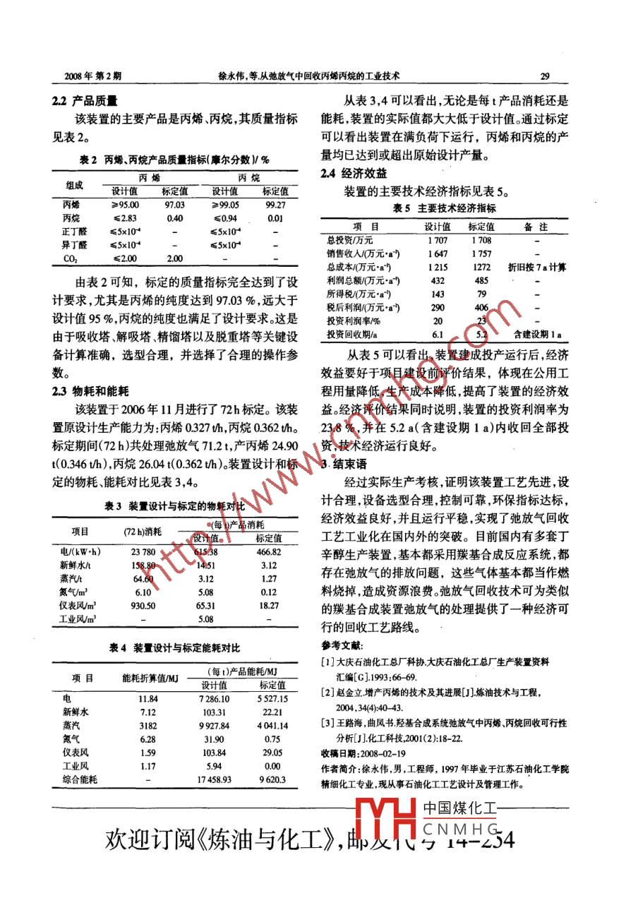 煉油與化工2008年第2期REFINING AND CHEMICAL INDUSTRY從弛放氣中回收丙烯丙烷的工業(yè)技術(shù)徐永偉,黃小科(大慶石化工程有限公司,黑龍江大慶163714)摘要:在實驗室回收丙烯丙烷技術(shù)的基礎(chǔ)上,進(jìn)行了工業(yè)化實踐通過吸收解吸和精餾等工藝過程,冋收丁辛醇裝置弛放氣中的丙烷丙烯減少資源浪費實現(xiàn)了資源的合理利用。關(guān)鍵詞:弛放氣;回收;丙烯;丙烷中圖分類號:TQ22文獻(xiàn)標(biāo)識碼:B文章編號:1671-4962(20080-0027-03大慶石化公司化工二廠丁辛醇裝置采用低壓驗室回收技術(shù)試驗結(jié)果的基礎(chǔ)上,進(jìn)行了弛放氣羰基合成技術(shù)生產(chǎn)丁辛醇。技術(shù)工藝是以丙烯和回收裝置的工業(yè)化設(shè)計。裝置弛放氣設(shè)計處理能力合成氣為原料反應(yīng)生成正、異丁醛,在此過程中有為68ka,回收丙烯和丙烷量為55ka,操作時少量的丙烯轉(zhuǎn)化為丙烷叫為了防止丙烷等惰性組間為8000ha分的積累,需要將一部分的氣體(簡稱弛放氣)從弛放氣回收工藝在國內(nèi)外還沒有相同或類似系統(tǒng)循環(huán)回路中連續(xù)排出。弛放氣中含有大量的的工業(yè)應(yīng)用,尚屬首例丙烷和丙烯(分別占3891%和4581%)由于弛1生產(chǎn)方法與工藝路線放氣組分復(fù)雜,難以處理,過去處理弛放氣的方法11生產(chǎn)方法是直接排入燃料氣管網(wǎng)作為燃料燒掉,造成了資源該工藝采用吸收、解吸、精餾技術(shù)回收弛放氣的浪費。為回收丙烷、丙烯,在大慶化工研究中心實中的丙烯丙烷,從而得到丙烯丙烷等產(chǎn)品。表2脫硫前后柴油的烴類組成分析結(jié)果/%4結(jié)論分析項目脫硫前結(jié)果脫硫后結(jié)果超聲氧化脫硫方法,實質(zhì)上是利用氧化劑上鏈烷烴氧原子對含硫化合物中硫原子的親電加成而生成520317亞砜類或砜類。從超聲氧化脫硫?qū)嶒炦^程看,油品環(huán)烷烴脫硫效果比較好。硫含量、總芳烴含量降低很多;二環(huán)烷烴飽和烴增加,超聲氧化脫硫產(chǎn)品性質(zhì)有明顯的改235善。是實現(xiàn)清潔汽、柴油生產(chǎn)的有效方法之一,具單環(huán)芳烴134有一定的現(xiàn)實意義和應(yīng)用價值。理論上,超聲輔助烷基苯茚滿或四氫萘類柴油深度氧化-萃取脫硫工藝與加氫脫硫工藝相茚類比,投資和操作費用低、操作條件緩和、不需要氫雙環(huán)芳烴9308源、能耗很低、能生產(chǎn)超低硫油品,具有很好的前茶類景。成本僅為加氫成本的1/10,具有很好的研究開苊類5發(fā)價值。苊烯類參考文獻(xiàn)品的餾程沒有大的變化飽和烴增加總芳烴含量3)0最三環(huán)芳烴0.7[]馬伯文清潔燃料生產(chǎn)技術(shù)[M]北京中國石化出版社2004:2從表1,2可以看出,柴油經(jīng)超聲氧化萃取脫2】荊國華,李偉施耀柴油生物脫硫技術(shù)研究進(jìn)展1化學(xué)工程硫后,柴油密度降低、硫含量降低很多、原料與產(chǎn)等用H,有機(jī)酸氧化脫出柴油中的有中國煤化工337降低很多。是因為柴油中絕大部分大分子的苯并收稿日CNMHG噻吩類硫化合物被脫除的緣故。超聲氧化脫硫后作者簡H9研咒生,4平平業(yè)于遼寧石油化工大產(chǎn)品性質(zhì)有明顯的改善。學(xué)化學(xué)工藝專業(yè),現(xiàn)從事煉油生產(chǎn)工藝研究工作煉油與化工REFINING AND CHEMICAL INDUSTRY第19卷12工藝路線重的吸收劑再補(bǔ)進(jìn)循環(huán)吸收劑中使用。另一部分來自丁辛醇裝置的弛放氣經(jīng)緩沖罐進(jìn)行氣液再經(jīng)過冷卻器冷卻到一定溫度后返回吸收塔,作分離后進(jìn)入吸收塔塔底,吸收劑從塔頂進(jìn)入,將弛為吸收劑循環(huán)使用。放氣中的丙烯和丙烷吸收下來并從塔底流出,塔由解吸塔頂解吸出的丙烯和丙烷經(jīng)壓縮機(jī)升頂氣排至燃料氣管網(wǎng)。吸收塔塔底物料經(jīng)換熱器壓后,進(jìn)入精餾塔進(jìn)行精餾分離。精餾塔塔頂產(chǎn)出換熱升溫后,進(jìn)入解吸塔進(jìn)行解吸解吸后的吸收丙烯,塔釜產(chǎn)出丙烷。丙烯、丙烷再分別進(jìn)入產(chǎn)品劑從解吸塔底分出,經(jīng)過與吸收塔塔底物料換熱罐作為產(chǎn)品出廠。降溫后,其中一部分送至脫重塔脫重,經(jīng)脫重塔脫弛放氣回收工藝流程見圖1。尾氣去燃料氣管網(wǎng)馳放氣來自化二丙烯去外網(wǎng)@1琴T3VI丙烷去裝車重組分出裝置圖1弛放氣回收工藝流程弛放氣裝置操作具有5個特點吸收塔、精餾塔和脫重塔采用天津大學(xué)開發(fā)的高(1)工藝簡單,操作方便,產(chǎn)品收率高。采用低效填料精餾塔采用格里奇公司的高效塔盤,有效溫吸收、低壓升溫解吸、分段精餾工藝技術(shù),生產(chǎn)保證分離效果。全部設(shè)備和材料均可在國內(nèi)生產(chǎn)過程容易控制丙烯和丙烷收率大于90%。制造,工程費用比較低。(2)吸收劑來源方便,易于回收處理。選用吸2投產(chǎn)后的效果對比分析收劑為丁辛醇生產(chǎn)過程的中間產(chǎn)品丁醛,所回收21弛放氣原料的溶劑可以返回丁辛醇裝置使用或作為產(chǎn)品出弛放氣原料組分見表1。售,有利于資源綜合利用。表1設(shè)計與標(biāo)定原料組分摩爾分?jǐn)?shù)%(3)工程設(shè)計中優(yōu)化流程采取有效的節(jié)能措組分設(shè)計原料標(biāo)定原料施,降低裝置的物耗和能耗。充分利用物料間的溫度差,盡可能回收熱源減少能耗??茖W(xué)優(yōu)化流程,29191.80將精餾過程排放的氣體返回至吸收塔中再循環(h