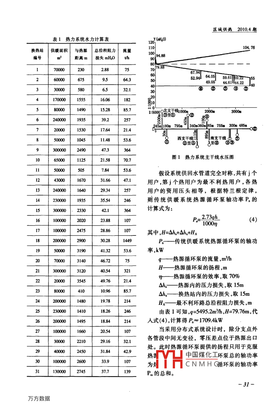 區(qū)域供熱2010.4 期分布式循環(huán)水泵供暖系統(tǒng)的設(shè)計(jì)哈爾濱醫(yī)科大學(xué)基建處白振宇哈爾濱熱力規(guī)劃設(shè)計(jì)研究院有限公司段立豐秦安市泰山城區(qū)熱力有限公司王磊哈爾濱工程大學(xué)孫剛[摘 要]結(jié)合工程實(shí)例,介紹了分布式循環(huán)水泵供暖系統(tǒng)的設(shè)計(jì)方法,主要包括循環(huán)水泵的設(shè)計(jì),補(bǔ)水系統(tǒng)的設(shè)計(jì)及系統(tǒng)水壓困的繪制,最后進(jìn)行了節(jié)能分析。經(jīng)過實(shí)際運(yùn)行,該系統(tǒng)在節(jié)能方面取得了很好的效果。[關(guān)鍵詞]分布式循環(huán)泵供熱系統(tǒng)設(shè)計(jì) 節(jié)能0引言預(yù)發(fā)展節(jié)能建筑熱指標(biāo)為45W/m',綜合熱指在傳統(tǒng)的供暖系統(tǒng)設(shè)計(jì)中,通常僅在熱標(biāo)為51.3W/m?,采用分布式循環(huán)水泵供暖系源處設(shè)置循環(huán)水泵,其揚(yáng)程根據(jù)最不利環(huán)路統(tǒng),共建設(shè)31座換熱站,供、回水設(shè)計(jì)溫度為的阻力確定,各用戶通過調(diào)節(jié)閥門消耗多余110C/70C,設(shè)計(jì)壓力1.6MPa。熱源建設(shè)與熱的資用壓頭來進(jìn)行流量分配,這樣會(huì)在運(yùn)行負(fù)荷相對(duì)應(yīng),最終規(guī)模為3臺(tái)70MW熱水鍋時(shí)存在過多的無效電耗。為解決這一問題,我爐。們采用了分布式循環(huán)水泵的設(shè)計(jì),取消了獨(dú)2系統(tǒng)設(shè)計(jì)立的熱網(wǎng)循環(huán)泵,熱源處設(shè)置的循環(huán)泵的功本文只說明分布式循環(huán)水泵供暖系統(tǒng)中能是承擔(dān)熱源內(nèi)部的水循環(huán),而換熱站內(nèi)的對(duì)熱源循環(huán)泵、換熱站內(nèi)一級(jí)網(wǎng)側(cè)循環(huán)泵循環(huán)泵既有承擔(dān)熱網(wǎng)循環(huán)泵的熱媒輸送功及補(bǔ)水系統(tǒng)的設(shè)計(jì),不涉及對(duì)其他部分的設(shè)能,又有在熱用戶建立必要的資用壓頭的功計(jì)。能,并能通過變頻裝置實(shí)現(xiàn)變流量調(diào)節(jié)。此設(shè)2.1熱源循環(huán)泵 設(shè)計(jì)計(jì)基本.上消除了無效電耗,不用安裝電動(dòng)調(diào)熱源循環(huán)泵的選擇,重點(diǎn)是確定設(shè)計(jì)揚(yáng)節(jié)閥,減少了初投資。在實(shí)際運(yùn)行中該系統(tǒng)不程,即熱源內(nèi)部水循環(huán)系統(tǒng)的總壓力損失,一但降低了能耗,而且利于熱網(wǎng)水力平衡,取得般取12~15m。而設(shè)計(jì)流量的確定與傳統(tǒng)設(shè)計(jì)了很好的效果。方法相同,即為供曖系統(tǒng)的總設(shè)計(jì)流量,其值1工程概況取決于供暖系統(tǒng)總熱負(fù)荷和供、回水的設(shè)計(jì)該工程為泰安市東部區(qū)域集中供熱工溫度中國(guó)煤化工懷需要增加余程,規(guī)劃總供暖面積389.8萬m2,其中現(xiàn)有非量系YHCNMHG節(jié)能建筑熱指標(biāo)為63W/m2,現(xiàn)有節(jié)能建筑和2.2換熱站一級(jí)網(wǎng)循環(huán)泵設(shè)計(jì)-29-區(qū)域供熱2010.4 期換熱站內(nèi)的-級(jí)網(wǎng)變頻循環(huán)泵設(shè)置在回入口處,換熱站內(nèi)不設(shè)補(bǔ)水泵;若換熱站存在水管上,這樣可以不需要采用高溫水泵,減少高區(qū)供熱,則需要在換熱站內(nèi)設(shè)高區(qū)補(bǔ)水泵初投資。選擇2臺(tái)循環(huán)泵同時(shí)使用不設(shè)備和補(bǔ)給水箱,若二級(jí)網(wǎng)高區(qū)失水,則先將二級(jí)用,均為變頻,單臺(tái)泵的流量按設(shè)計(jì)流量的網(wǎng)低區(qū)回水引入補(bǔ)給水箱,最后經(jīng)由補(bǔ)給水60%. ,揚(yáng)程按設(shè)計(jì)揚(yáng)程100%選型,設(shè)計(jì)揚(yáng)程泵加壓給二級(jí)網(wǎng)高區(qū)補(bǔ)水,避免一級(jí)網(wǎng)高溫為從熱源至該換熱站的供、回水沿程阻力損回水直接進(jìn)人水箱,損壞水箱。需要強(qiáng)調(diào)的是失與站內(nèi)損失之和,應(yīng)根據(jù)水力計(jì)算確定。運(yùn)“一補(bǔ)二”方式需要在熱源處設(shè)置補(bǔ)水泵,本行初期和末期只啟動(dòng)一臺(tái)泵,最冷月時(shí)同時(shí)工程中熱源內(nèi)兩臺(tái)補(bǔ)水泵均采用變頻,為雙啟動(dòng)2臺(tái)并保證同頻運(yùn)行,若此時(shí)一臺(tái)泵發(fā)變頻自動(dòng)補(bǔ)水控制系統(tǒng),補(bǔ)水泵的選型依照生事故,根據(jù)水泵特性曲線,另一臺(tái)泵的流遠(yuǎn)期規(guī)劃并考慮同時(shí)使用系數(shù),以節(jié)約初投量和揚(yáng)程仍可滿足事故狀態(tài)下的供熱量保資。補(bǔ)水流量按- -級(jí)網(wǎng)流量的3%考慮,揚(yáng)程證率。根據(jù)實(shí)際運(yùn)行靜壓線計(jì)算?,F(xiàn)以最不利用戶22號(hào)換熱站為例,采暖3系統(tǒng)水壓圖的繪制面積0000m2,地?zé)岵蓵崆揖鶠楣?jié)能建筑,采本工程共建設(shè)31個(gè)換熱站,繪制其系統(tǒng)暖負(fù)荷為:水壓圖首先確定系統(tǒng)的靜壓線,靜壓線的確定需保證系統(tǒng)不汽化、不倒空、不超壓。本工Q=. 2000x04 -=900kW(1)1000程采用分布式回水加壓設(shè)計(jì),靜壓線分為控設(shè)置兩臺(tái)循環(huán)水泵,均為變頻,單臺(tái)泵流制靜壓線和實(shí)際靜壓線。量為設(shè)計(jì)流量的60%,揚(yáng)程為設(shè)計(jì)揚(yáng)程的控制靜壓線的確定:以熱源首站標(biāo)高為100%。基準(zhǔn)標(biāo)高+0.0m,考慮到熱源供熱參數(shù)為單臺(tái)一級(jí)網(wǎng)循環(huán)泵設(shè)計(jì)流量為:1109C/70C運(yùn)行,110C水汽化壓力